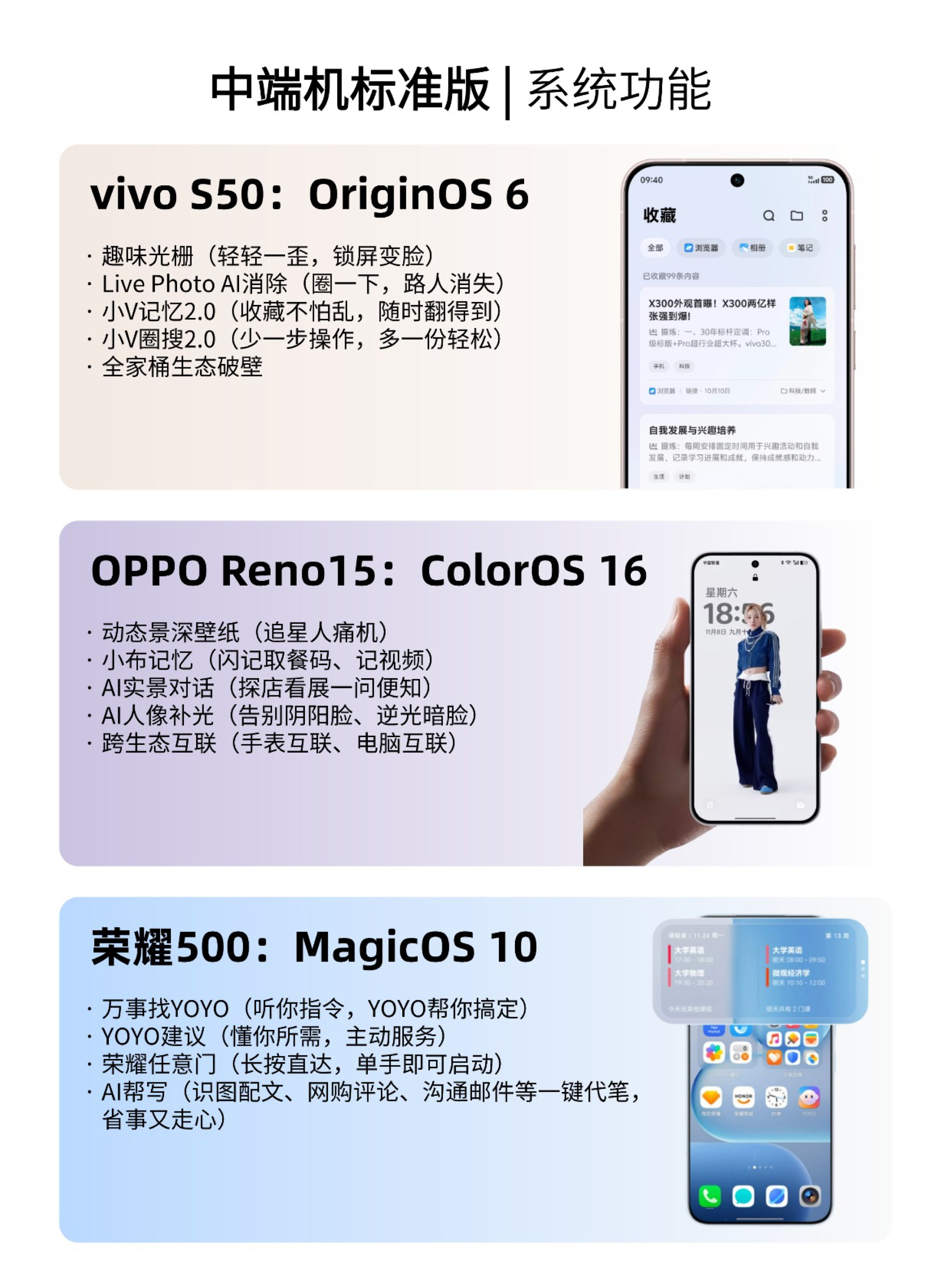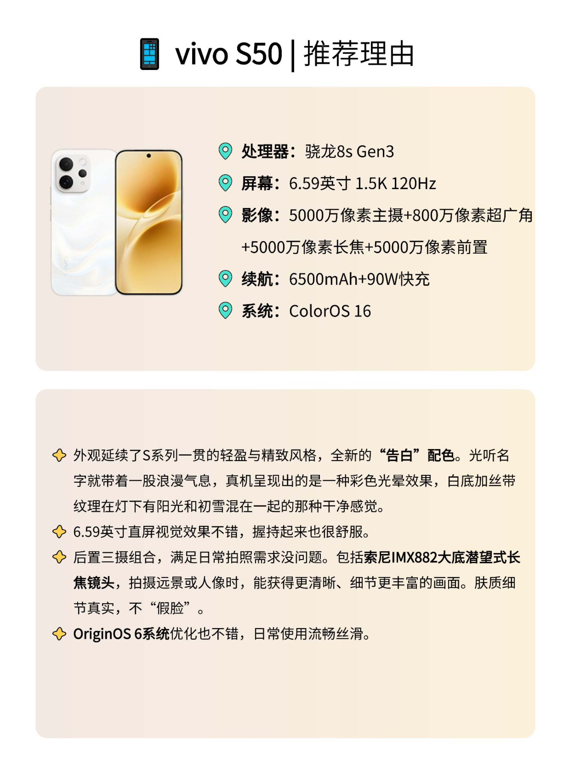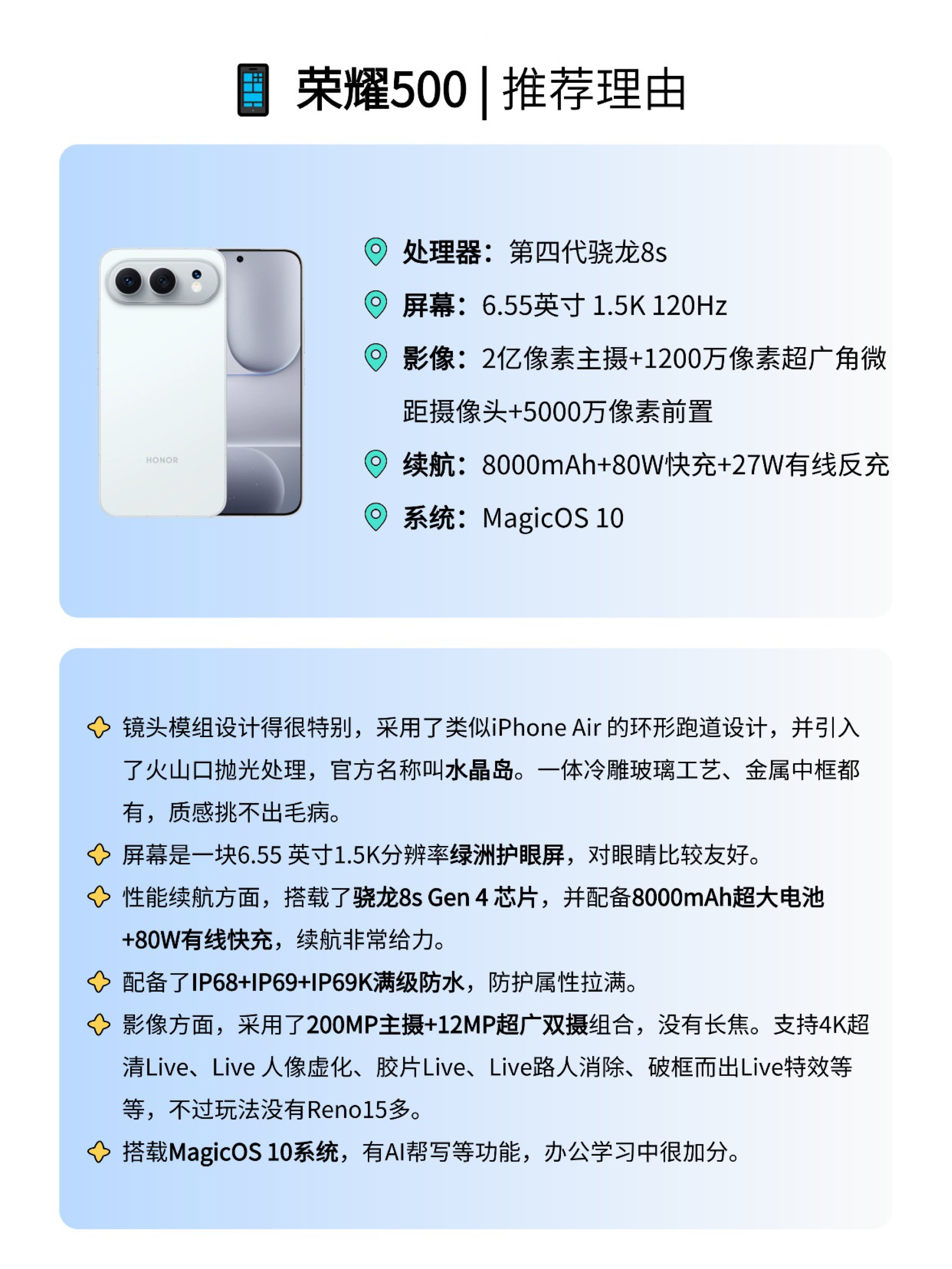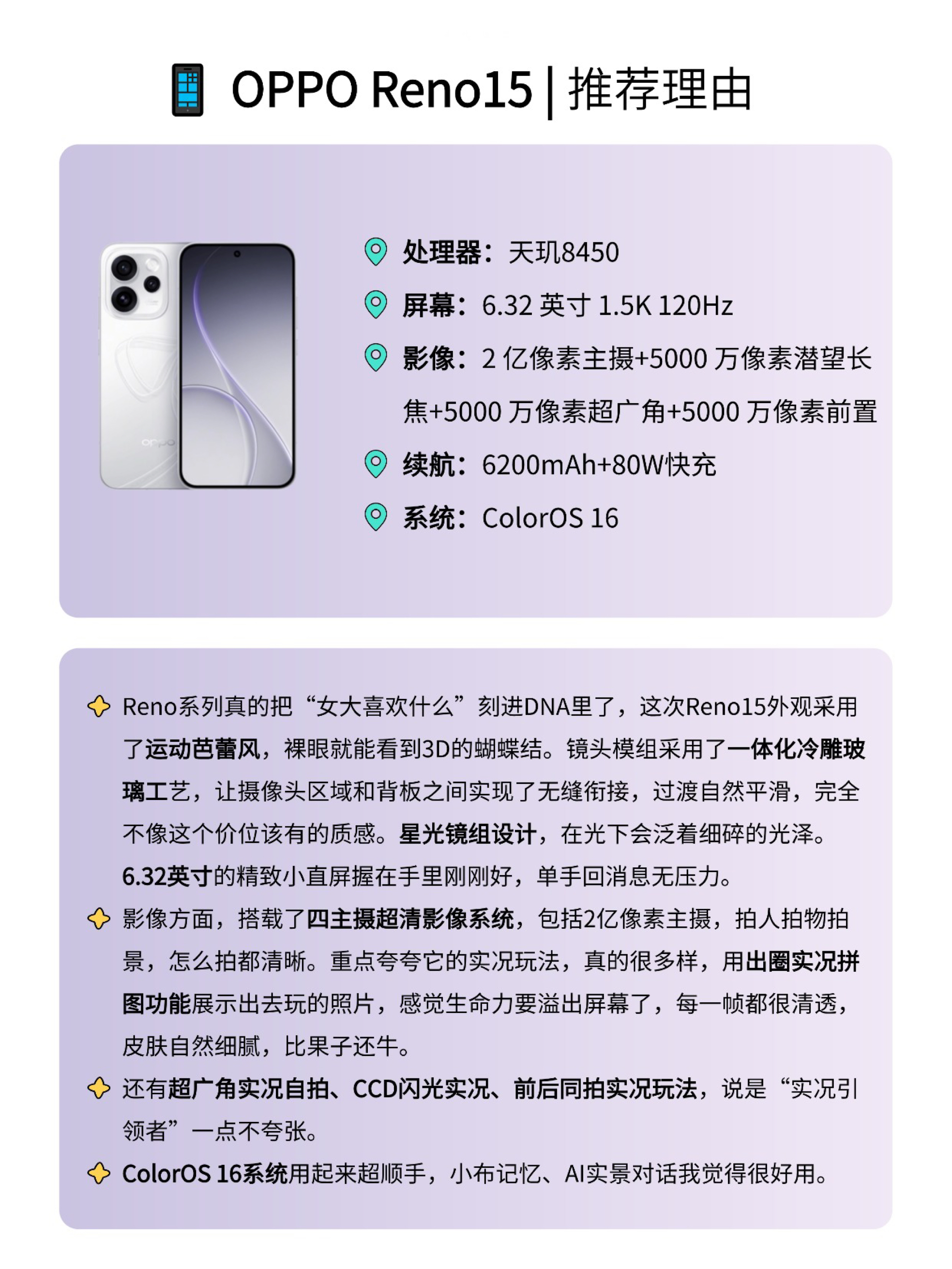 本篇笔记关联了OPPO Reno15 5G 手机 运动芭蕾美学 拼图 游戏超帧动画 小直屏 金属中框 5千万潜望+超广角 防水 超清影像 闪充 全网通 超出圈实况神机 星光蝴蝶结、HONOR/荣耀 500 超级标准版 5G 手机 2亿人像 全能实况 大电池 快充 至尊旗舰芯 双卡 实况拍照 防水 月光银、vivo S50 5G 手机 长焦Live神器 记录每秒生动时刻 长续航 大电池 全网通 超轻薄 超声波指纹 主摄级 湿手秒开 告白等商品,为用户提供真实的使用体验和购买参考。