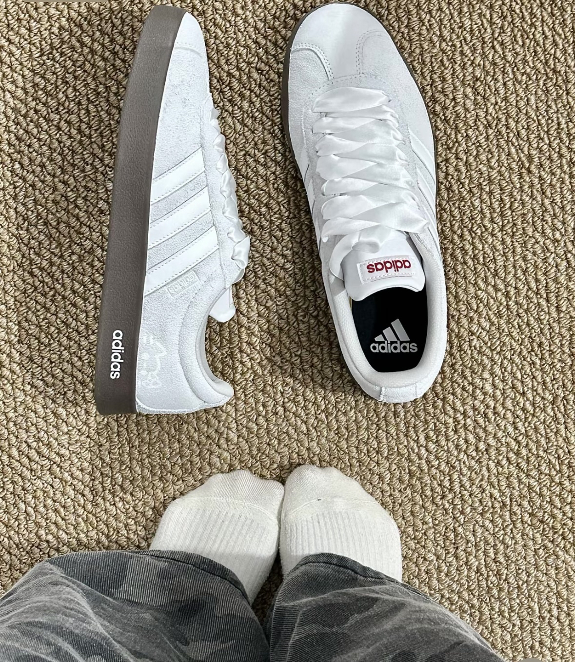 不是我说,看到介双阿迪就让我走不动道😵💫 灰白配加上后跟猫咪画尊嘟一眼心动💗 白色🤍的猫咪🐱简笔画尊嘟不要太可爱! 鞋内里厚度适中,既不焐脚,也不会磨脚; 灰色鞋身和clean fit穿搭不要泰配🥹 棕色橡胶防滑耐磨,还有摩擦声💥