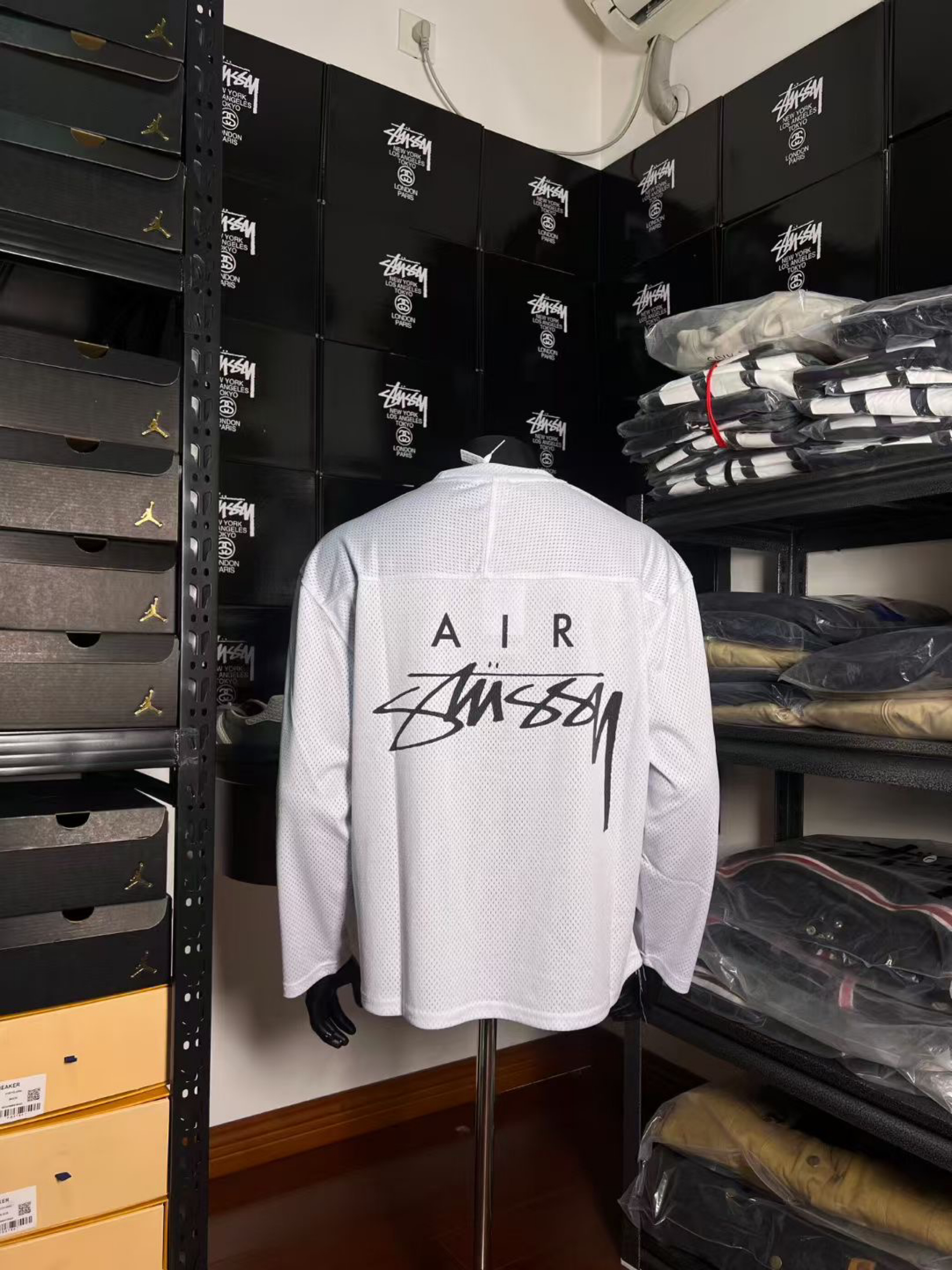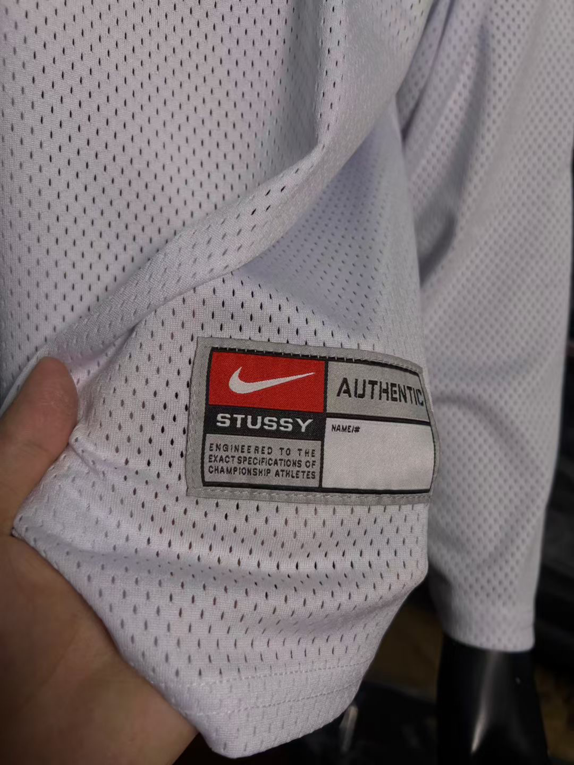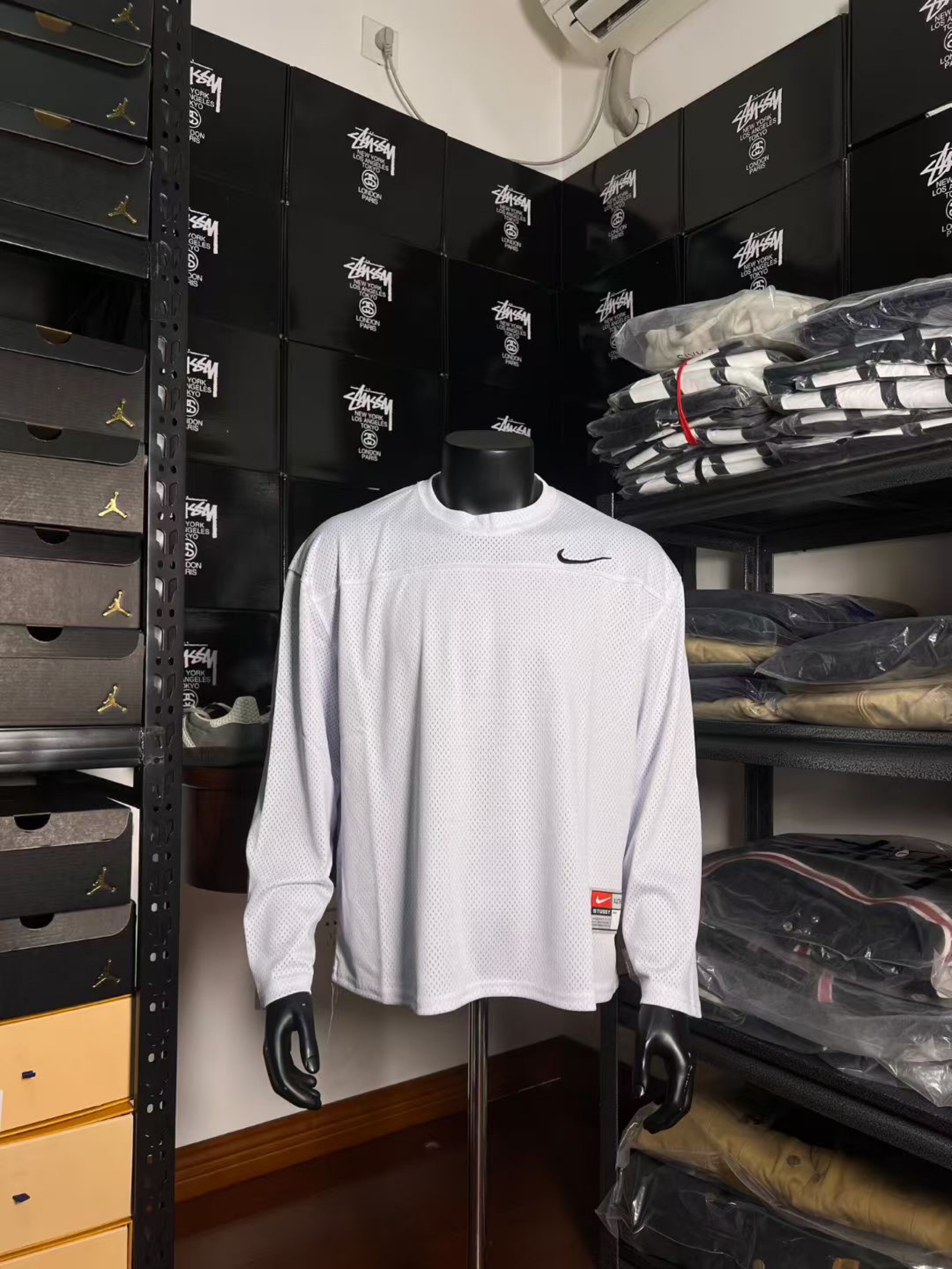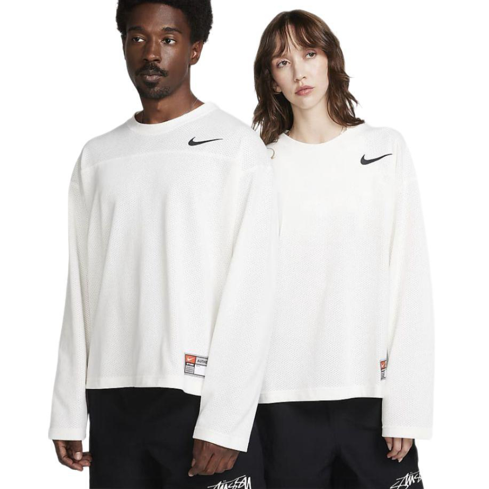 Nike x Stüssy联名网眼长袖实拍来啦!从胸前经典的小勾刺绣,到侧边辨识度拉满的联名织标,再到背后AIR字样搭配Stüssy标志性手写logo,每一处细节都精准戳中潮流审美。网眼面料的透气纹理清晰可见,洗水标上的材质信息也完整呈现,正面整体廓形利落,背面印花张力十足,多角度实拍带你沉浸式感受这款联名单品的质感与设计巧思
