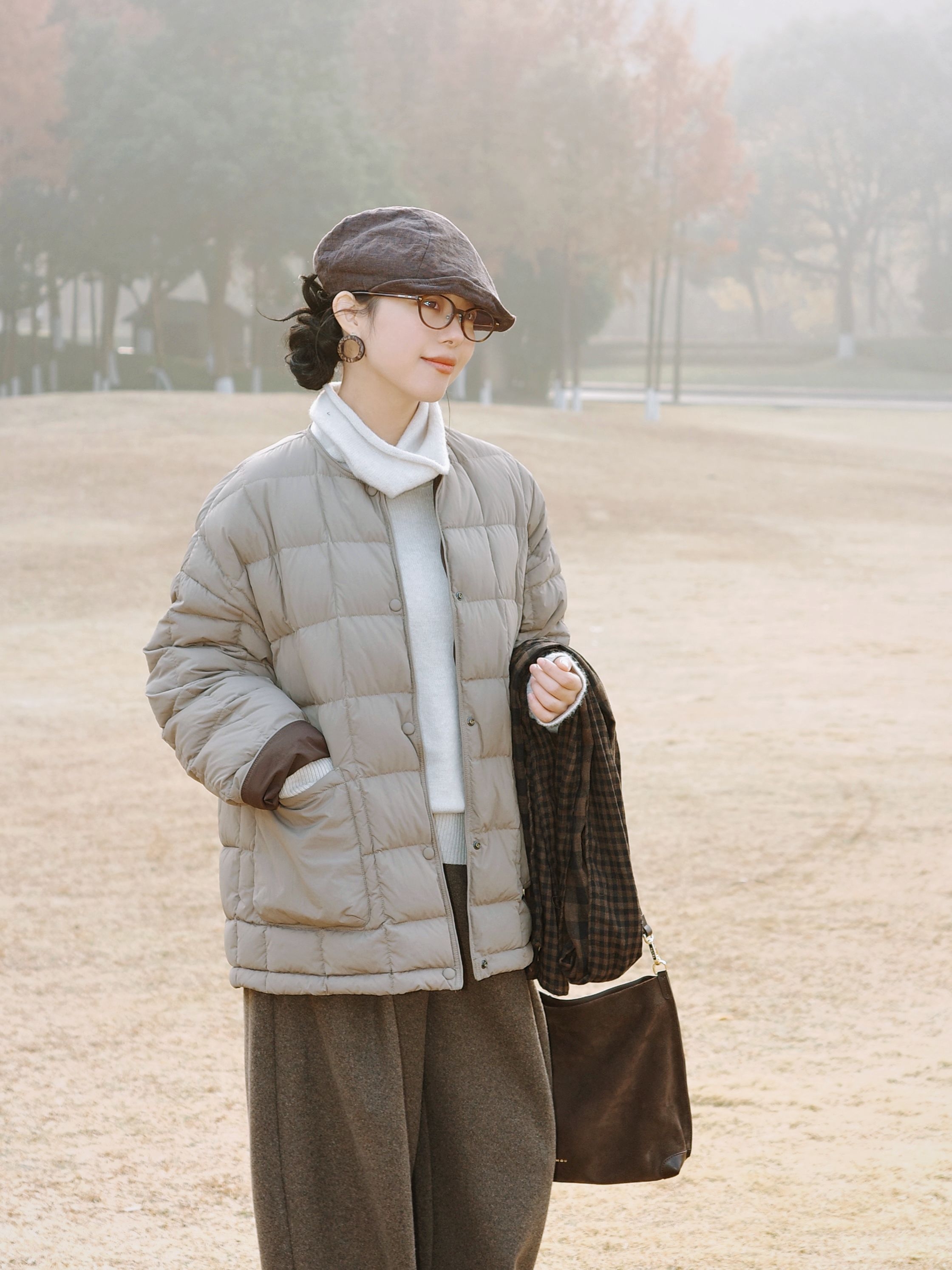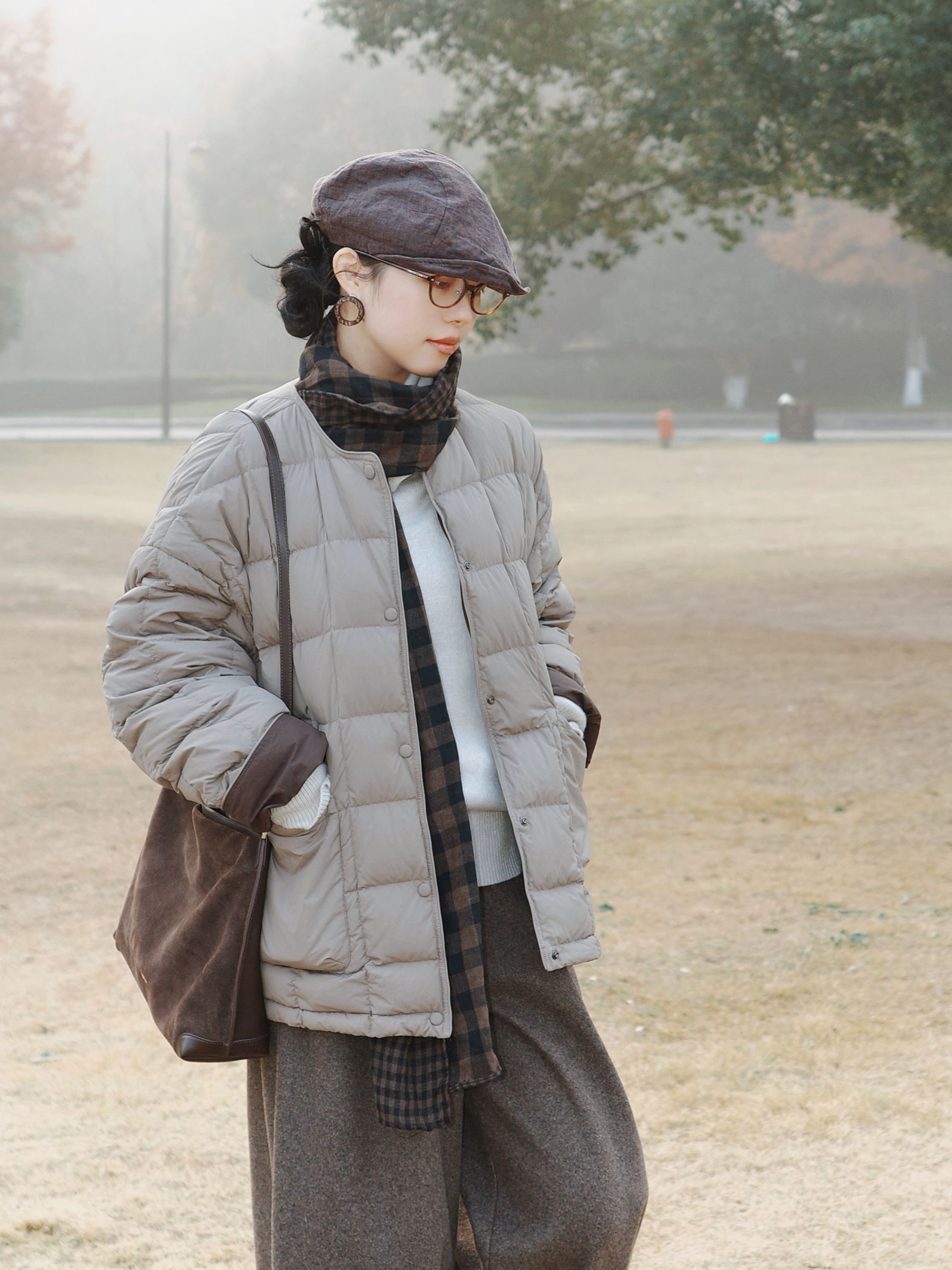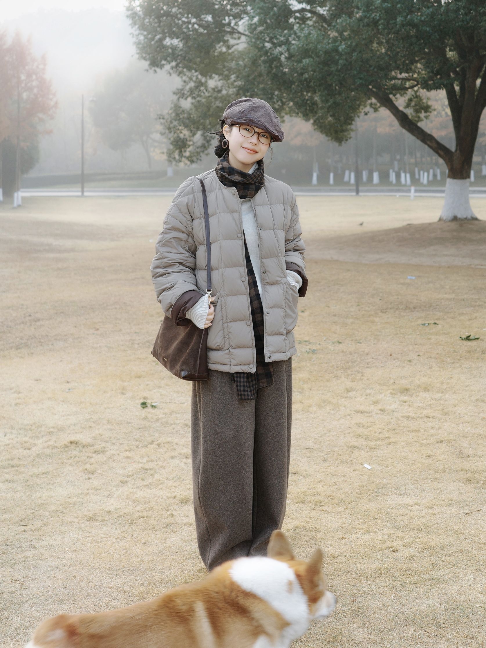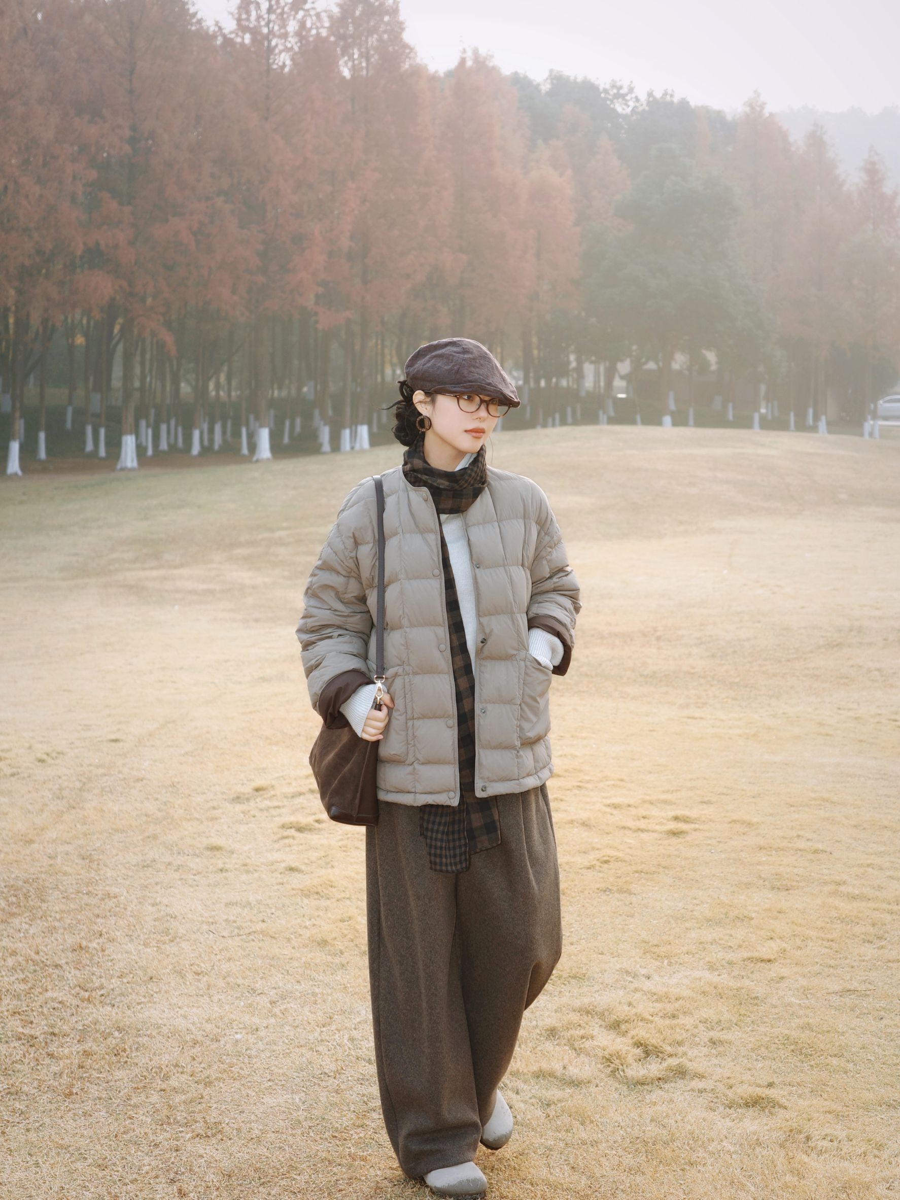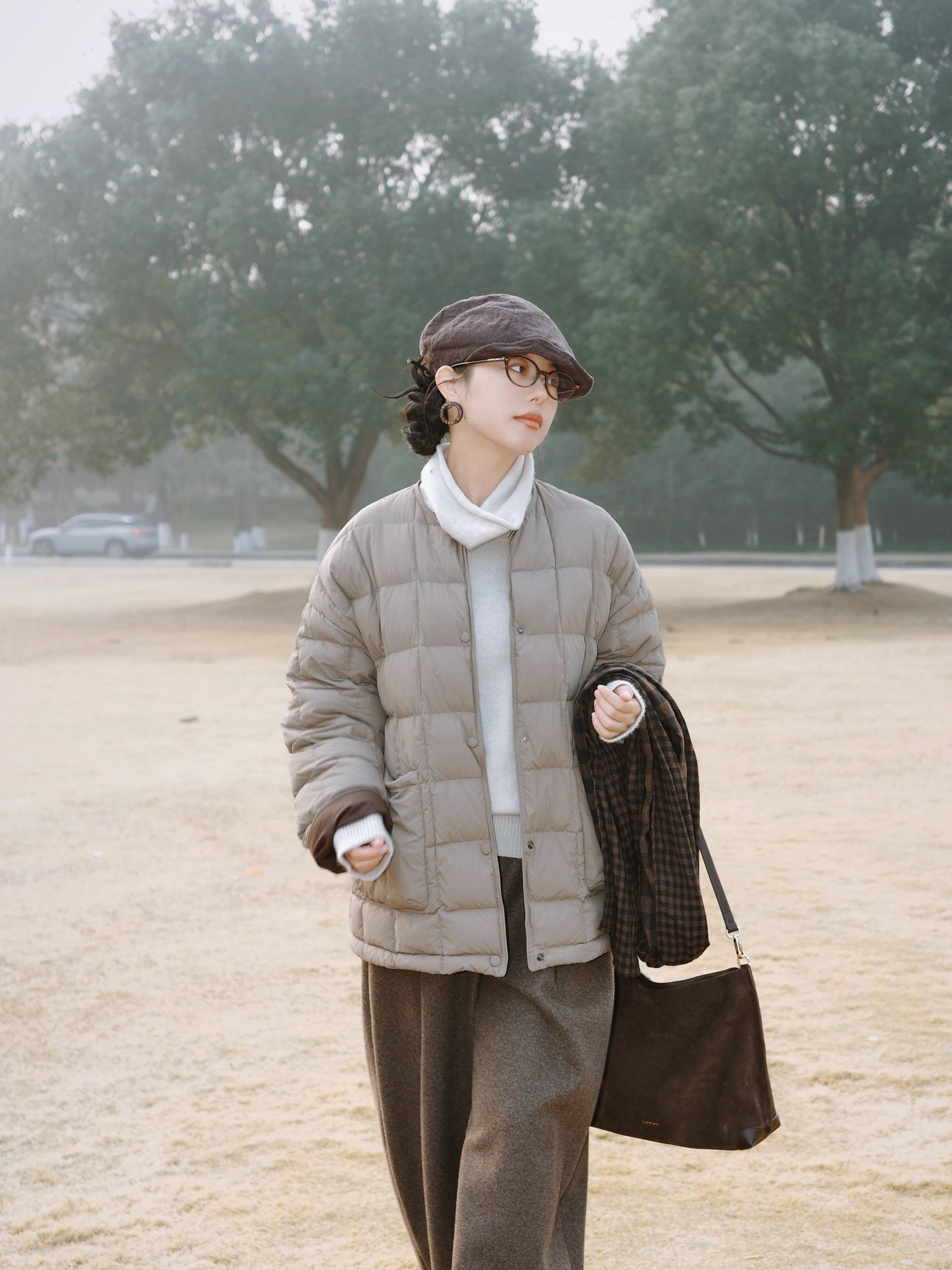 初冬的松弛感,被这件云朵羽绒服承包啦~ 浅灰咖色的羽绒服软乎乎的,像被蓬松云朵裹住似的,轻盈得完全没有臃肿感。内搭白色高领毛衣温柔又打底,格纹围巾绕上几圈,复古的层次感一下就出来了。 咖色阔腿裤垂坠感超棒,走起路来晃晃悠悠的特别松弛,再挎上棕色的包包,从头到脚的大地色系揉在一起,复古味儿拉满,初冬出门这么穿,舒服又好看~