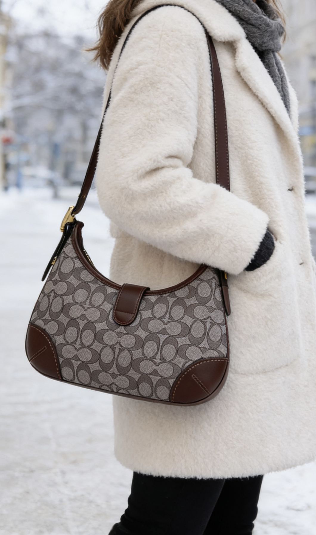 COACH Hamptons 26半月包太绝了!标志性提花高级感拉满,织物拼人造革质感在线,可调节肩带手提单肩随心切换,枫木色超衬秋冬穿搭。谁懂啊姐妹们!快来评论区蹲链接,记得点赞收藏~