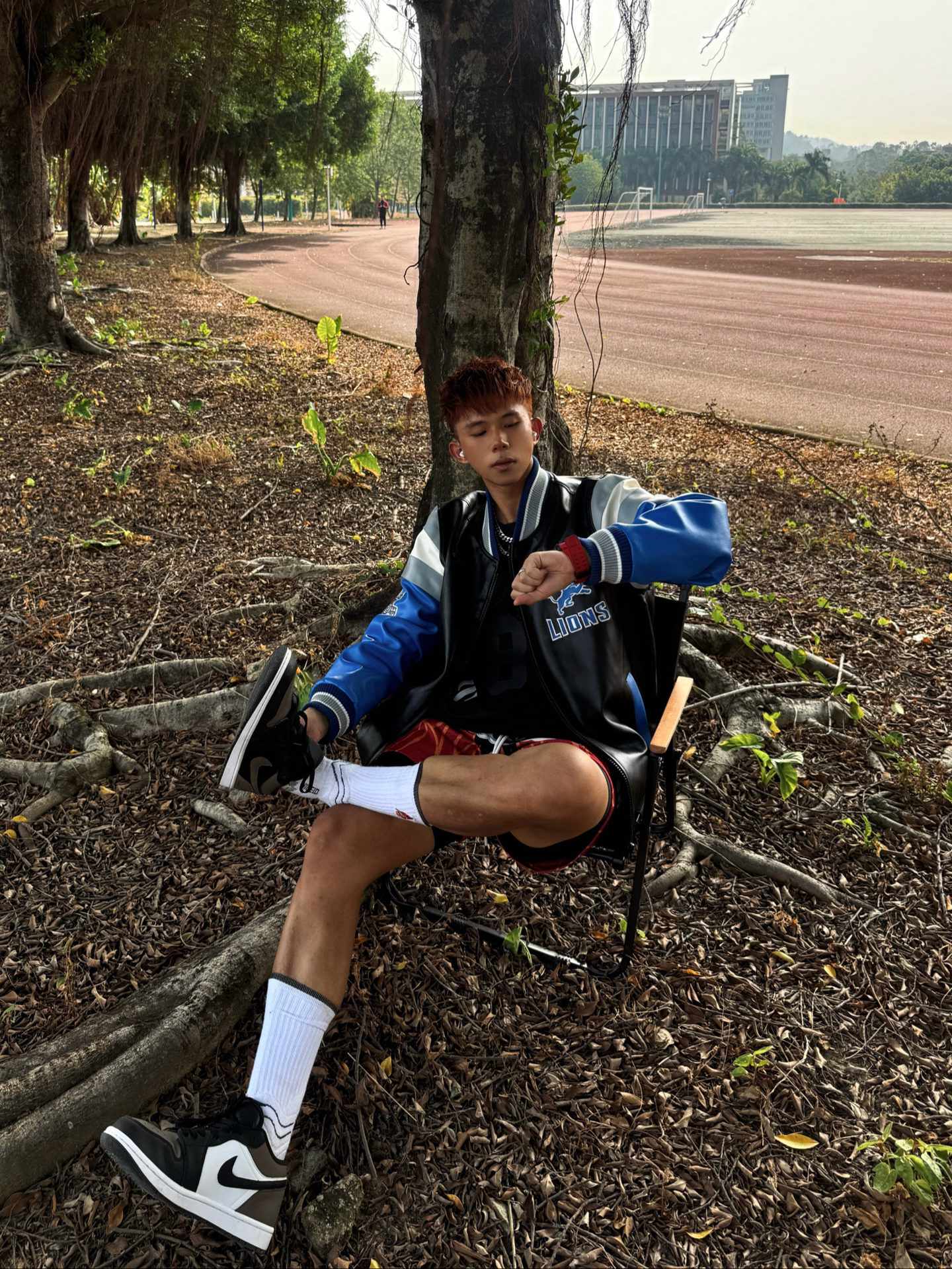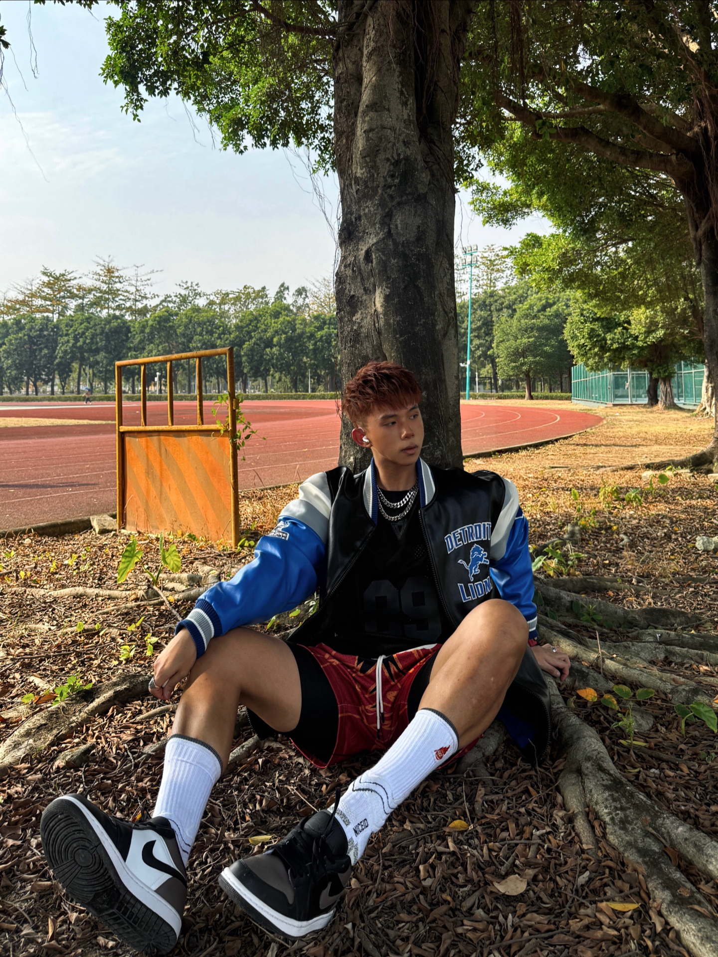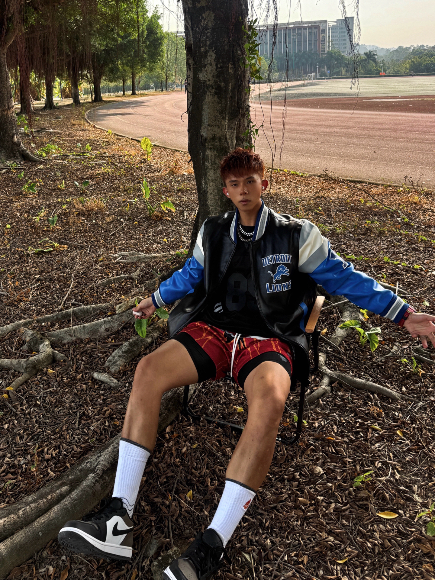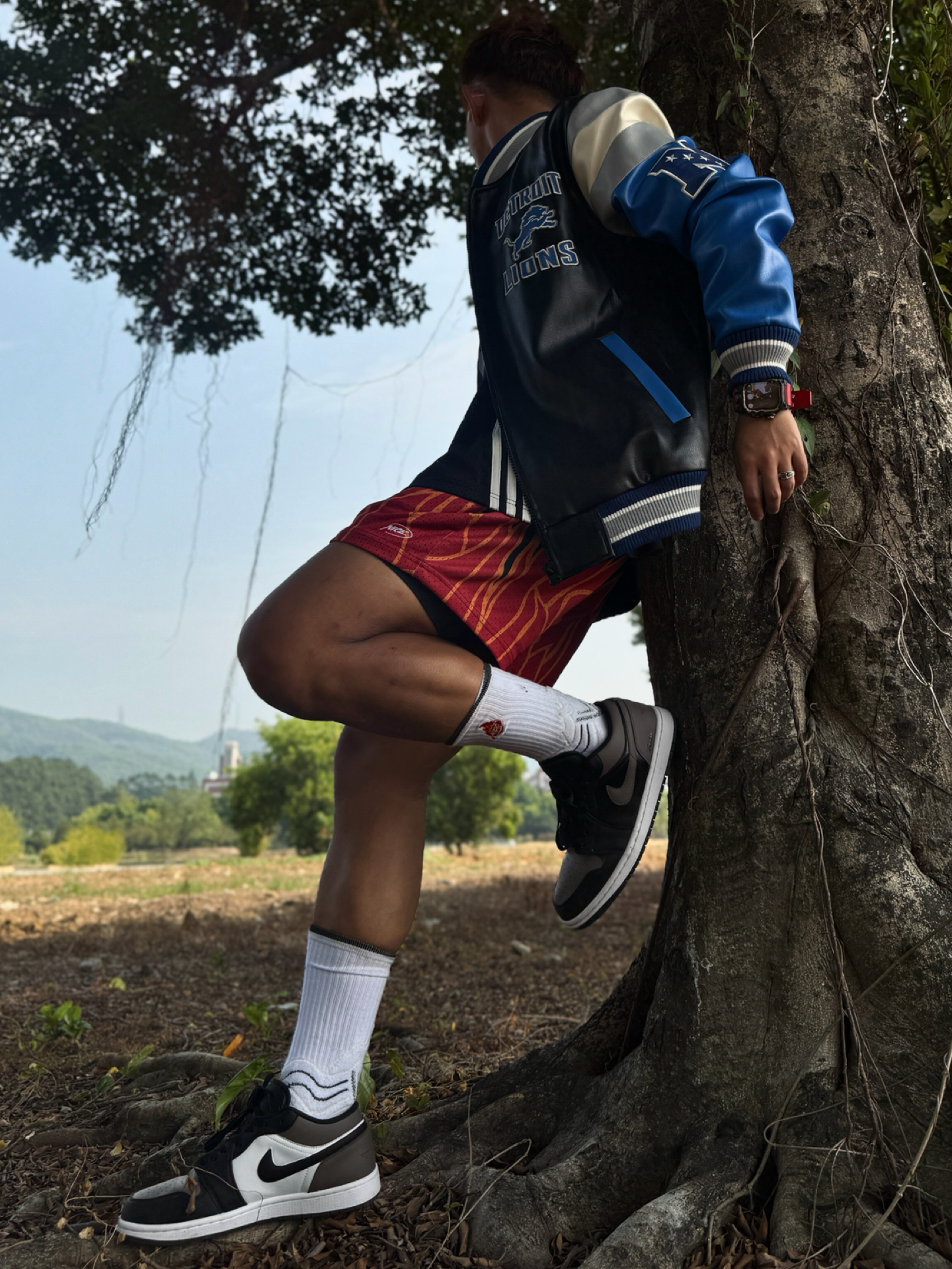 蓝黑拼皮棒球服自带Detroit Lions球队元素 和红纹短裤形成正好的撞色反差 兼具运动感和复古腔调 视觉冲击力超强💯 👟AJ1黑棕摩卡也是点睛之笔 相对中高帮 低帮鞋型更显利落 不压腿型还拉长腿部线条 搭配长白袜简直不要太nice 今天这套棒球服球鞋OOTD痞帅又街头 #棒球服也可以潮 #今日穿搭宝藏休闲棒球服 #好物分享AJ1 #冬日穿搭速成攻略 #我的棒球服穿搭