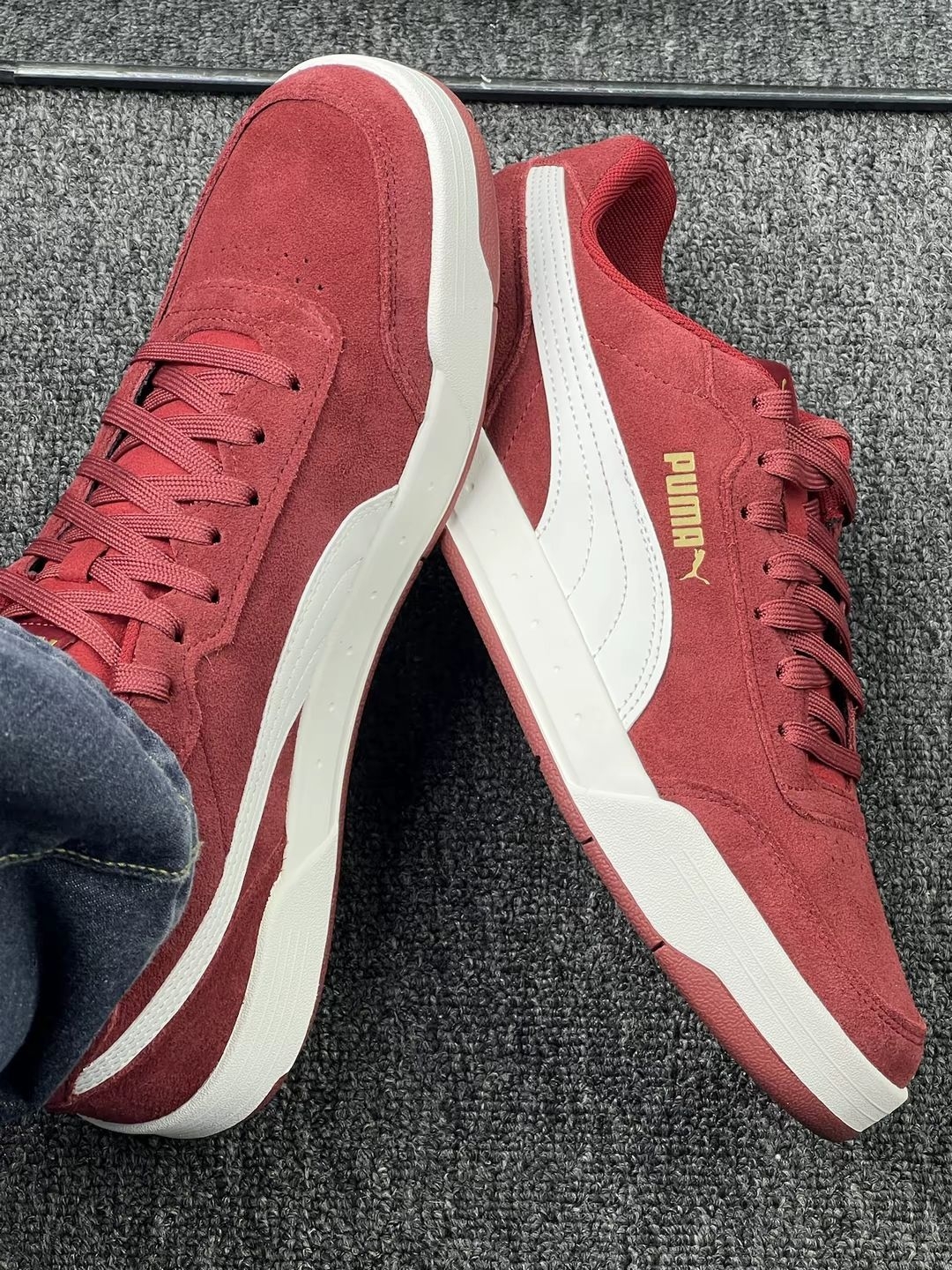 这双酒红色的PUMA翻毛皮鞋,上手能摸到翻毛皮的细腻纹理,质感是实打实的。上脚后,鞋垫的SOFT技术带来的缓冲感挺明显,日常上下班走个几公里,脚不会立刻就觉得累。搭配深色牛仔裤,复古味儿很足,日常出街或者通勤穿都挺合适 但它的小缺点也挺显眼,因为翻毛皮材质,蹭点泥或者脏东西,清理起来需要费点时间,而且透气性一般,适合秋冬穿,夏天会比较闷脚,我是宽脚,鞋头的空间穿久了会有点挤,得磨合几天适应一下...