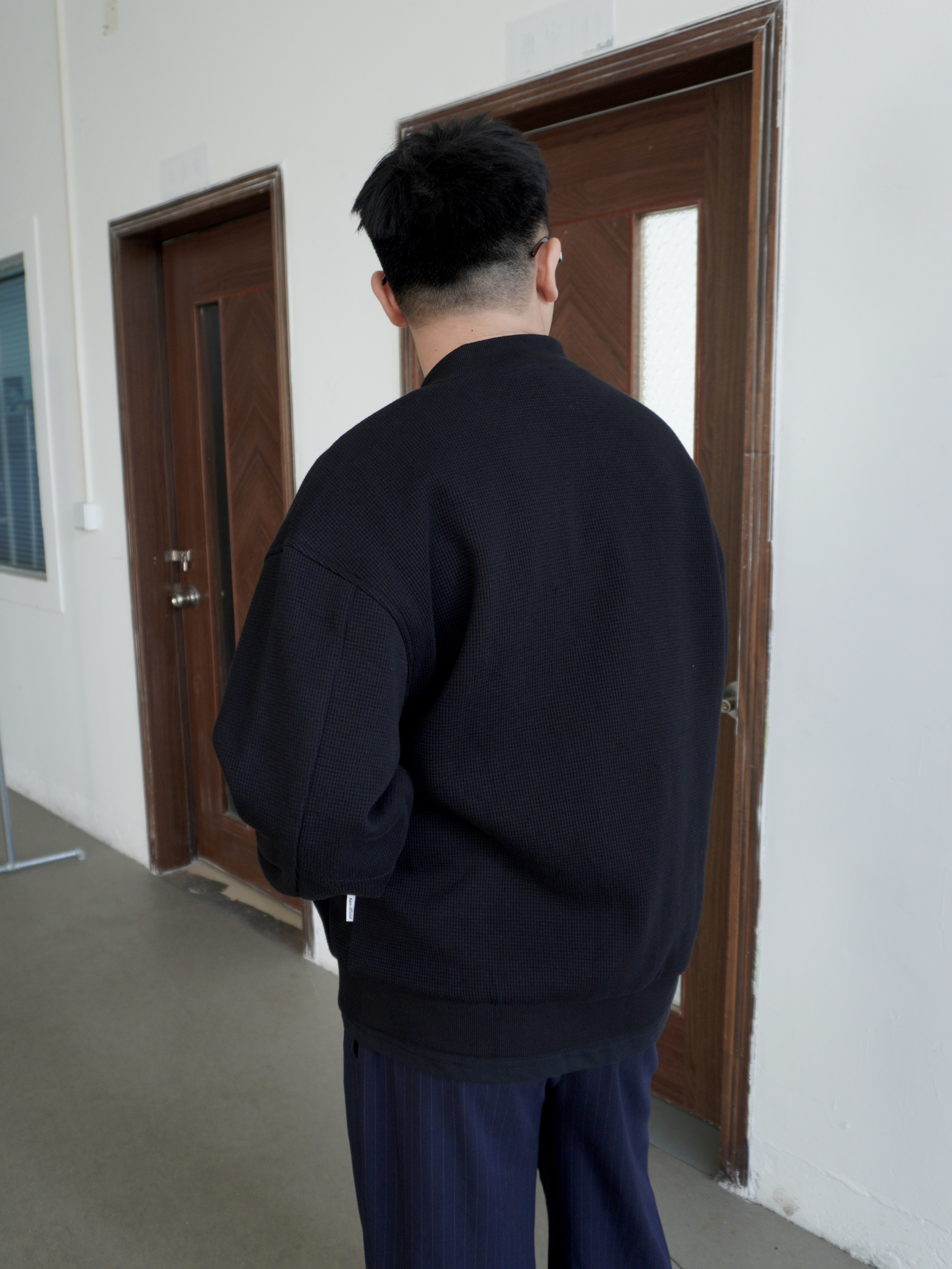 1. 上衣看“肌理” 黑色开衫如果没质感容易显老气,华夫格的面料自带凹凸纹理,近看很有细节。宽松版型上身自带慵懒滤镜。 2. 裤子要“垂顺” 西裤的垂坠感能穿出高级感。微喇的剪裁比普通直筒更有休闲感。 3. 鞋子选“轻盈” 搭配了黑色薄底鞋,视觉上非常利落。去掉了厚底鞋的笨重感,看着更轻盈利落。