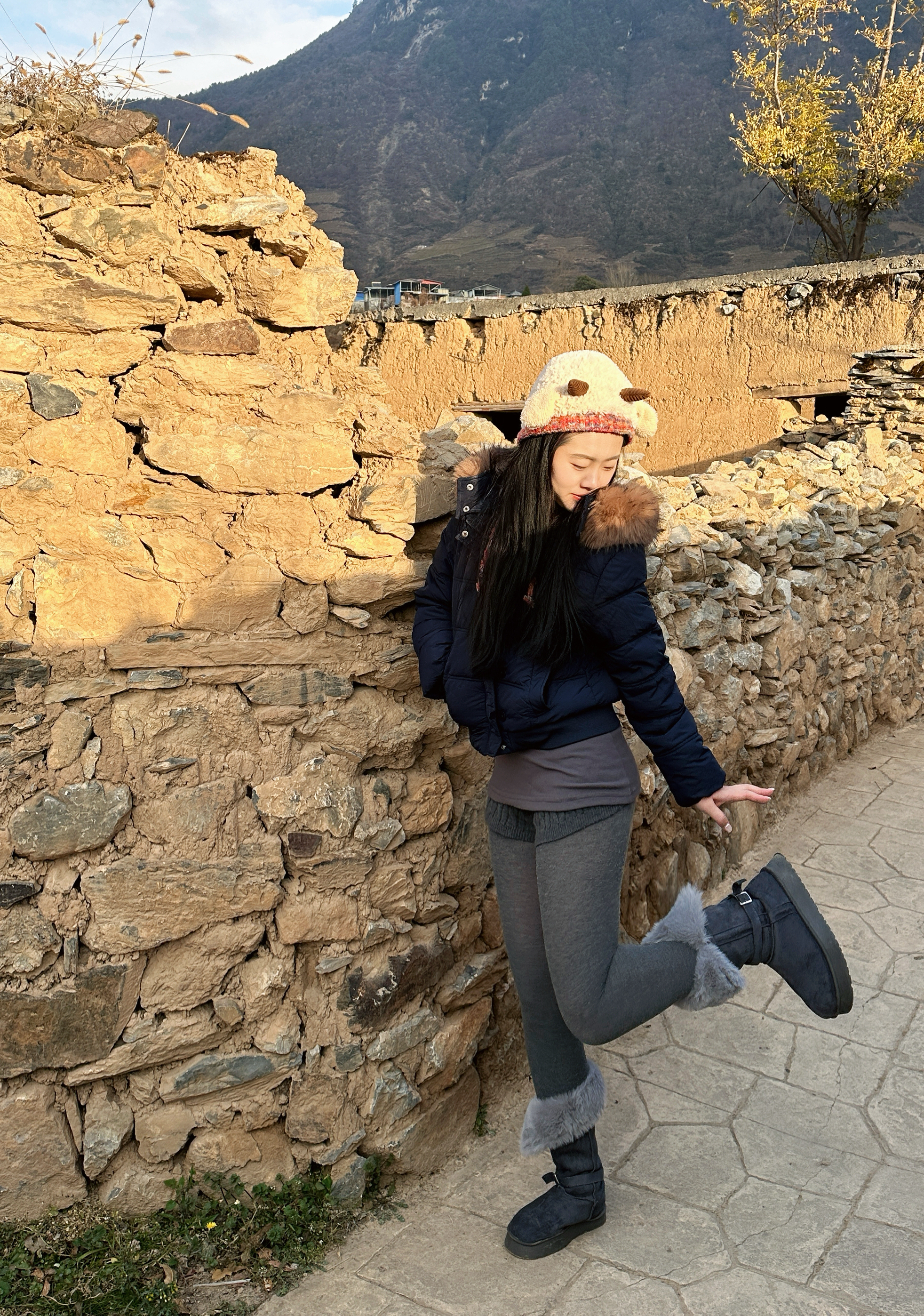 这一套是冬日怕冷姐妹的绝佳选择💕!短款大毛领羽绒棉服,宽松版型藏肉还挡风,小个子也能穿出利落灵气~内搭修身白色中长款T恤,微微露边的设计超有辣妹小心机,灰色连裤袜柔和衔接上下,踩上厚底灰色长筒雪地靴,保暖还悄悄增高,冬日氛围感直接拉满❄️