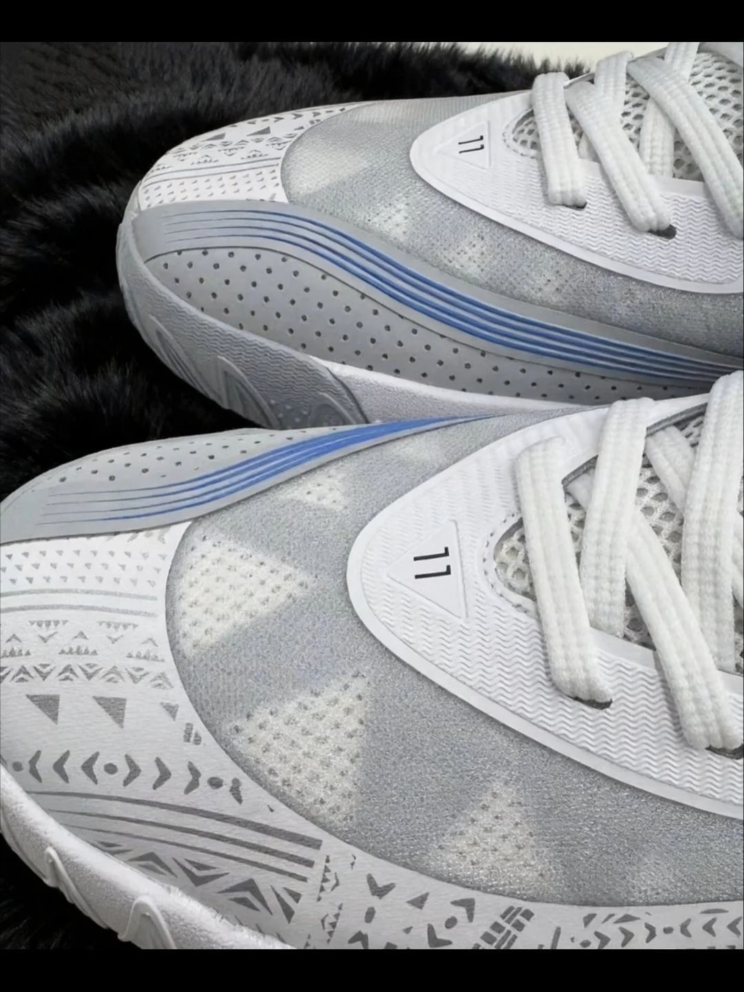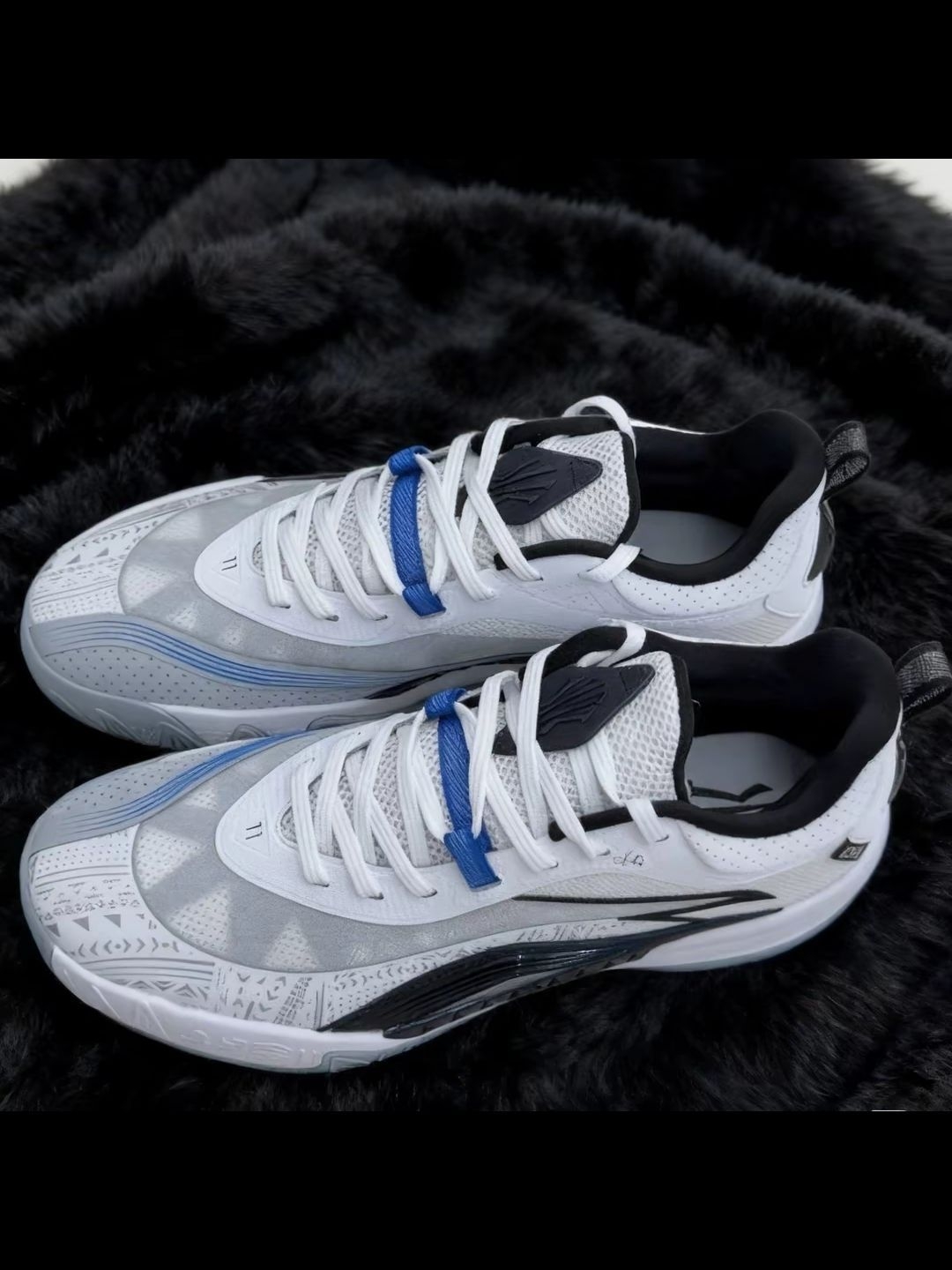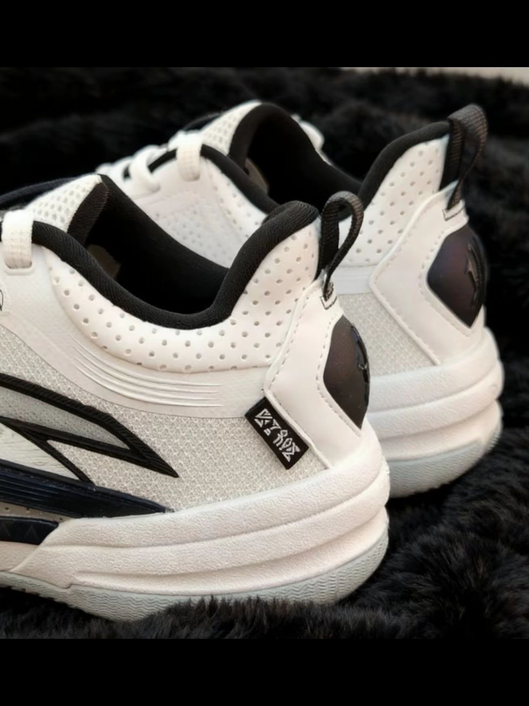 我入的这双鞋,外观设计挺有细节,花纹很特别,配色也清爽。上脚后包裹感不错,打球时蹬地反馈也可以,平时出街搭配也不突兀,是双能打又能搭的实战鞋~
