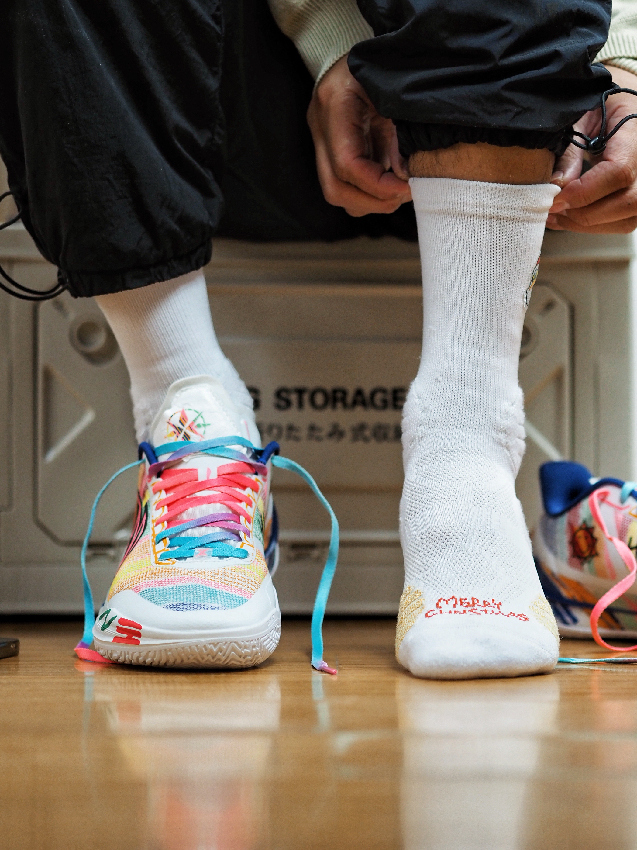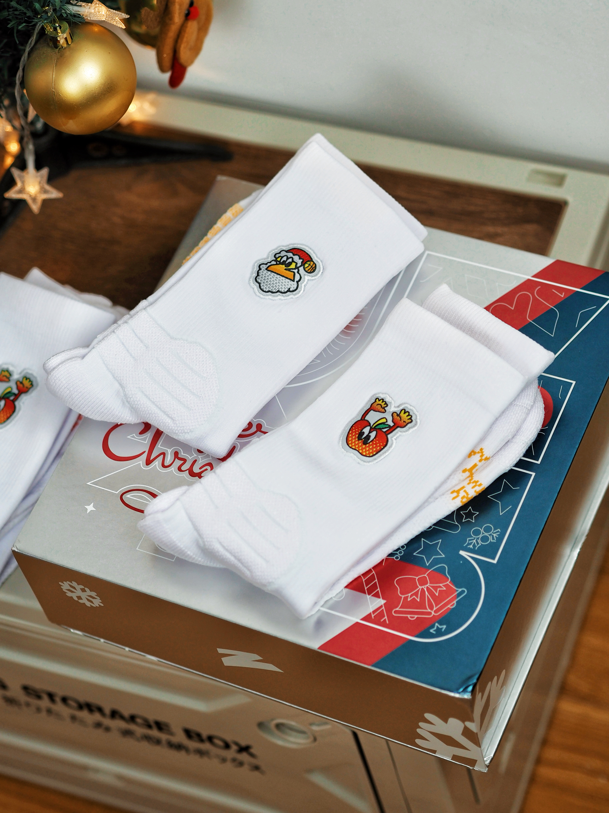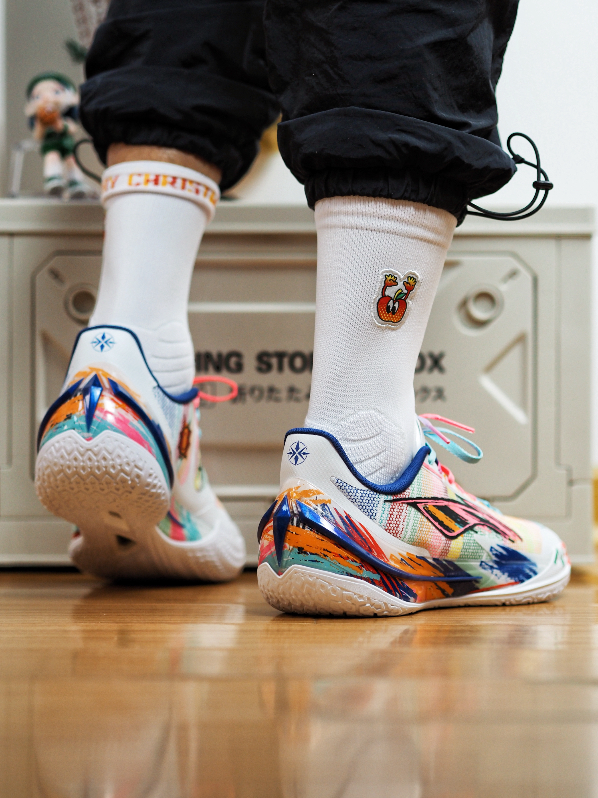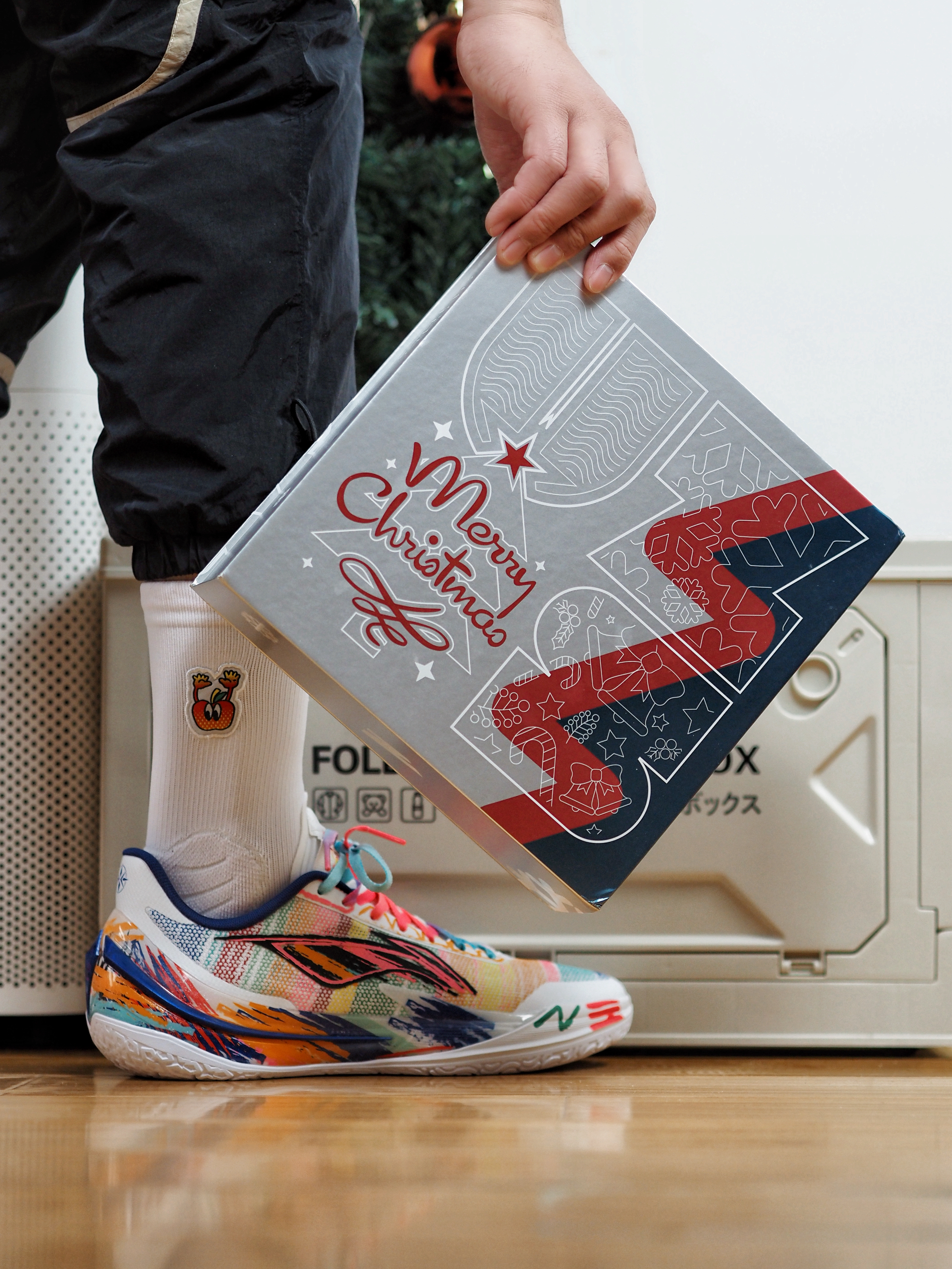 上脚的这双李宁利刃5V2版本,本身的艺术气息就很丰富,作为圣诞🎄节的球局选择,搭配上UZIS的圣诞篮球袜,氛围就很到位~
