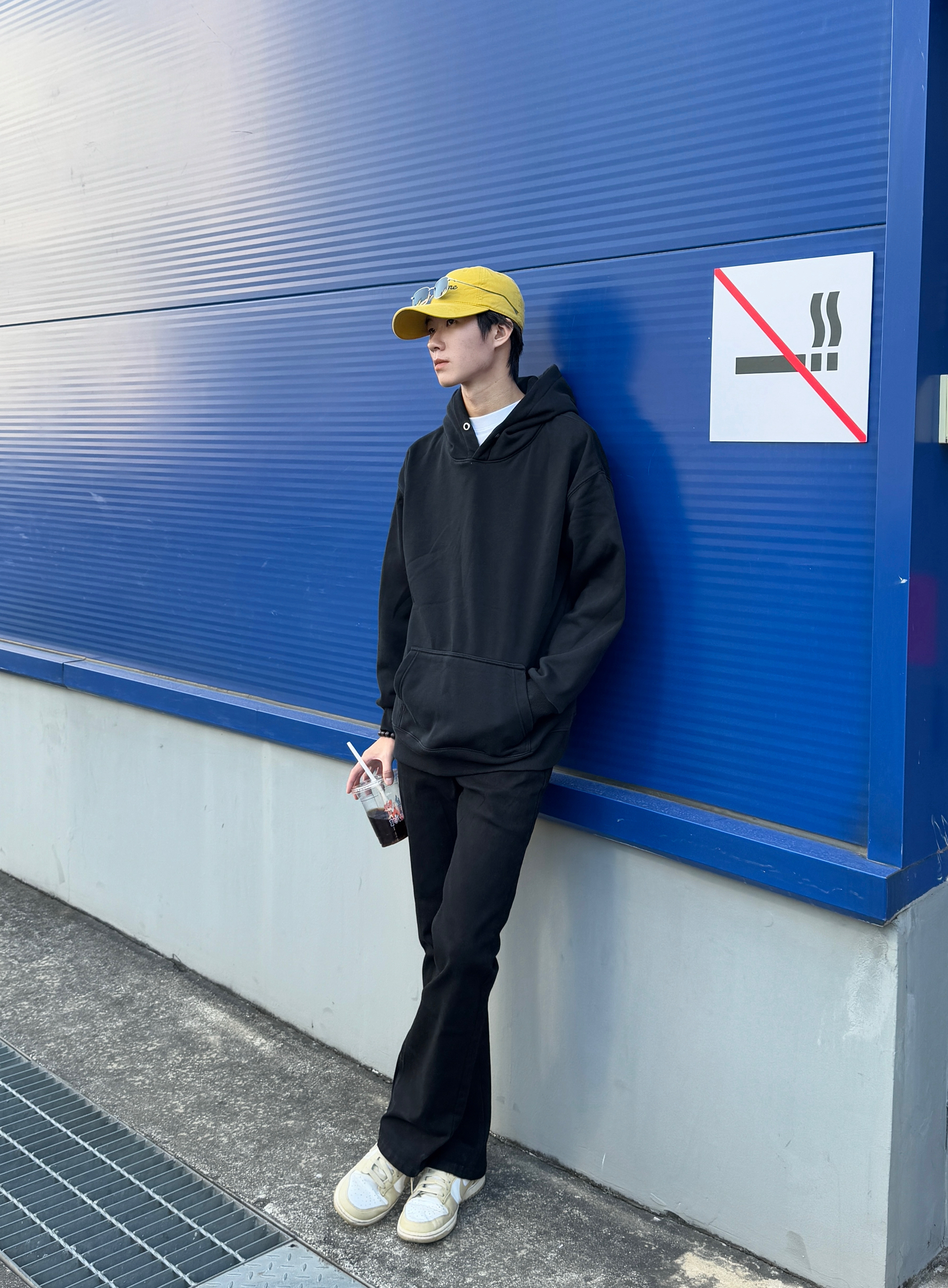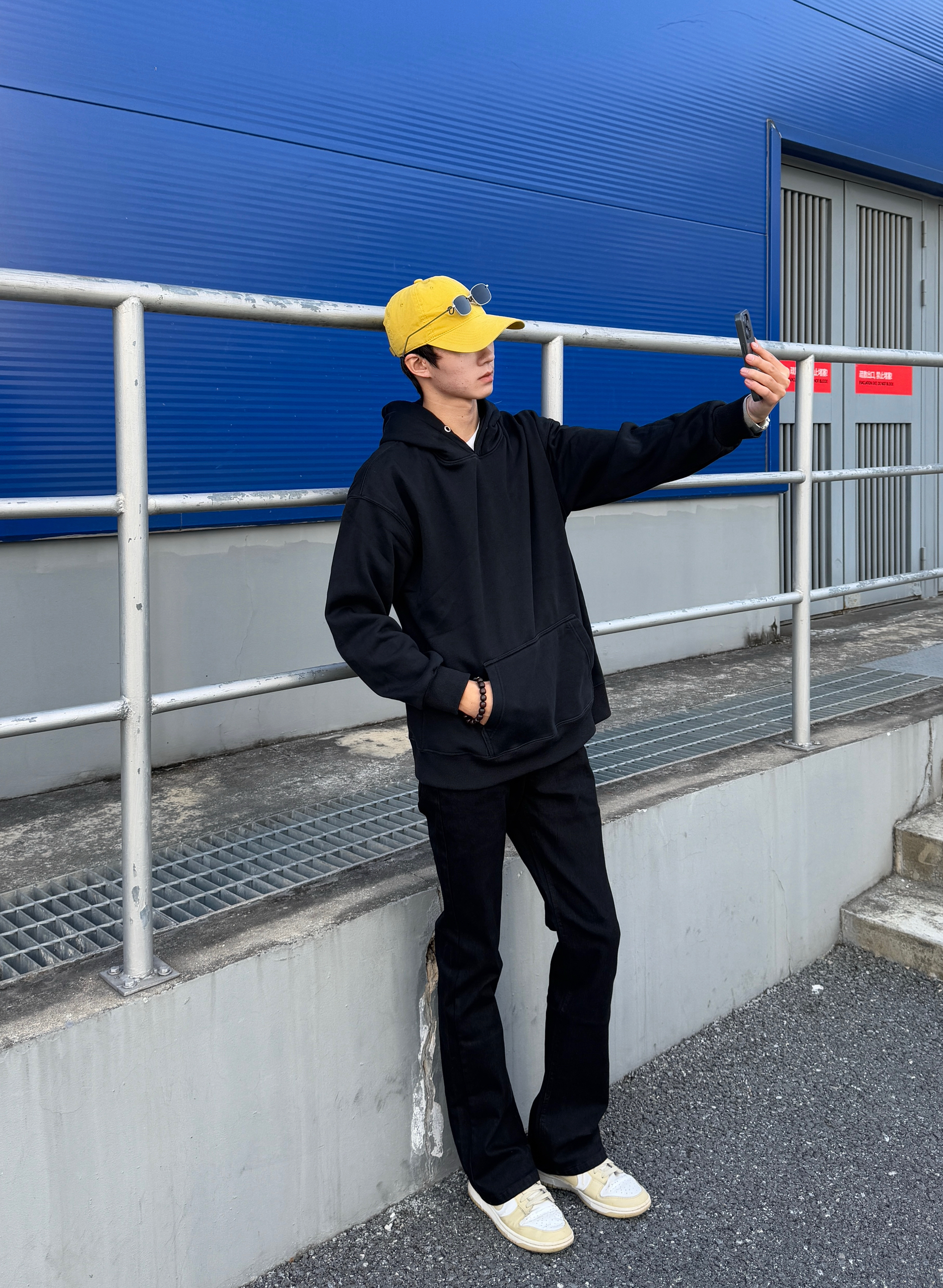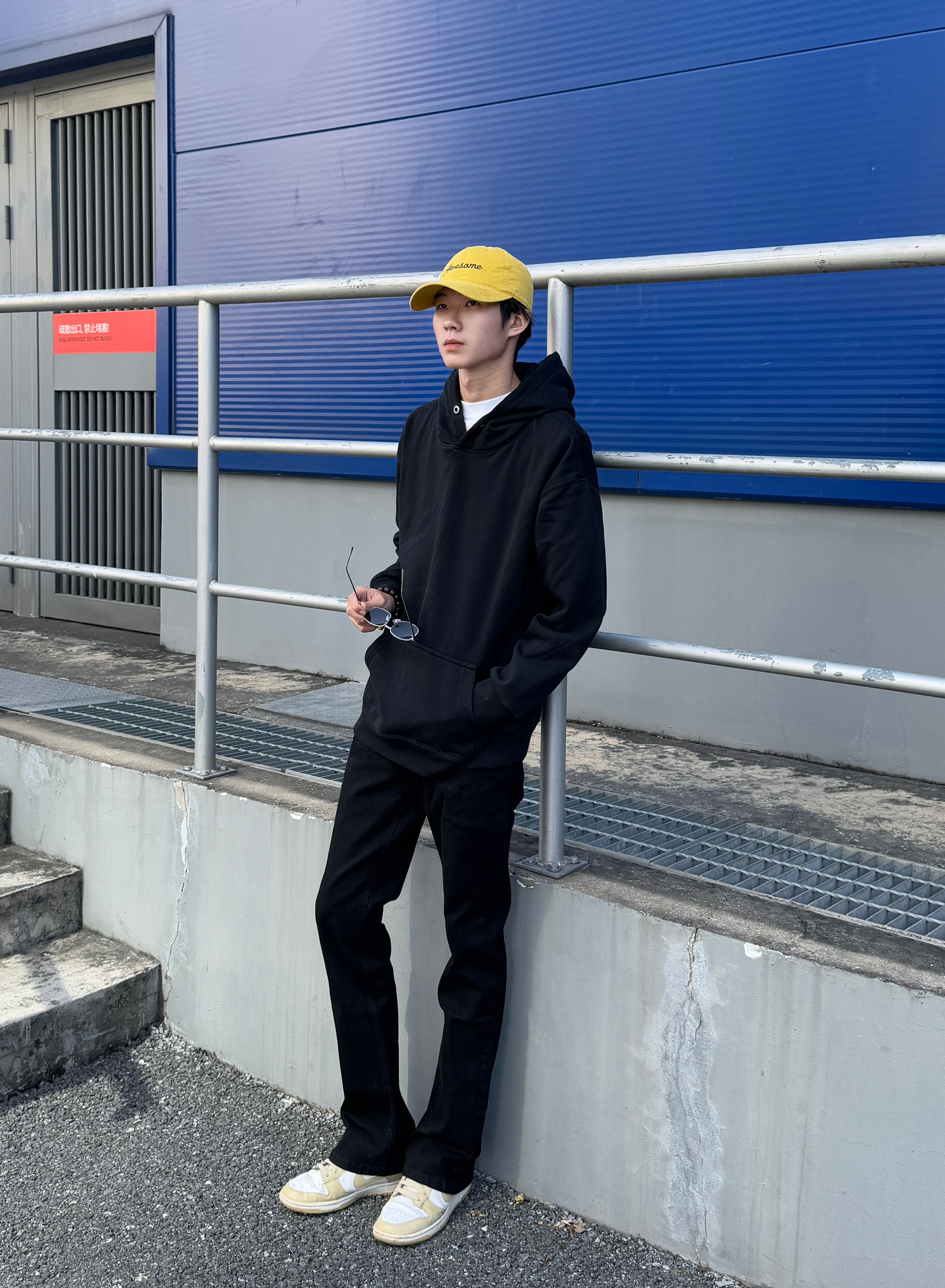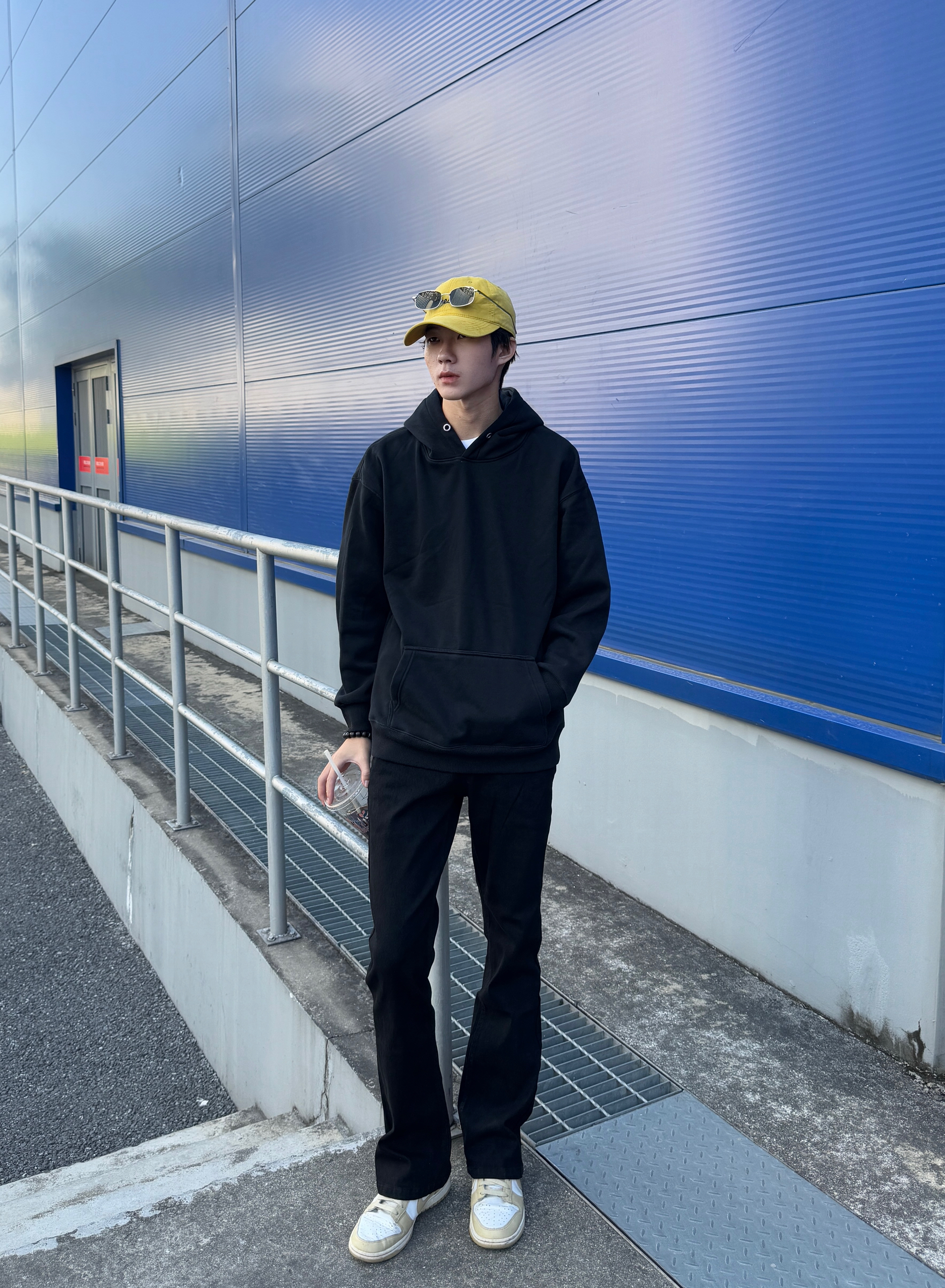 这身全黑穿搭因为一顶帽子彻底活了 黑色连帽卫衣上身就是松弛感男孩 搭配同色高街复古牛仔裤 水洗做旧细节让整体一点都不无聊~ 最绝的是这顶亮黄帽子 瞬间打破沉闷 像给穿搭注入了灵魂 全黑造型加一点亮色 简单穿出不简单的时髦感~✨