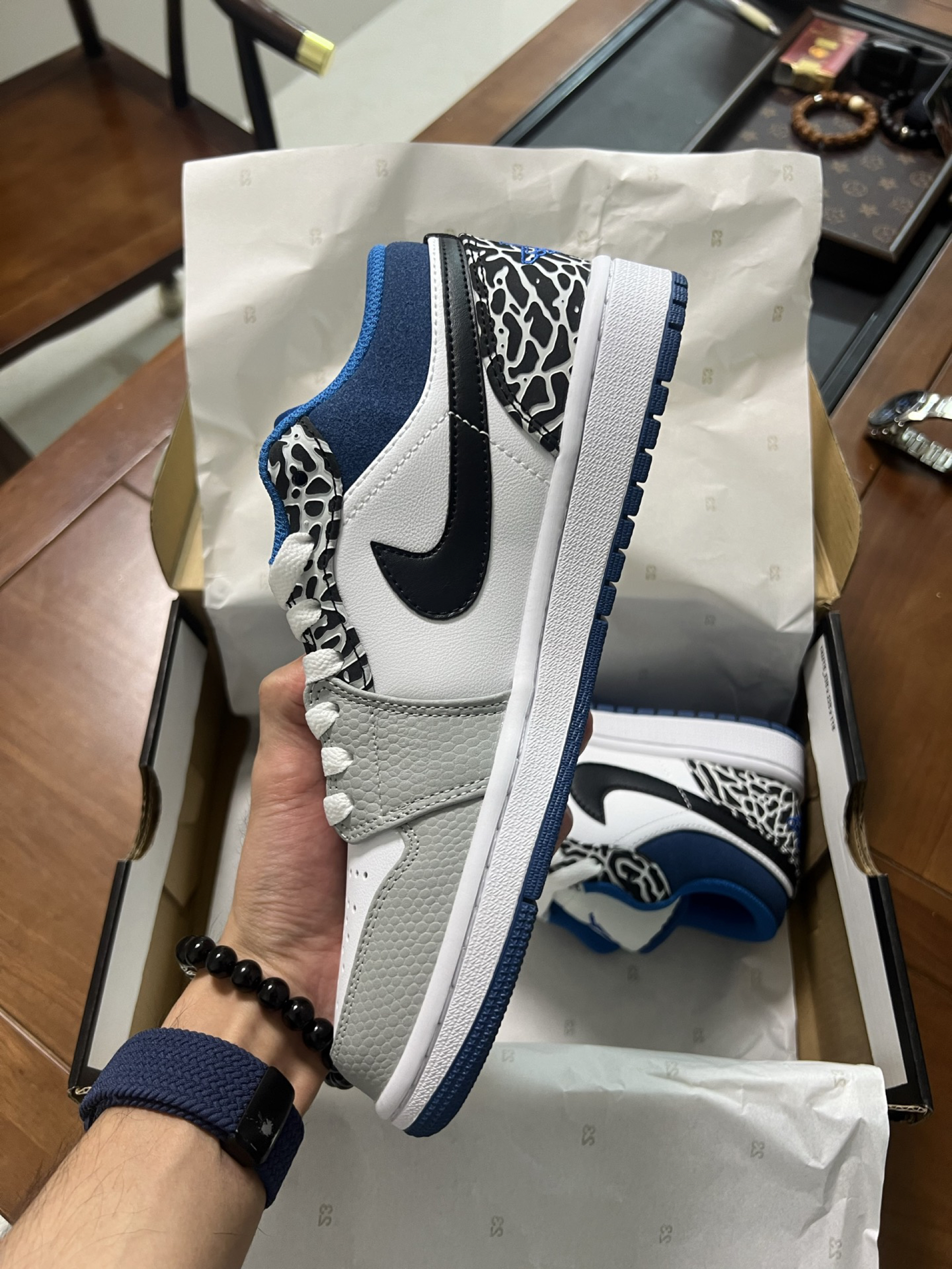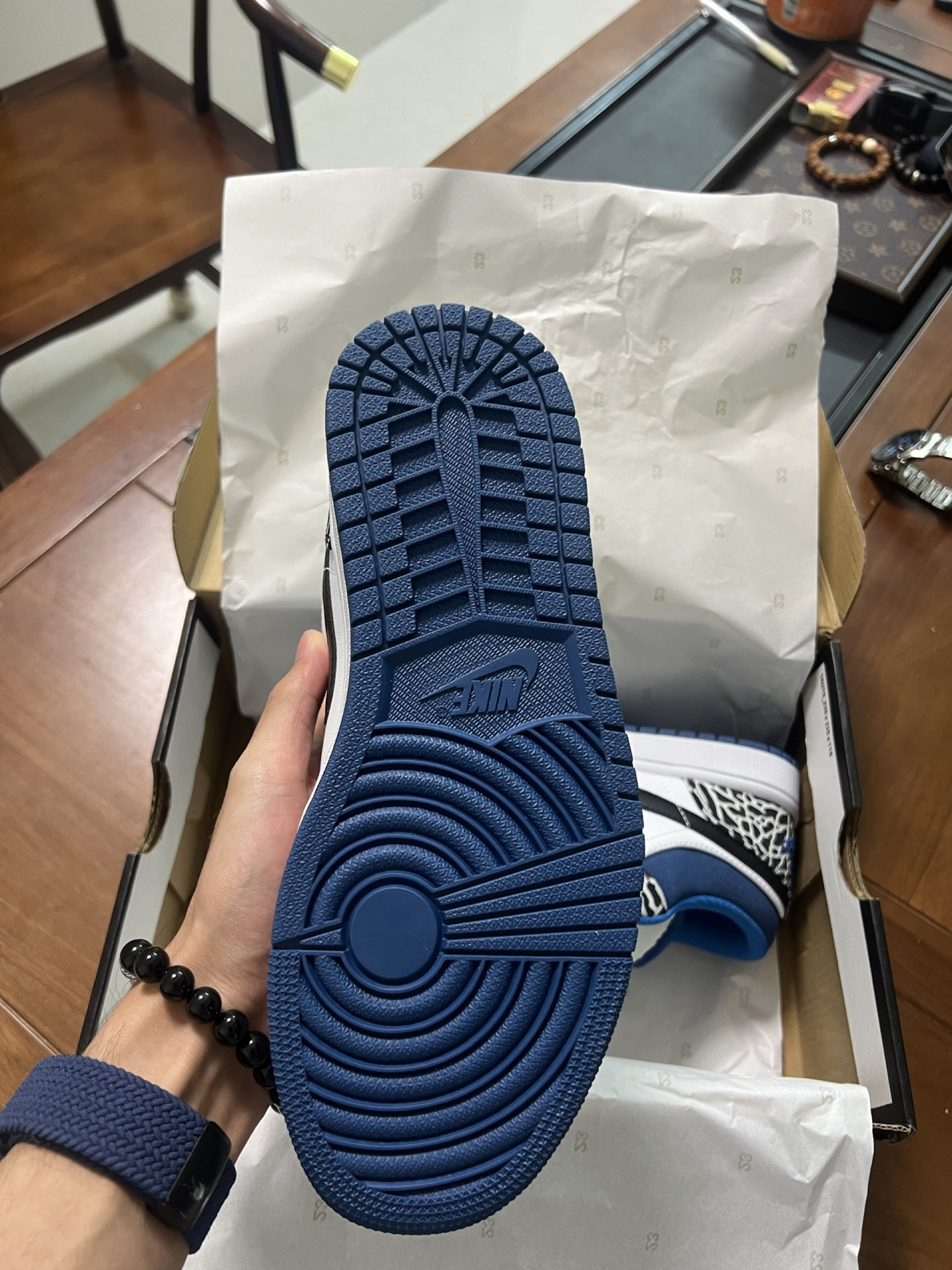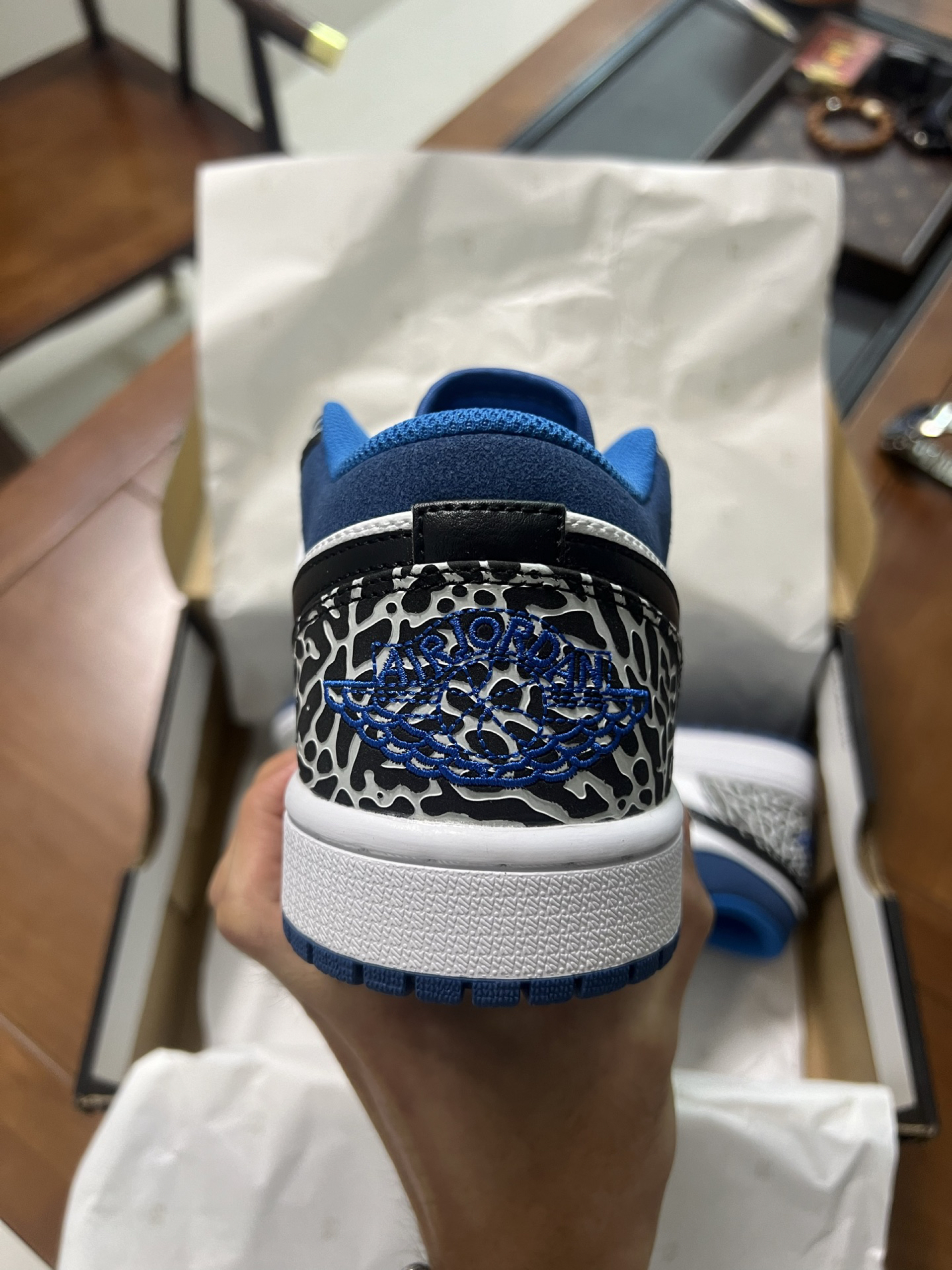 新入的Air Jordan 1白蓝编织纹款,鞋身的纹理设计超有细节,上脚颜值和脚感都在线,百元价位里的宝藏AJ1没错了~
