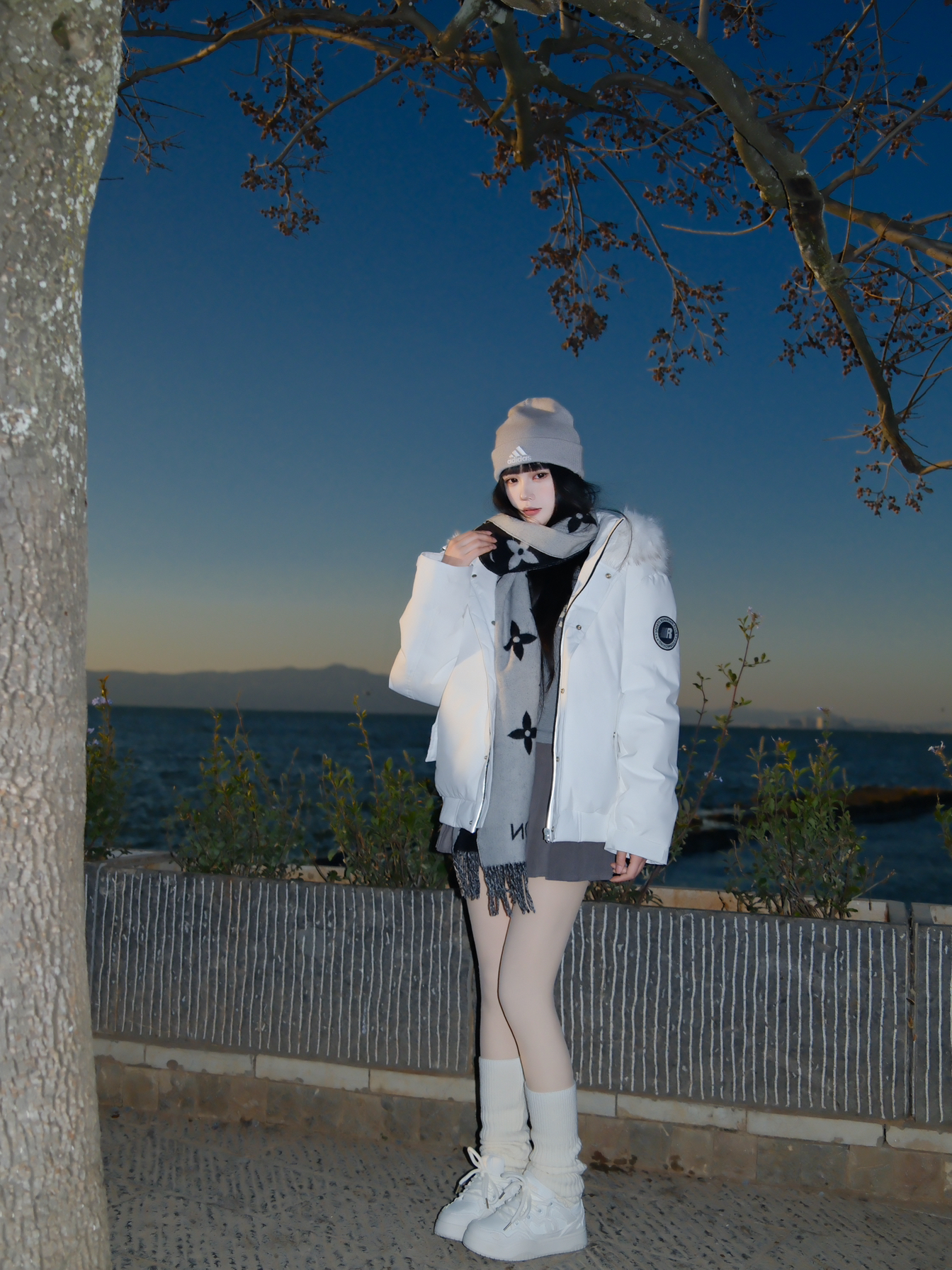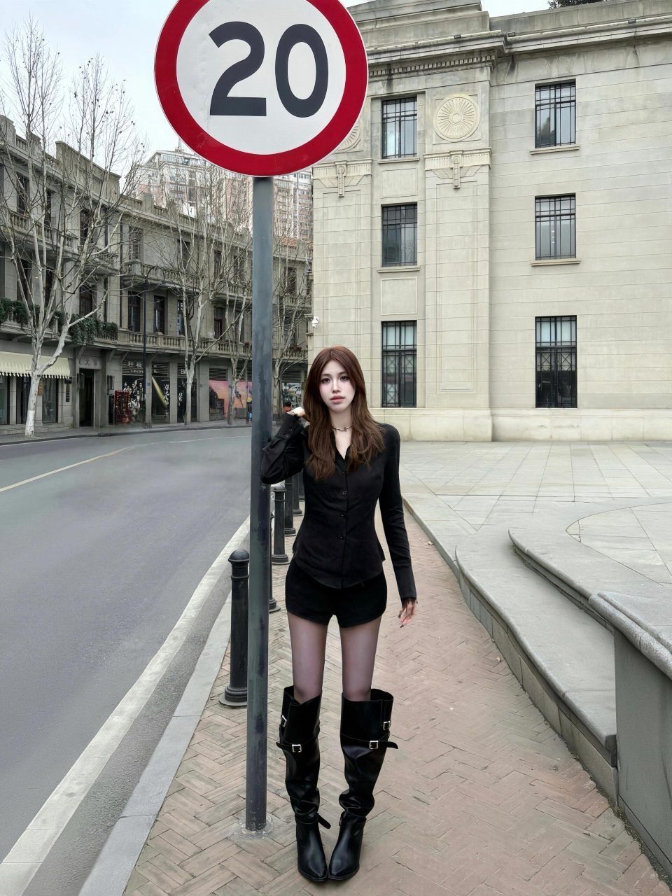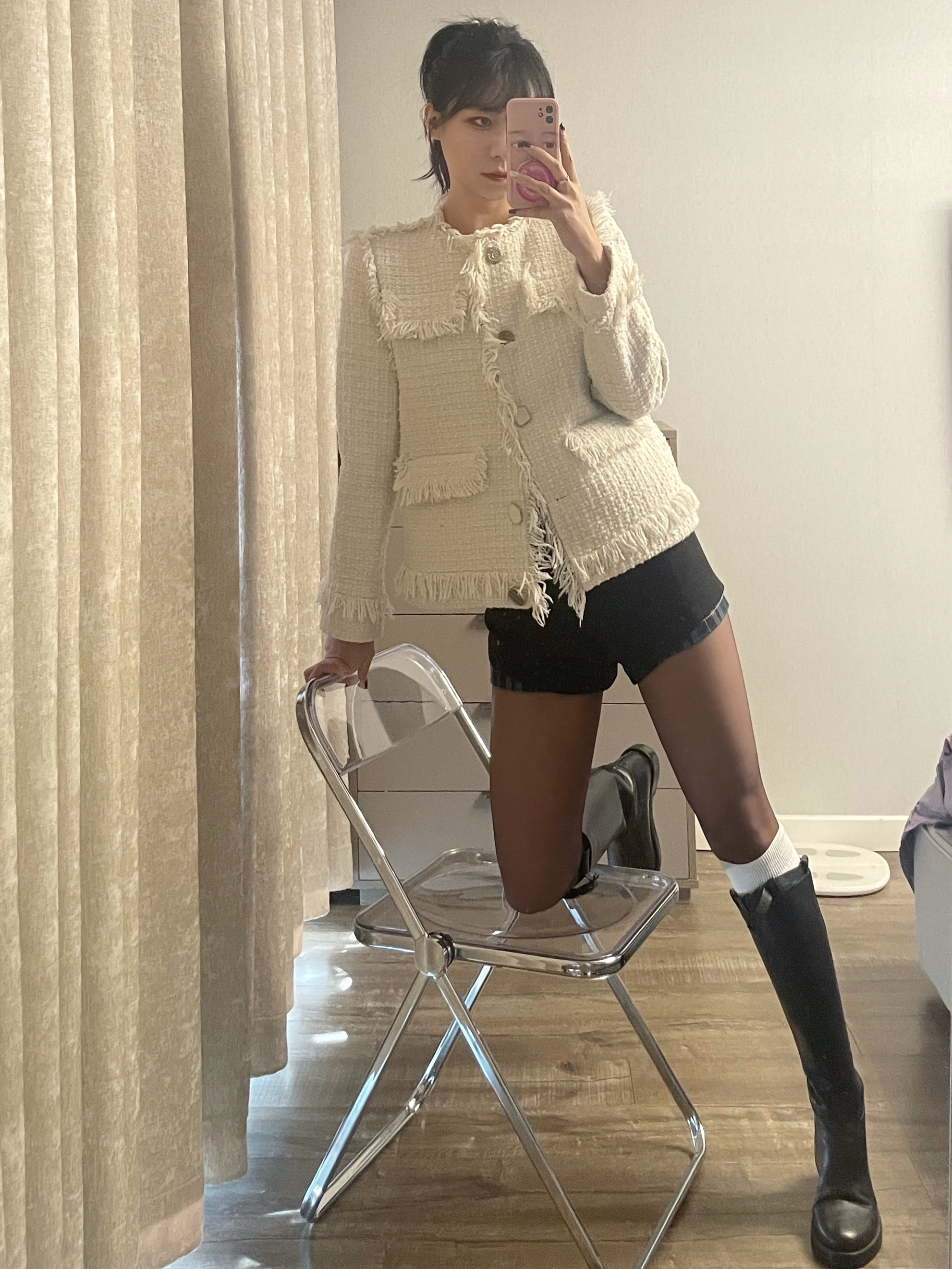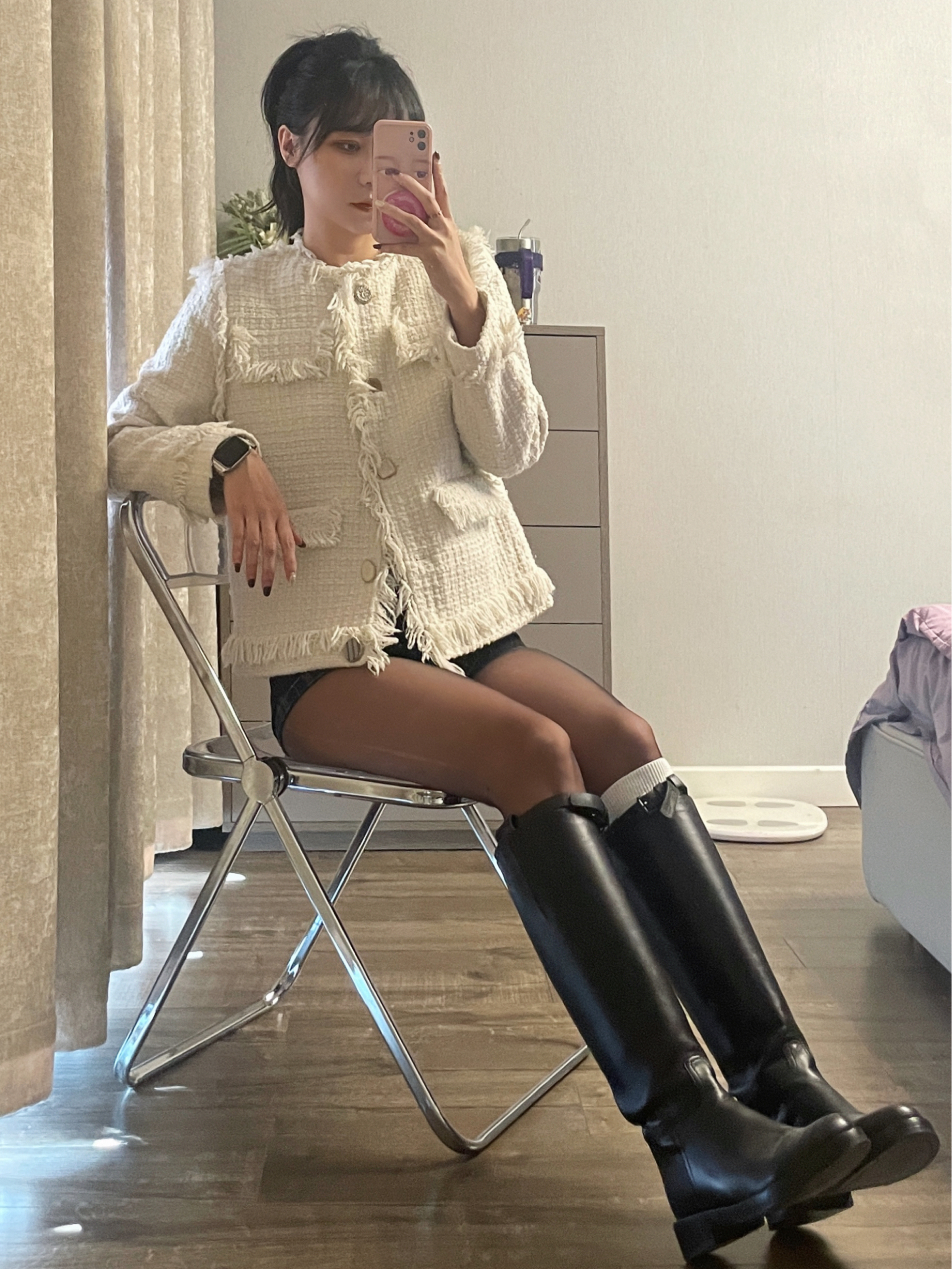 白色小香风外套搭配西装裤和黑色长靴 外加黑色丝袜一整个气质拿捏住啦
