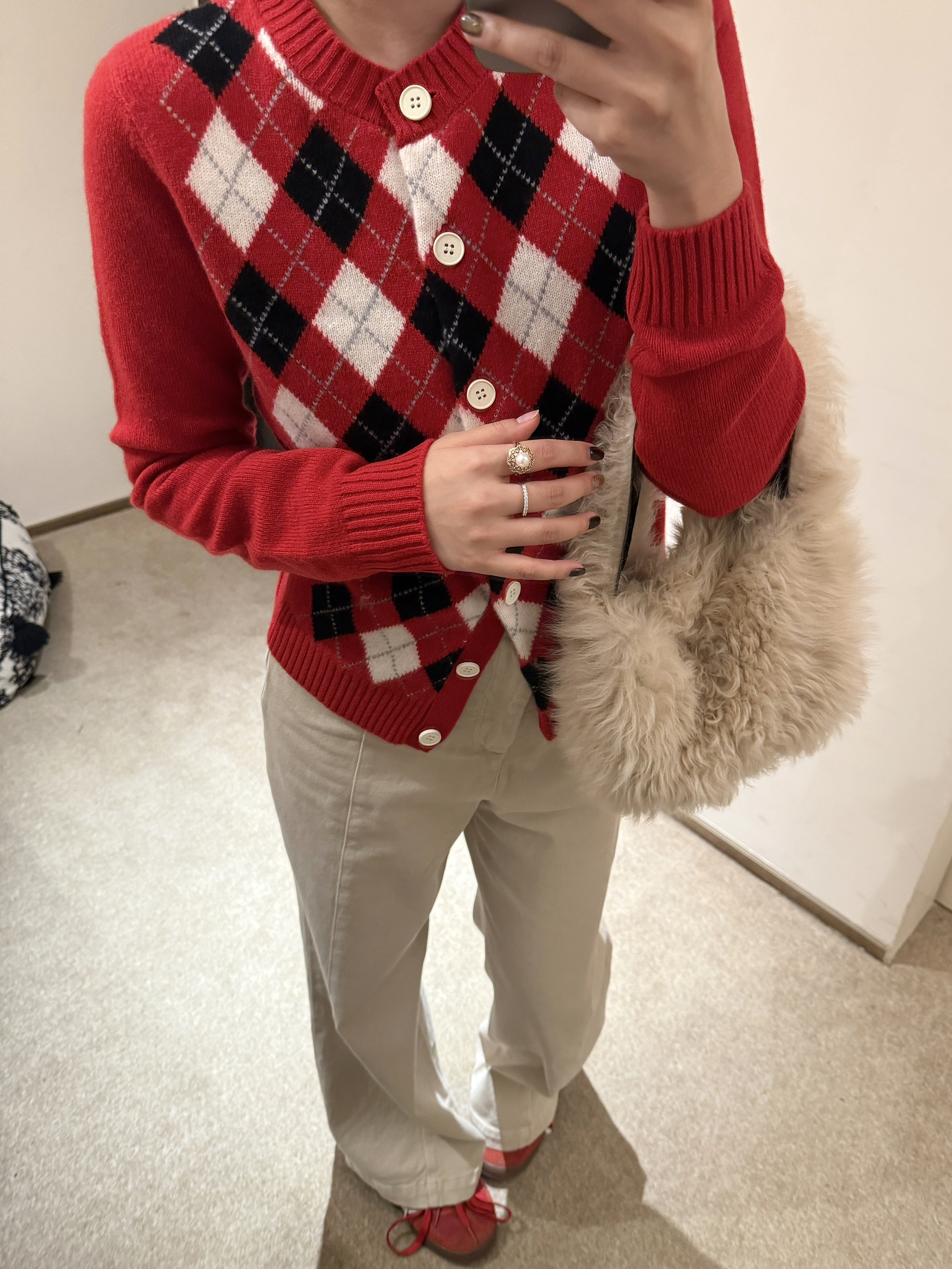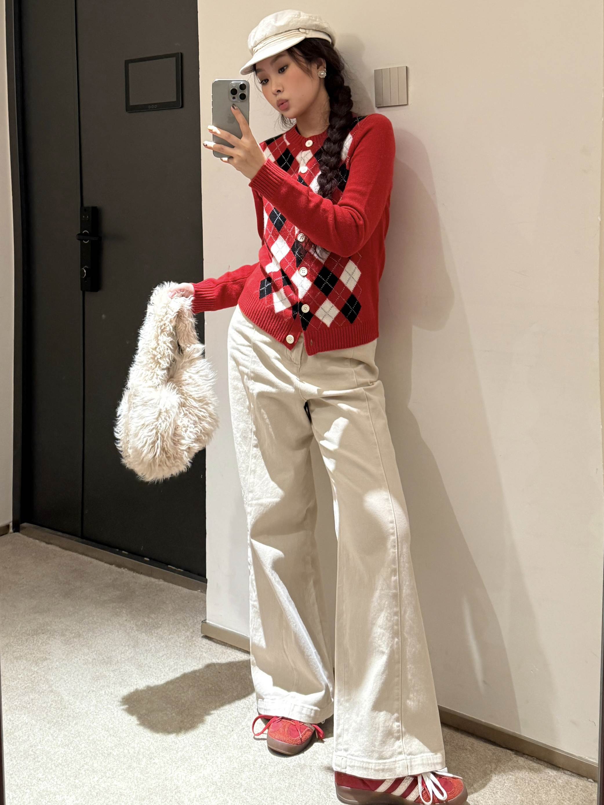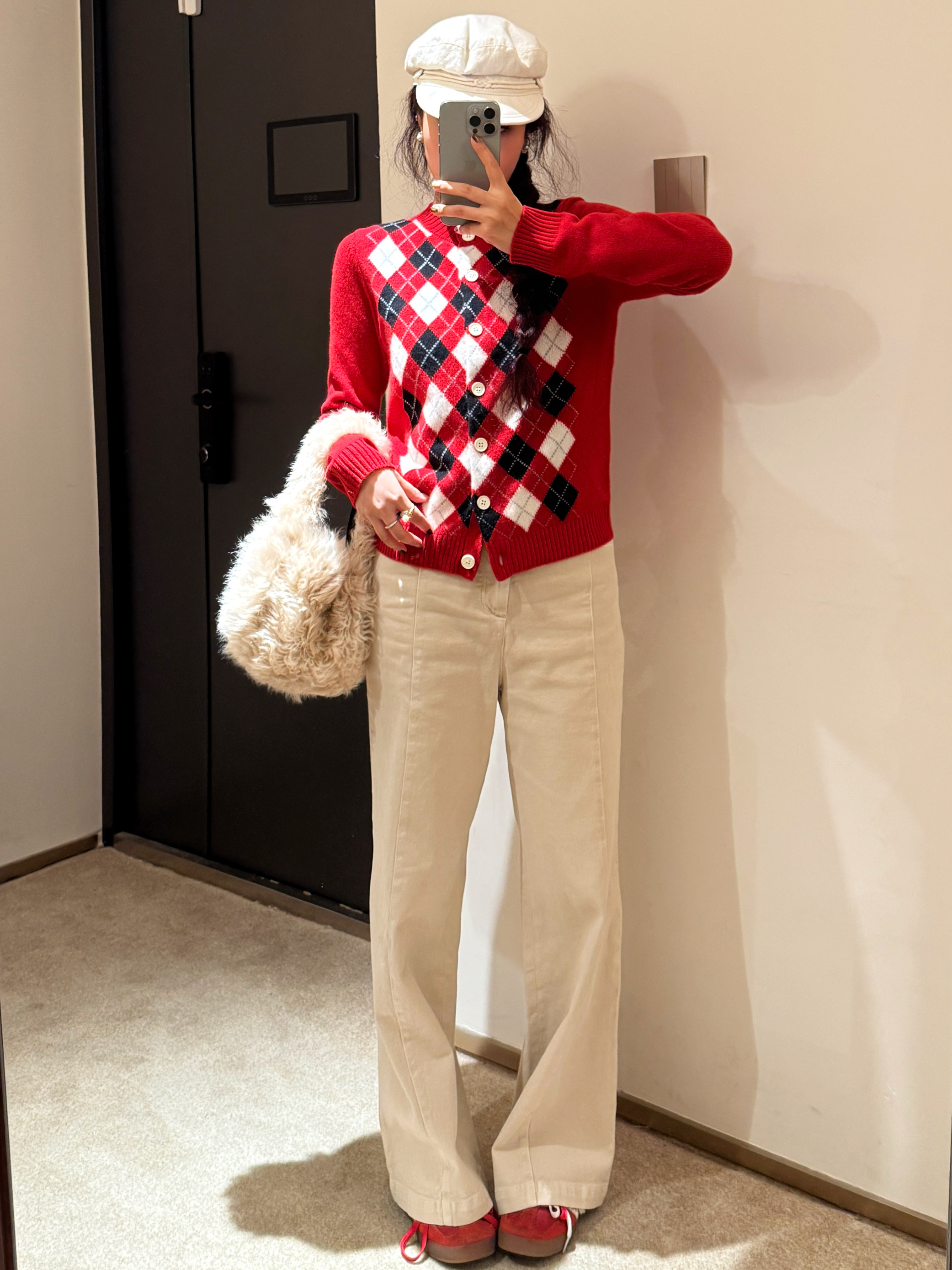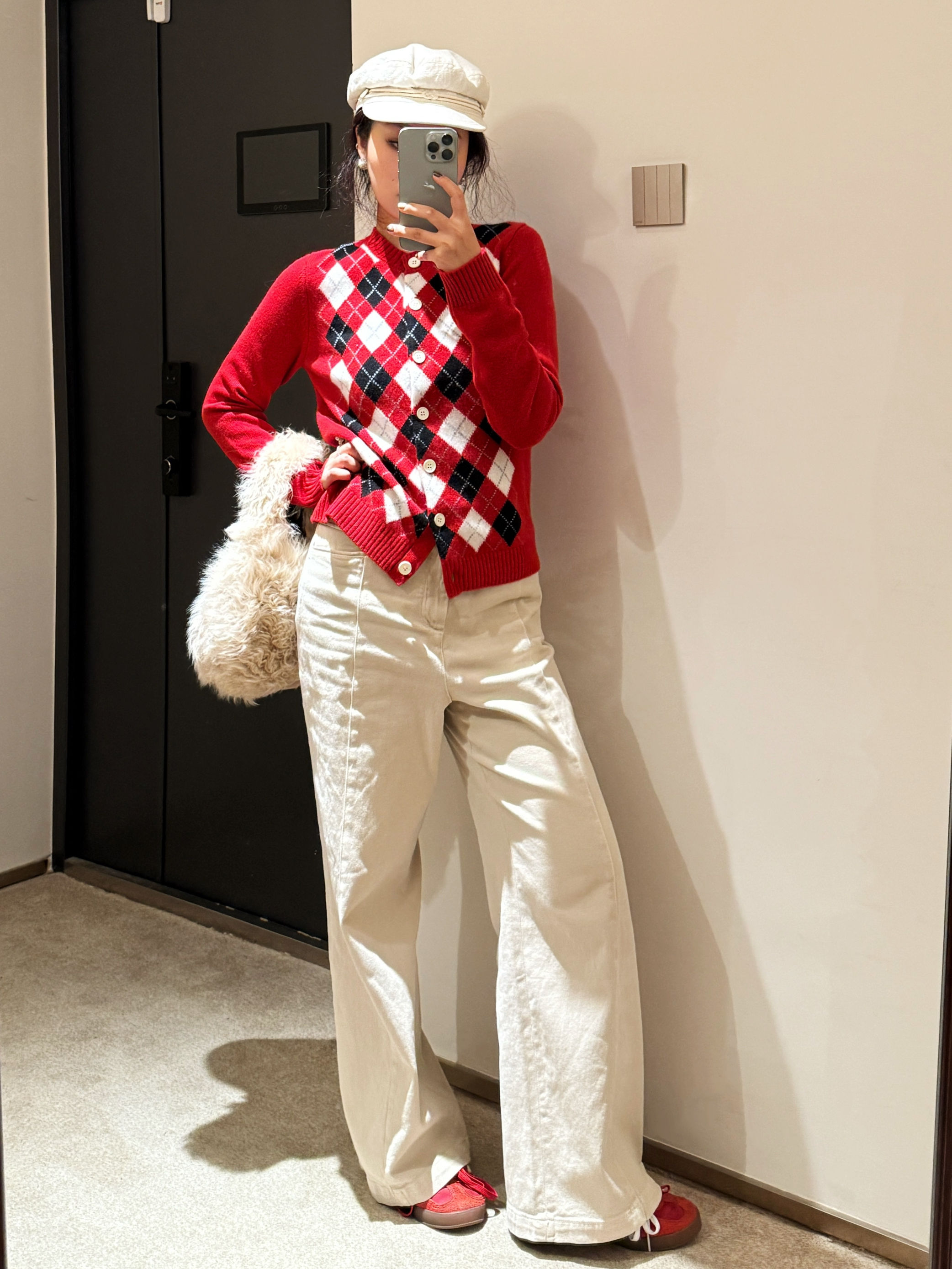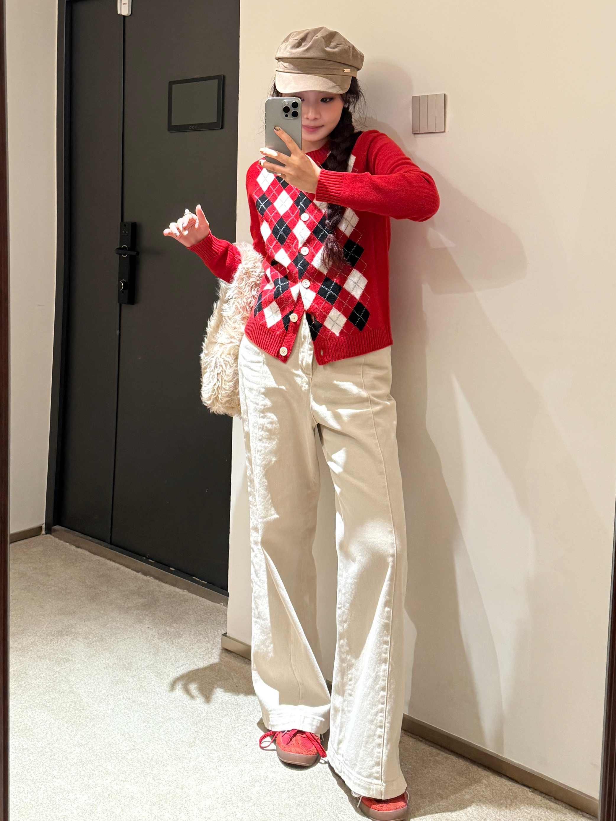 身高|体重:165 102 👔 上衣:NORTHBUTSOUTH 👟 鞋子:adidas grazelle 新年和圣诞节马上就到了 谁衣柜里还没有一件不论肤色谁穿都好看红色羊毛针织开衫!!! NORTHBUTSOUTH 新品红简直太入我心了 经典棋盘格的设计让红色不再单调 搭配米白牛仔裤和同色系帽子 一点不突兀 红色阿迪达斯鞋正好和红毛衣颜色相互呼应 一整套的颜色冲击力刚刚好! 不论是...