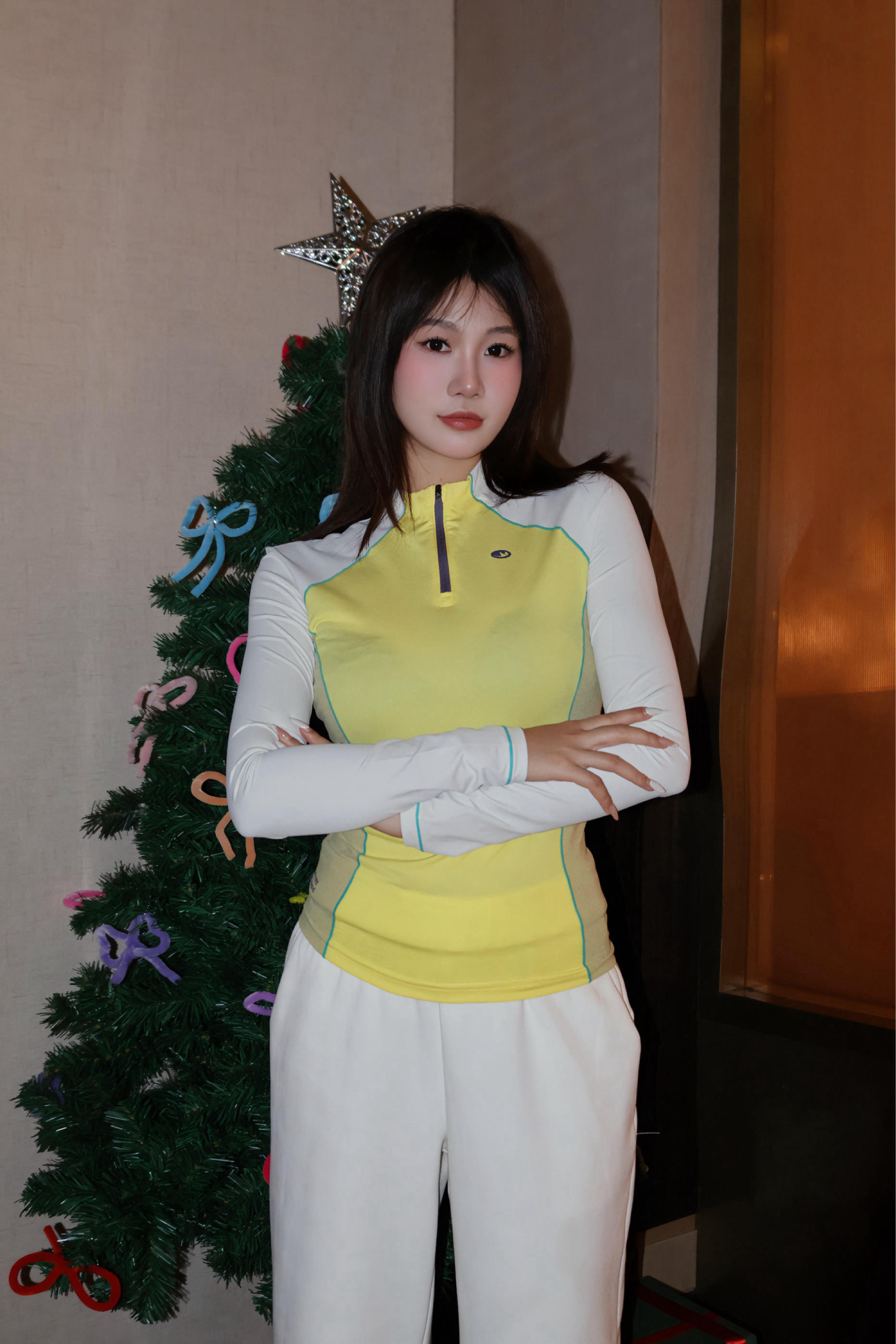 暖黄拼接白的上衣搭配阔腿白裤,把活力穿在身上~贴贴圣诞树的瞬间,感觉自己和冬日的甜趣撞了个满怀,自在又亮眼✨