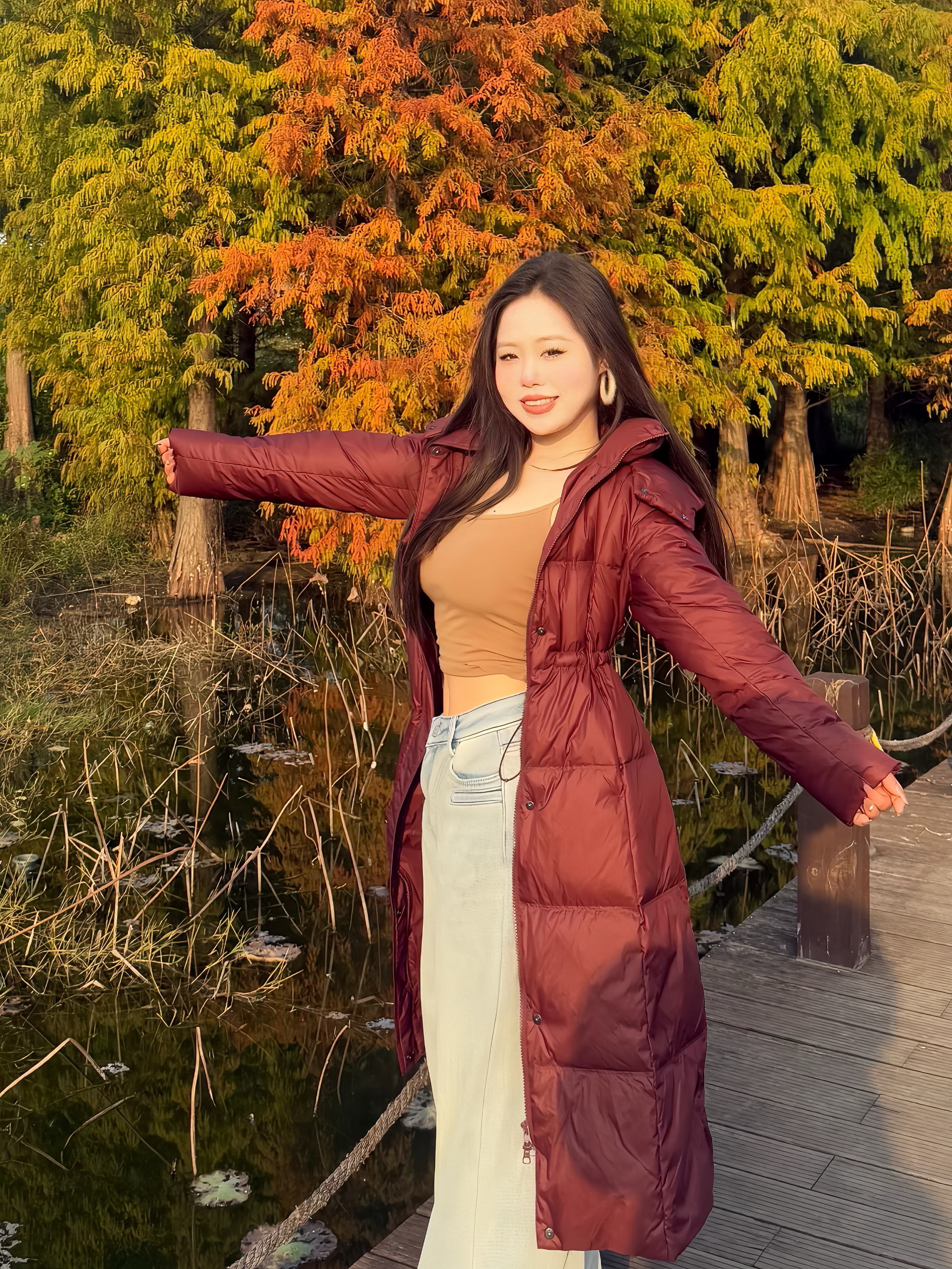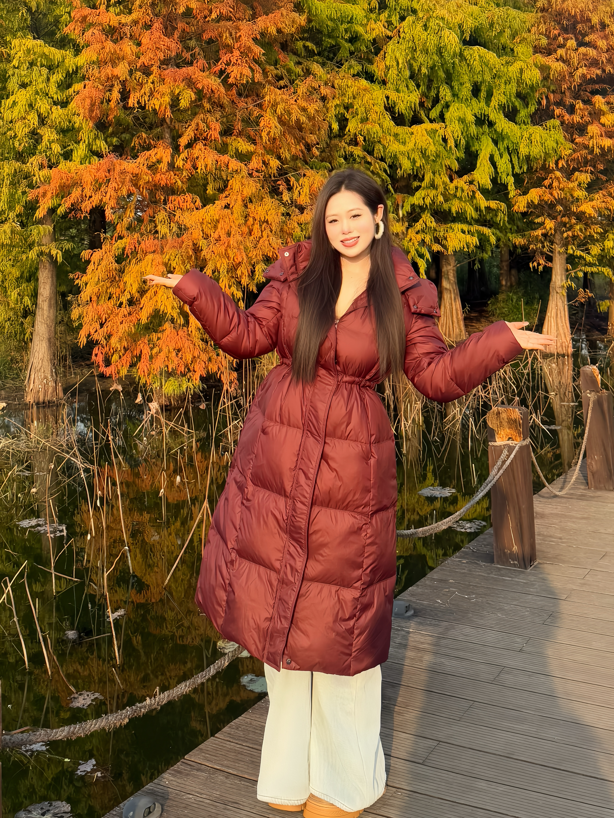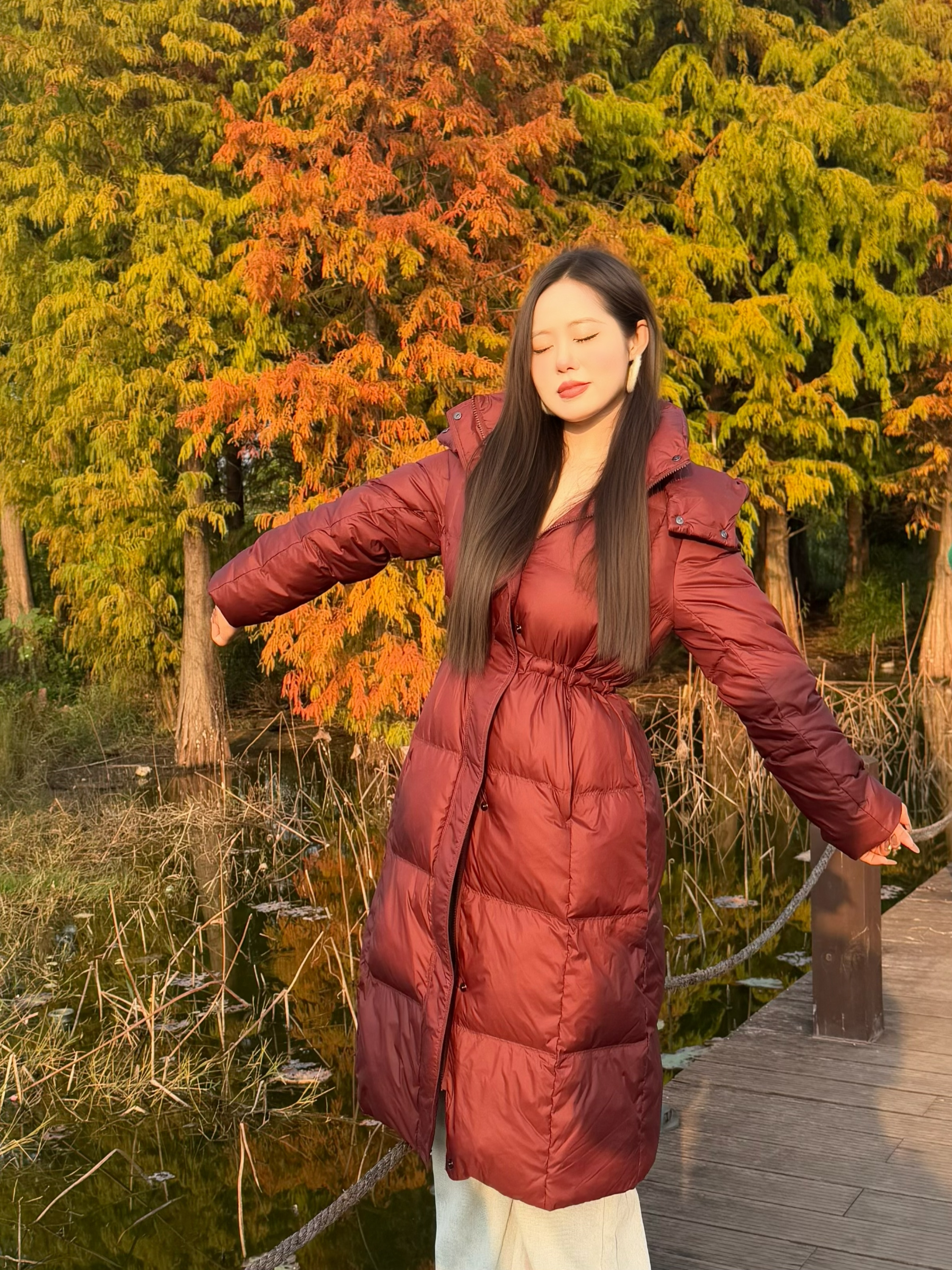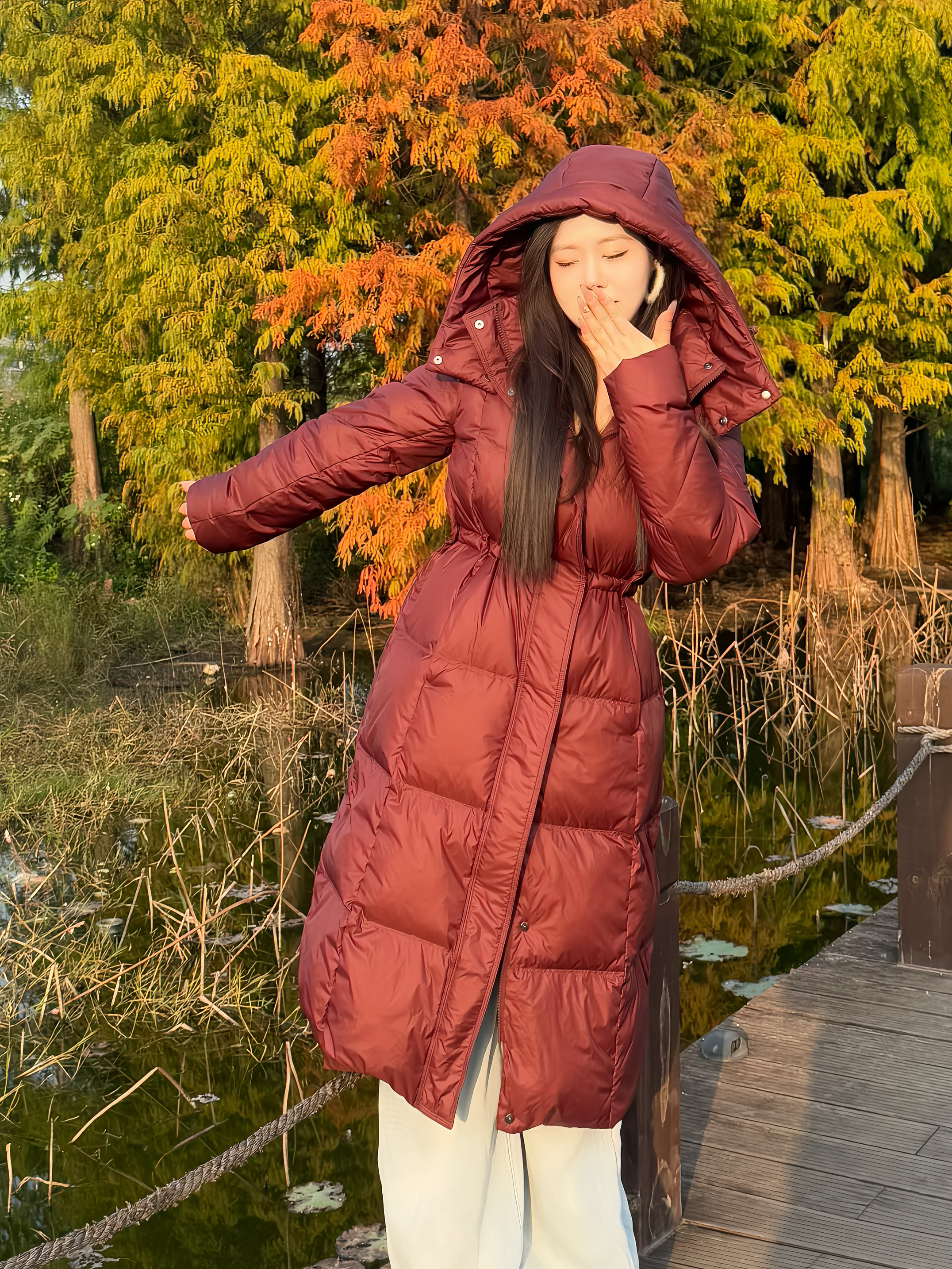 我身高160cm/55kg,穿M码合身有余,我选的香叶红,属于正好还有余量但能显比例的版型。最戳我的是它的帽子设计可脱卸,灵活搭配,戴上就是防风保暖的冬日氛围感。 抽绳收腰必须夸!不像普通羽绒服容易臃肿,它一收腰身立刻显瘦,下摆微微散开还能遮胯。整件衣服很轻,但保暖一点不含糊,90绒填充得像会呼吸的云朵,室内外温差切换也不闷汗。 细节也到位,袖口防风、口袋又大又深,连帽檐上的手工编结扣都精致...