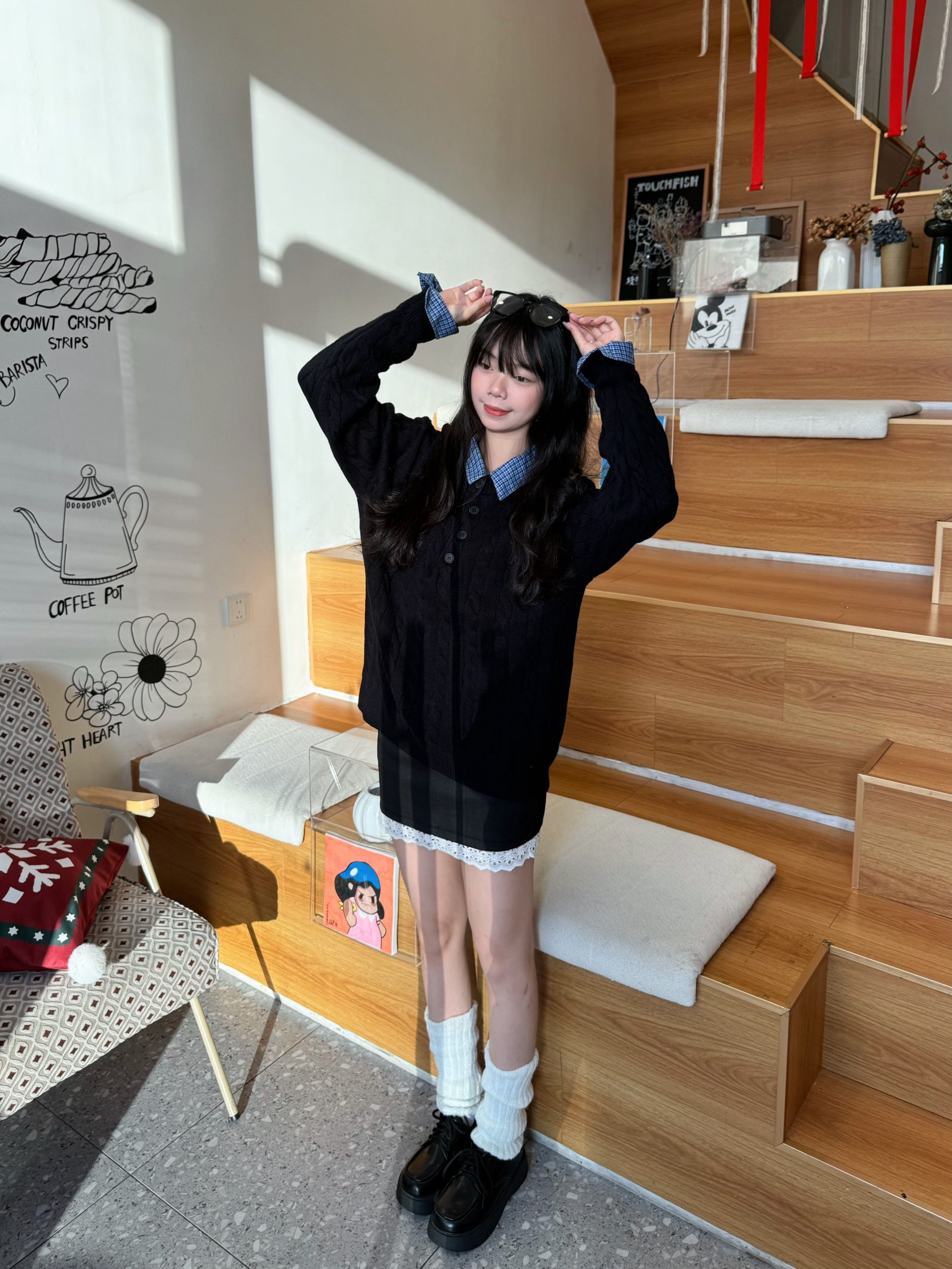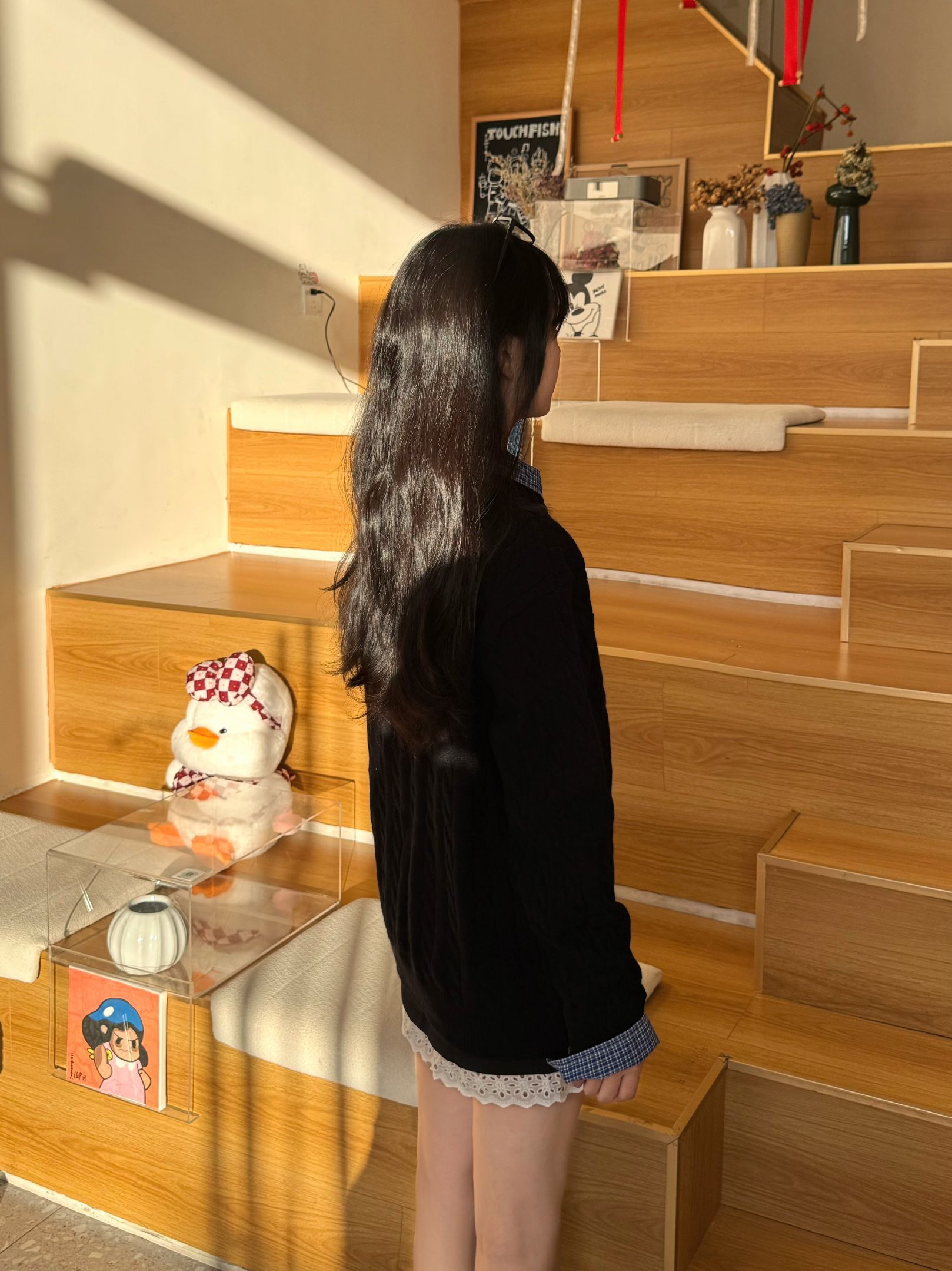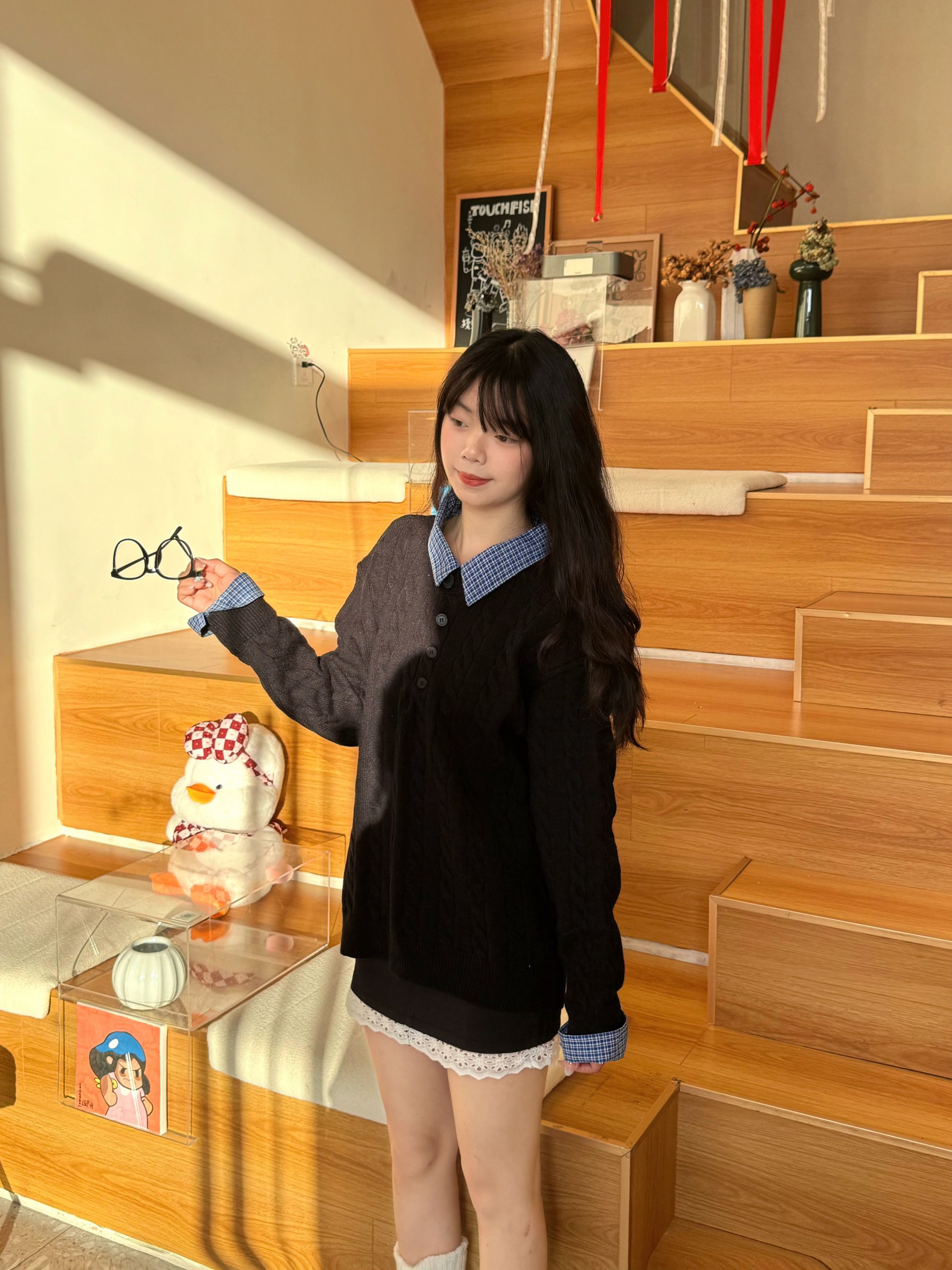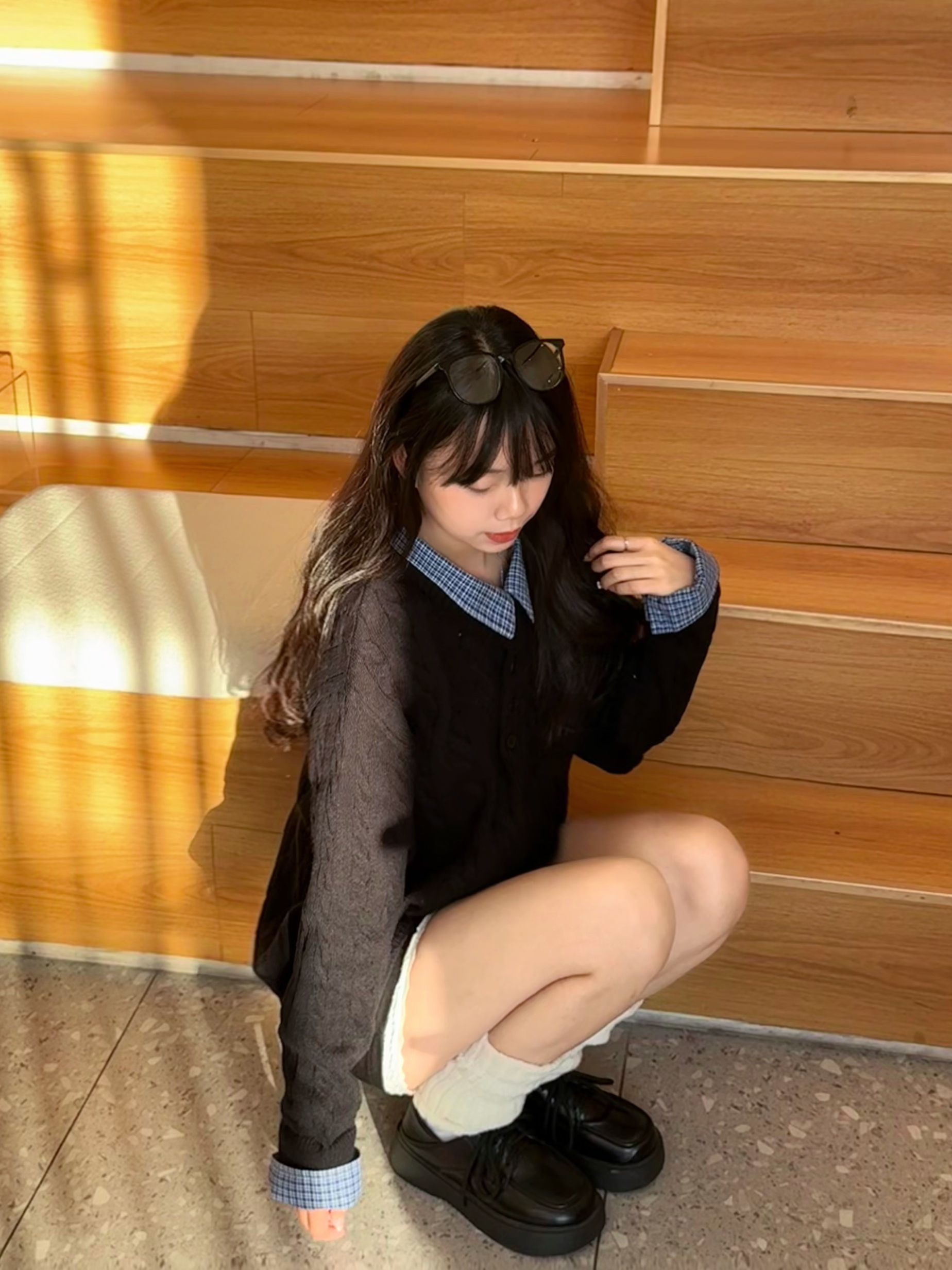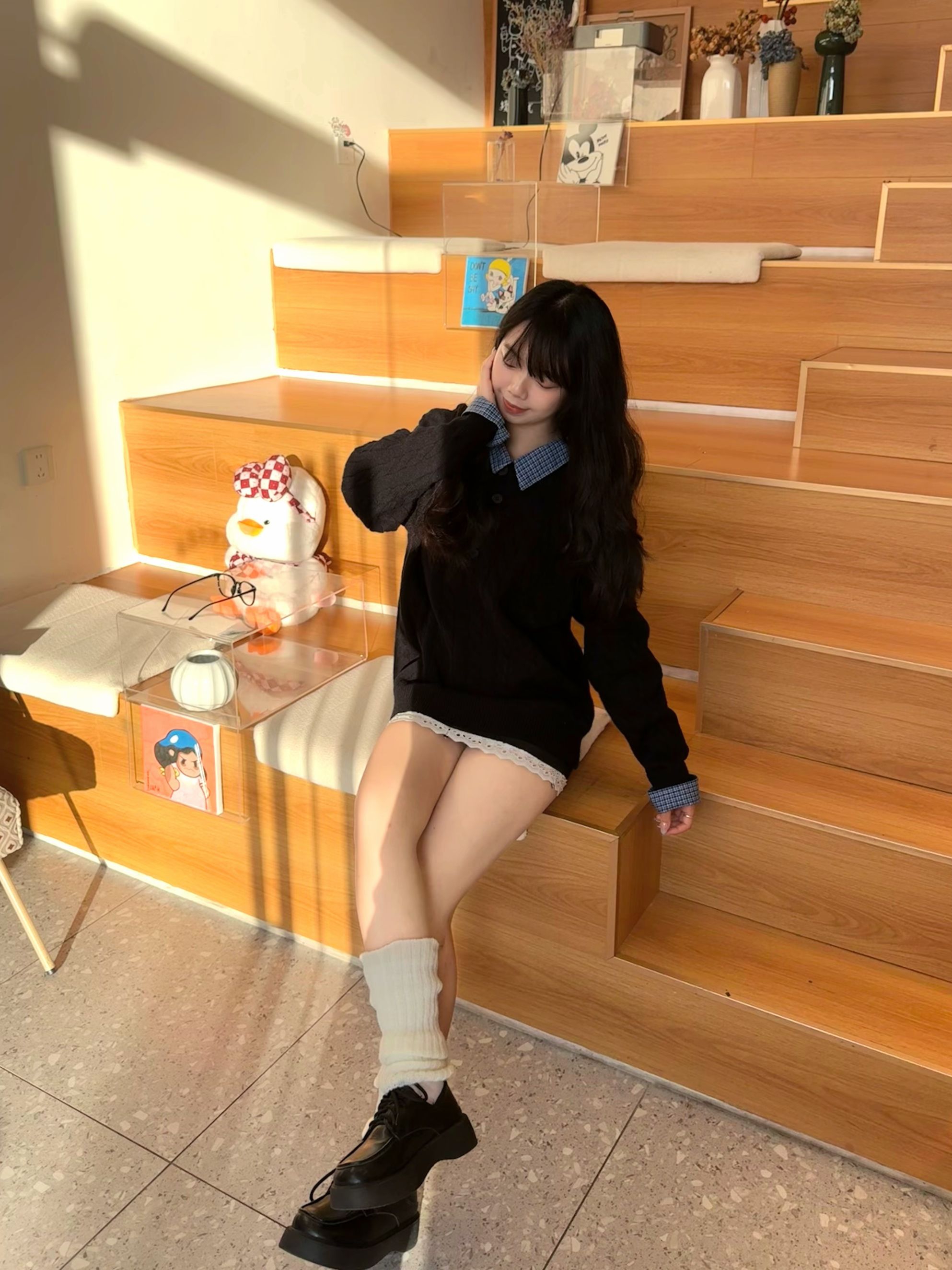 Hi,Hi,今天咖啡店☕坐坐 来咖啡店就想📸哈哈哈 今天穿的是一件假两件的毛衣噢~ 衬衫领让穿搭整体有了层次感!!! 学院风拉满了👍🏻 搭配了一件小短裙,嘎嘎出片 毛衣还挺重工滴,不易气球噢😍