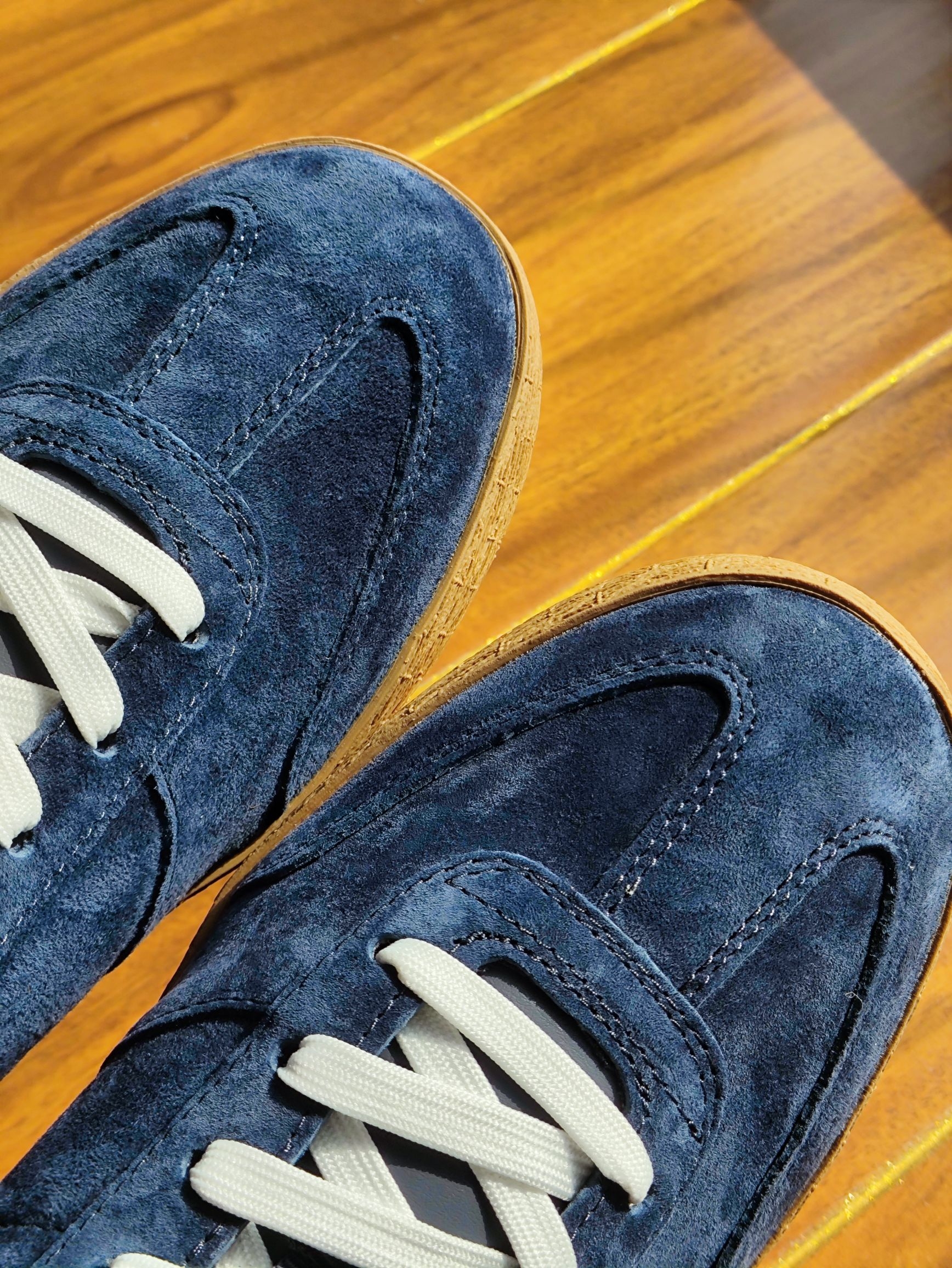 盼了几天的鞋子终于到了,拆快递的时候还挺期待,打开一看完全没失望!藏青色麂皮摸着手感特别好,软乎乎的不生硬,和白色拼接在一起特别干净,线条也整整齐齐的,看着就很顺眼。 鞋底是那种复古生胶底,颜色淡淡的很有质感,看着就很扎实,平时走路多也不怕磨坏,感觉能穿好久。最戳我的是小细节,鞋舌和里面的黑白条纹很特别,不会显得单调,鞋头还有个小小的刺绣标,不显眼但能看出用心,这点还挺加分的。 试穿了十几...