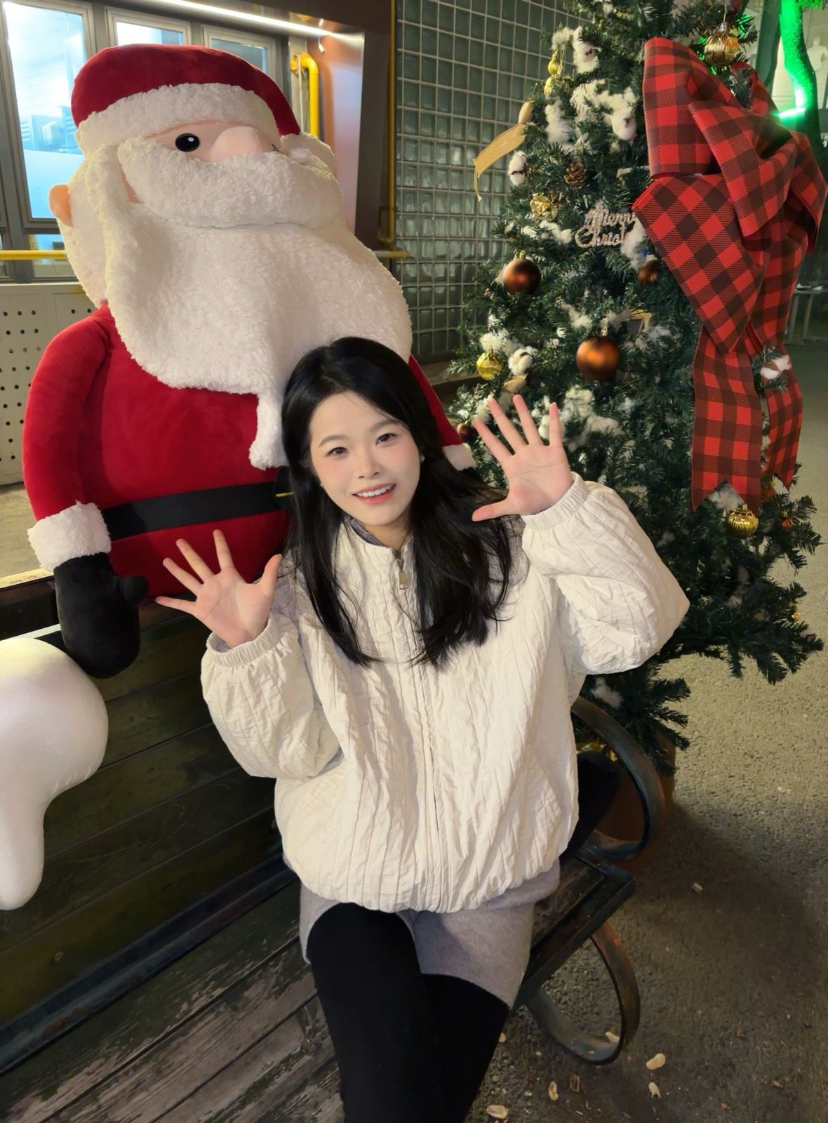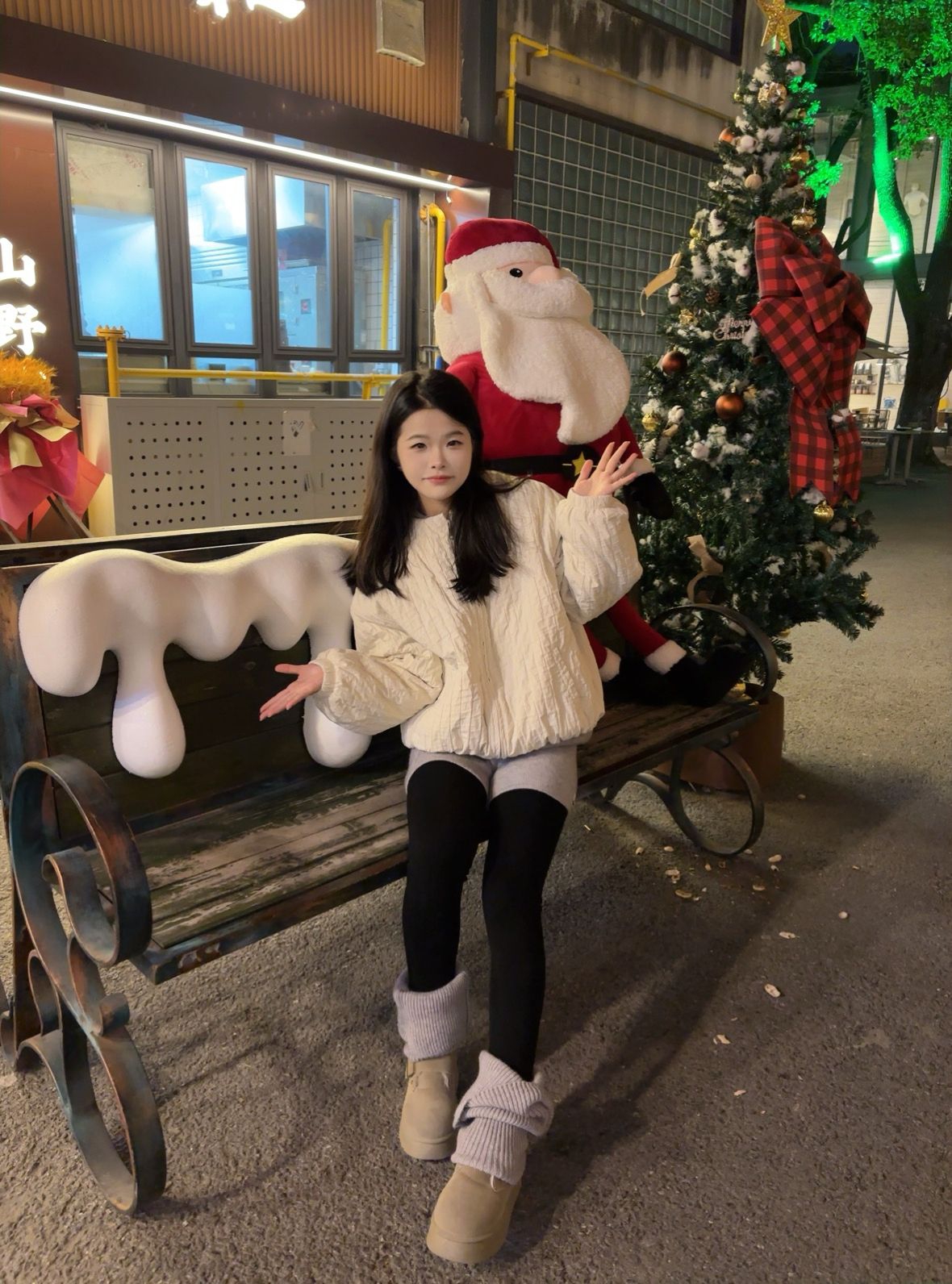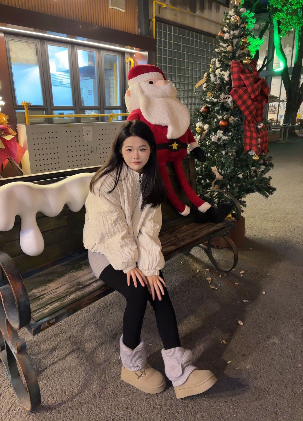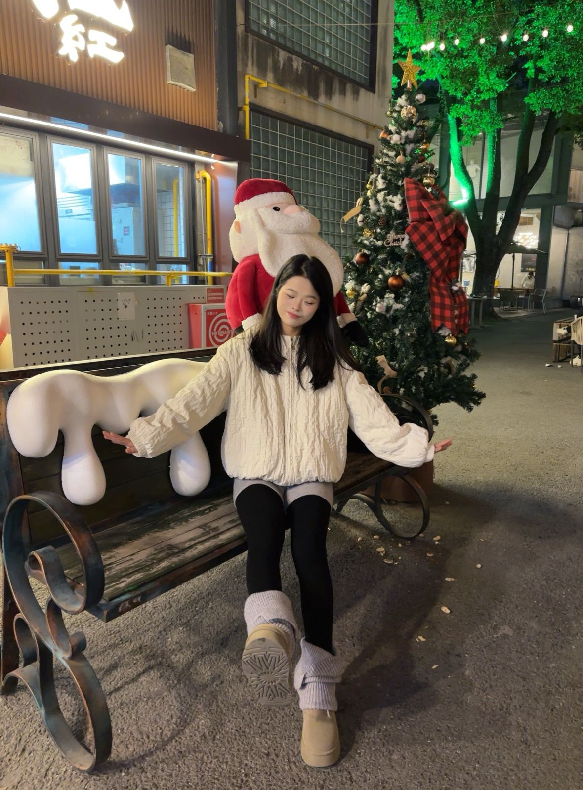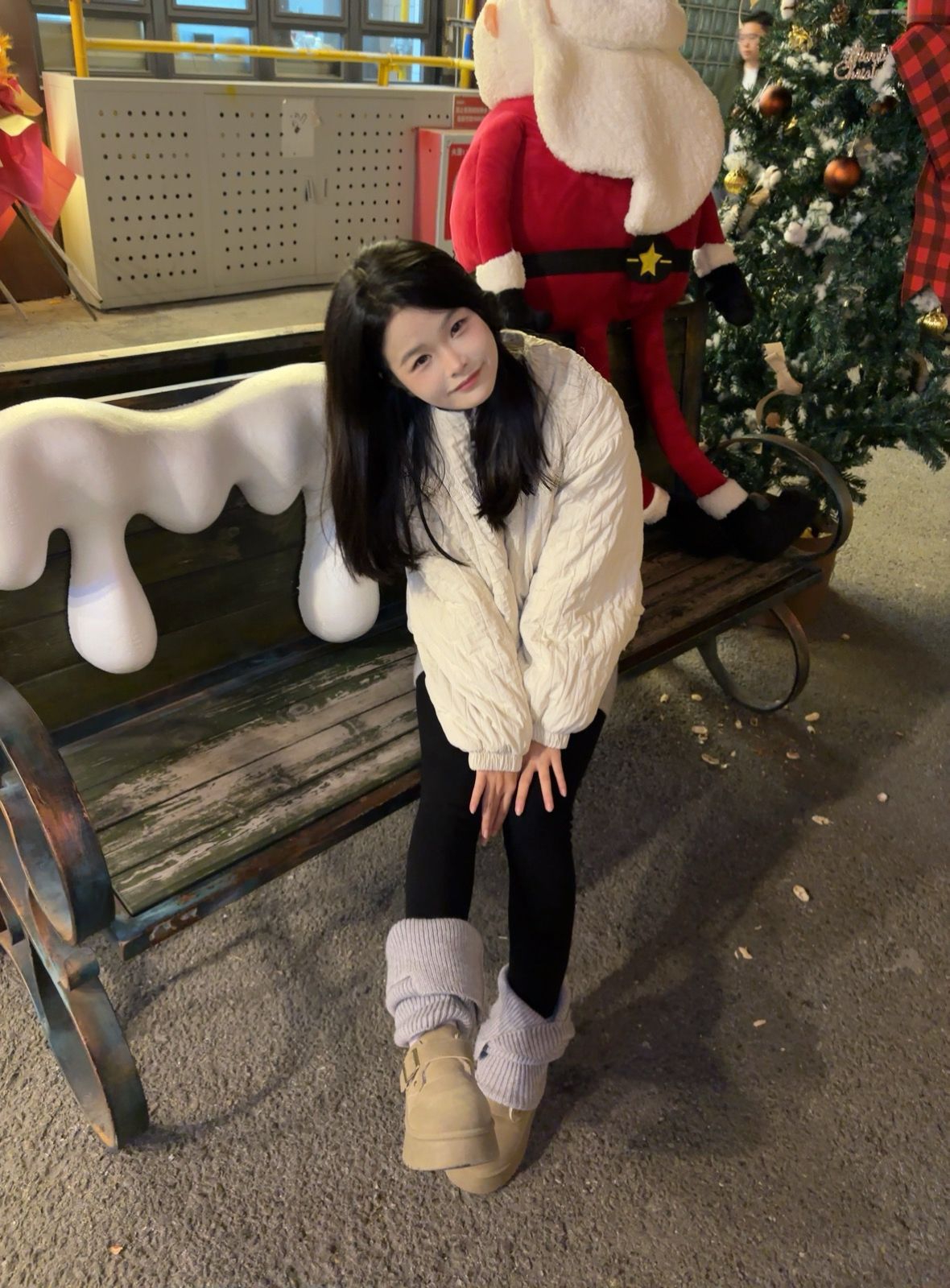 圣诞季的街头怎么穿才又暖又出片? 这套奶白色菱格棉服搭配 冬日甜妹感拿捏住了✨ 棉服是软软的菱格纹理面料,摸起来糯叽叽的穿上身轻又暖短款 对小个子超友好~我160cm穿S码刚好好 下半身搭了灰色打底裤+黑色光腿神器 再配堆堆袜和雪地靴和圣诞布景同框拍照 氛围感直接拉满🎄