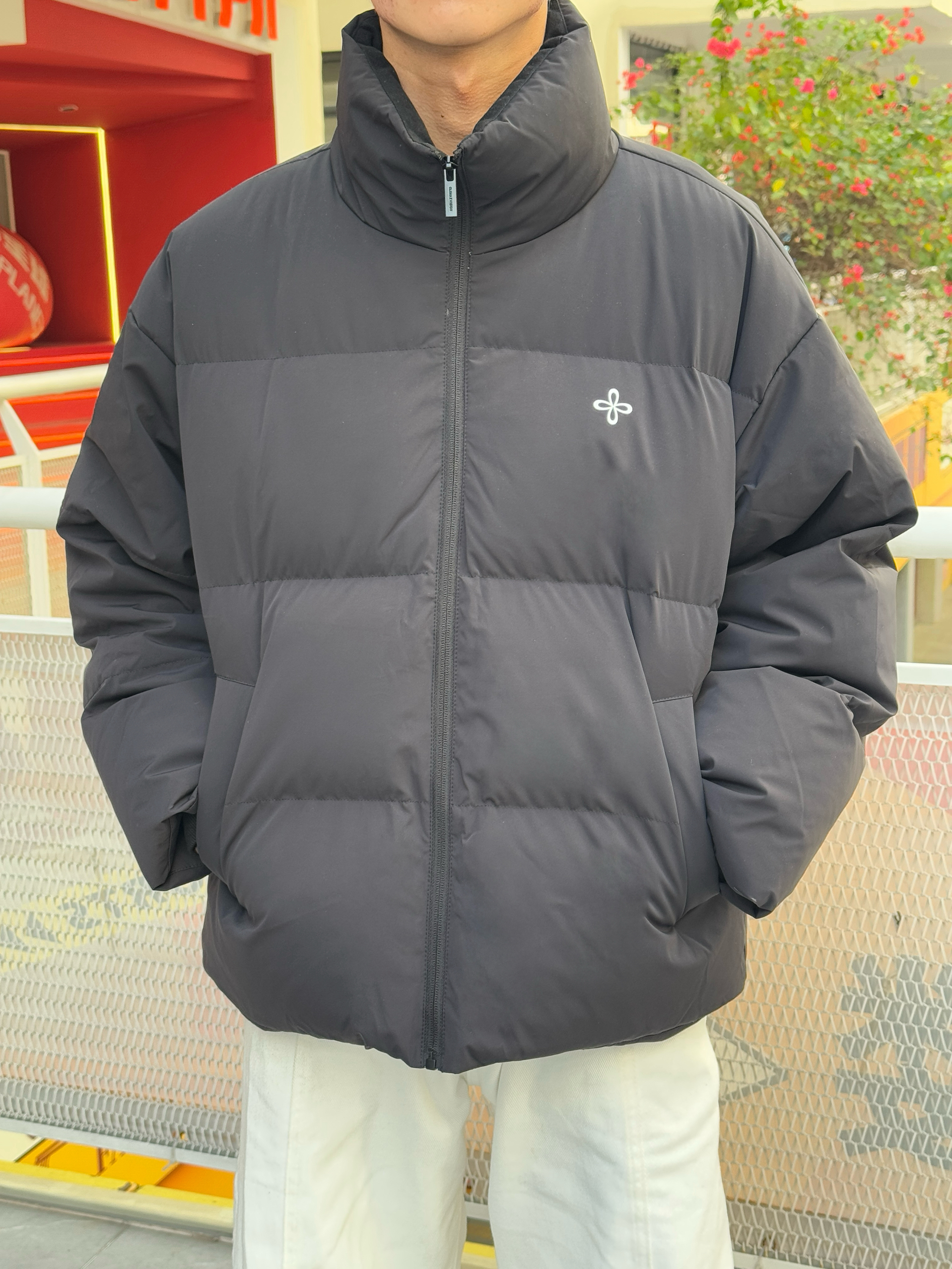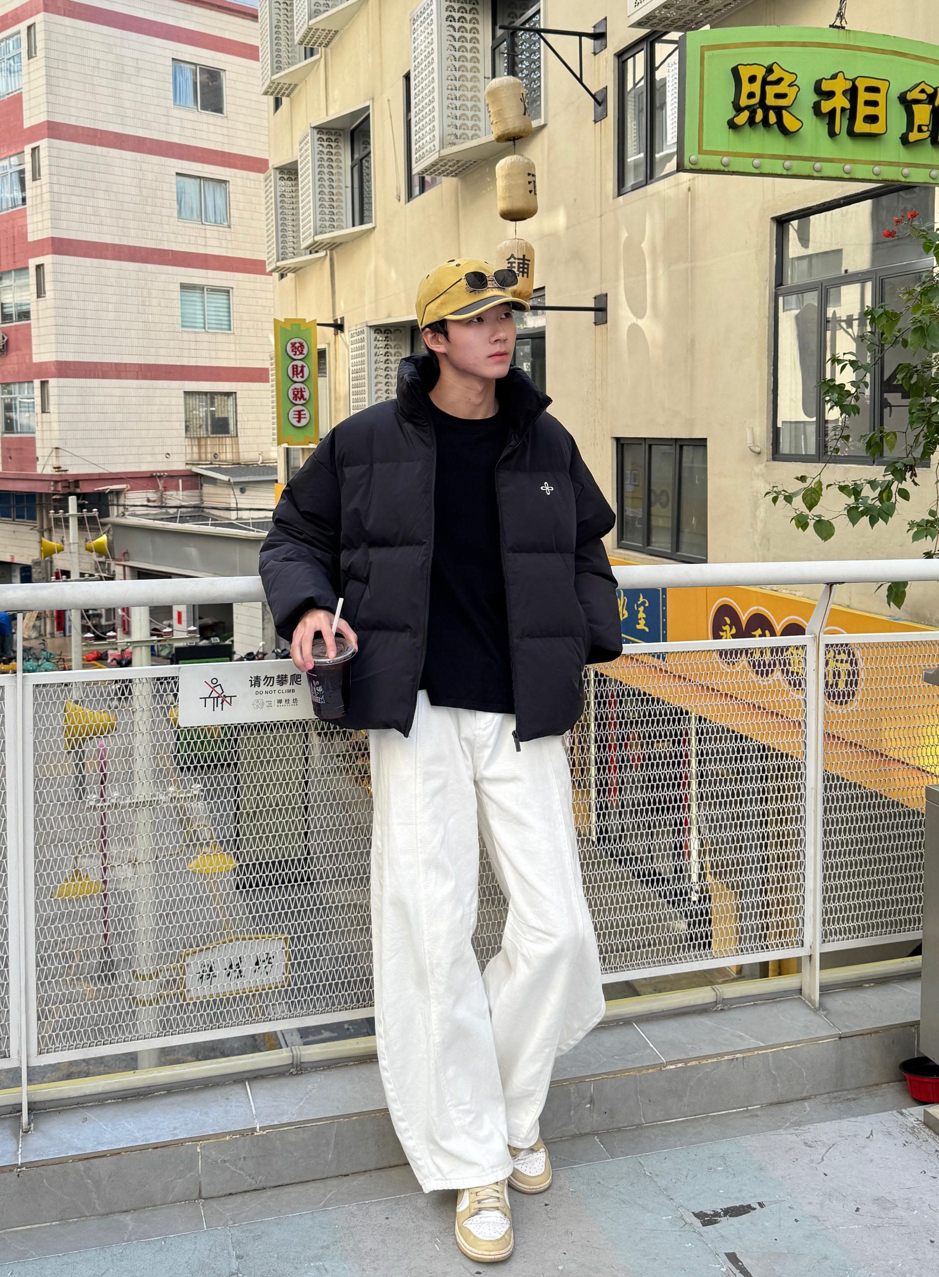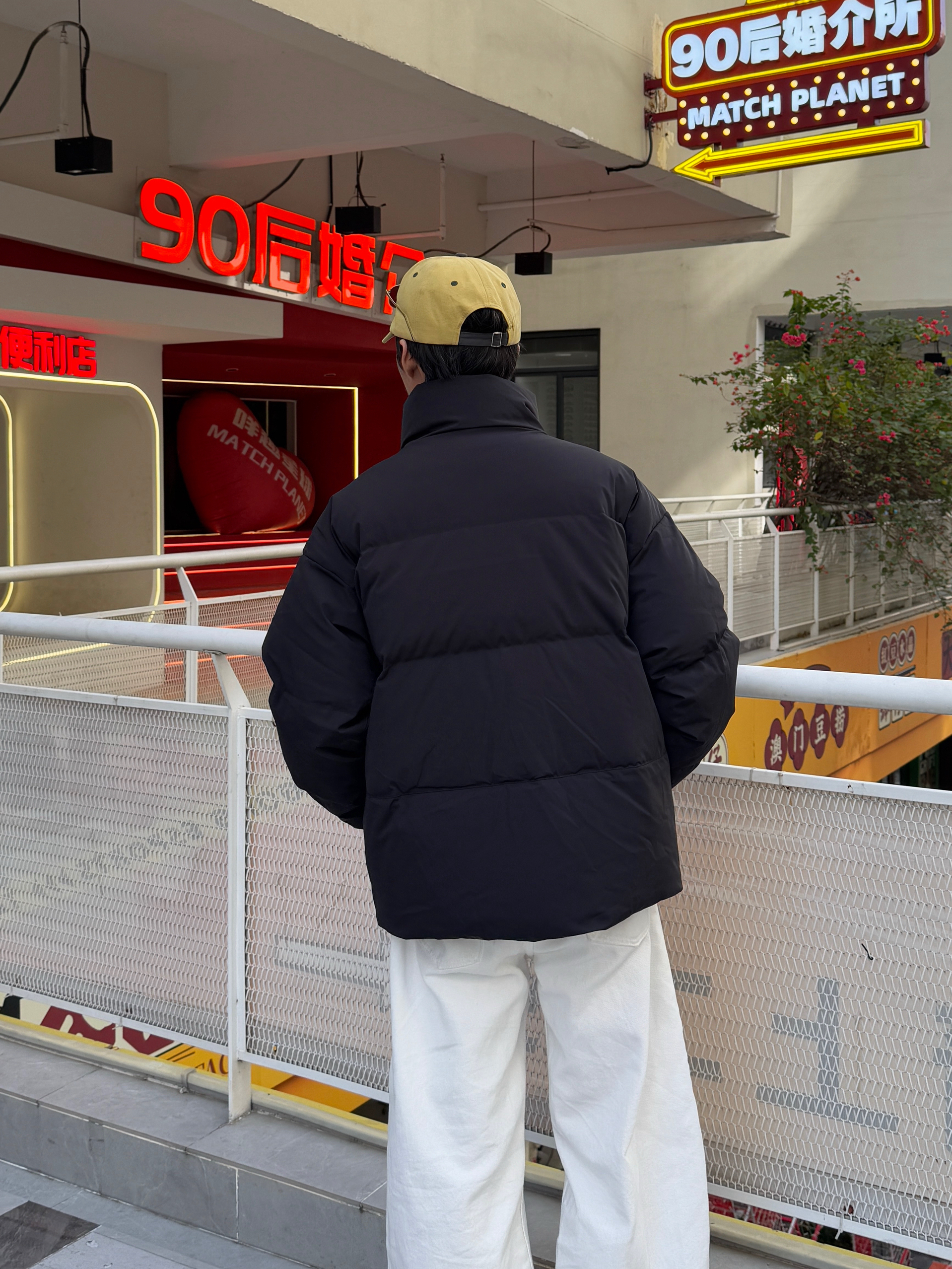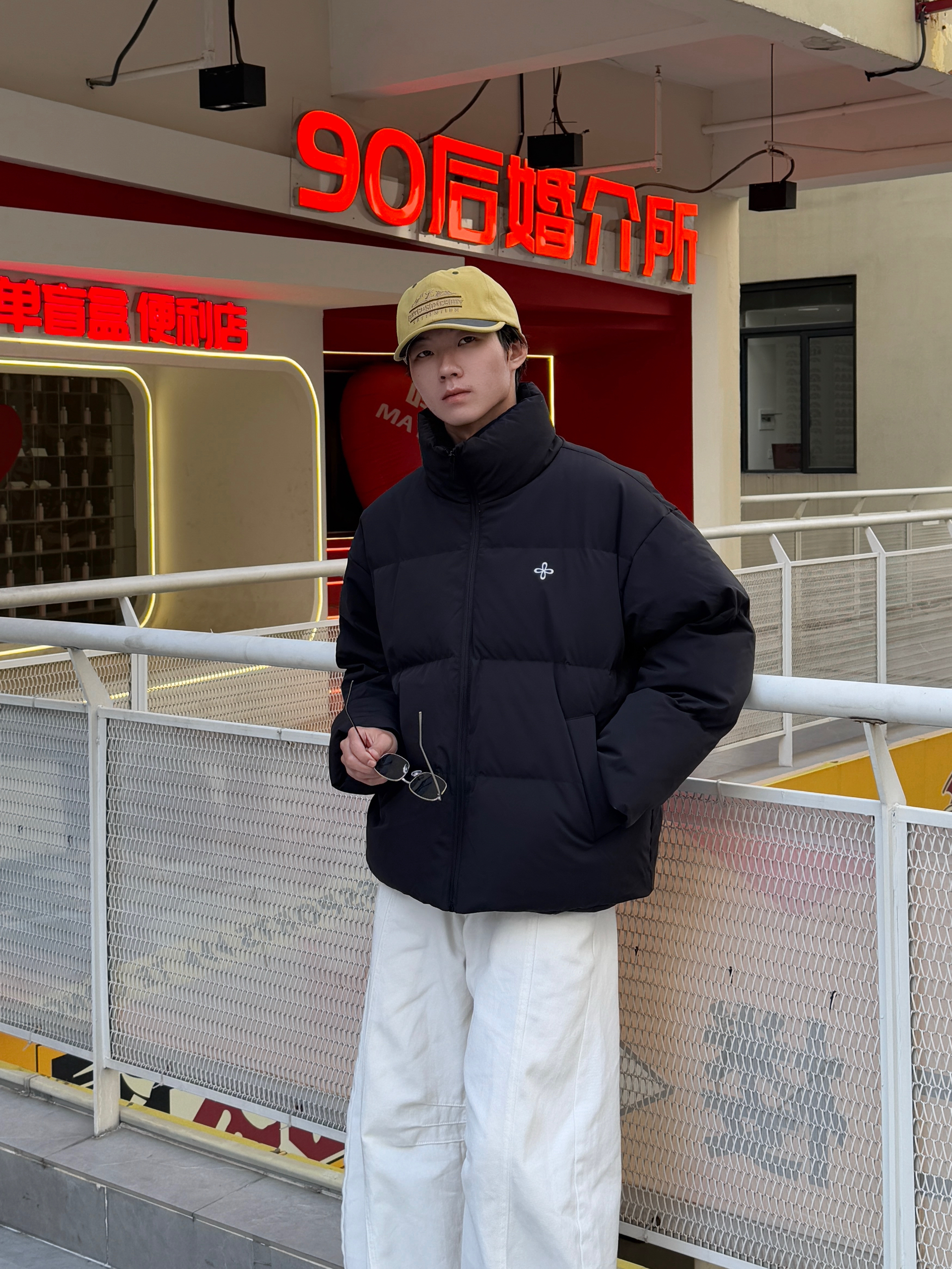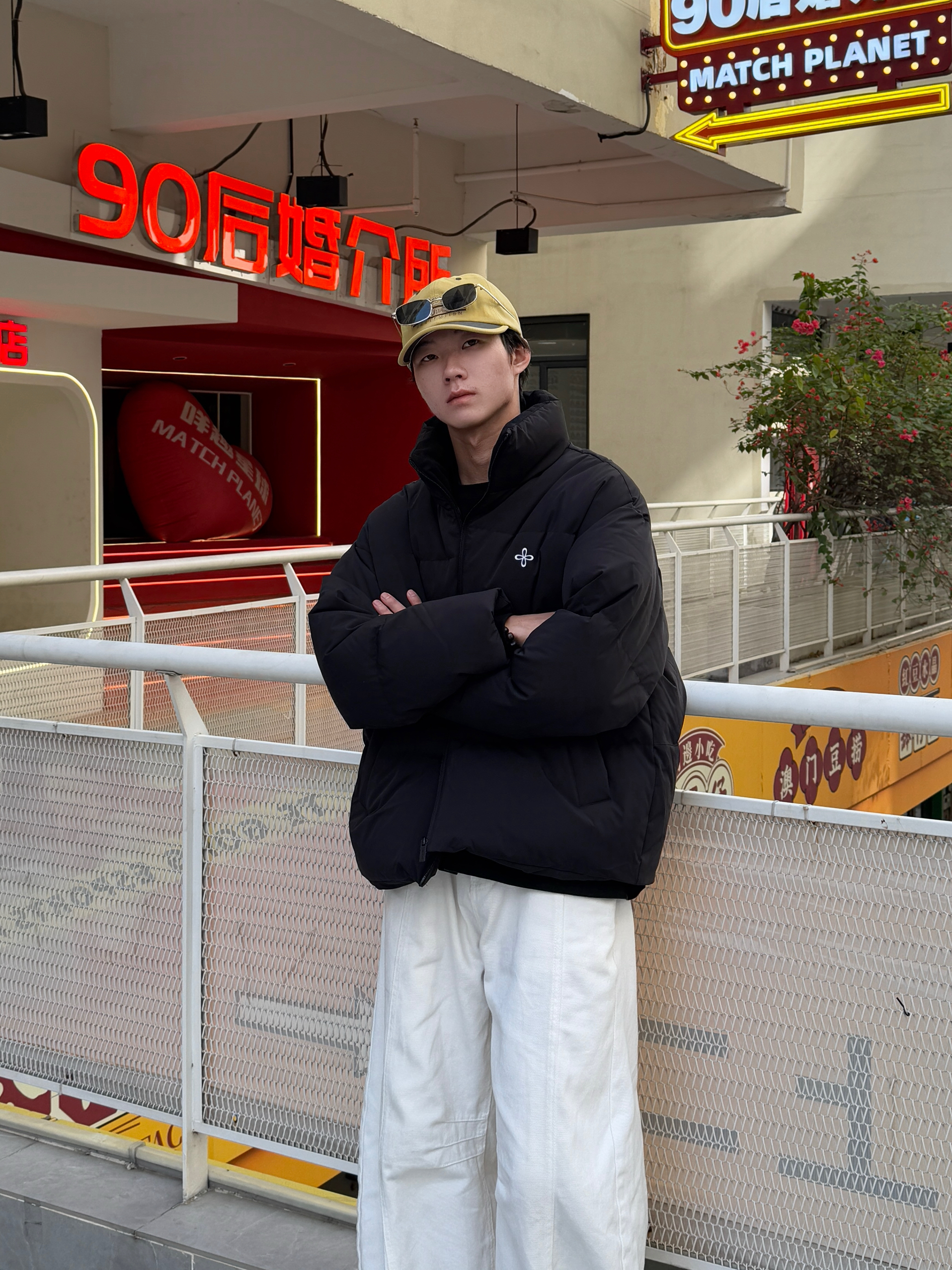 这身穿搭的层次感也太舒服了 黑色立领面包羽绒服蓬松保暖 内搭同色长袖T恤简约显瘦 下身是白色弯刀阔腿裤 流畅的刀割线条瞬间提升整体造型感~ 最亮眼的是这顶黄色帽子 像冬日里的小太阳 让整套深色系穿搭瞬间活了起来❄️
