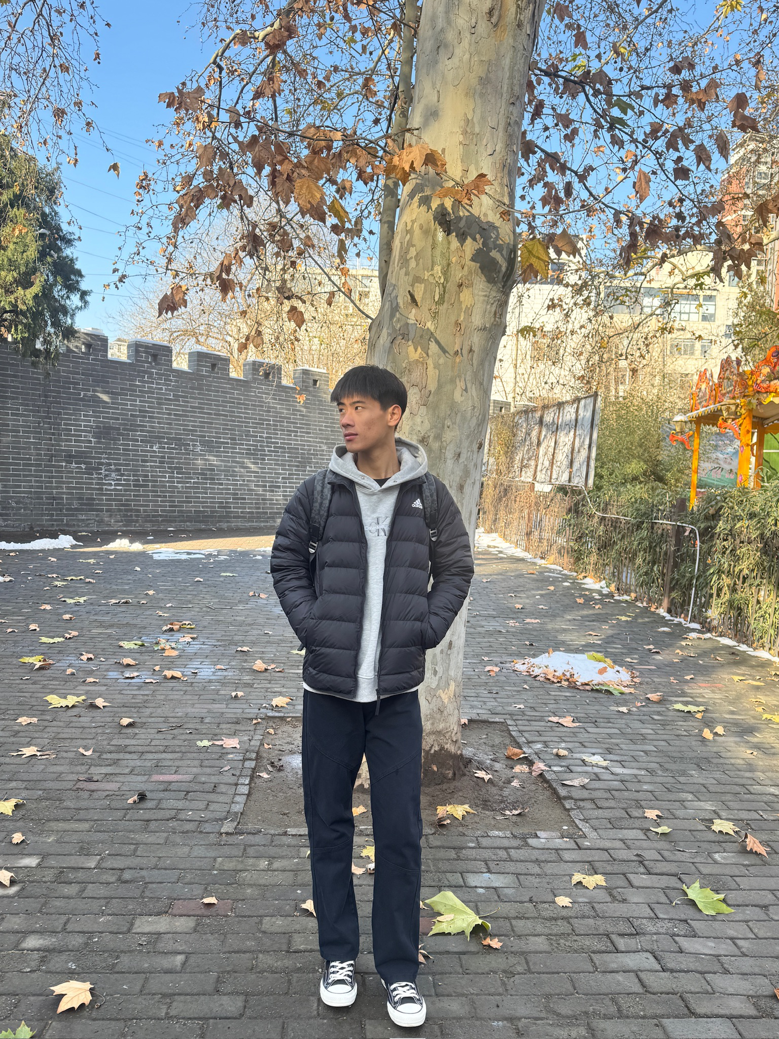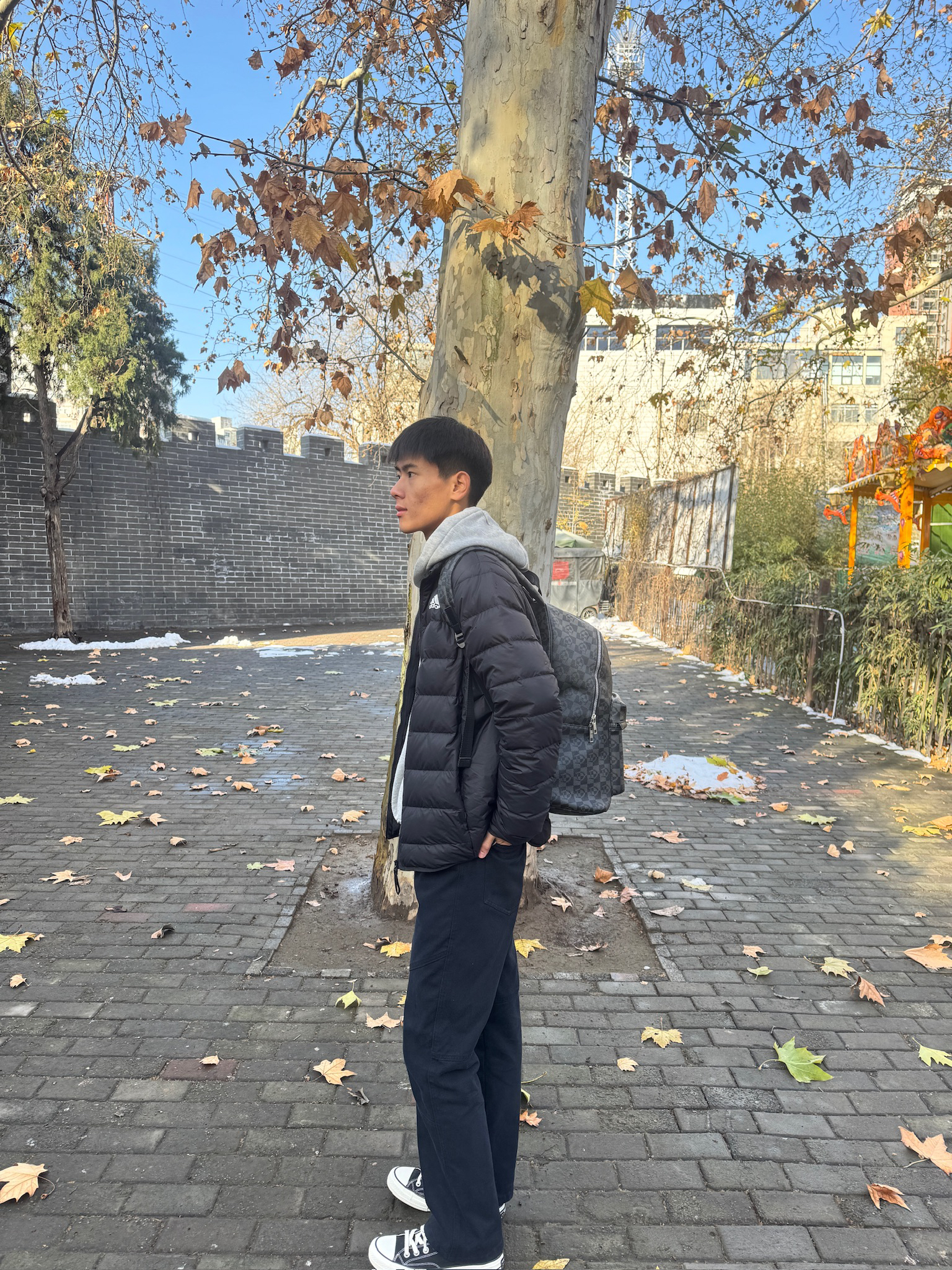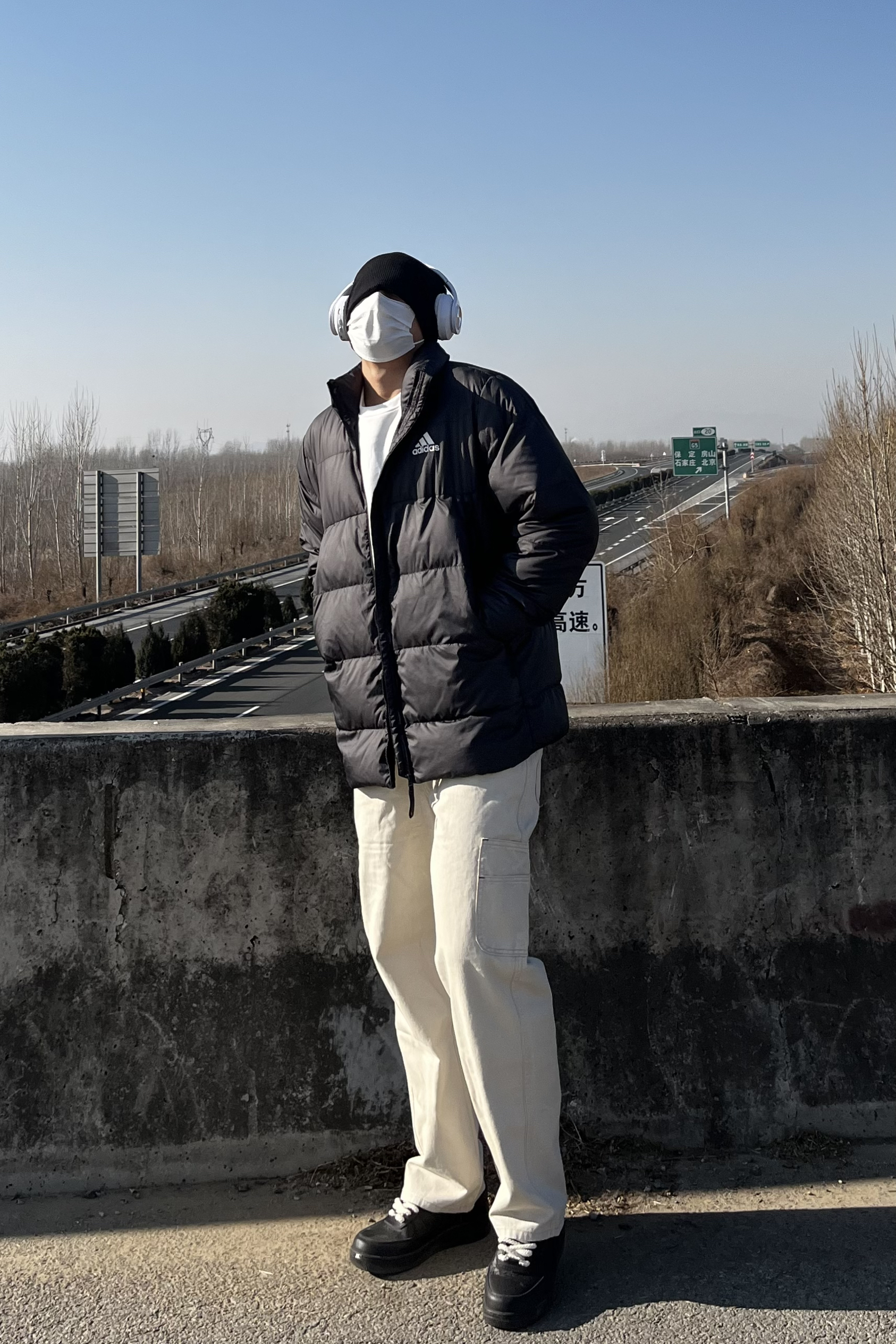 上身的是 adidas 的排骨无帽羽绒服 轻便又保暖 锁温效果不错 虽然只有100g羽绒 但保暖效果不错! 鞋子是converse家最经典的1970s高帮款 男生穿搭必备单品 可以尝试一下 冬天一定要穿的既保暖又好看 给我们整体加分!
