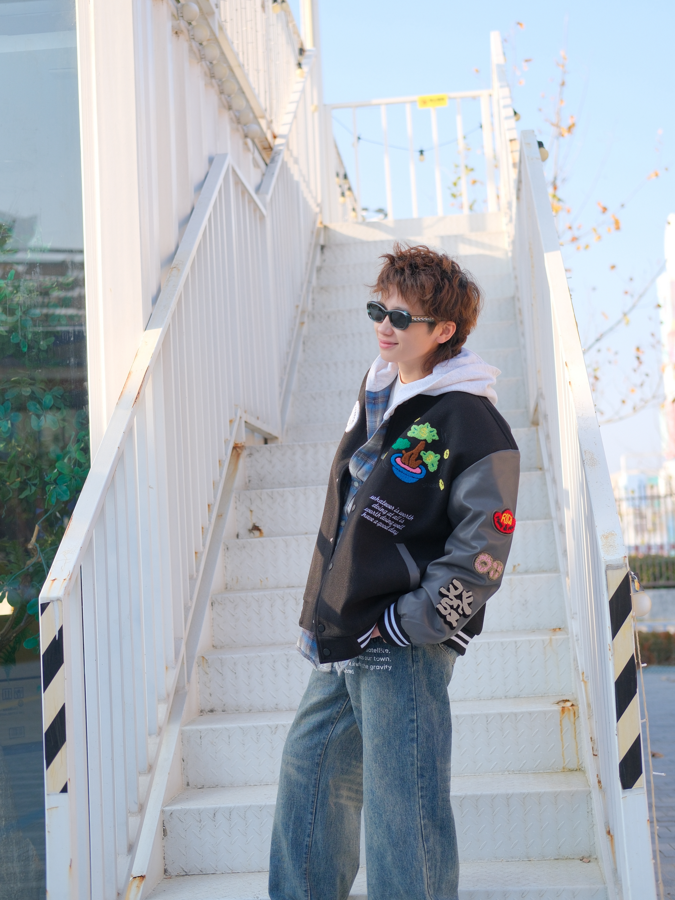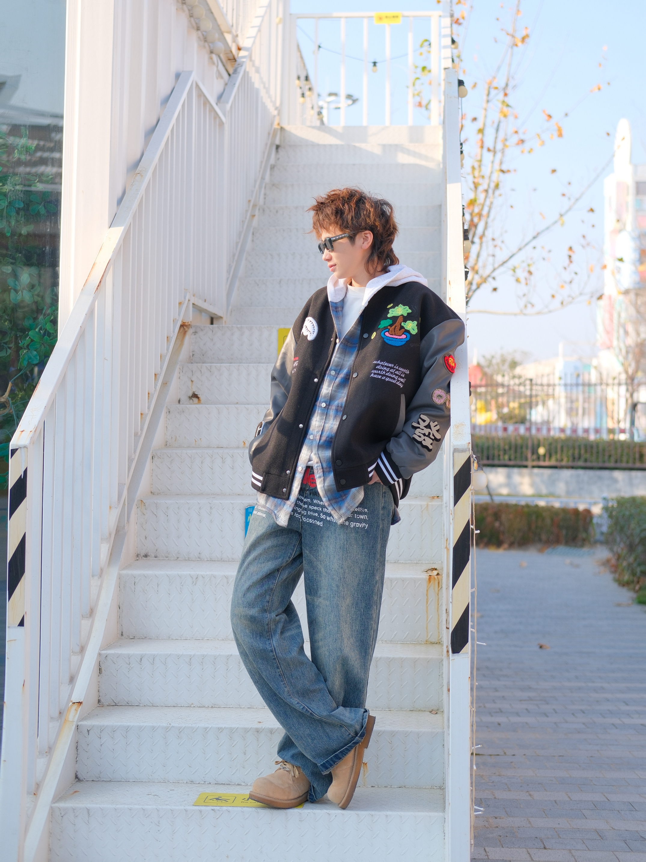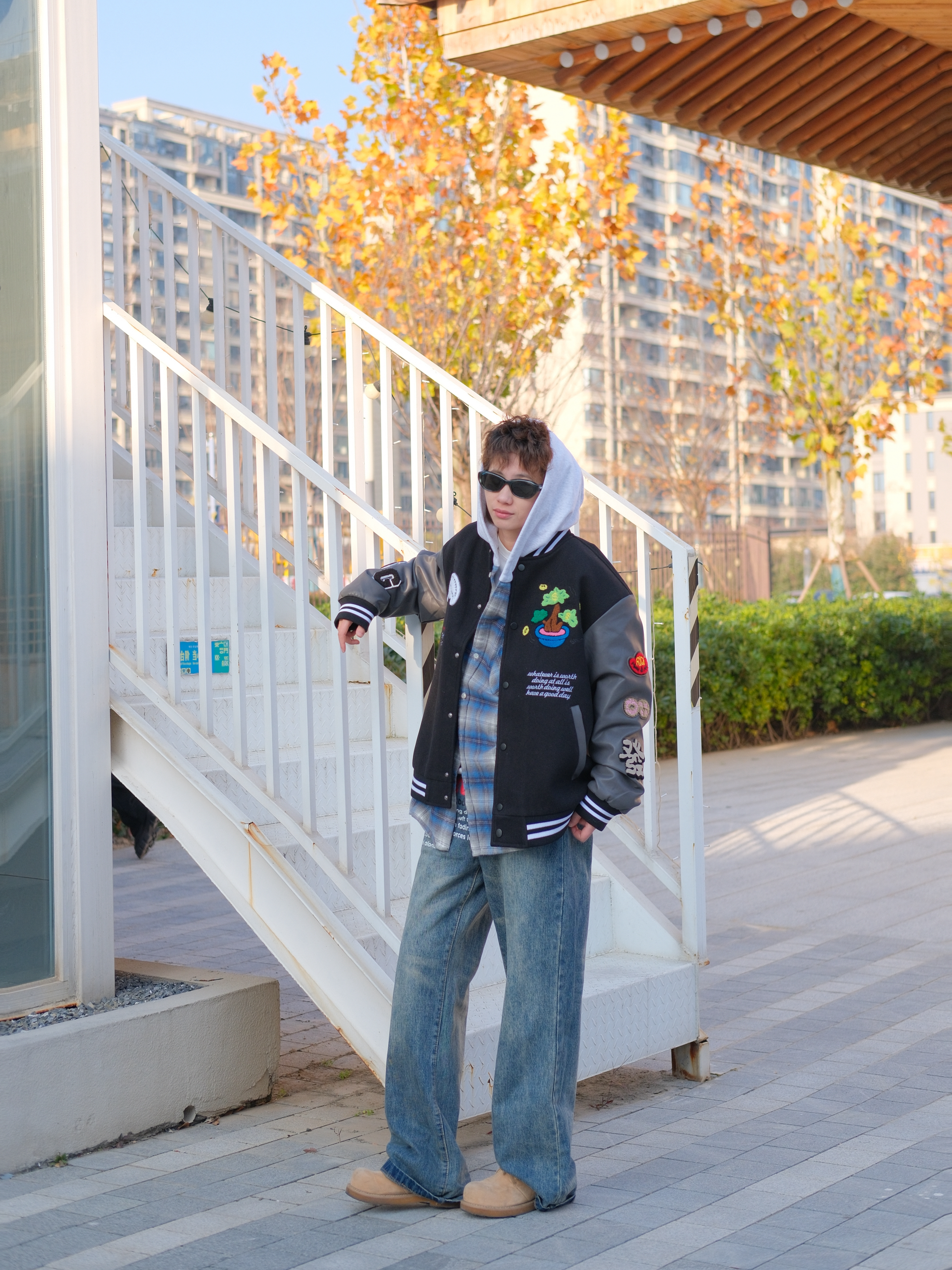 美式棒球服搭配连帽格子衬衫 黑皮拼色,复古又百搭 胸口和后背的摇钱树图案,非常吸睛 植绒立体的图案也比较有质感 再配上做旧的直筒牛仔裤和大黄靴 照着搭就能直接出片 尺码参考:163cm/46kg 上身S码