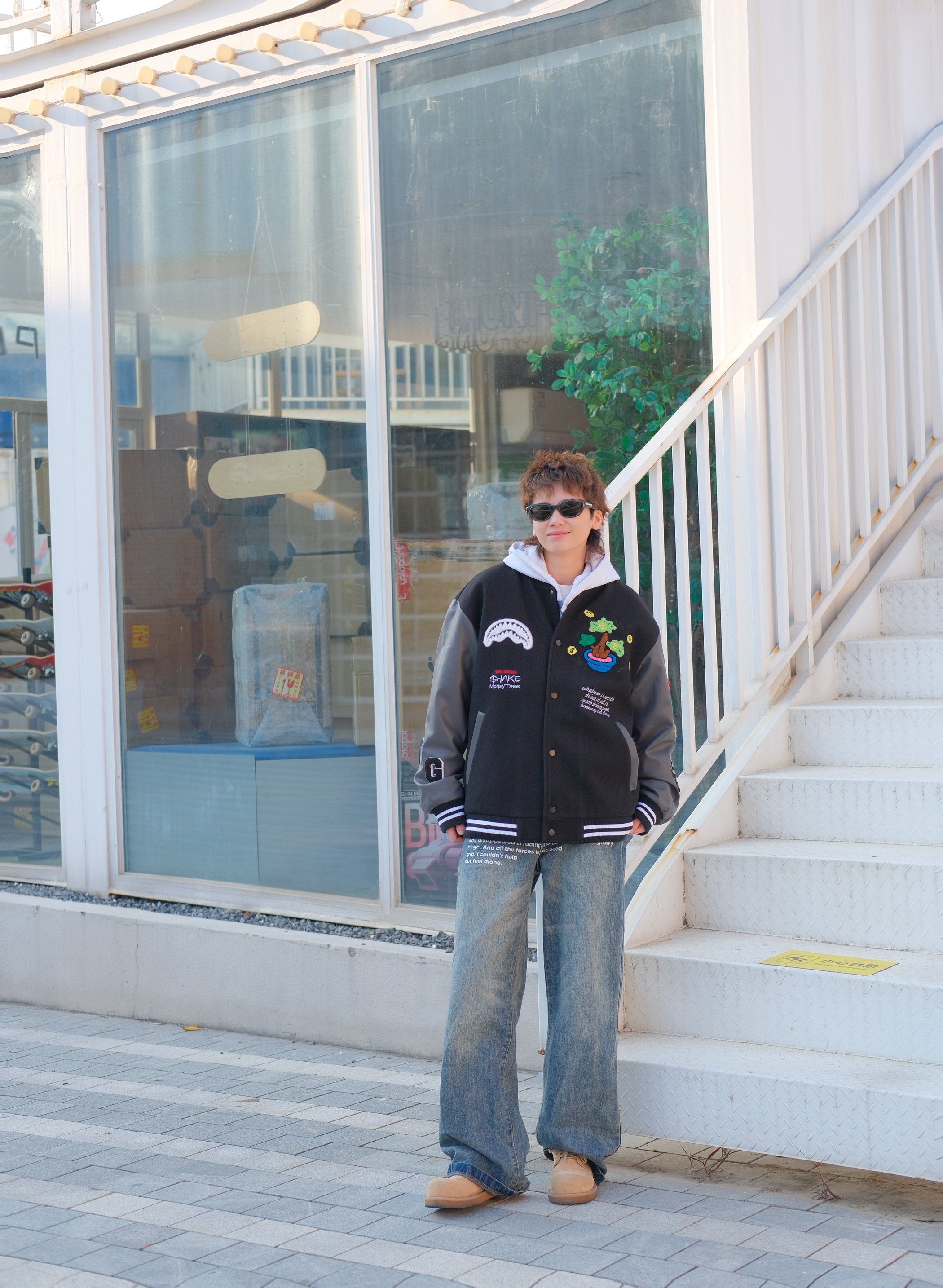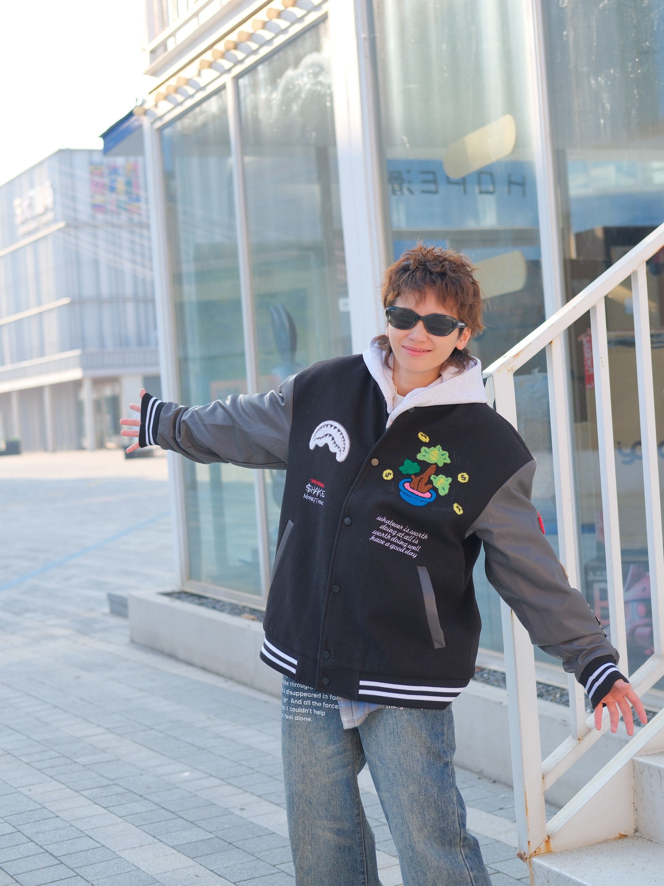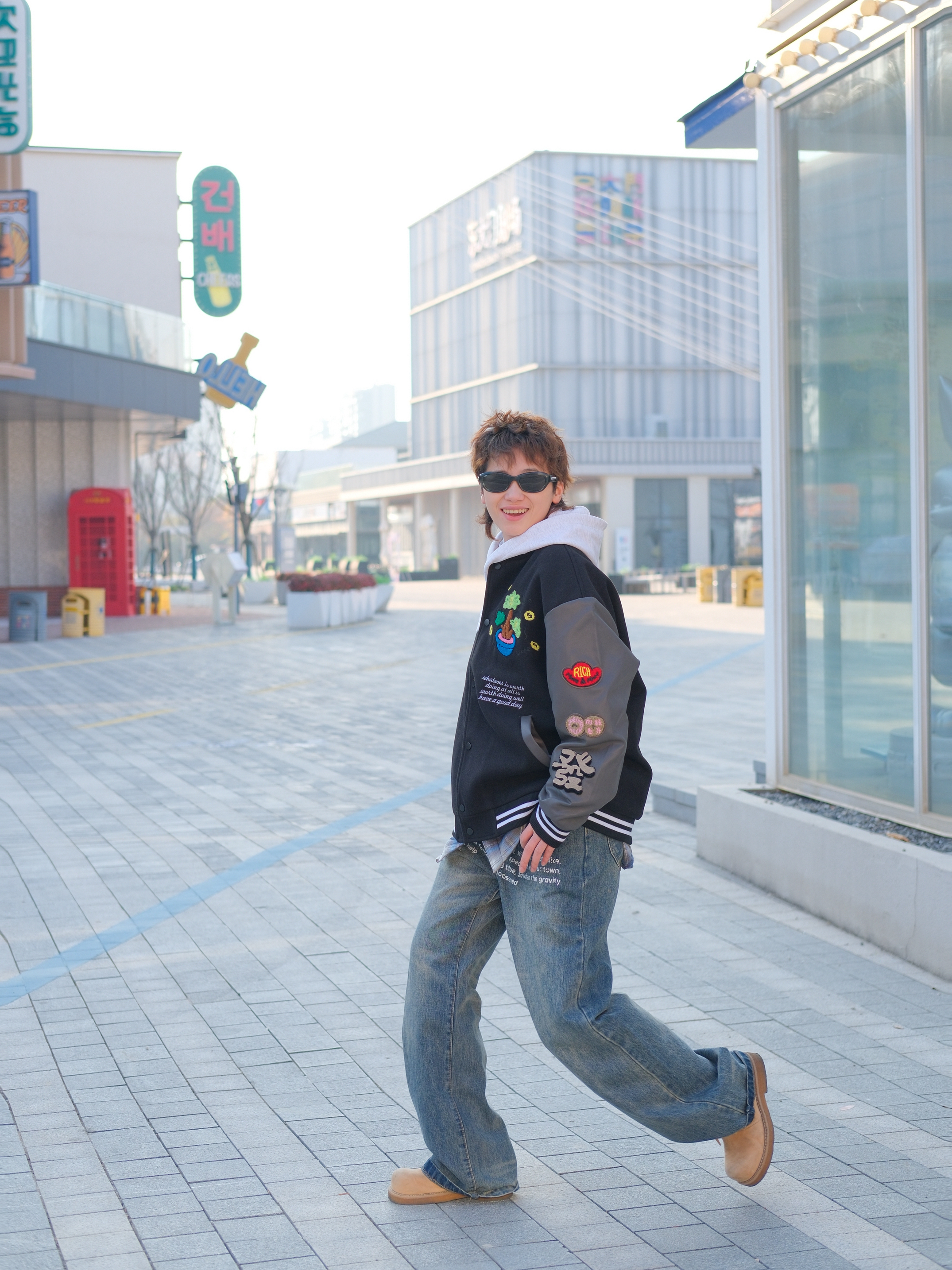 美式棒球服搭配连帽格子衬衫 黑皮拼色,复古又百搭 胸口和后背的摇钱树图案,非常吸睛 植绒立体的图案也比较有质感 再配上做旧的直筒牛仔裤和大黄靴 照着搭就能直接出片 尺码参考:163cm/46kg 上身S码