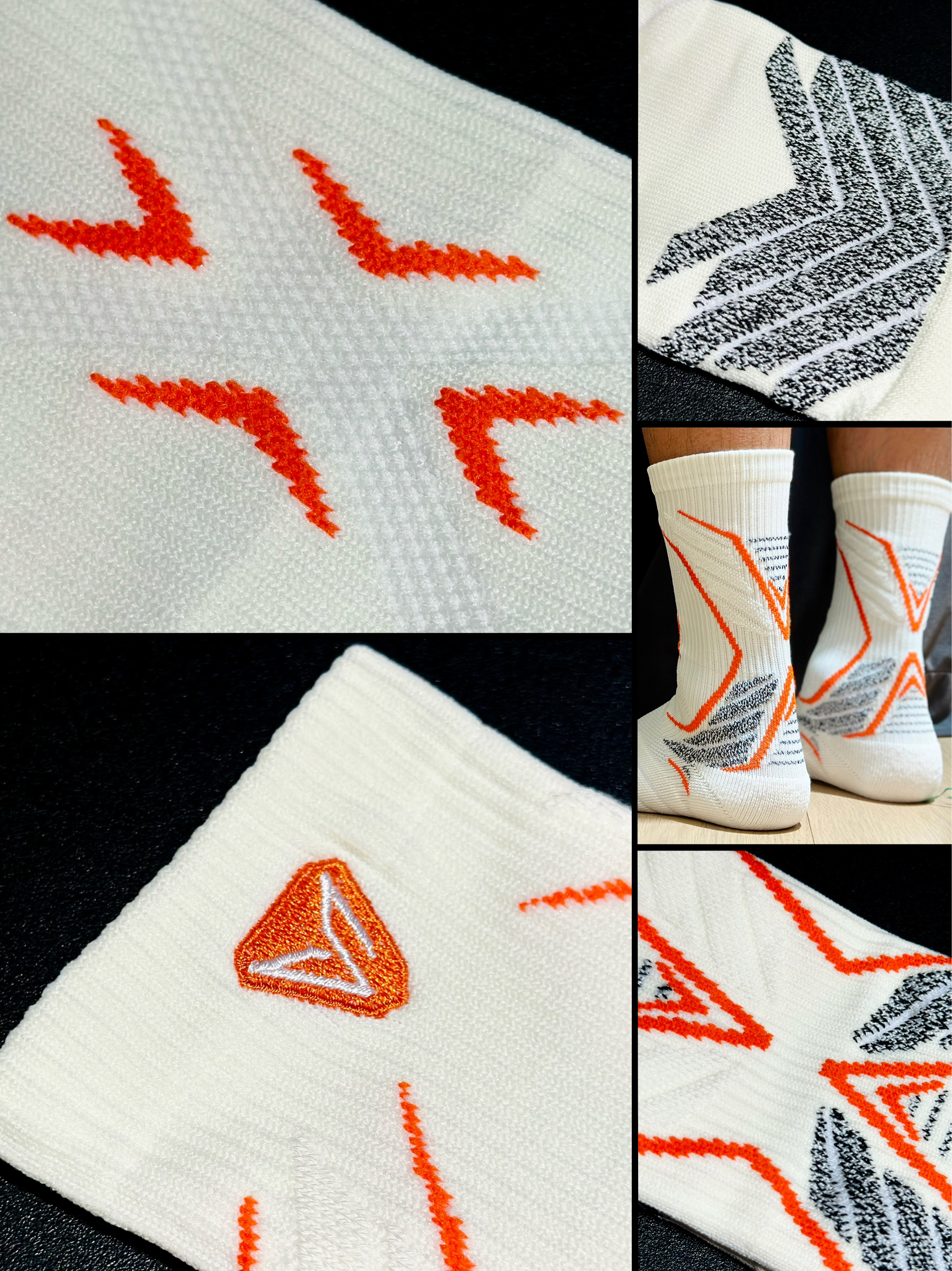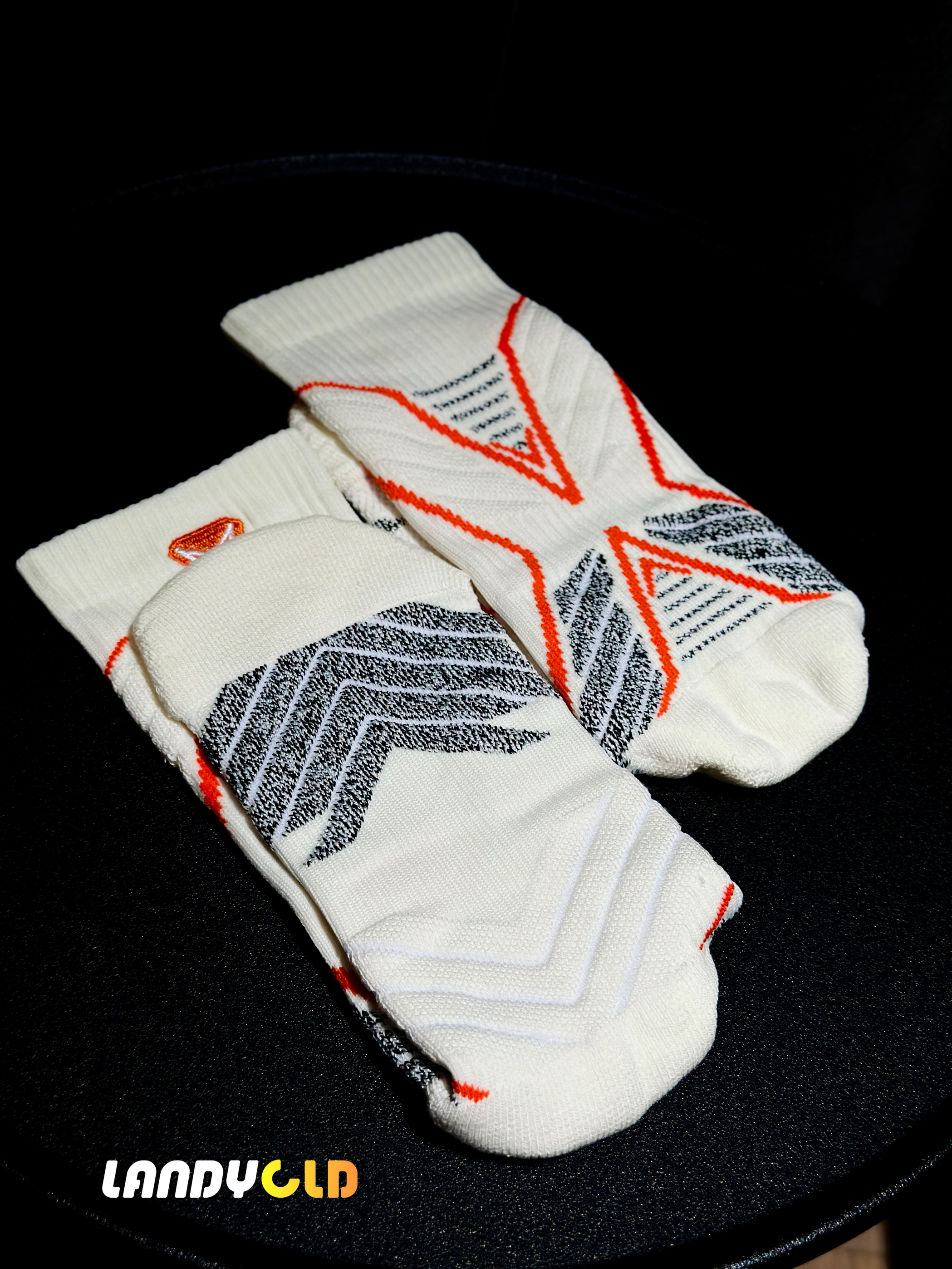 今天要跟大家分享一下这双实战篮球袜,我个人很喜欢,从配色角度,和穿着脚感,都挺让我满意。 暖白色的基底色,后跟处有一个很显眼的“X”设计,很帅,很有视觉冲击感,搭配我的球鞋,确实有点耐看。 说说穿着的感觉,挺厚实,脚趾部位、后跟包裹、以及袜口的收紧度和匹配度不错,包裹感不是那种紧绷的,舒适,好穿。