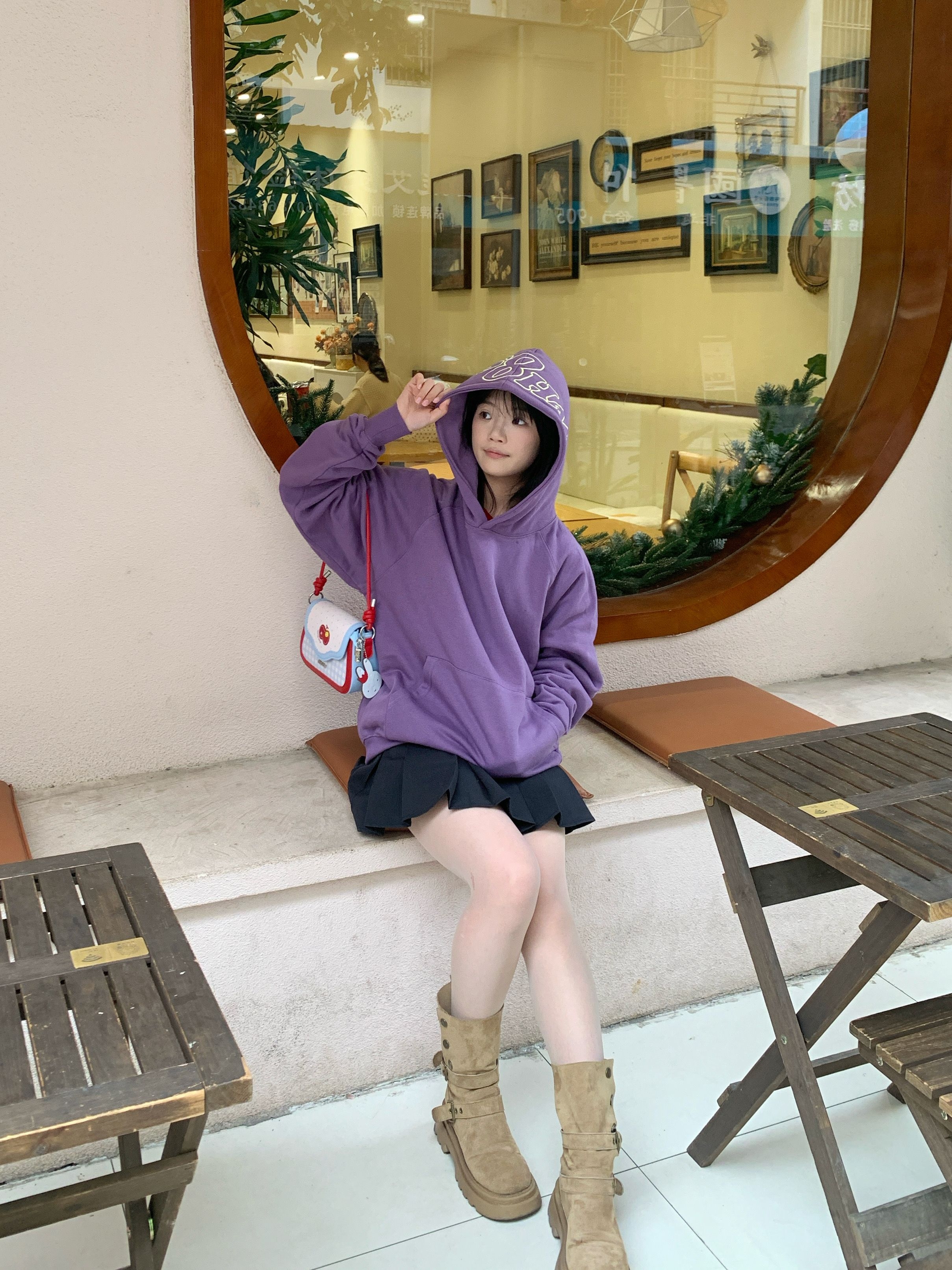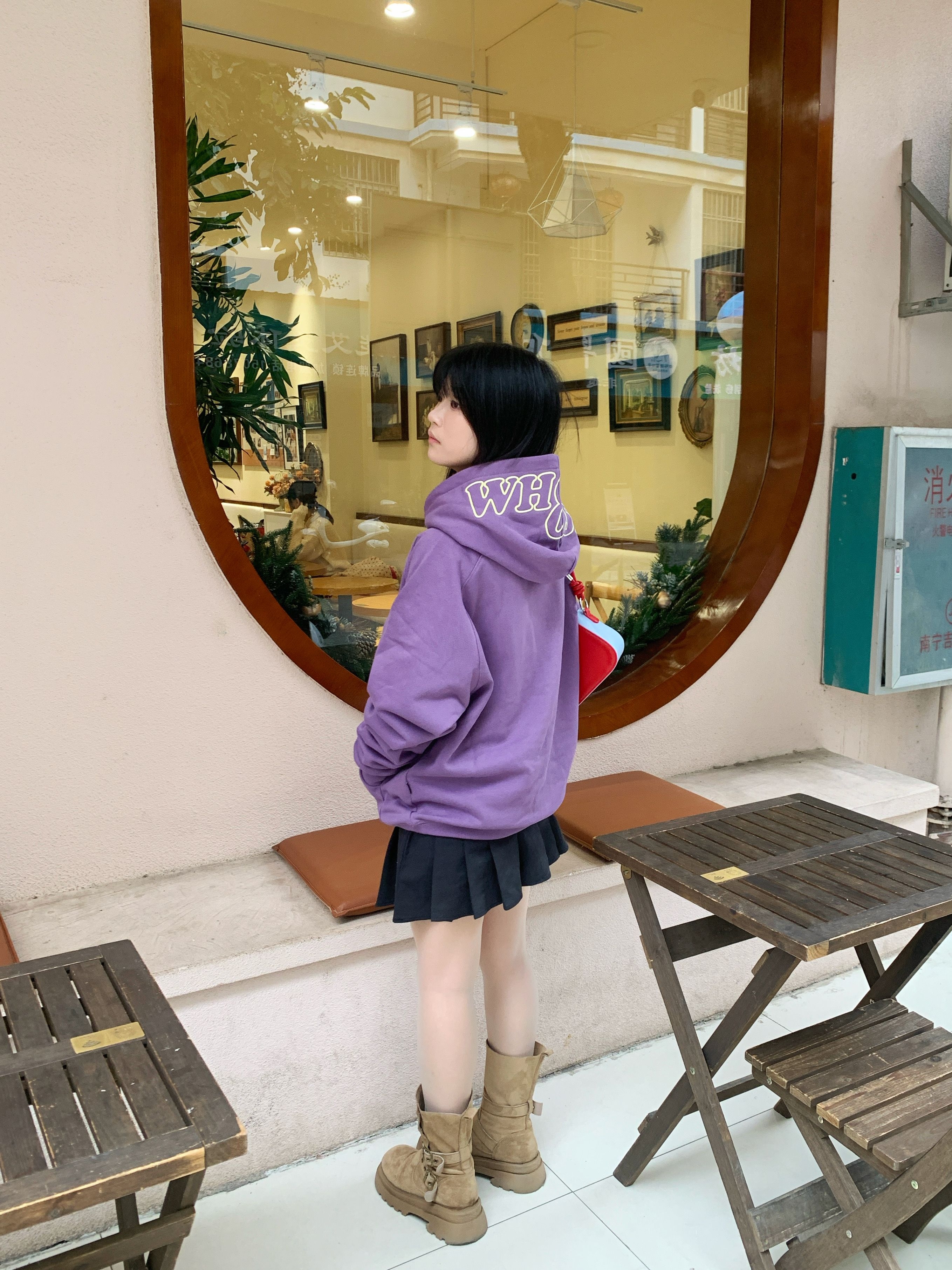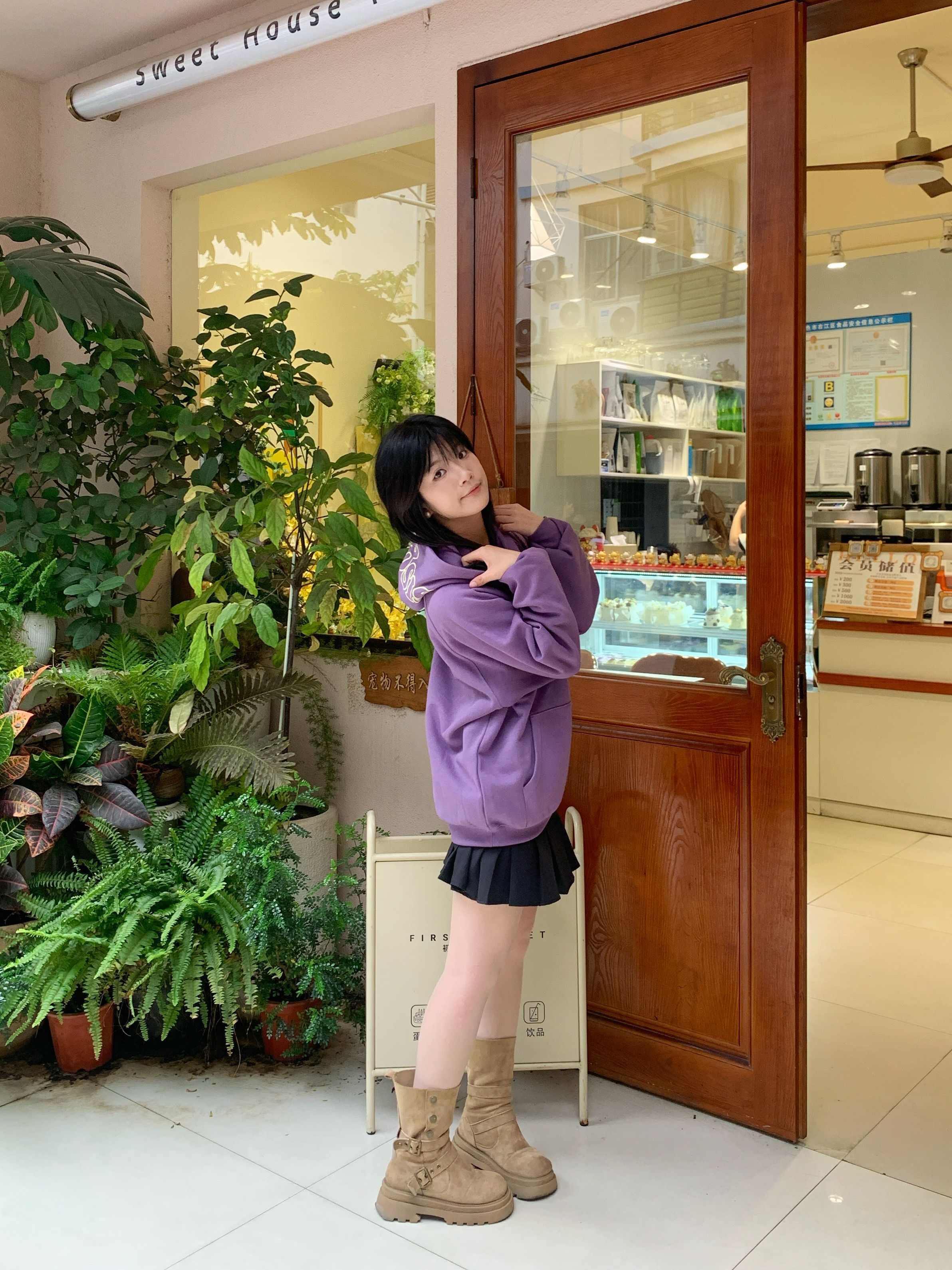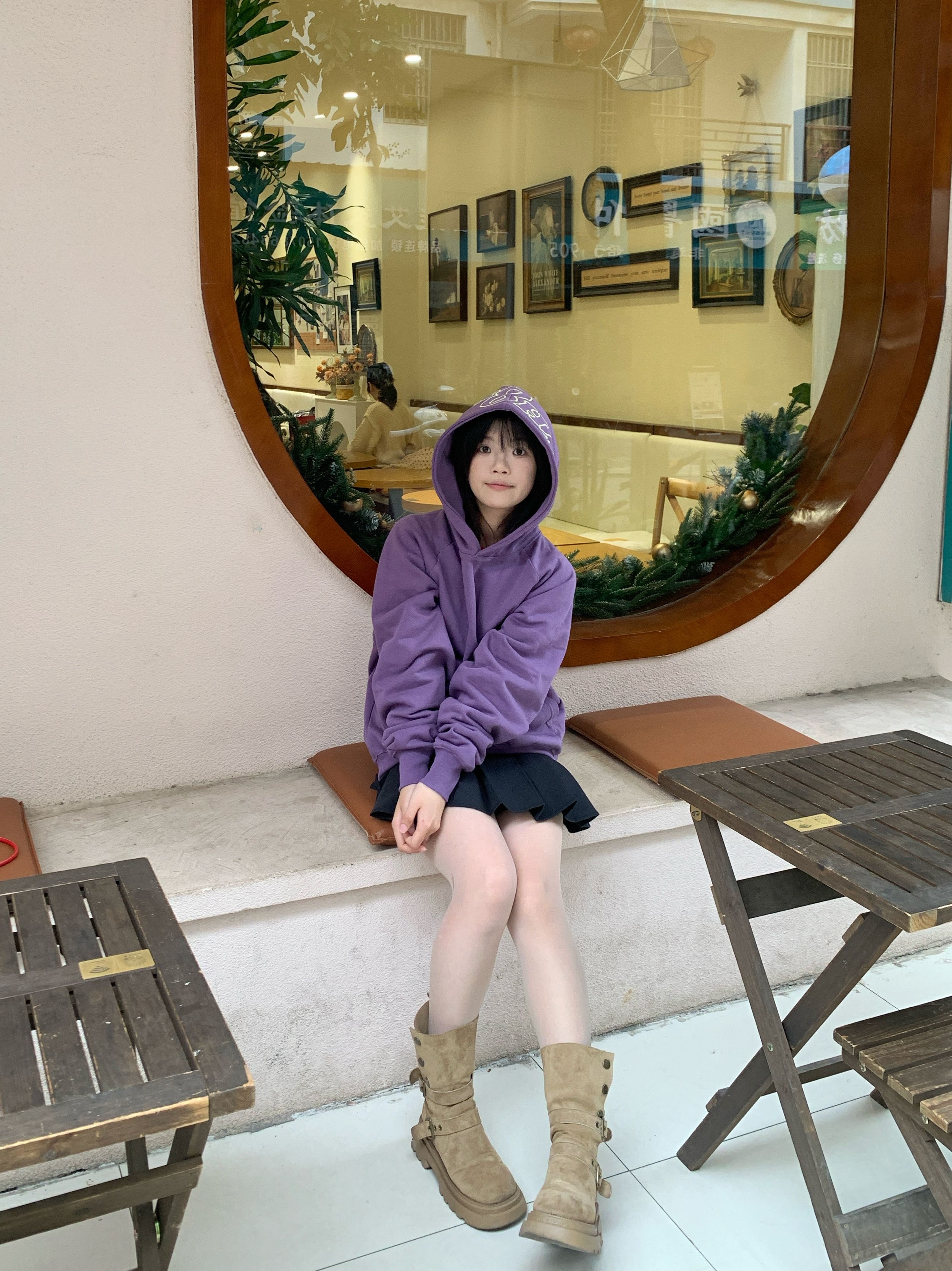 家人们,发现一件超绝的紫色连帽卫衣~💜 是WHOOSIS家的卫衣,是颜色好正,是那种很显白的紫,像把葡萄汁🍹穿在身上!版型是宽松的oversize款,特别遮胯,遮小肚子那块肉。我穿上后,感觉整个人都被温柔包裹住啦,胳膊活动也完全不受限,自在得很~搭配小短裙和卡其色靴子,休闲又带点甜酷,日常出门这么穿,舒服又好看,心情都跟着明媚起来咯~