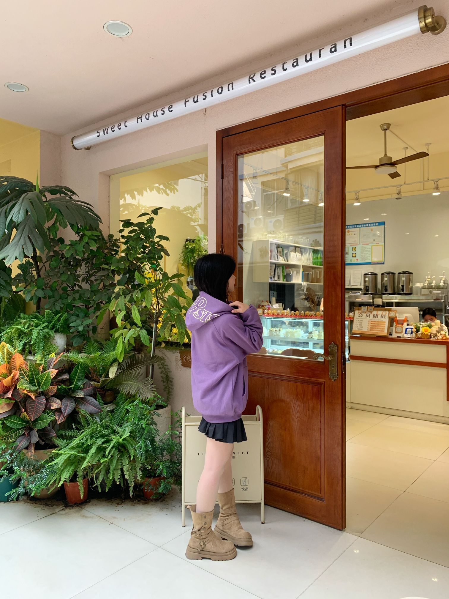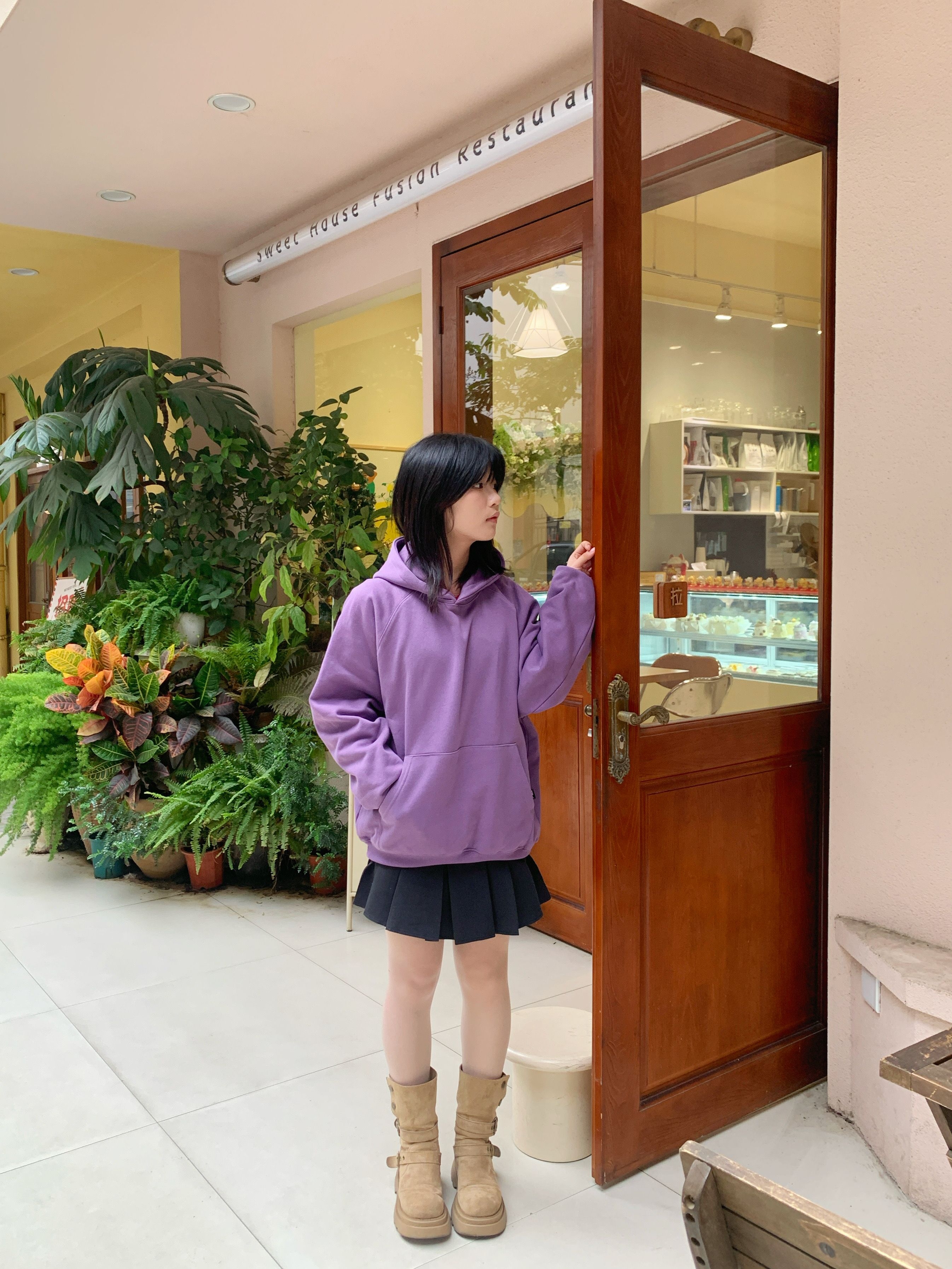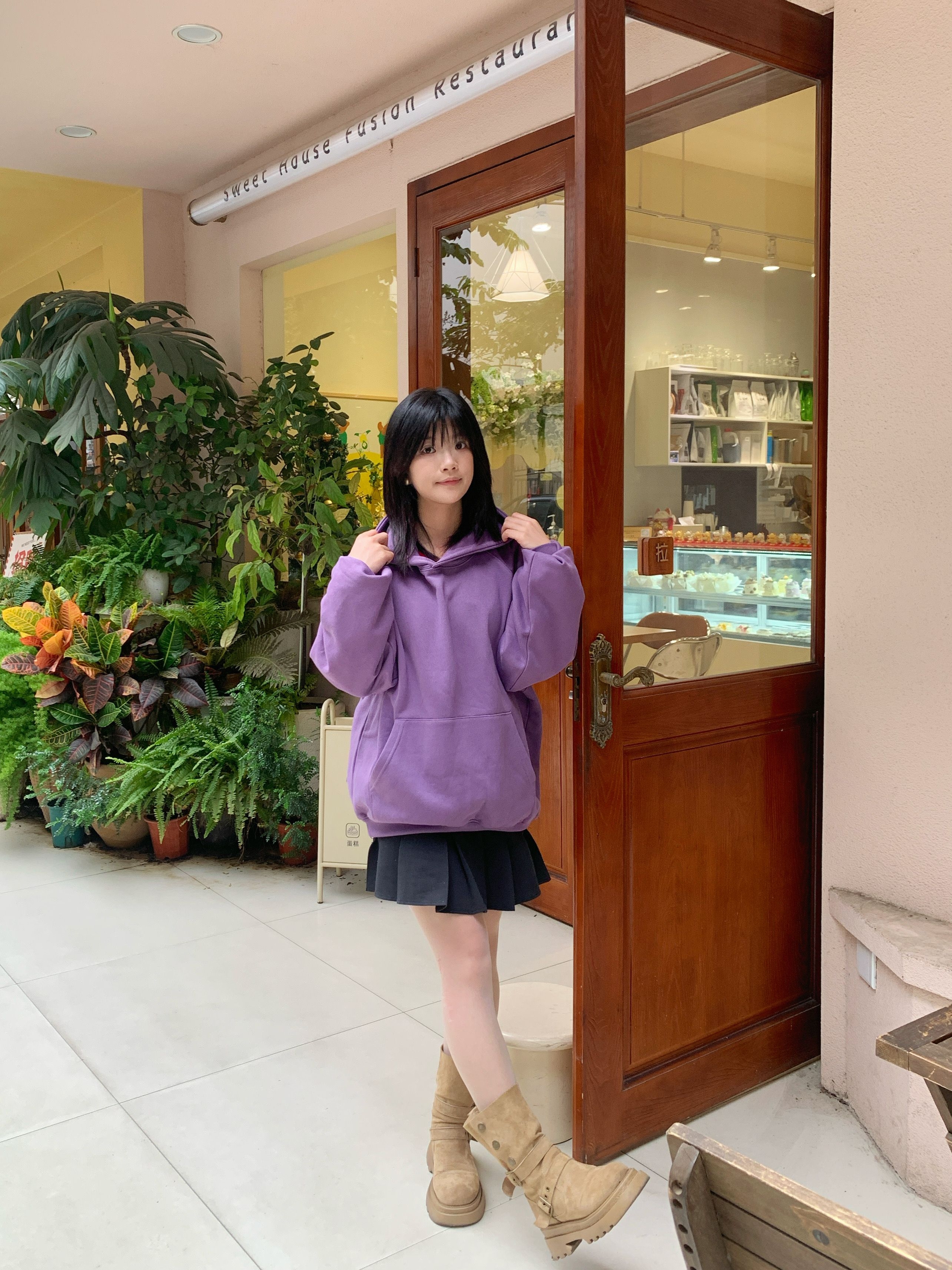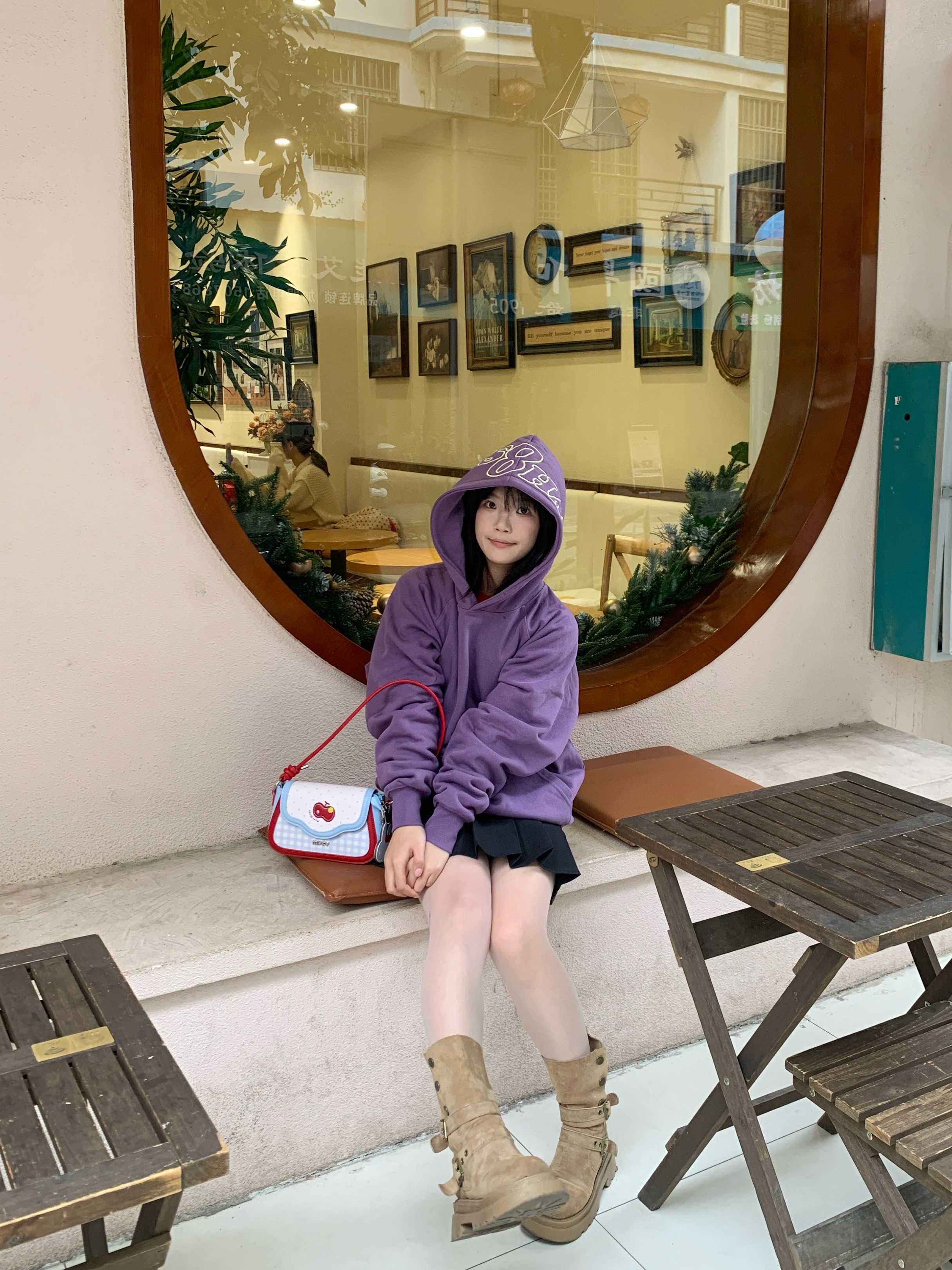 家人们,发现一件超绝的紫色连帽卫衣~💜 是WHOOSIS家的卫衣,是颜色好正,是那种很显白的紫,像把葡萄汁🍹穿在身上!版型是宽松的oversize款,特别遮胯,遮小肚子那块肉。我穿上后,感觉整个人都被温柔包裹住啦,胳膊活动也完全不受限,自在得很~搭配小短裙和卡其色靴子,休闲又带点甜酷,日常出门这么穿,舒服又好看,心情都跟着明媚起来咯~