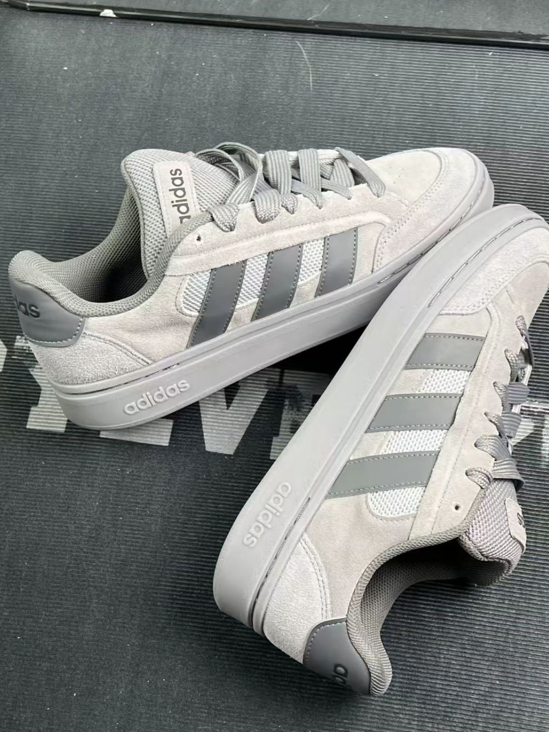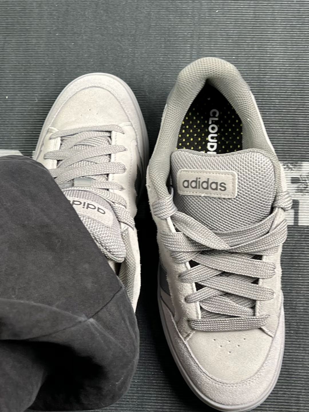 这双灰色的Adidas板鞋穿了快一个月,说下实际感受。鞋面是网布拼接麂皮的,透气性还行,夏天穿不会闷脚,但麂皮部分沾了灰不太好擦,得用软毛刷慢慢弄🧹。 鞋底是那种有点厚度的,走路时能感觉到一点弹性,但别指望像运动鞋那样有缓震,毕竟是板鞋。平时上班或者逛公园穿挺合适,走个万把步脚不会累,但如果要长时间站着,脚踝那里会有点勒。 尺码我觉得是标准的,按平时穿的码数买就行。鞋带是扁的那种,不容易散,...