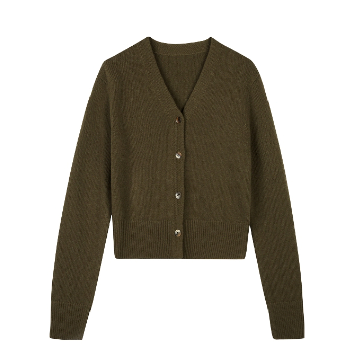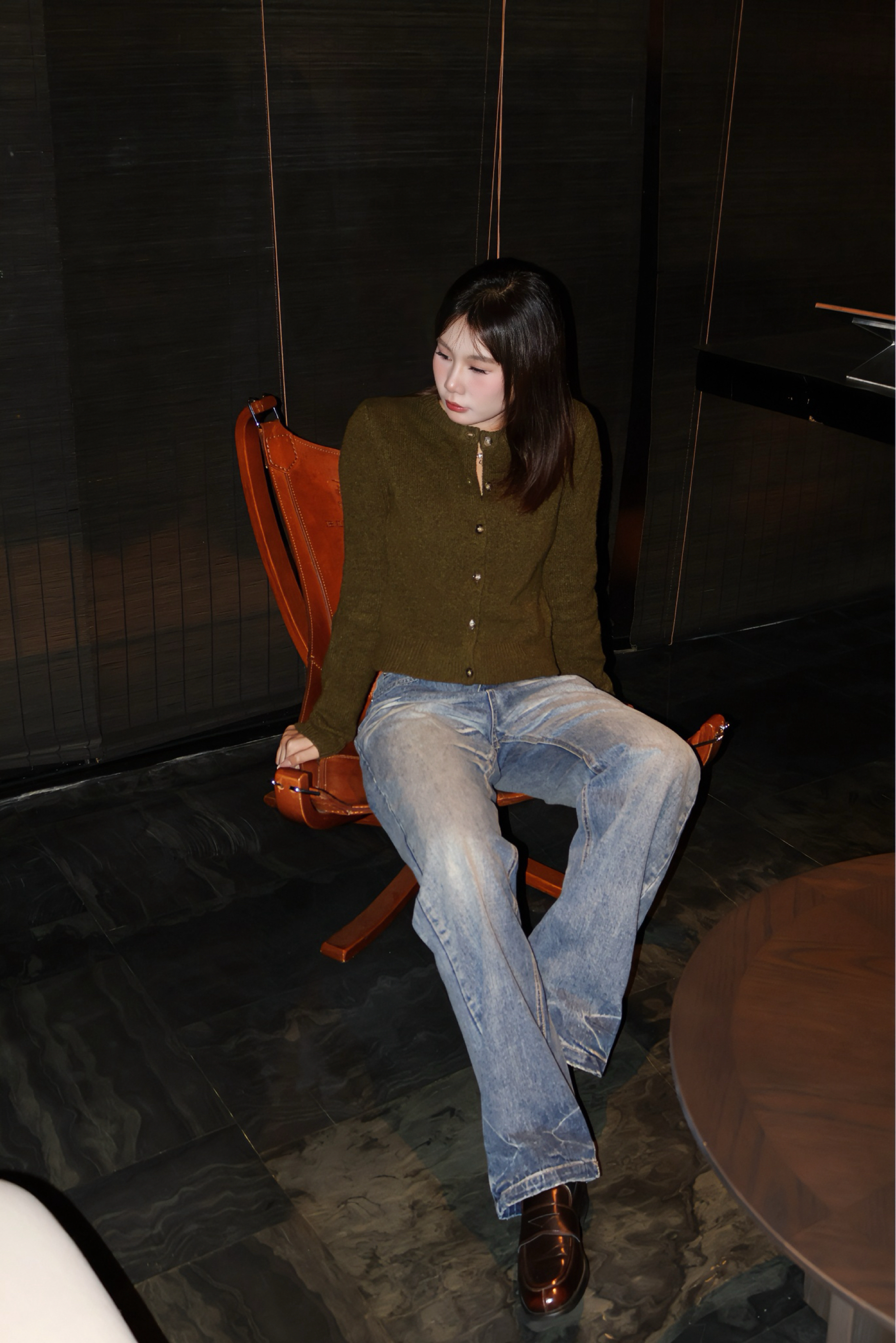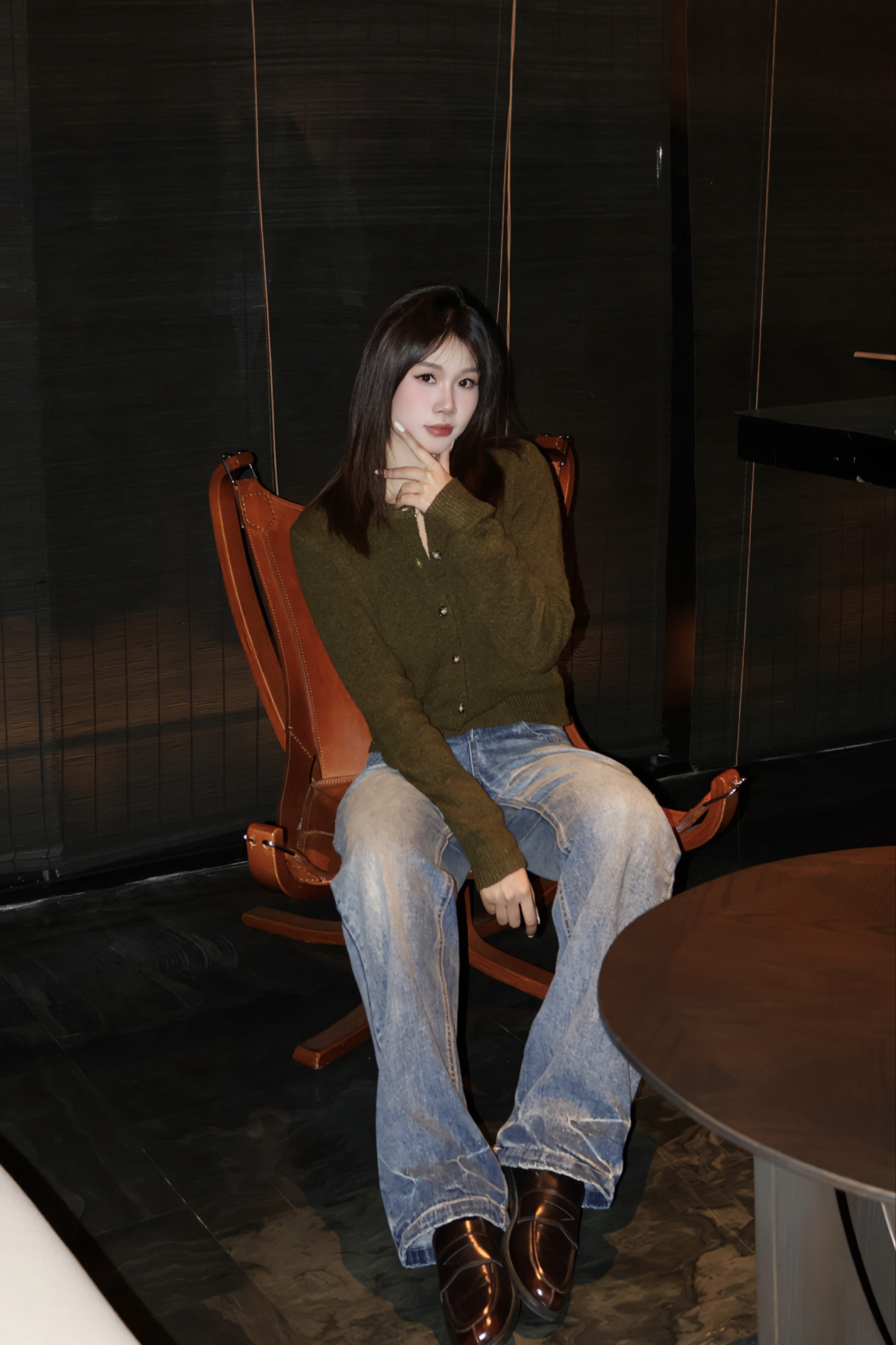橄榄绿短款针织开衫柔糯有质感,修身剪裁勾勒出腰线,单排扣设计增添精致感。搭配的水洗蓝阔腿牛仔裤是亮点,做旧磨白工艺让裤身有自然的复古纹理,高腰版型拉长腿部比例,宽松裤腿藏肉又显随性,搭配棕色乐福鞋,复古休闲风拉满。🎄❄️
