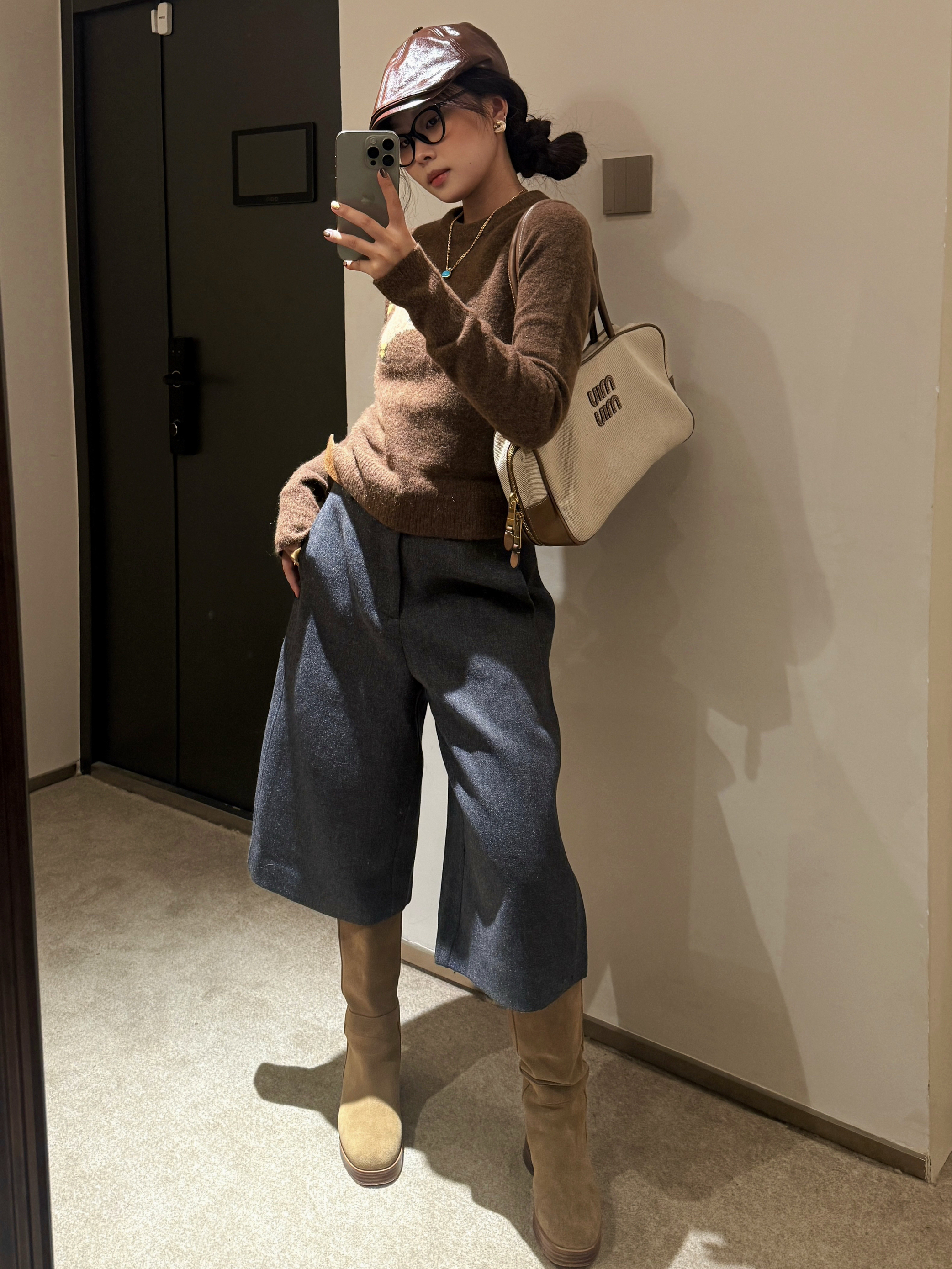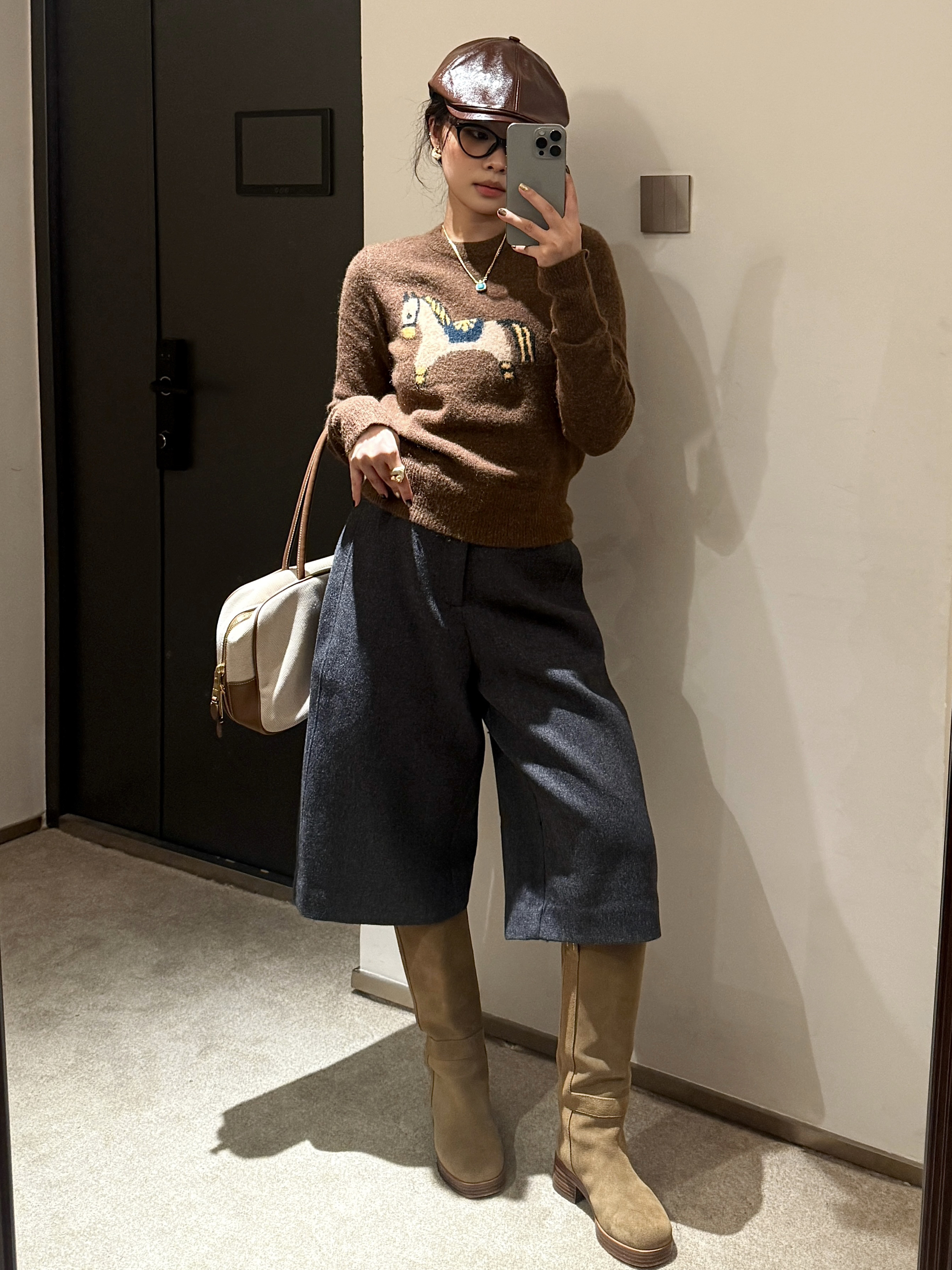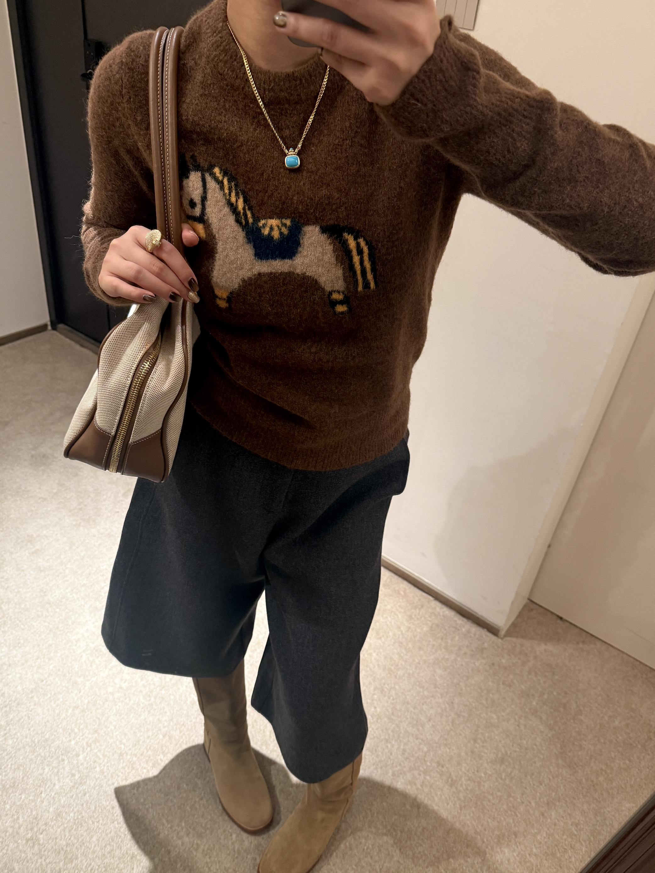身高|体重:165 102 🧍♂️ 本次穿搭风格:复古风 👔 上衣:NORTHBUTSOUTH 🎒配饰:miumiu 没人能拒绝超级可爱的小马毛衣! NBS家新品小马我太爱了 面料很好,长期主义的姐妹一定入手 搭配靴裤➕长靴超级复古!! 包包和帽子也是同色系的搭配 并且是一定要有的元素!