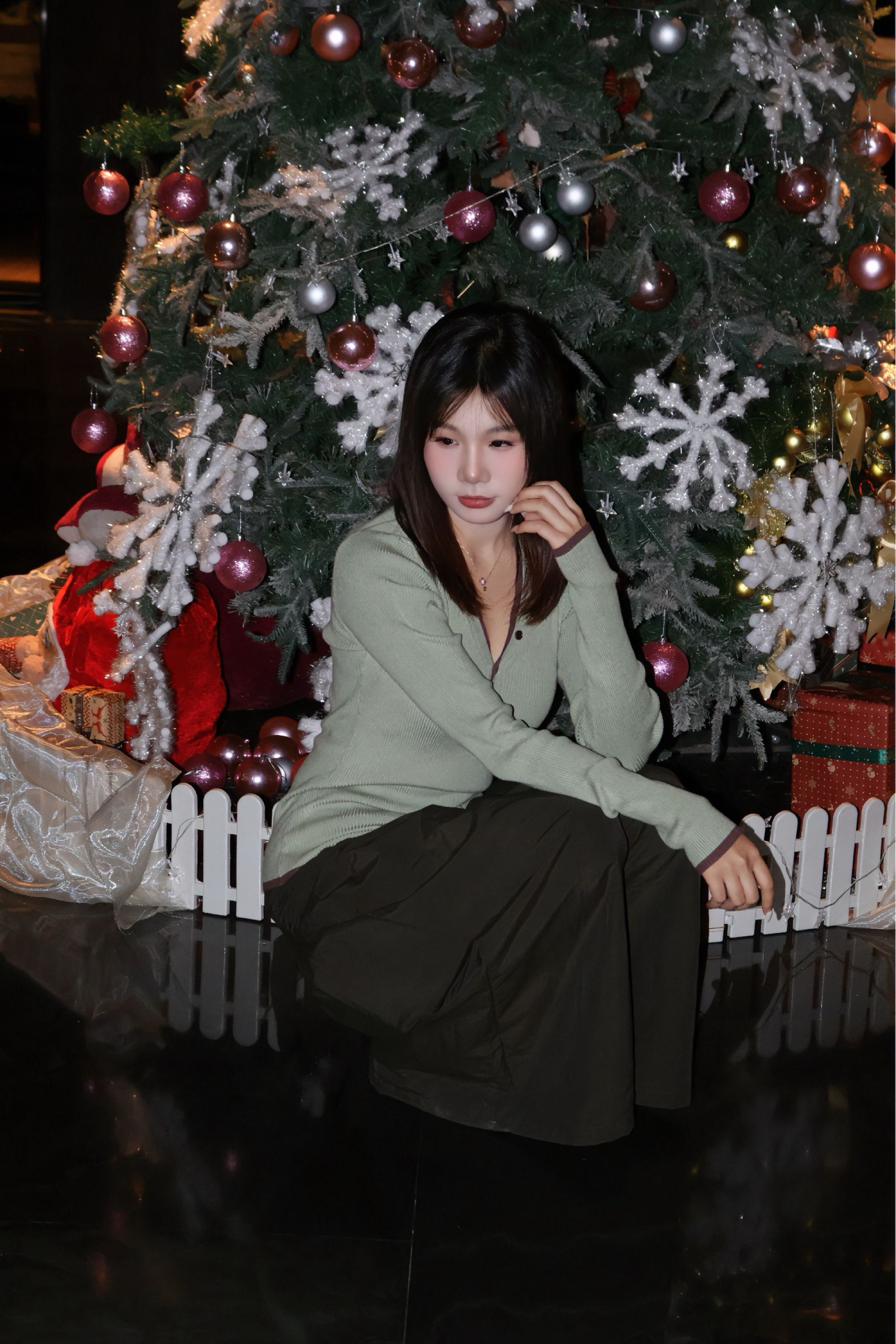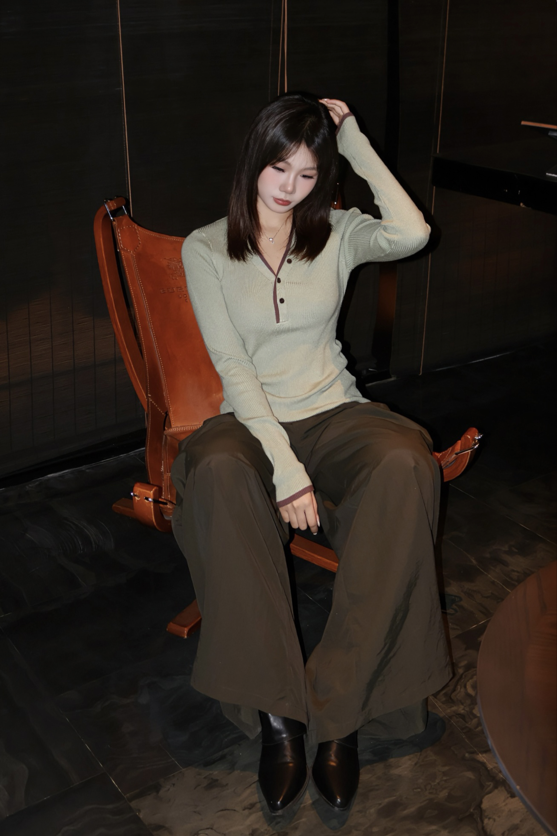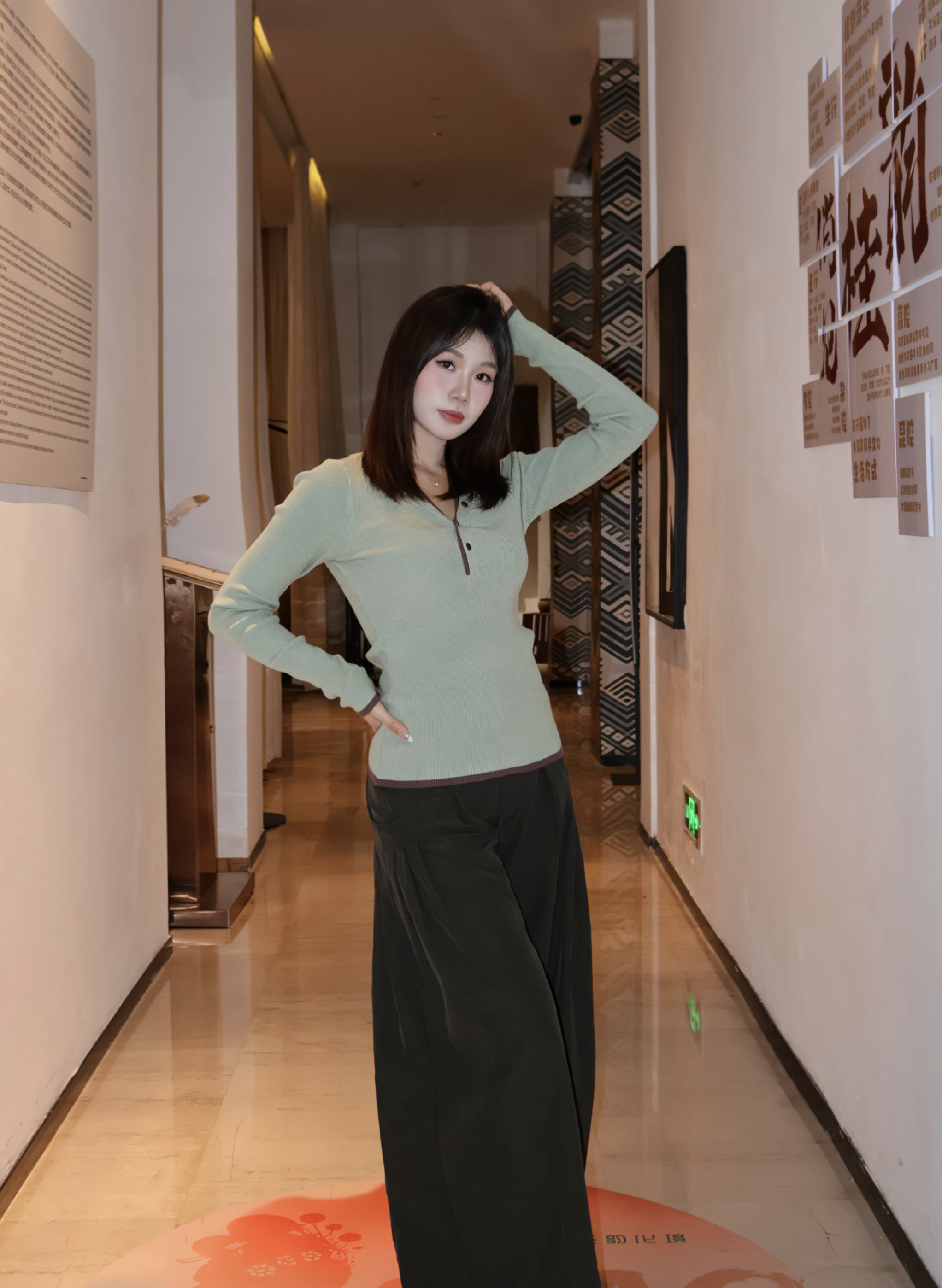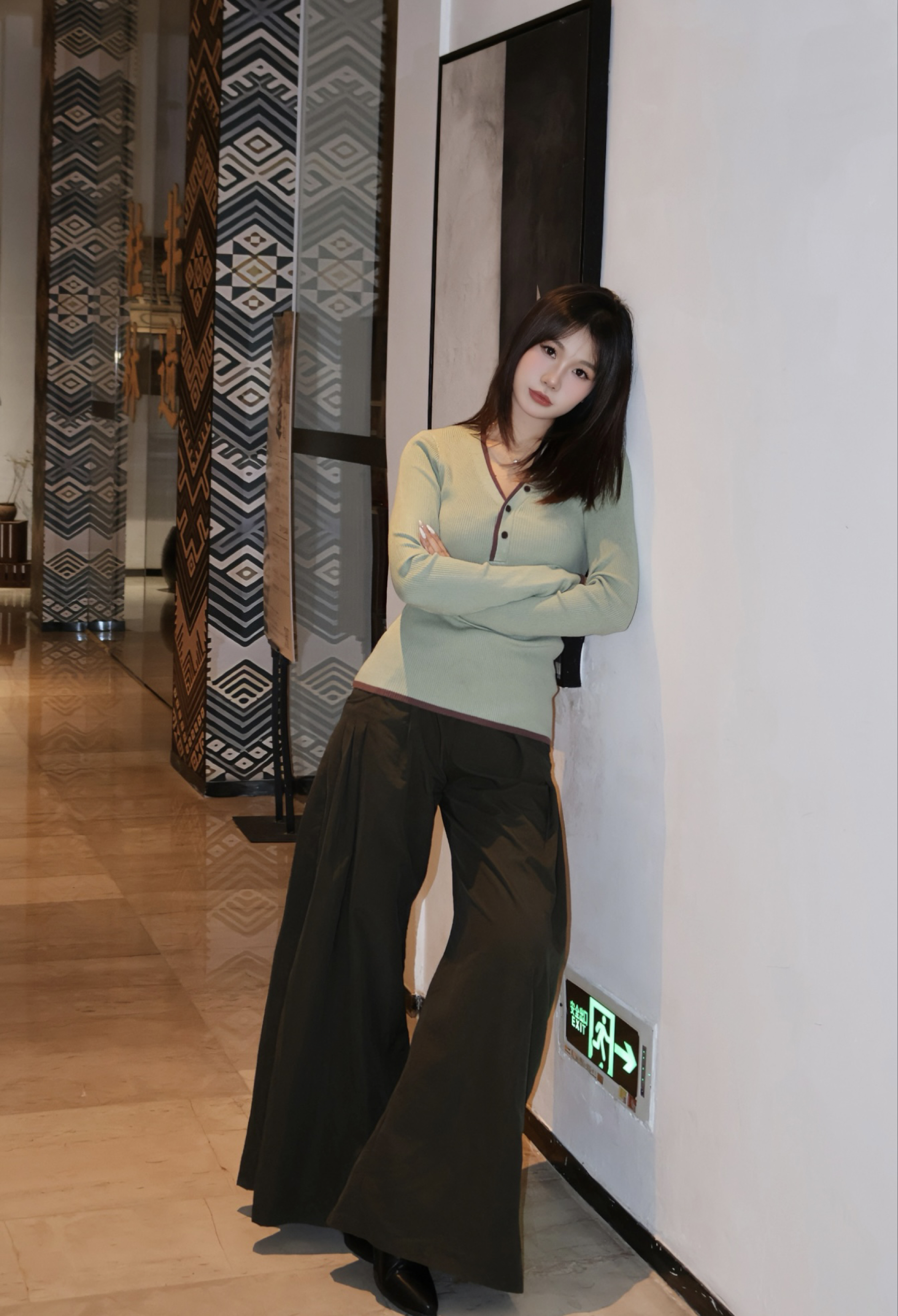 薄荷绿坑条针织衫是点睛之笔,细密竖坑条肌理修饰身形,V领半开襟设计露出精致锁骨,衣摆和袖口的深棕拼边与下装呼应;修身剪裁贴合腰腹线条,微弹面料兼顾舒适与显瘦。搭配深咖色阔腿裤,垂坠的面料让裤腿形成自然褶皱,宽松版型藏肉又营造出慵懒的松弛感。