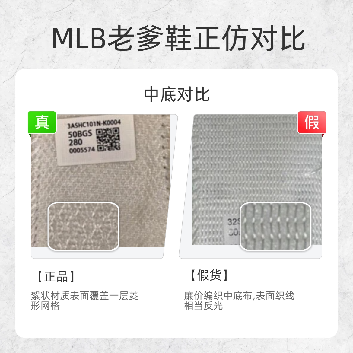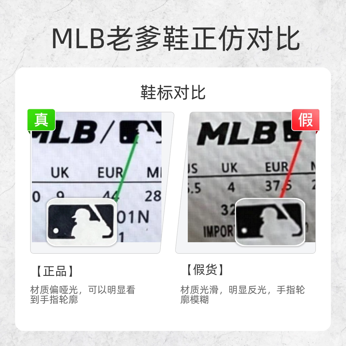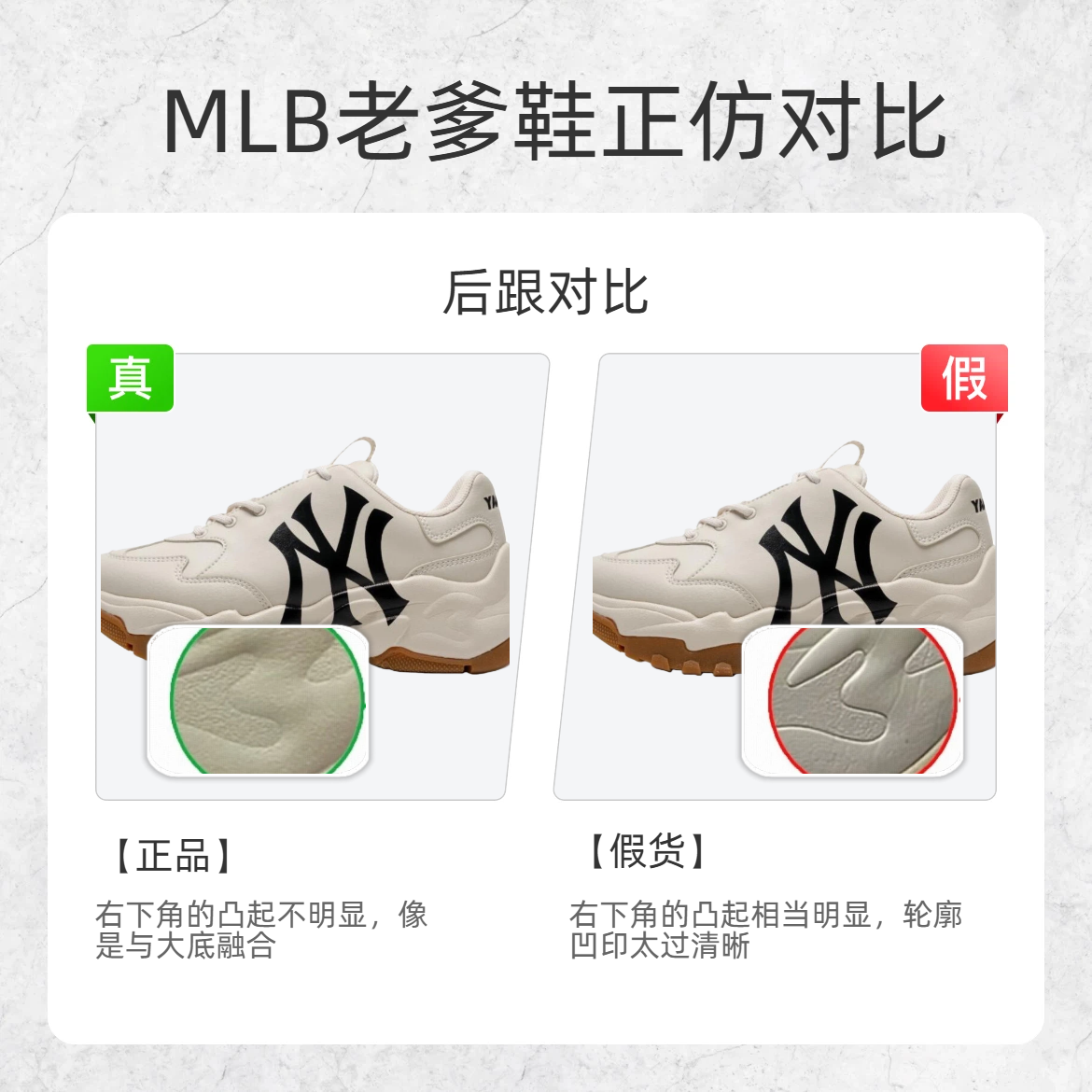 谁还没被 MLB 老爹鞋的颜值戳中!但假货真的太多了… 今天把3 个最实用的鉴别点扒给你们,看完直接变身鉴鞋达人👇 1️⃣ 后跟 ✅正品:右下角凸起不明显,几乎和大底几乎融合 ❌假货:右下角凸起超明显,轮廓凹印像 “刻” 上去的 2️⃣ 中底 ✅正品:絮状材质 + 菱形网格,纹理细腻不反光 ❌假货:廉价编织布,表面织线反光严重,手感轻飘飘 3️⃣ 鞋标 ✅正品:鞋标偏哑光,能清晰看到手指轮廓...