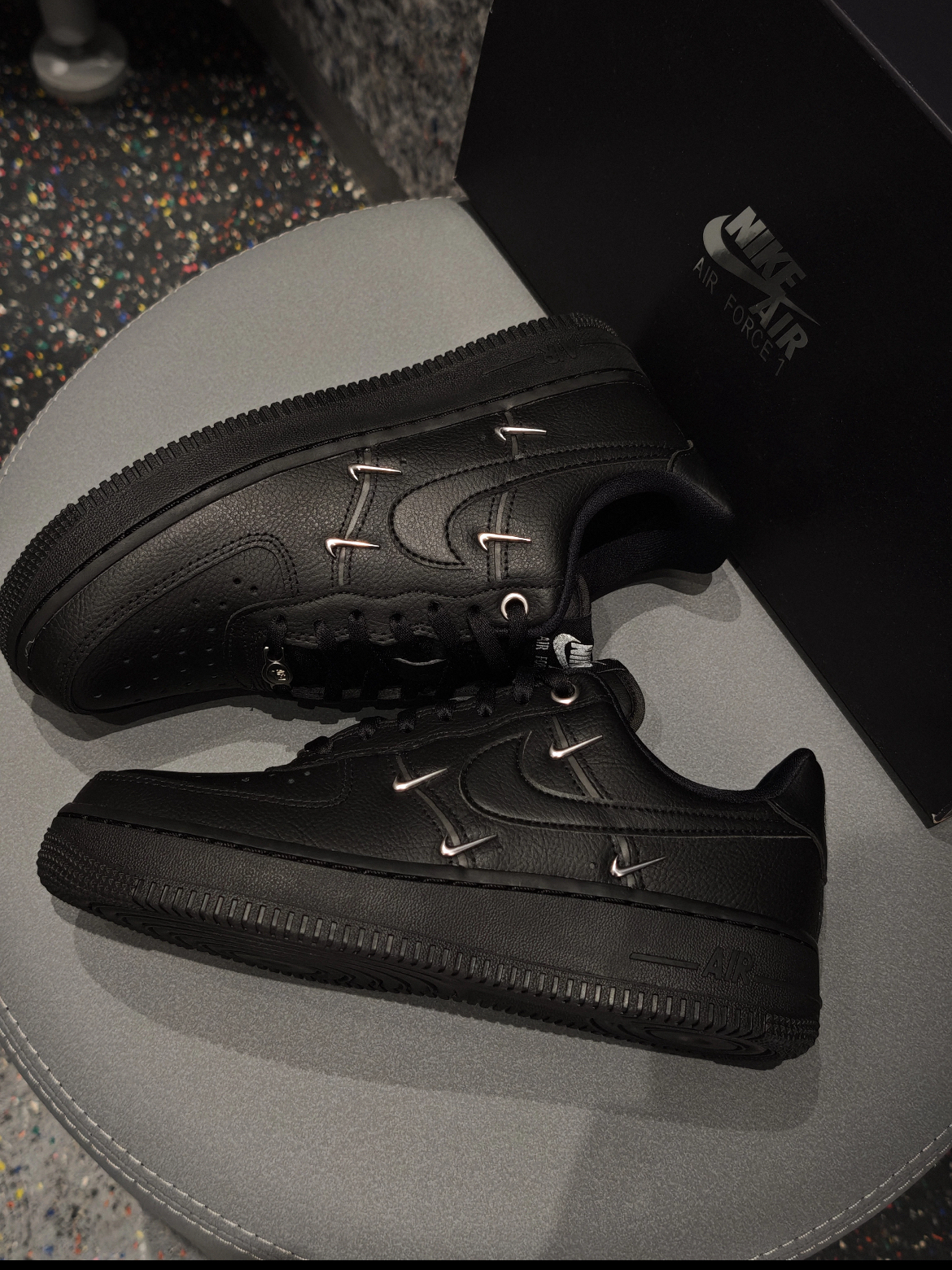 这双Nike Air Force 1 Low Multi-Swoosh黑武士款直接戳中暗黑系爱好者的审美!全黑荔枝纹皮革鞋面质感拉满,鞋侧的金属小勾装饰是点睛之笔,银色金属质感和纯黑鞋面形成强烈对比,低调又不失细节感。鞋舌的Air Force 1标识、金属鞋带扣也让整体精致度飙升,脚感延续了AF1经典的气垫缓震,日常压马路完全无压力。 穿搭思路 1. 街头休闲风:搭配黑色工装裤+白色打底衫+黑...