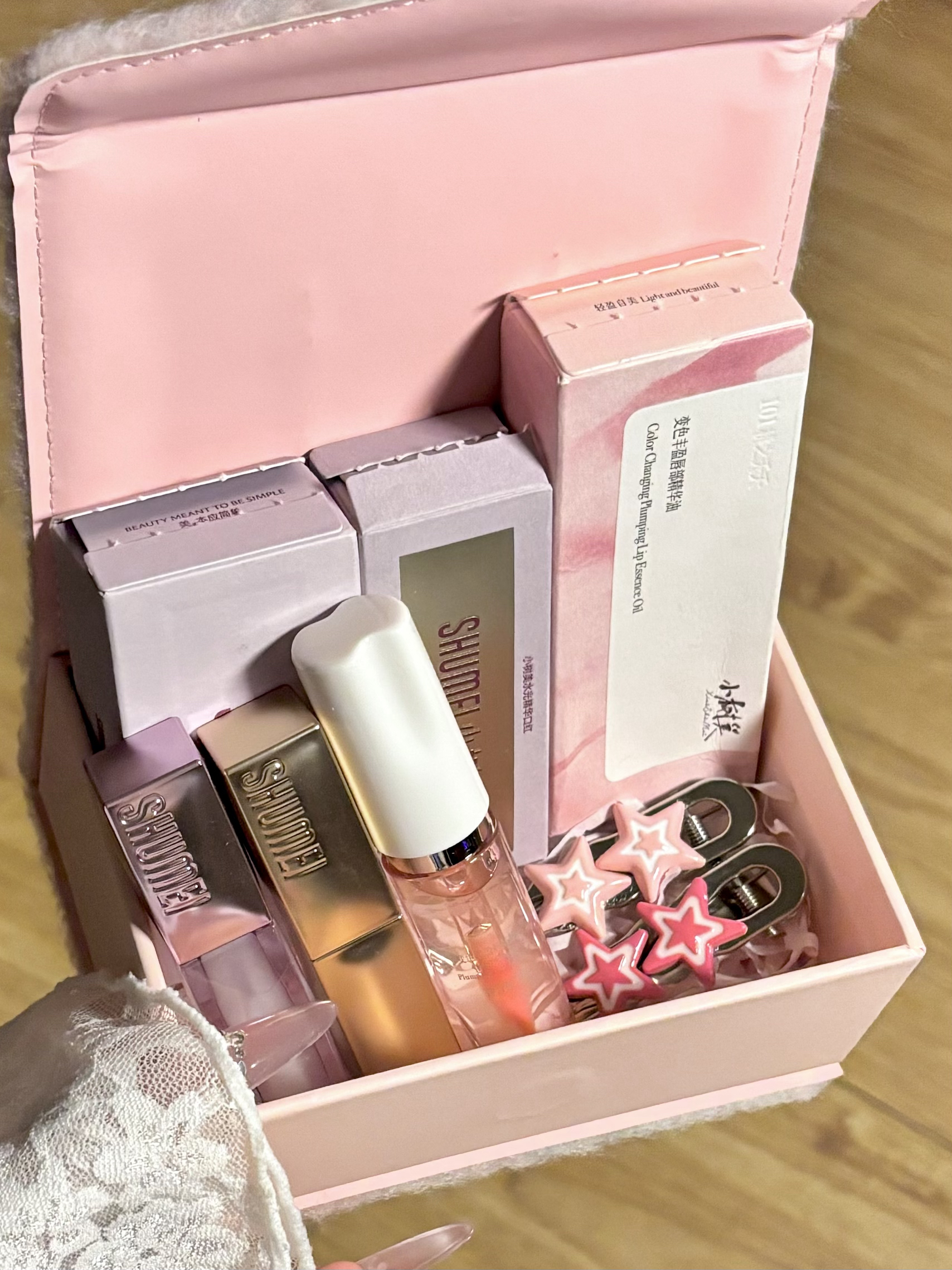 谁懂啊!这个粉盒一打开全是惊喜—— 唇釉、精华油颜值直接封神,连星星小装饰都戳中少女心~ 软乎乎的包装自带温柔滤镜,不管送谁都能把仪式感拉满,这波送礼稳赢!