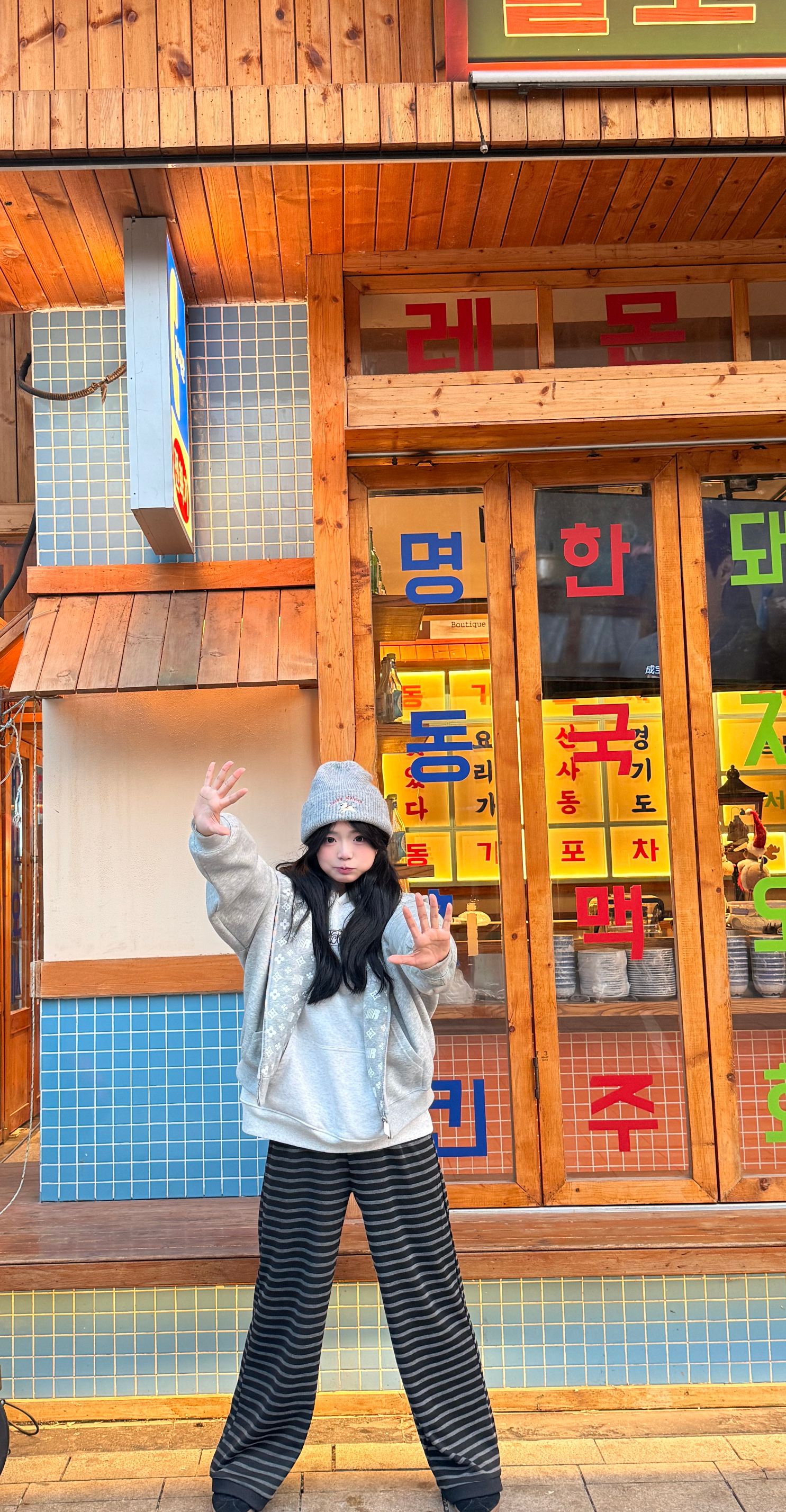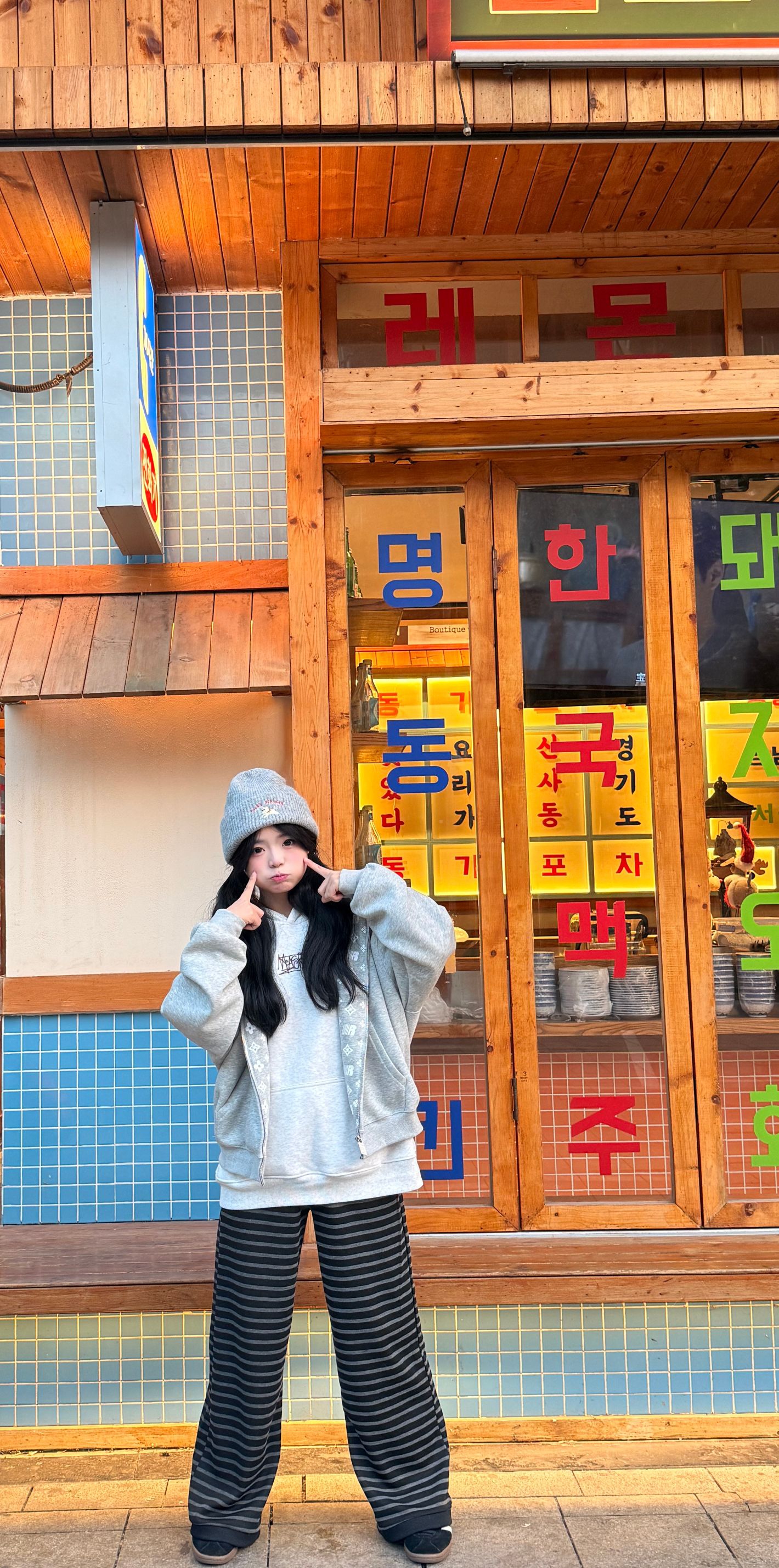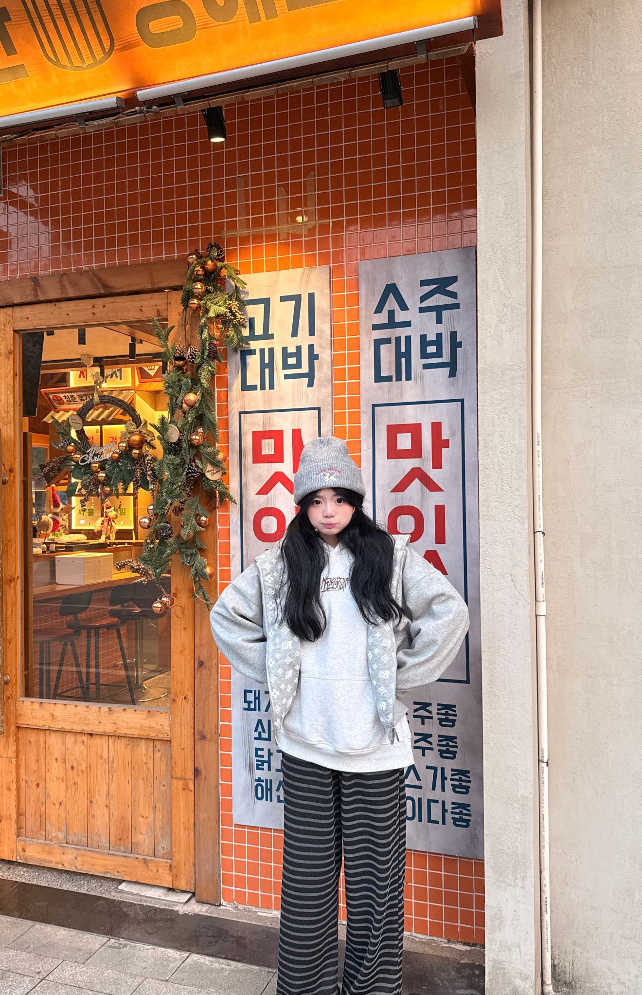 怎么样才能穿得既好看又方便简单呢? 通过内搭已经简单白色卫衣➕灰色印花外套➕灰色小狗帽子➕黑灰色条纹裤子