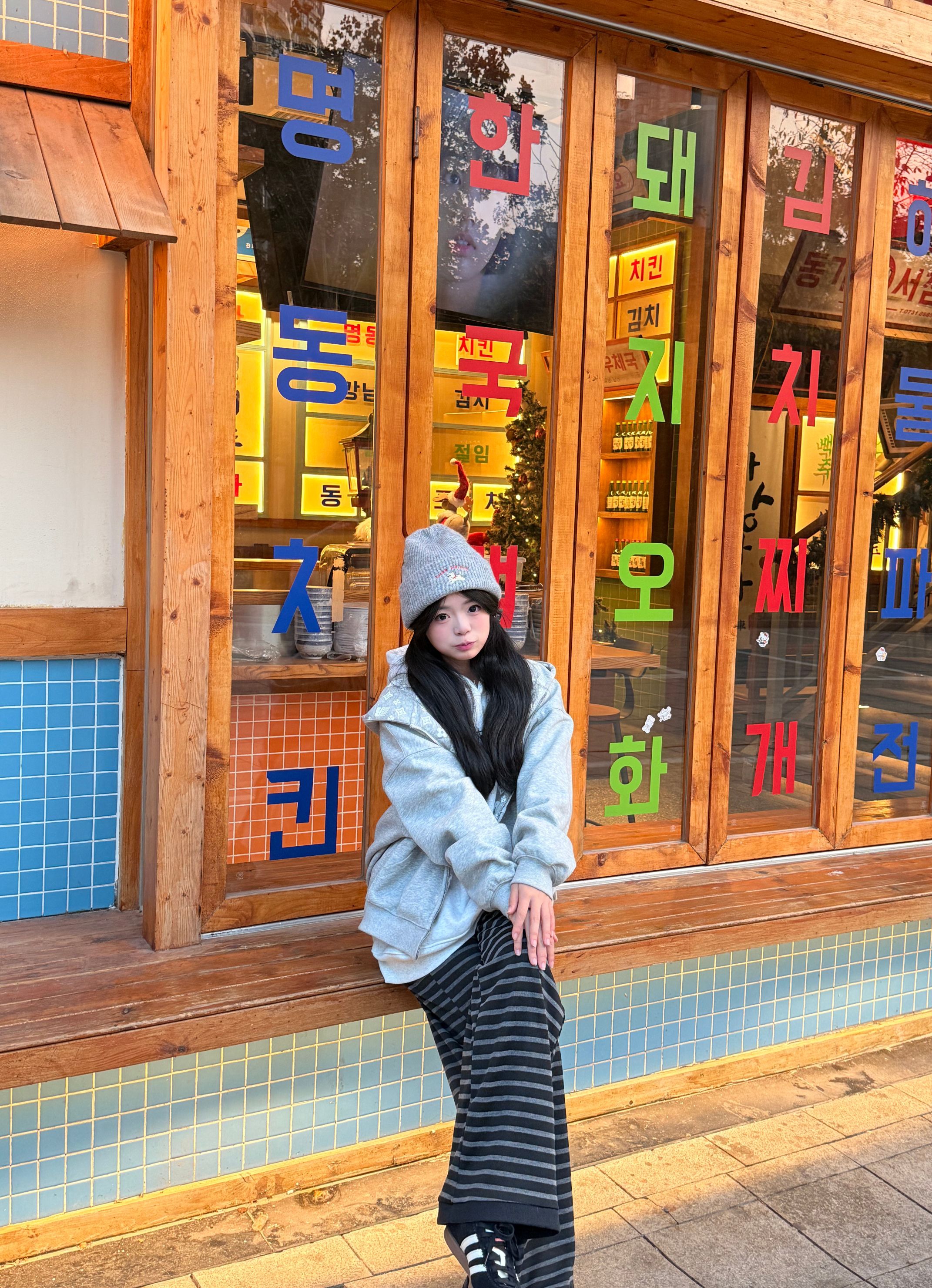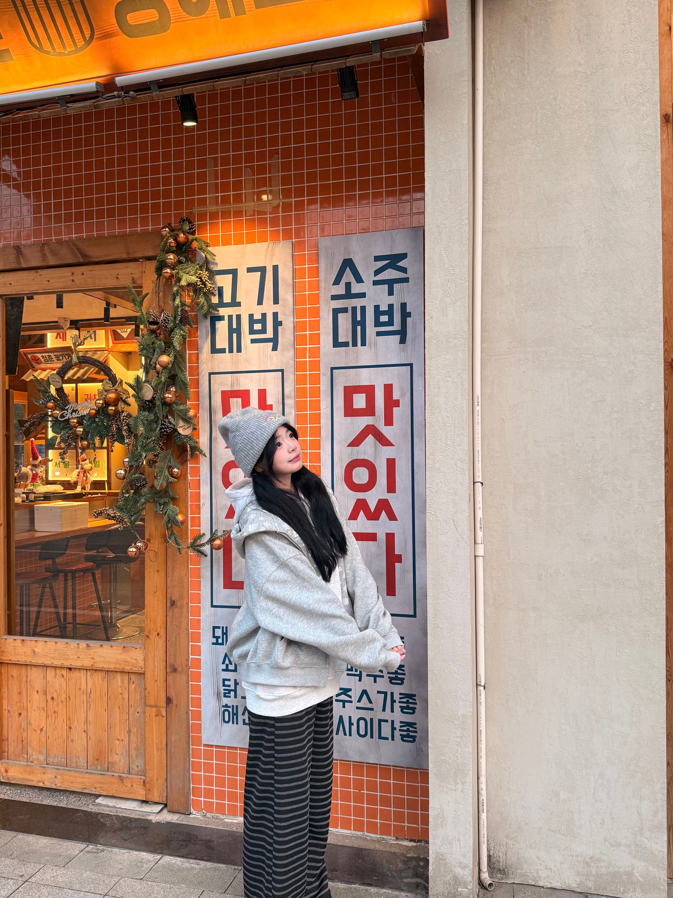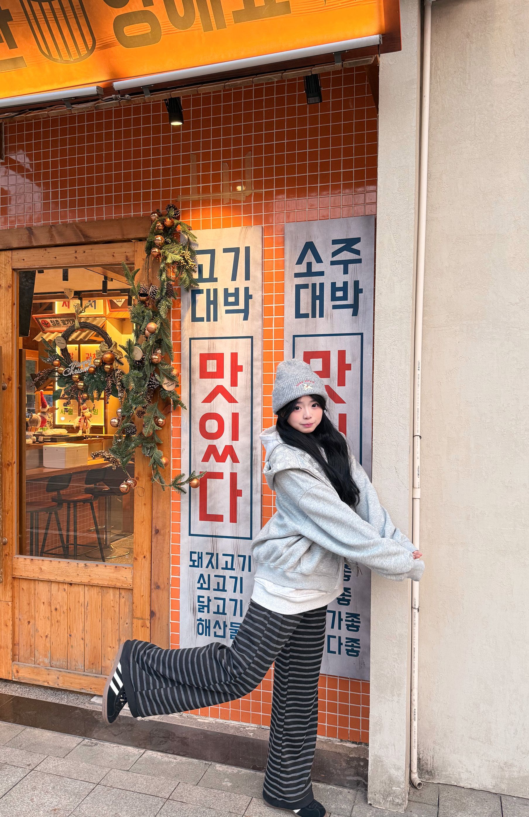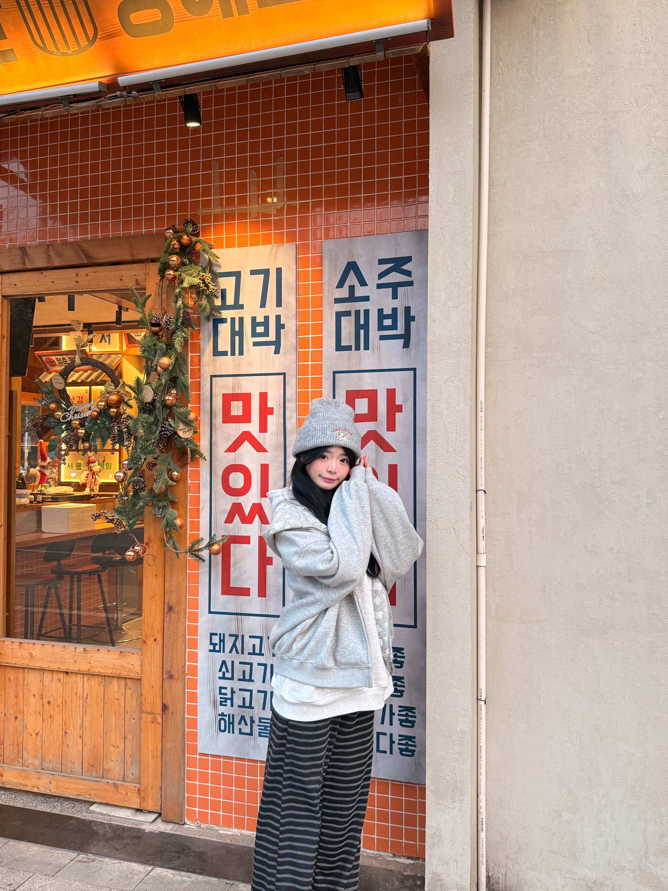 怎么样才能穿得既好看又方便简单呢? 通过内搭已经简单白色卫衣➕灰色印花外套➕灰色小狗帽子➕黑灰色条纹裤子