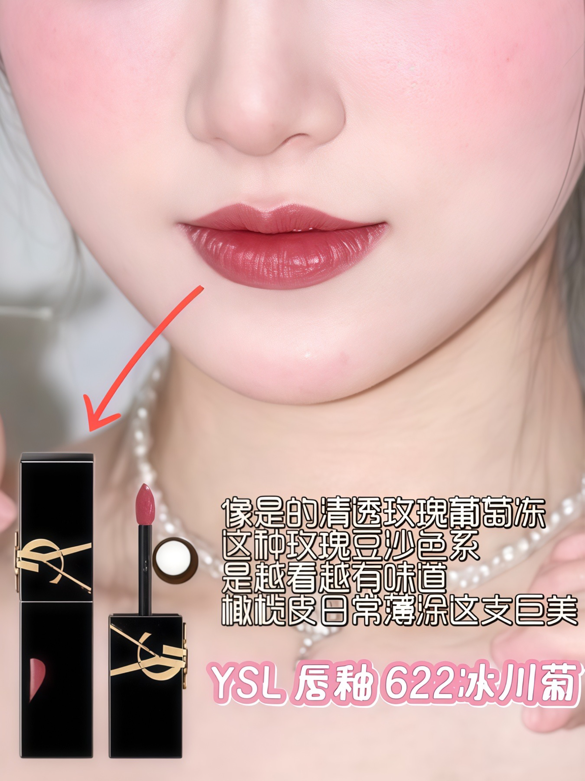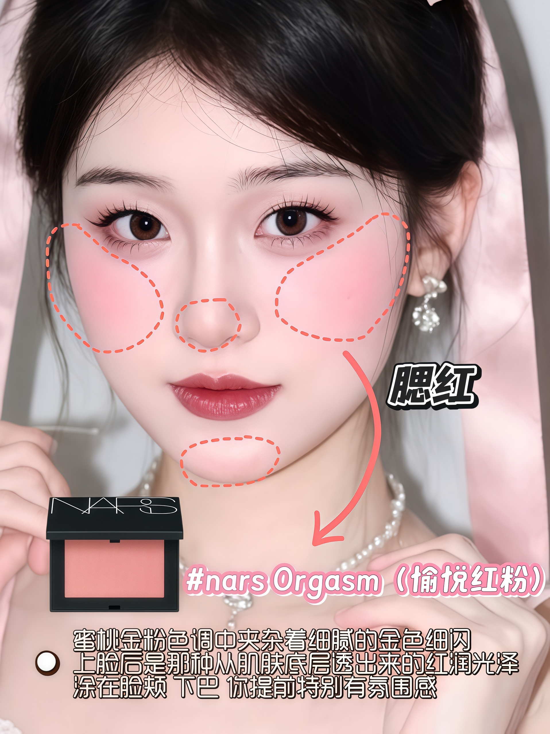 NARS 腮红 Orgasm(愉悦红粉) 蜜桃金粉色调中夹杂着细腻的金色细闪 上脸后是那种从肌肤底层透出来的红润光泽 涂在脸颊 下巴 你提前特别有氛围感 YSL 唇釉 622冰川葡 一颗晶莹剔透的清透玫瑰葡萄冻 这种玫瑰豆沙色系是越看越有味道 橄榄皮黄皮日常薄涂这支巨美