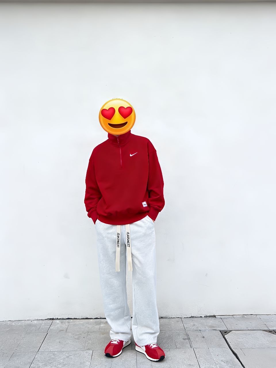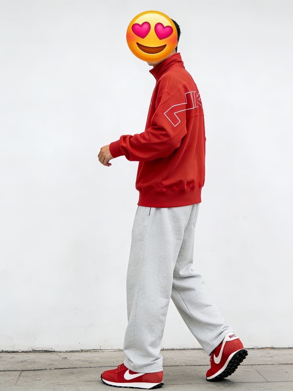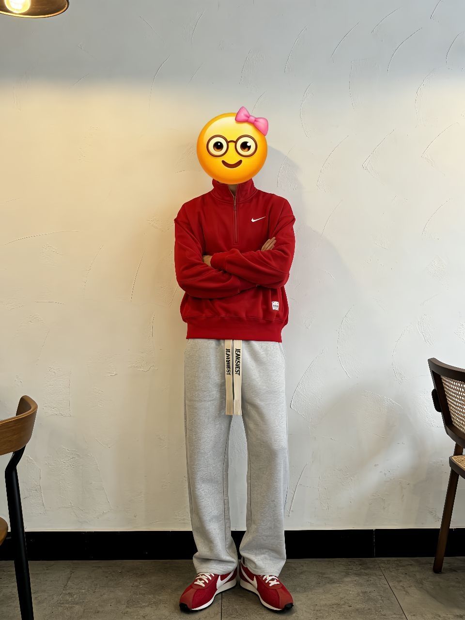 ✨✨最近整上了穿套红灰搭配出门,之前的顾虑全被打消了! 🌈🌈Nike半拉链红卫衣看着亮,实际正红色调巨显白,毛圈面料软乎乎的,半拉链还能调领口松紧,单穿逛咖啡店也不闷 ❤️❤️真维斯阔腿运动裤怕垂感差显矮,结果针织面料坠感拉满,松紧腰加抽绳不勒腰,拖地长度还偷偷显腿长 😍😍Nike红白跑鞋脚感软弹,压马路走万步都不磨脚,橡胶底在商场瓷砖地走也不滑,整套搭起来简约有亮点,通勤休闲都适配!