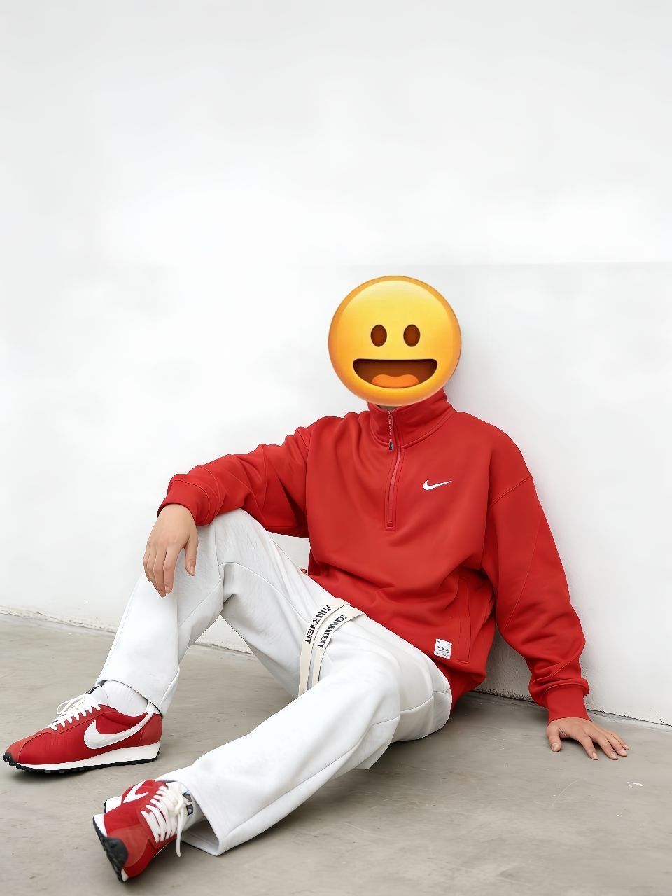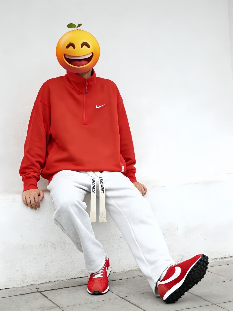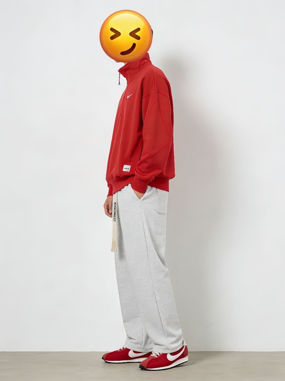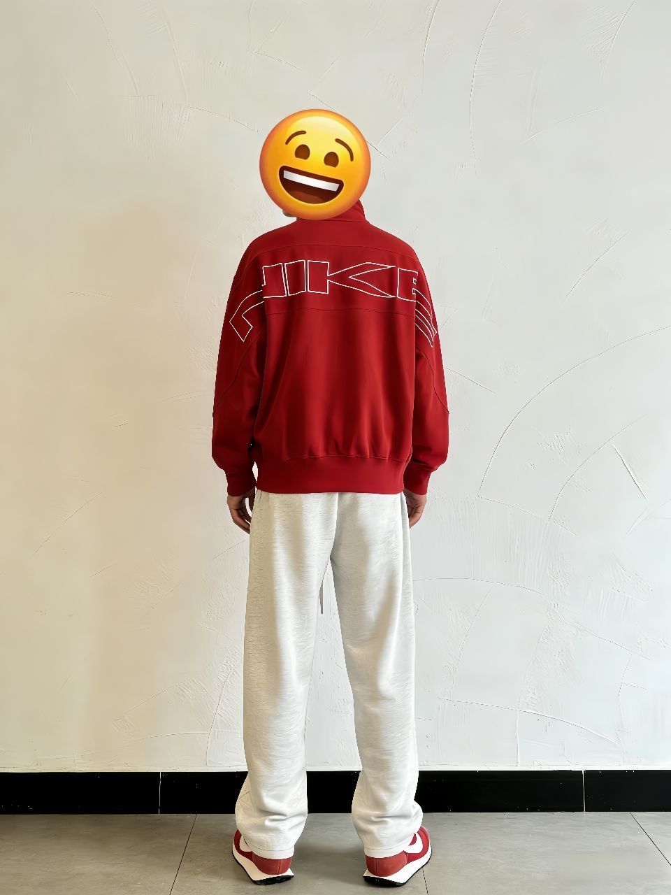 ✨✨最近整上了穿套红灰搭配出门,之前的顾虑全被打消了! 🌈🌈Nike半拉链红卫衣看着亮,实际正红色调巨显白,毛圈面料软乎乎的,半拉链还能调领口松紧,单穿逛咖啡店也不闷 ❤️❤️真维斯阔腿运动裤怕垂感差显矮,结果针织面料坠感拉满,松紧腰加抽绳不勒腰,拖地长度还偷偷显腿长 😍😍Nike红白跑鞋脚感软弹,压马路走万步都不磨脚,橡胶底在商场瓷砖地走也不滑,整套搭起来简约有亮点,通勤休闲都适配!