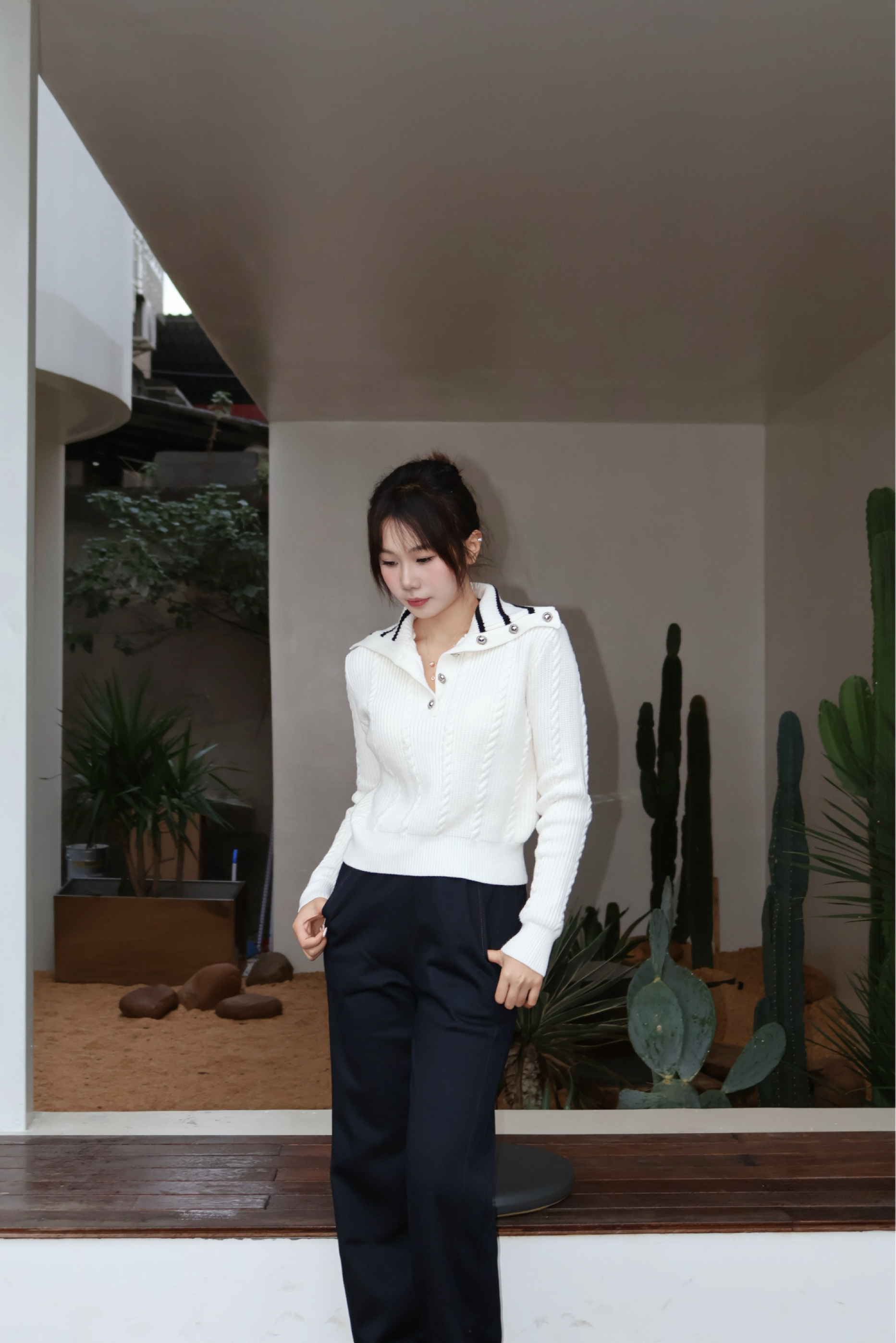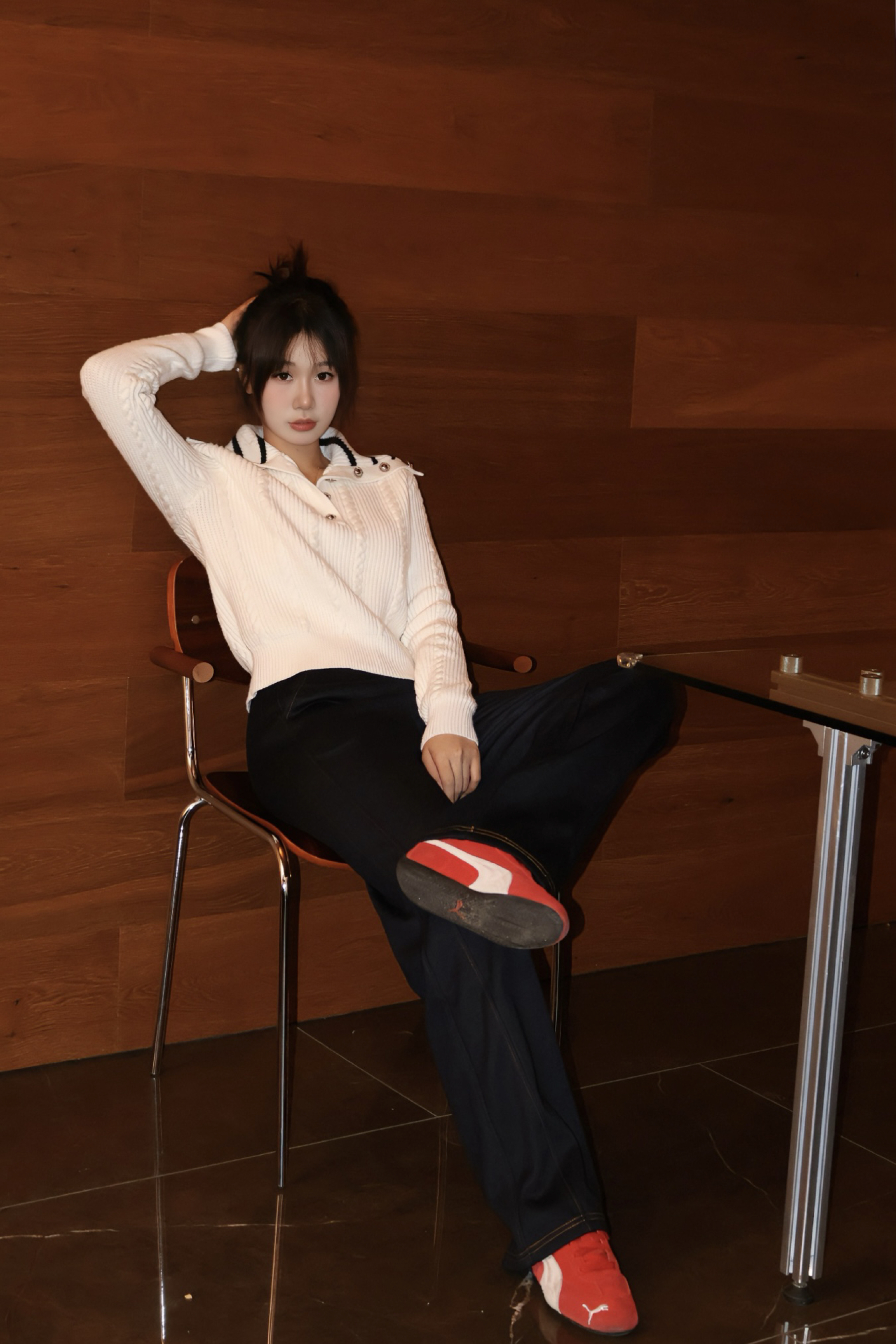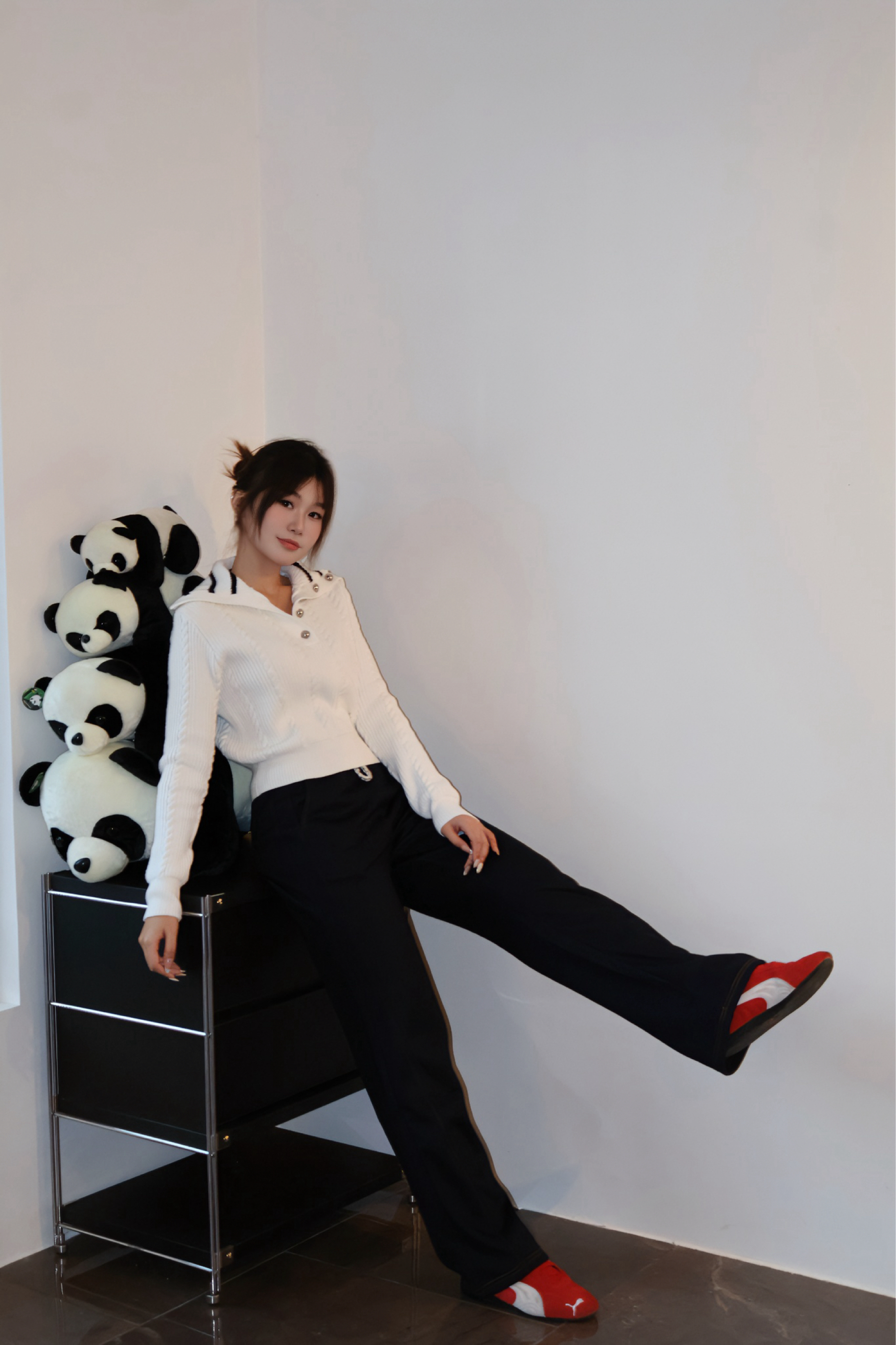 👗:选择白色绞花针织翻领短款上衣,领口的金属按扣与撞色包边增添设计感,短款剪裁拉高腰线; 👖:搭配藏蓝色垂坠感阔腿裤,宽松版型修饰腿型,腰间的金属抽绳呼应上衣细节 👞:脚踩红白色运动鞋,亮色点缀让简约的黑白配更具活力,整体休闲又不失精致😻😻