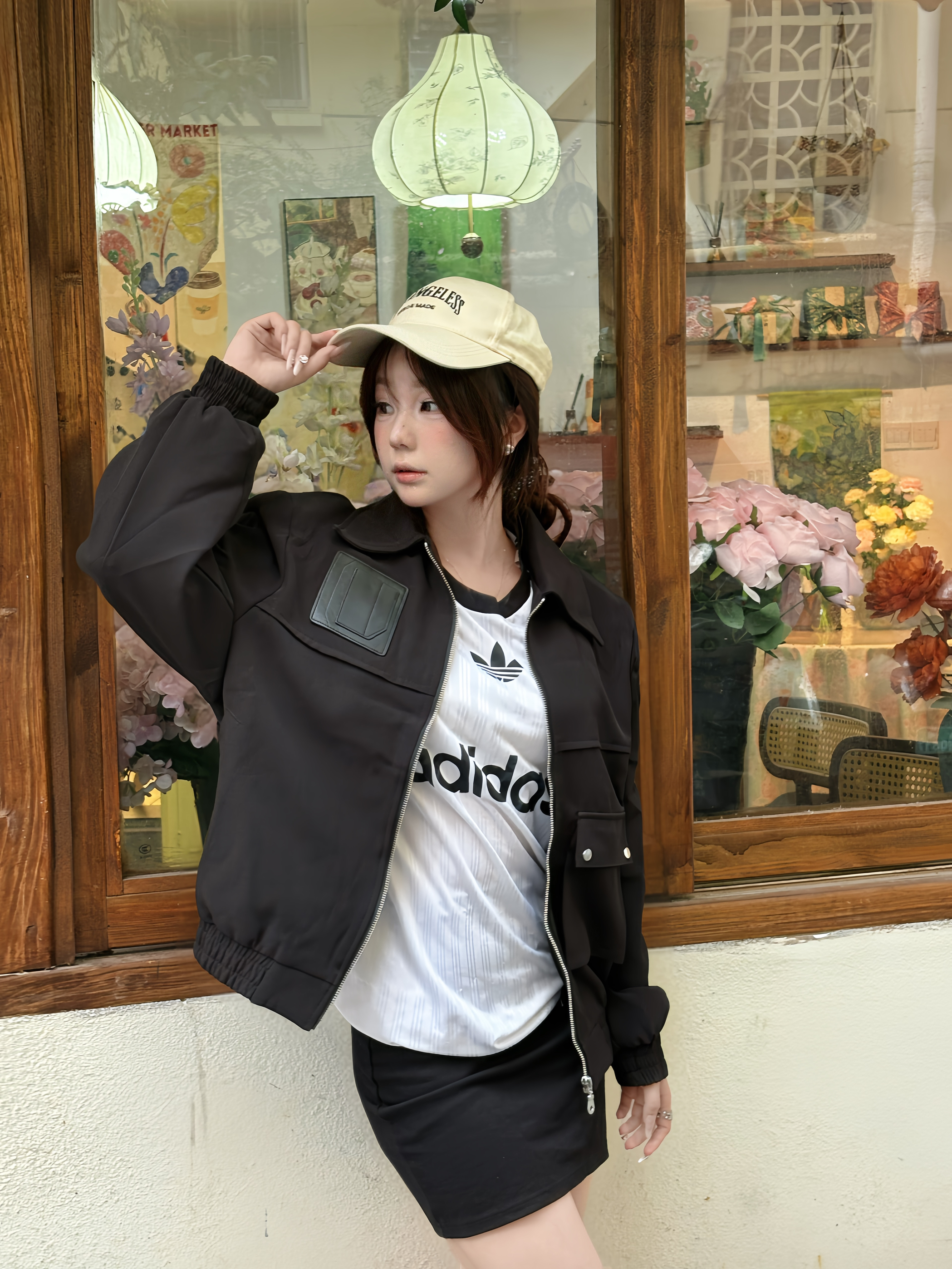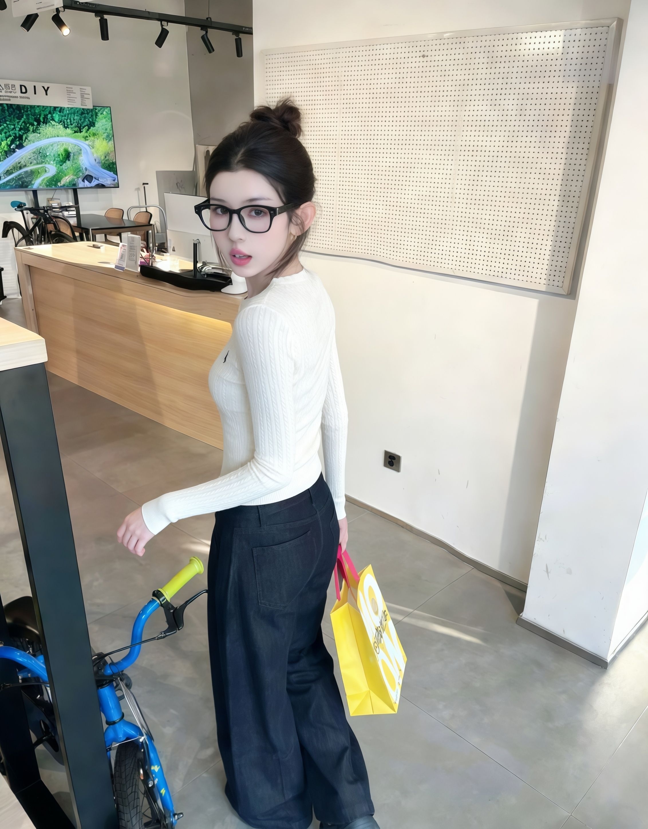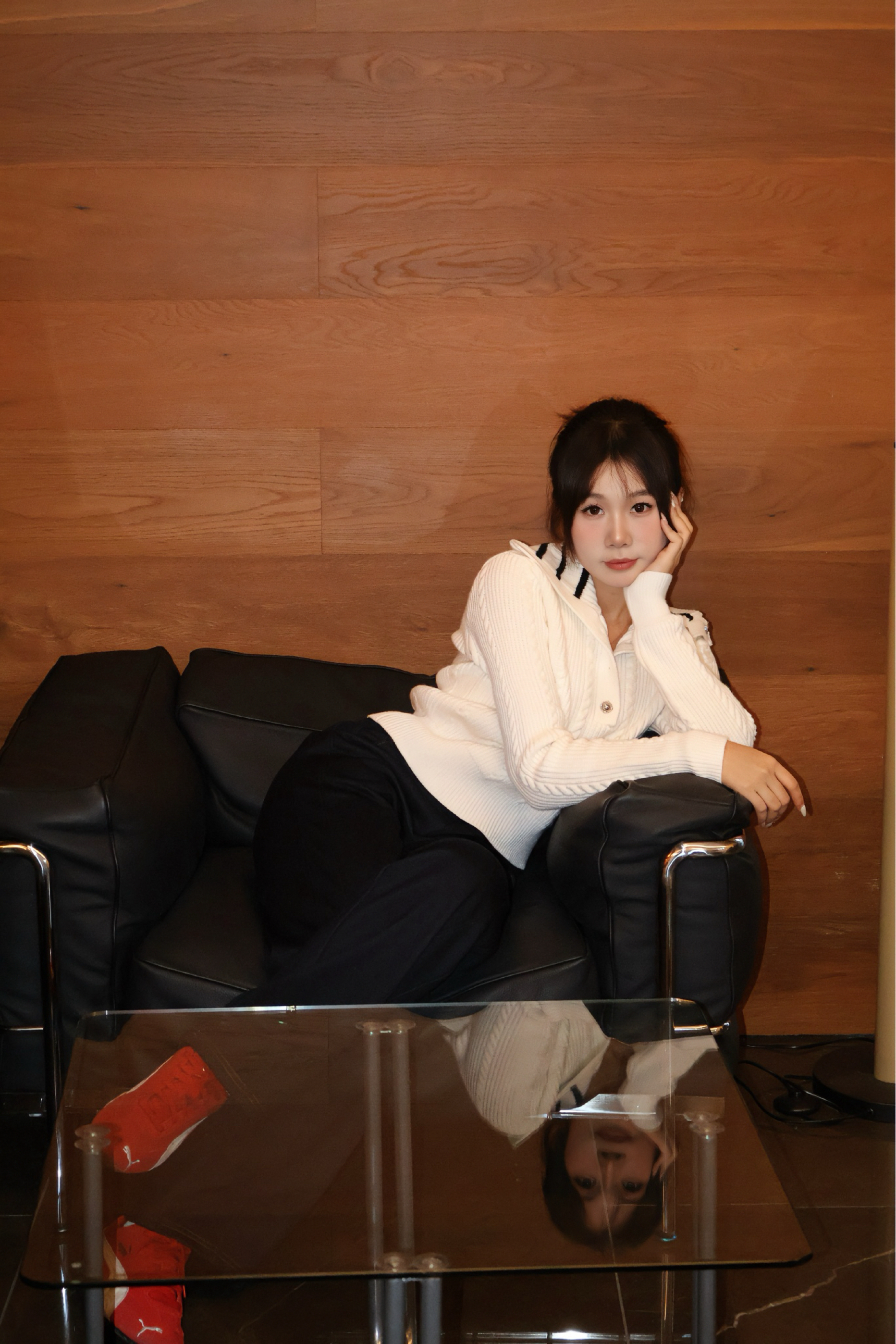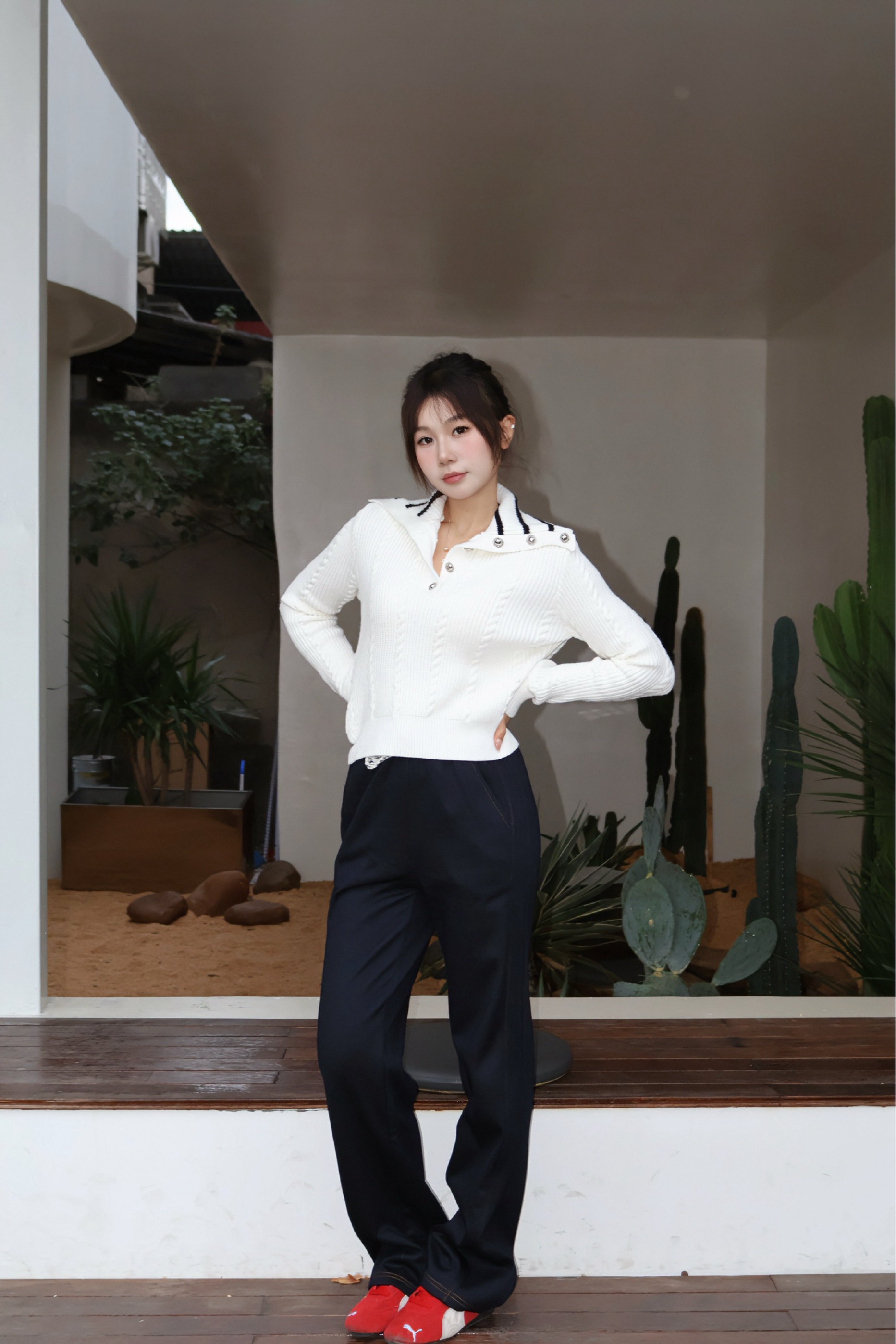 👗:选择白色绞花针织翻领短款上衣,领口的金属按扣与撞色包边增添设计感,短款剪裁拉高腰线; 👖:搭配藏蓝色垂坠感阔腿裤,宽松版型修饰腿型,腰间的金属抽绳呼应上衣细节 👞:脚踩红白色运动鞋,亮色点缀让简约的黑白配更具活力,整体休闲又不失精致😻😻