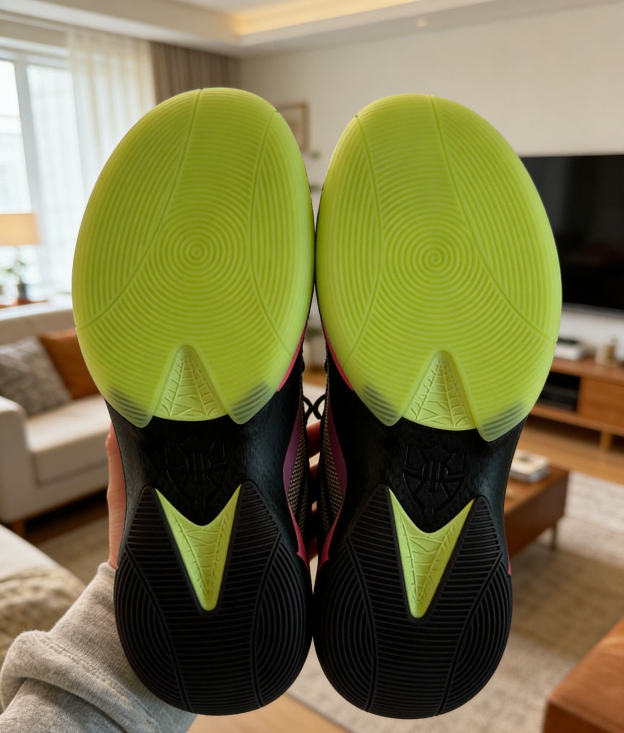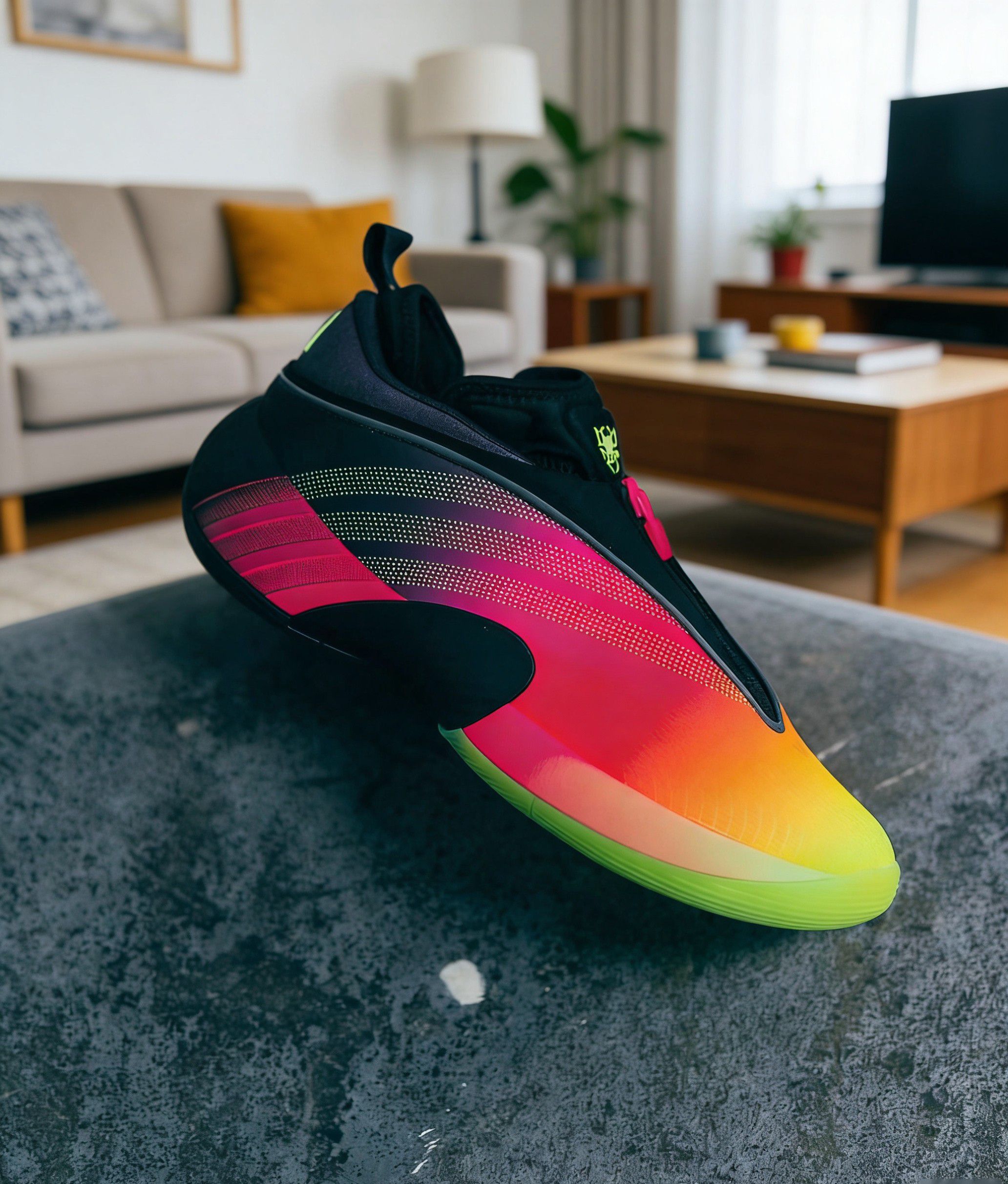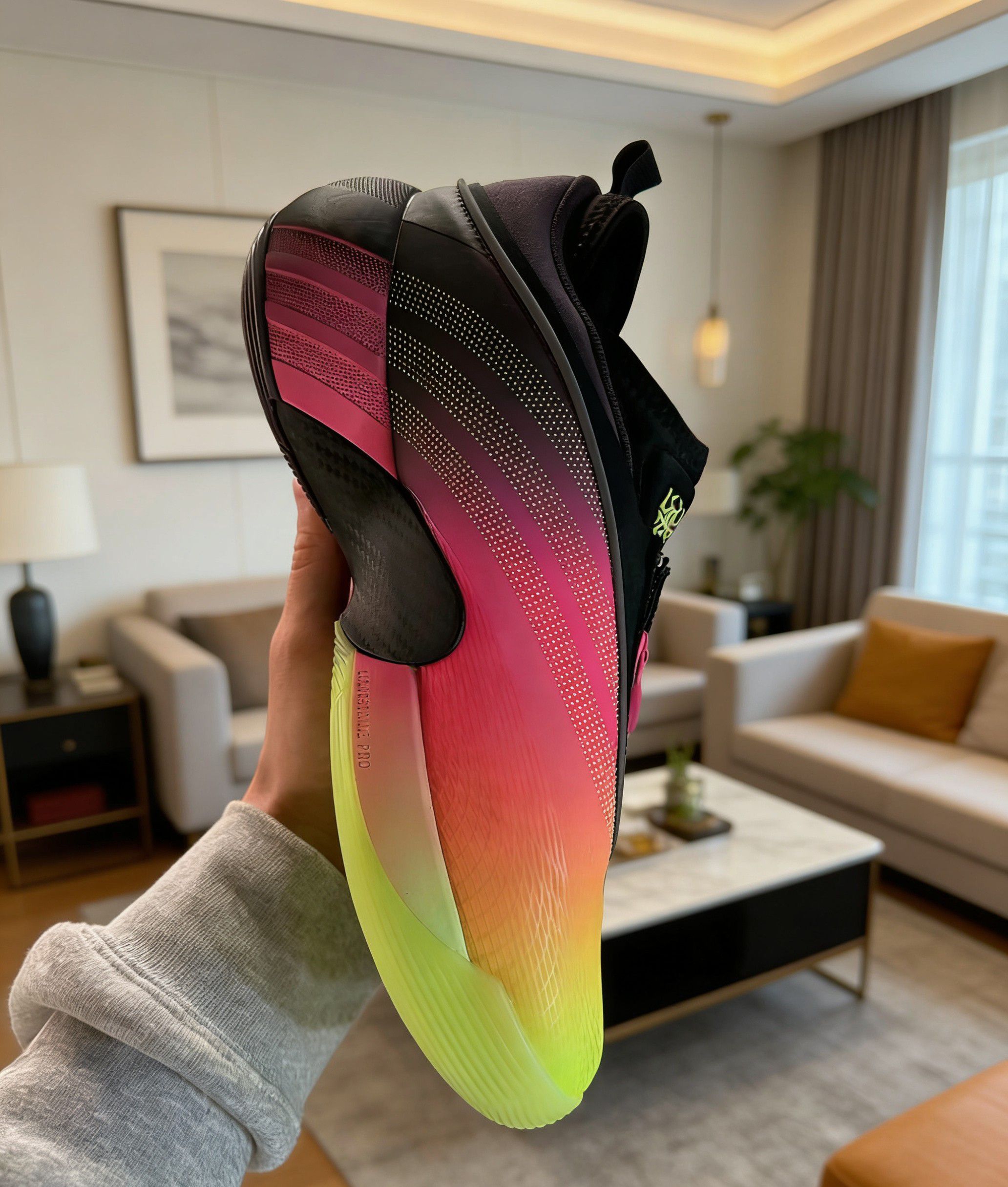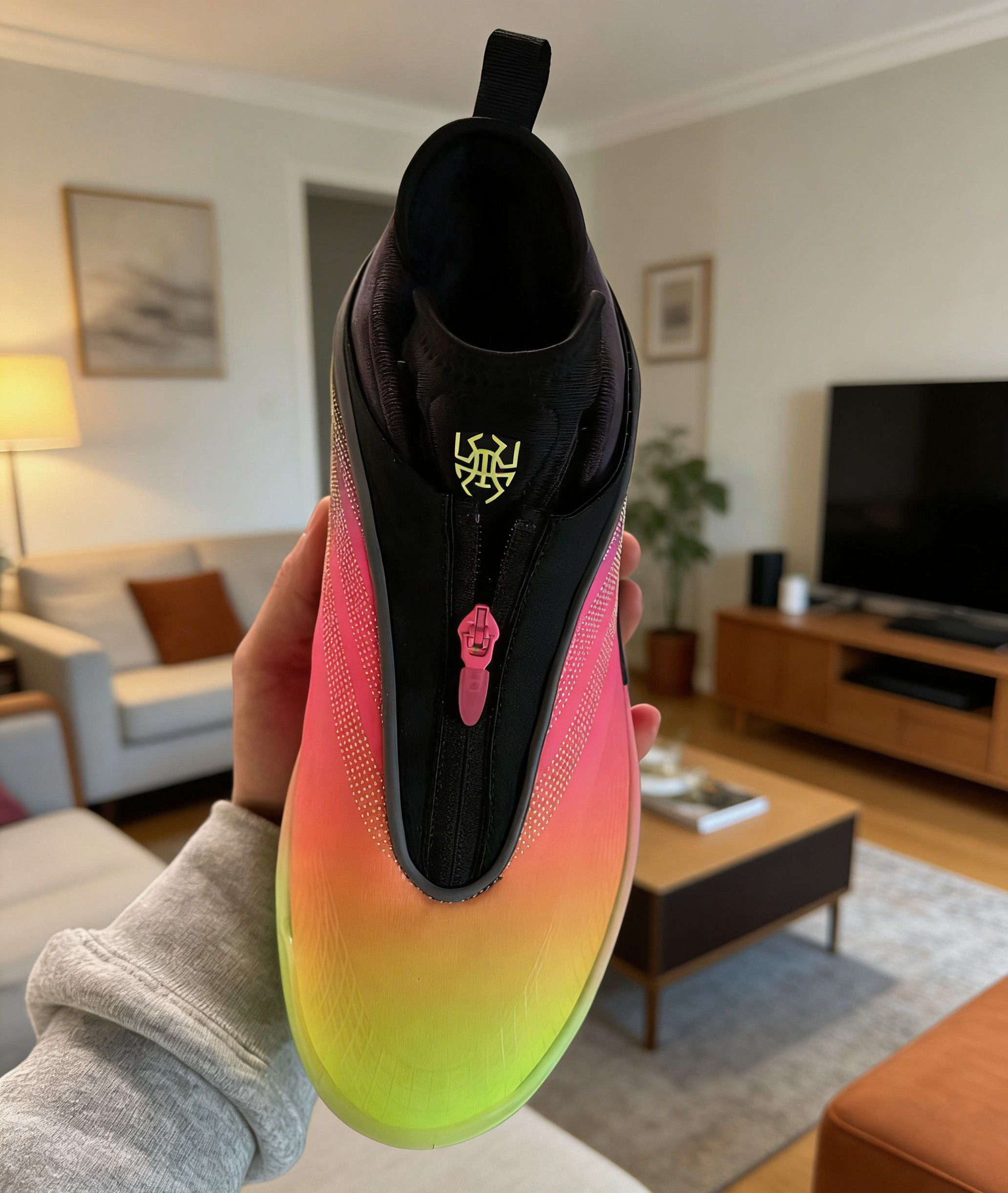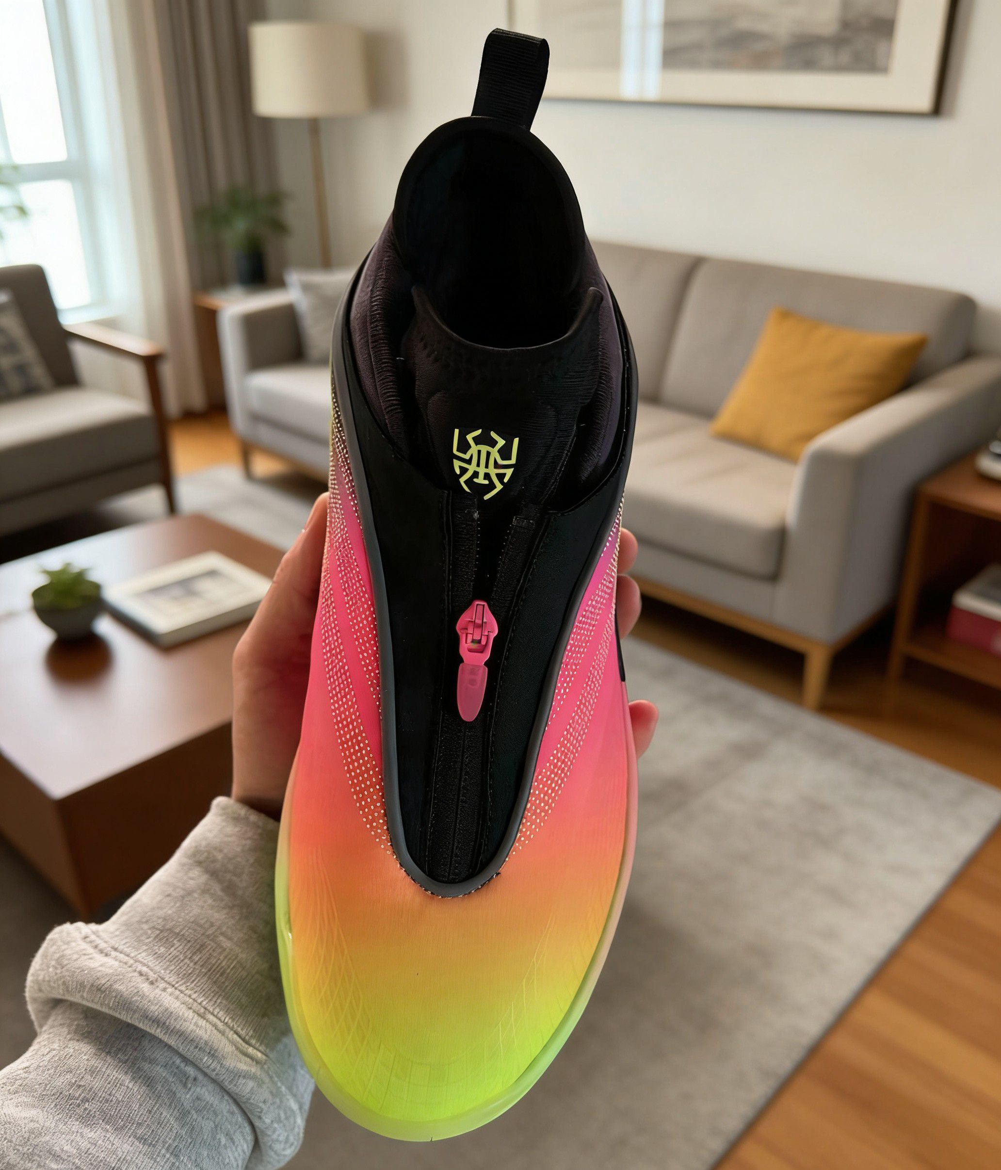 这双鞋的日落渐变配色绝对是年度颜值TOP级别的存在。从鞋头的荧光绿过渡到鞋身的橙红,再到鞋帮的玫粉,渐变层次自然又亮眼,光线底下还能看到鞋身的细微冲孔纹理,质感直接拉满。 鞋身的拉链设计是点睛之笔,粉色拉链头和渐变配色呼应,拉上后整体线条更流畅,还能增强包裹的贴合度;鞋舌上的JB专属logo用金色点缀,细节处的精致感直接拉满。日常穿搭配牛仔裤、运动裤都超吸睛,实战外穿两不误。 缓震方面,中底采...