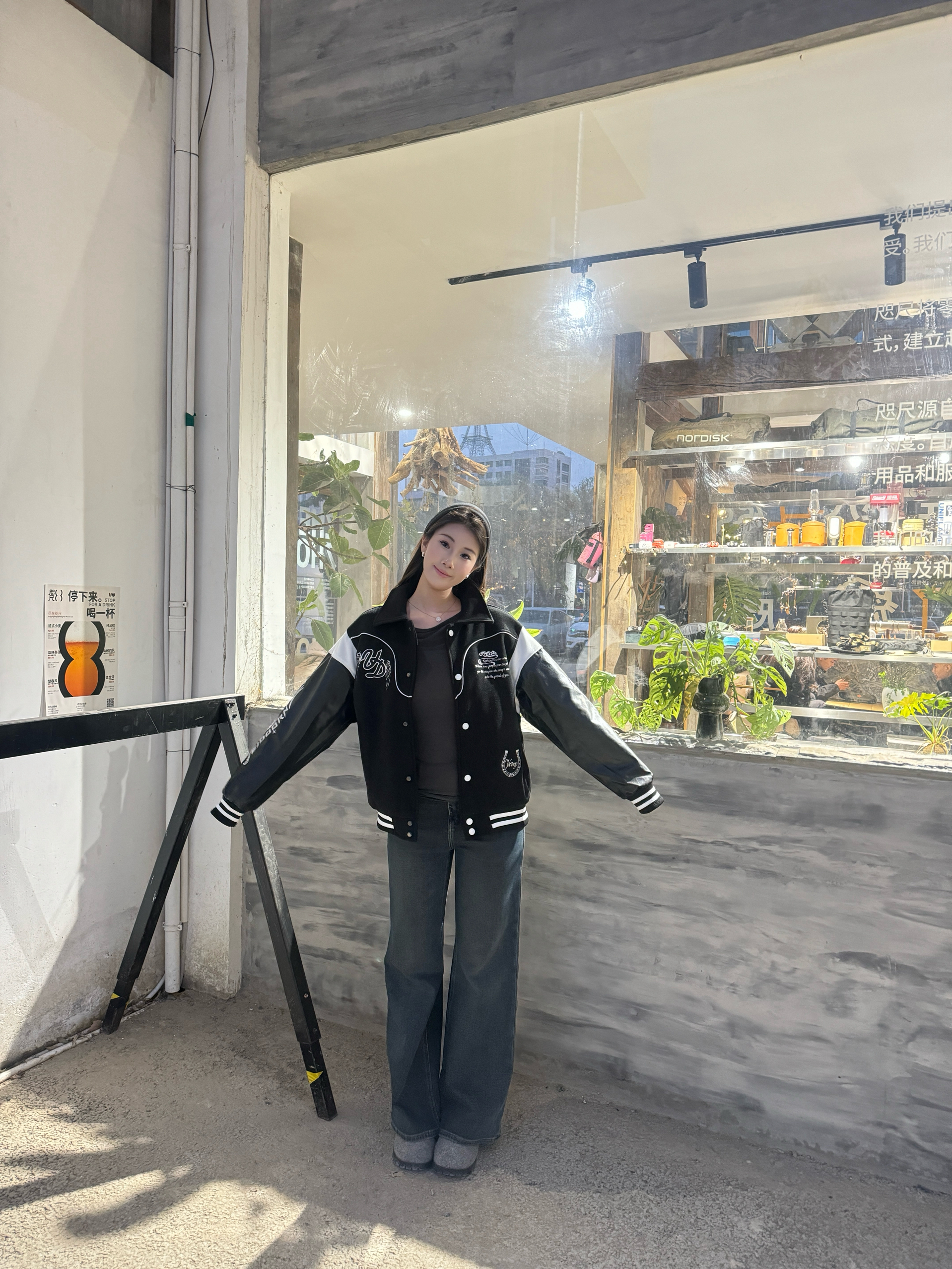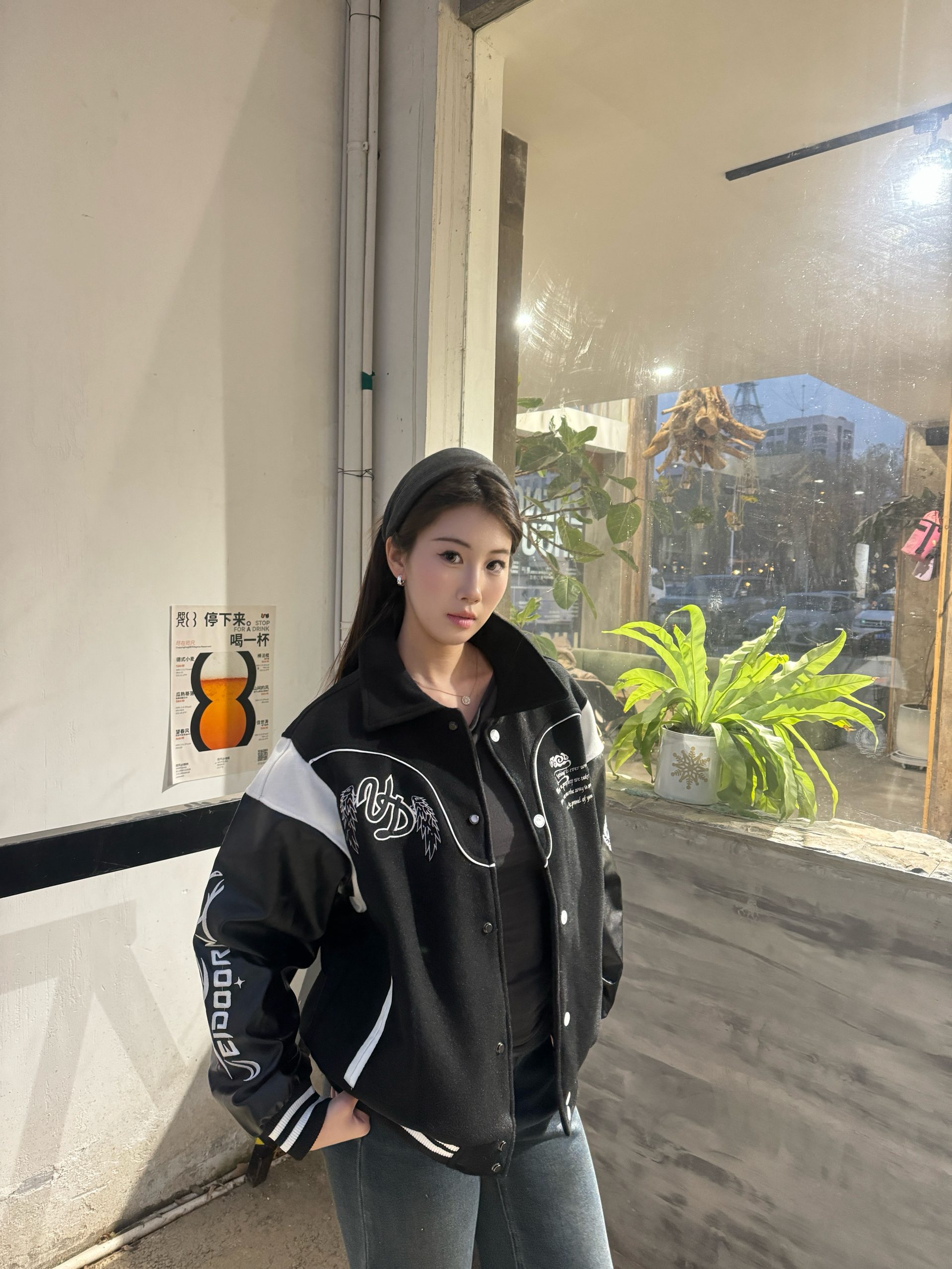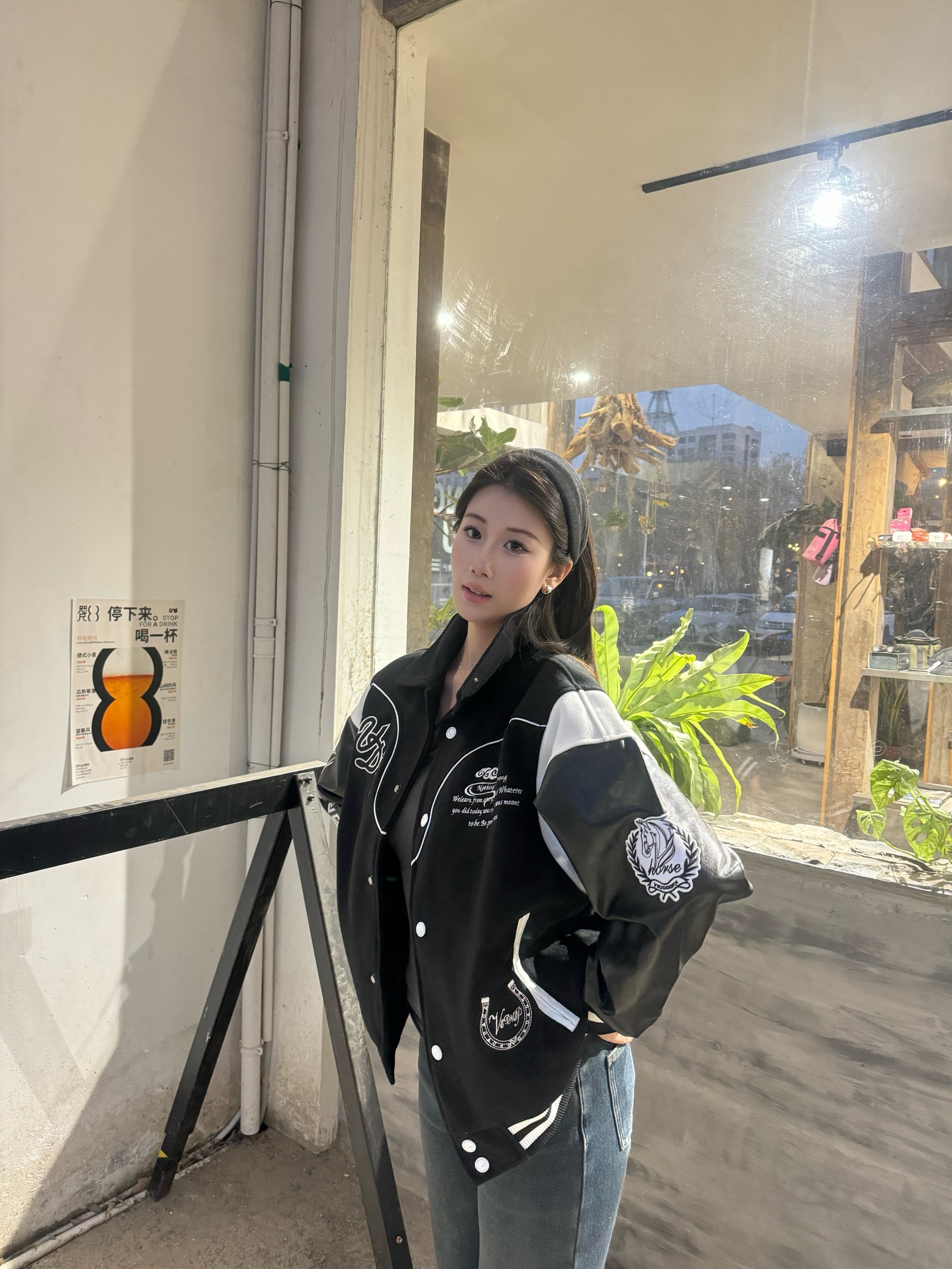 身高172cm体重55kg,穿L码刚好好!这件马年元素棒球服也太合我心意了💛!面料是毛呢拼皮质的,摸起来有质感还不硬,黑白撞色超经典,不管圣诞跨年穿都超有氛围。版型宽松不挑身材,马年元素的刺绣细节超精致,秋冬搭牛仔裤出门,保暖又显元气,小压痕完全不影响穿着,性价比绝了!