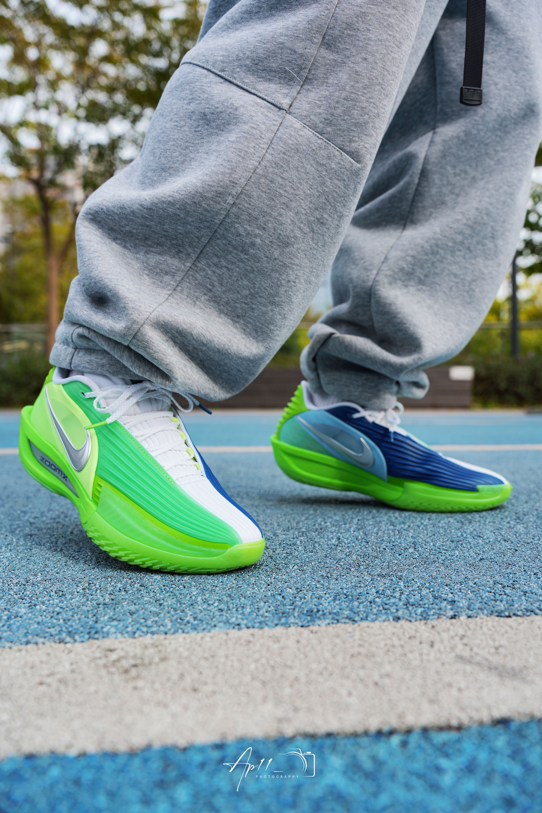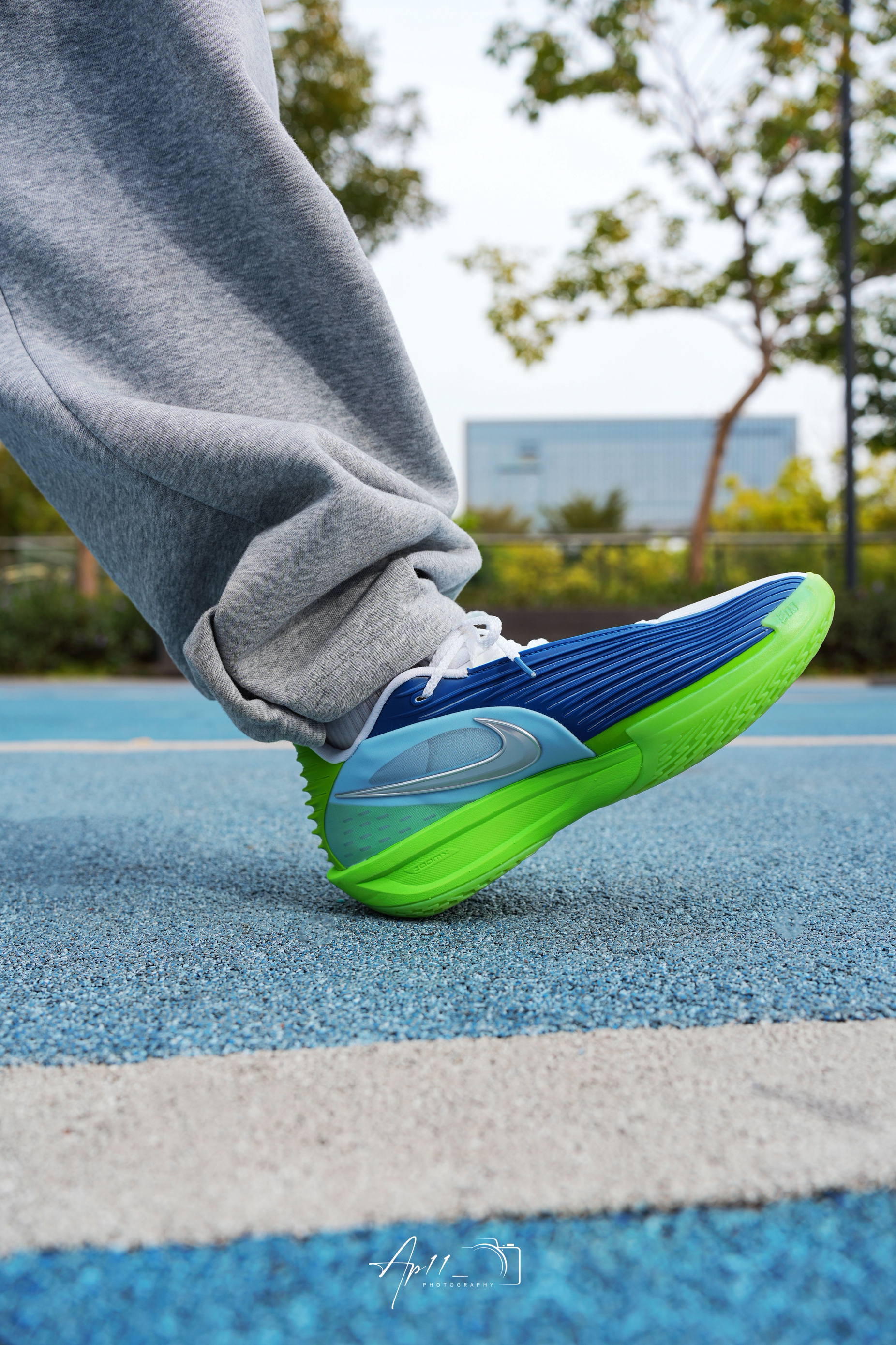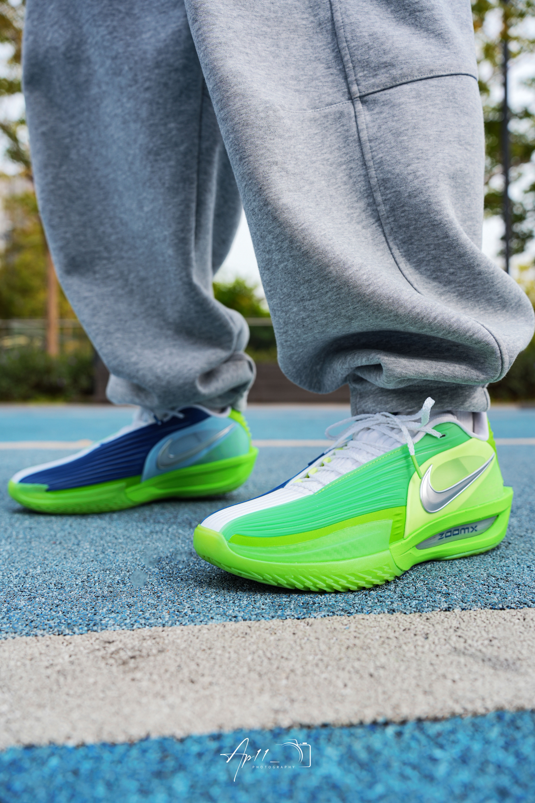 周末穿这双青柠+蓝白撞色的GT Cut 3 Turbo打野球,青柠渐变在球场上特别扎眼,搭灰卫裤出门也清爽。Zoom X中底反馈很轻,突破起步几乎没拖沓感,鞋面贴合脚踝但不磨后跟。没想到实战鞋的配色能这么出片,日常穿也顺理成章。