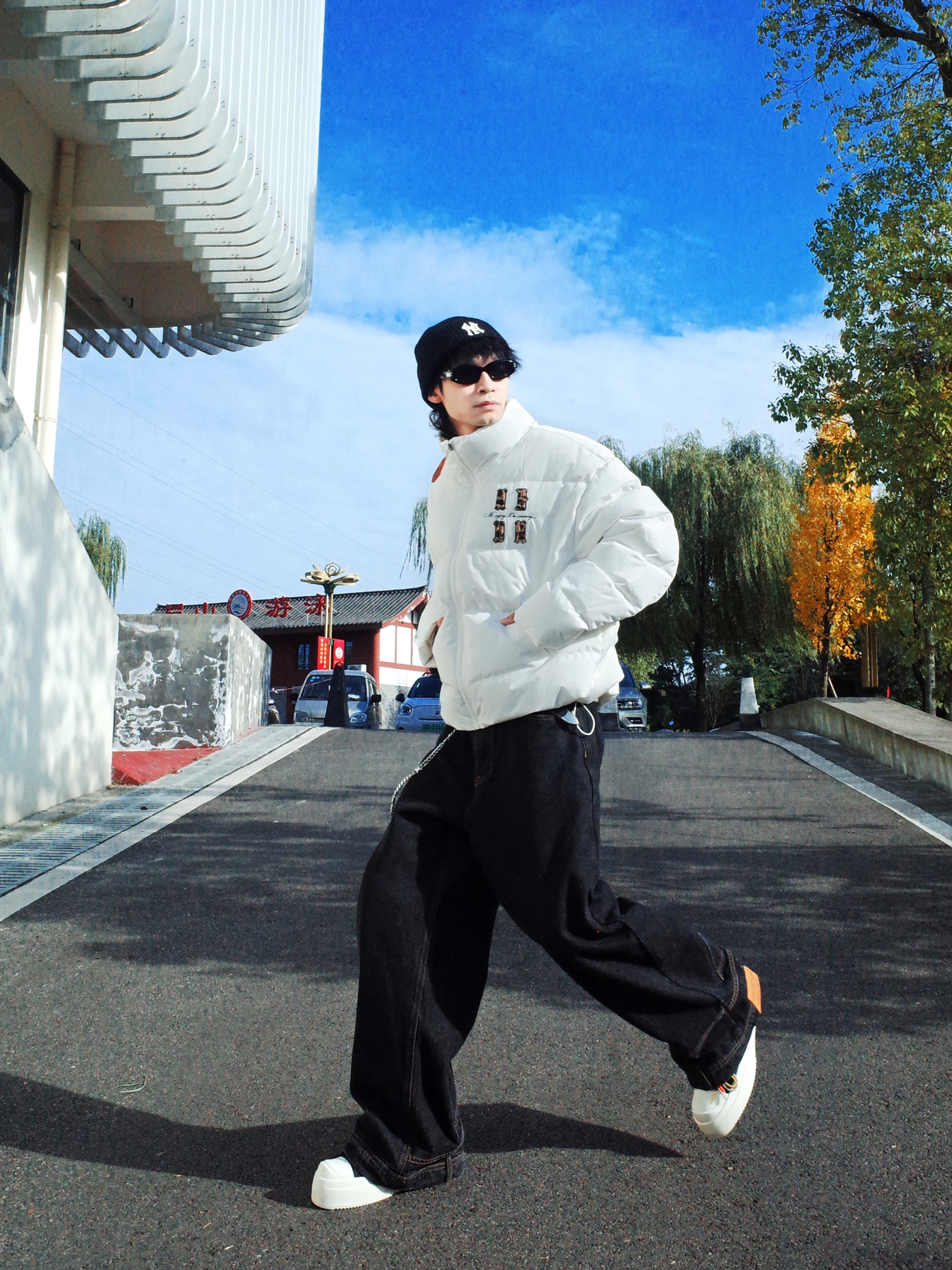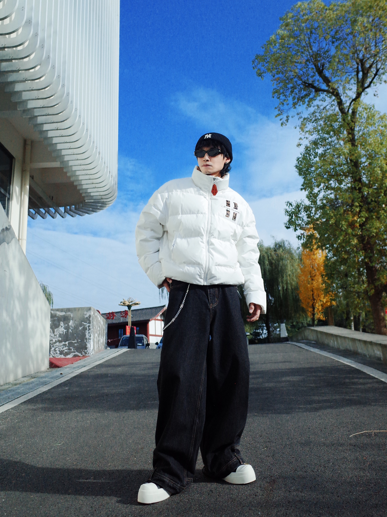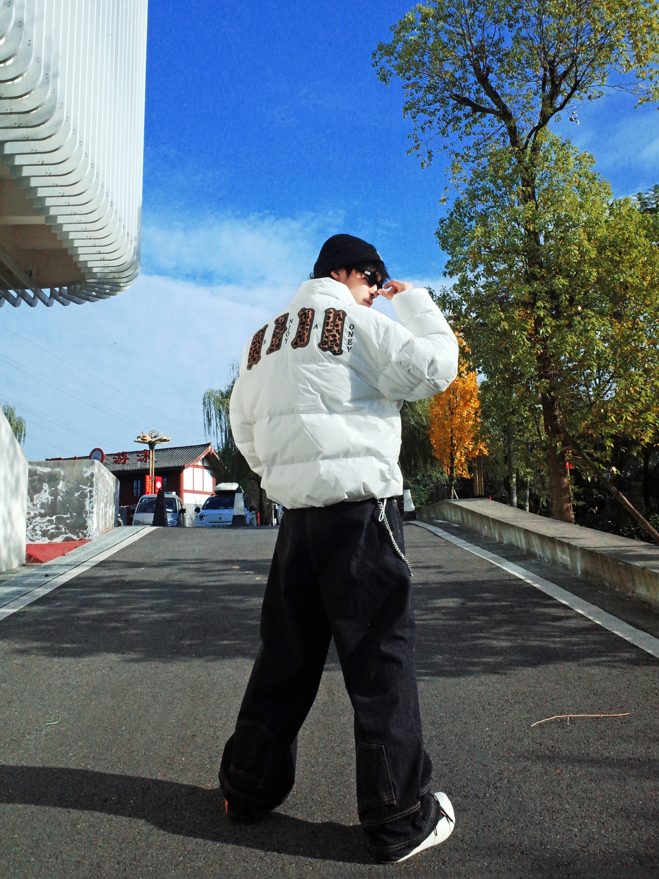 不知道穿什么的时候我会选择🦓黑白配! ◾️ 上身MEDM的白色面包羽绒服, 蓬蓬的,冬天穿还是挺保暖的! 前后都有个性的🐆豹纹字母, 宽松的版型自带随意气质~ ◾️ 下身可以搭配黑色的牛仔裤, 用黑白板鞋呼应收尾。 配饰上选择裤链和墨镜点缀, 轻松get街头感✨