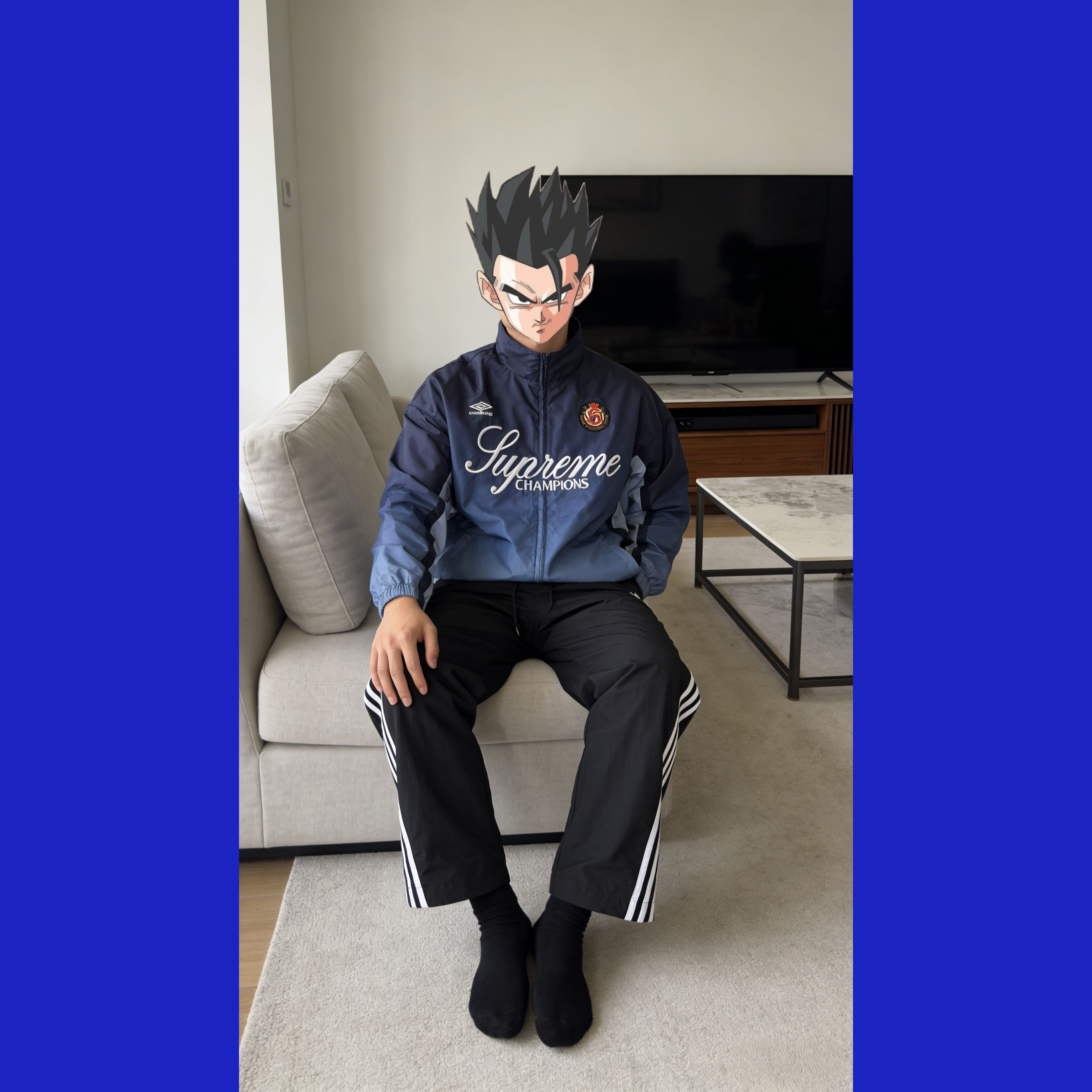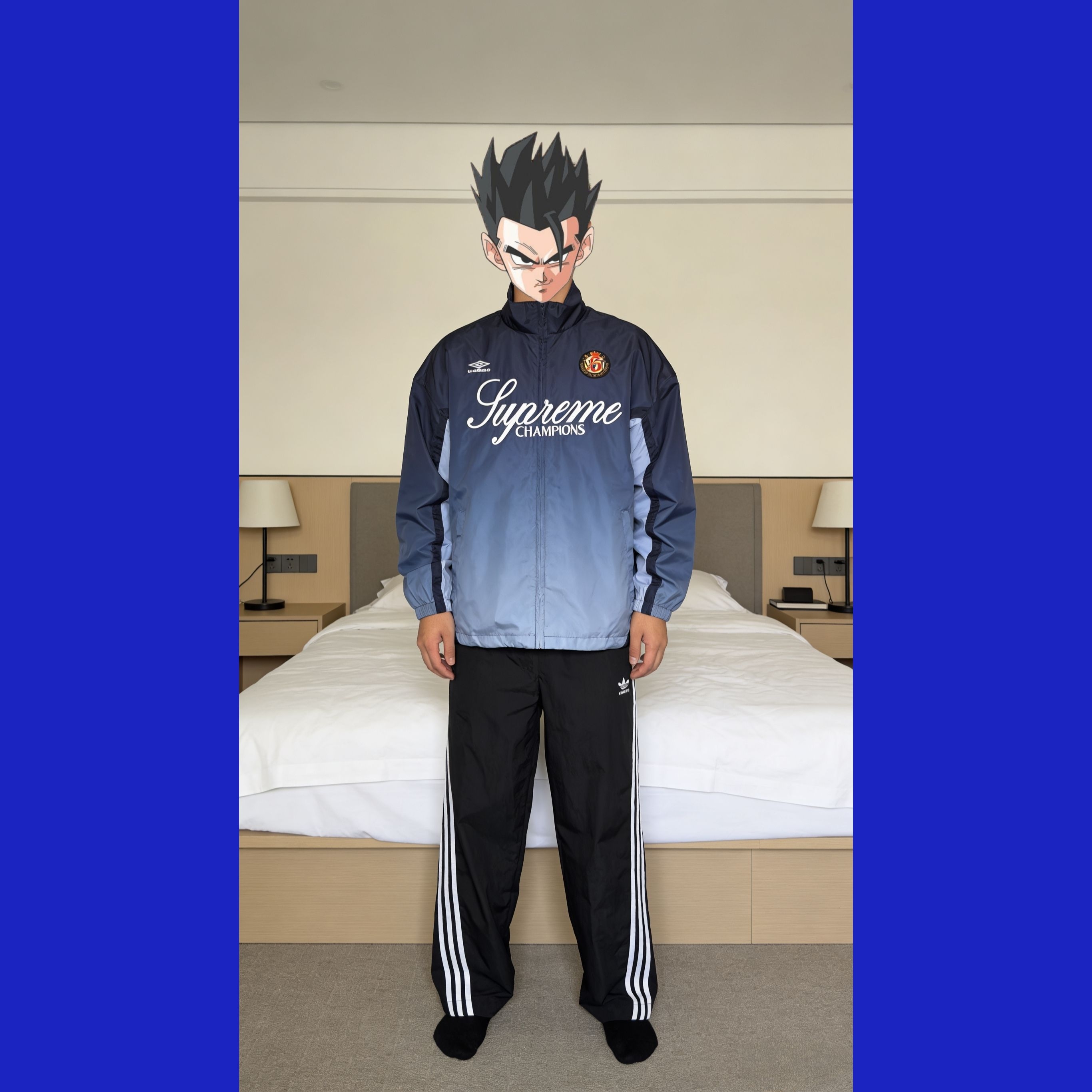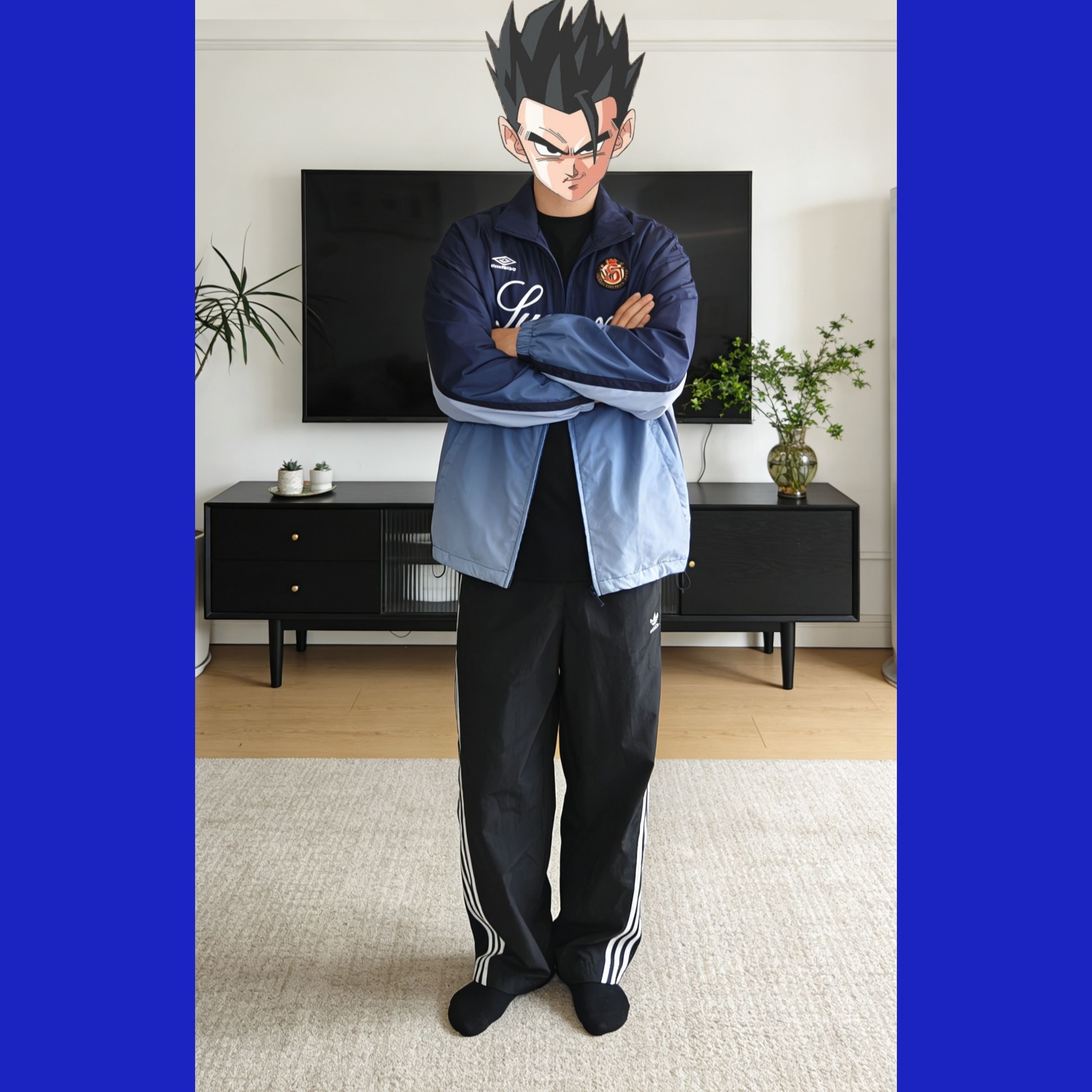 复古运动风穿搭,松弛感拉满 这套穿搭选了拼色藏蓝浅蓝的umbro复古运动外套,搭配经典三道杠黑色运动裤,妥妥的90s复古运动风拿捏住。外套的拼色设计层次感超足,宽松的版型对身材包容度极高,里面搭一件黑色基础款内搭,简约又不单调;运动裤的垂坠感很好,侧边的白色条纹中和了整体的沉闷,还能在视觉上拉长腿部线条。 上身第一感受就是舒服到不想脱!外套的面料是轻薄的防风材质,摸起来顺滑又透气,春秋穿正合适...
