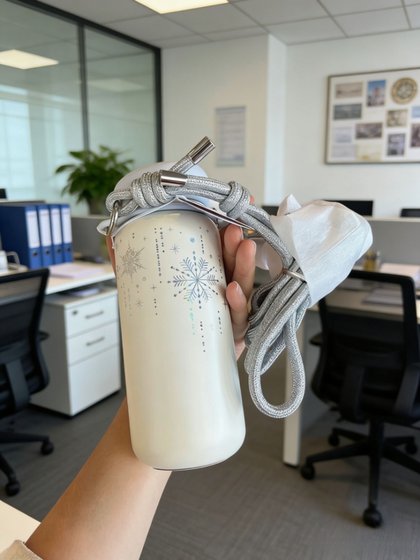 这个水杯到手超级好看,奶蓝色的雪花图案,316ml的容量,可以斜挎出门太方便了,保温效果很棒,装热水出门一整天都很暖和~