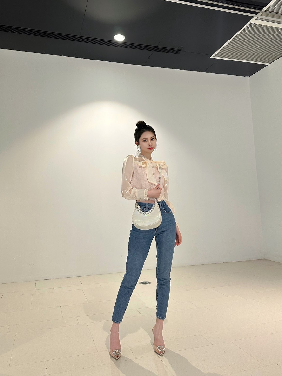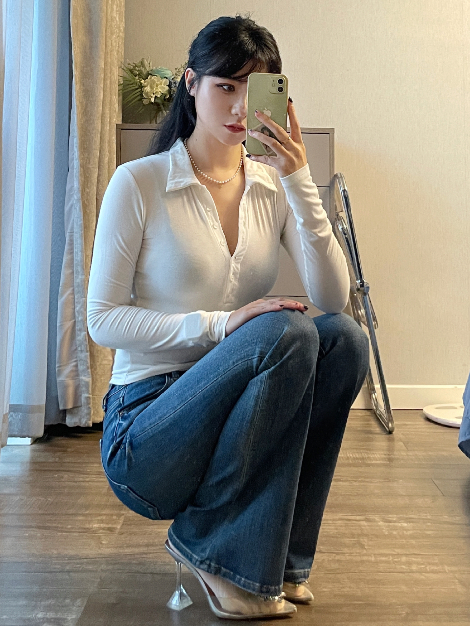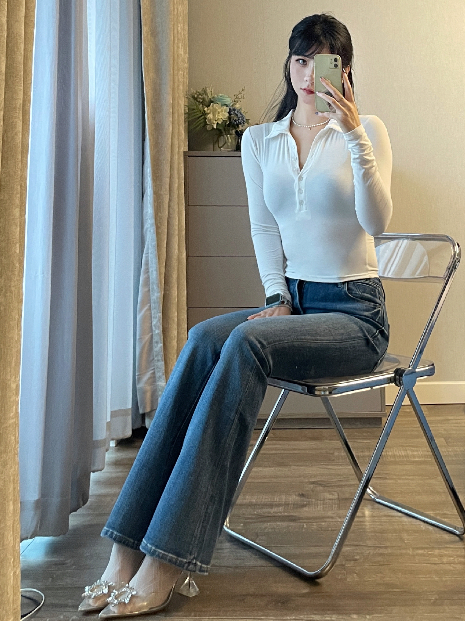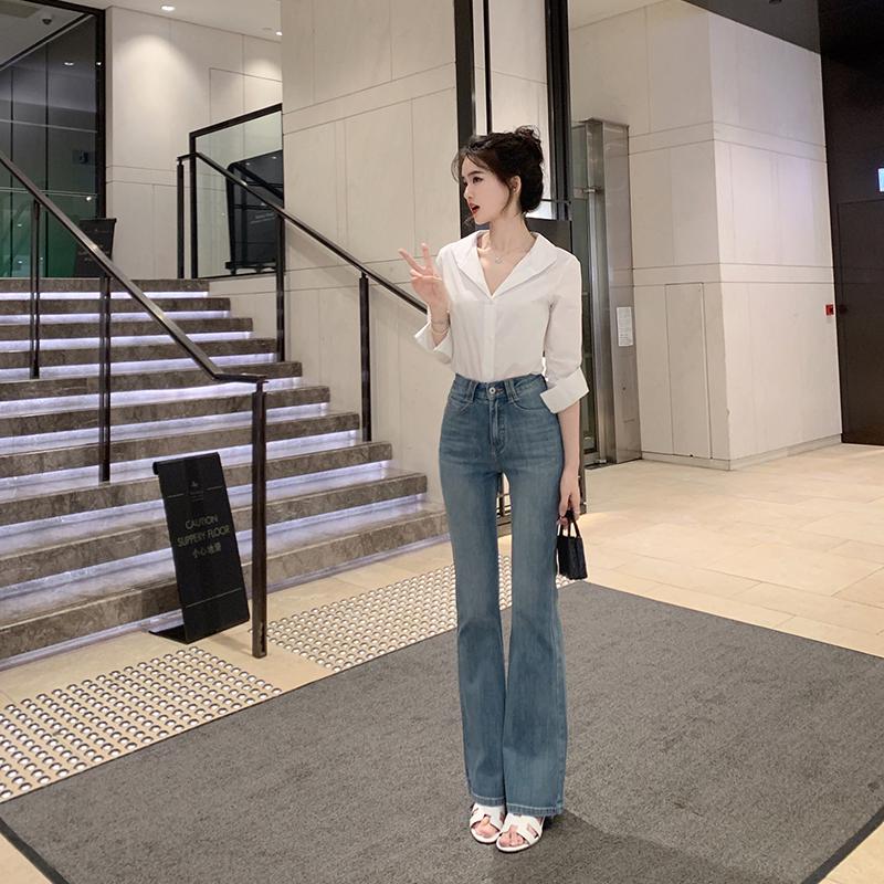 白色基础打底衫搭配高腰喇叭牛仔裤和高跟鞋 一整个气质拿捏住啦