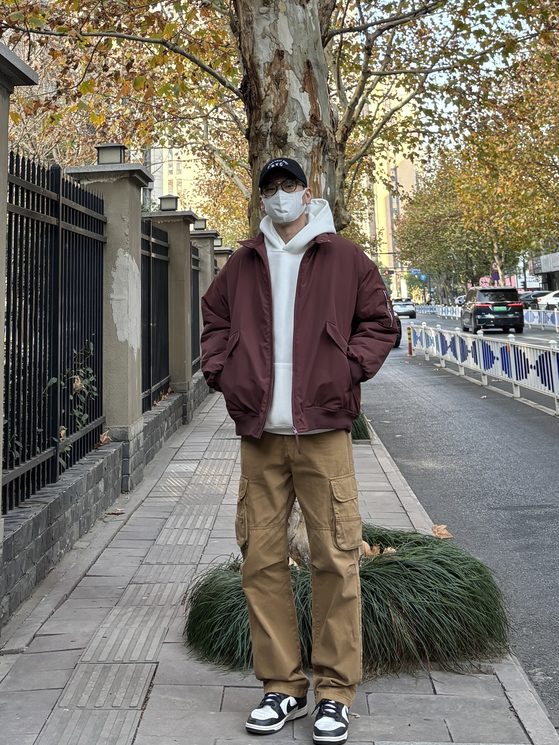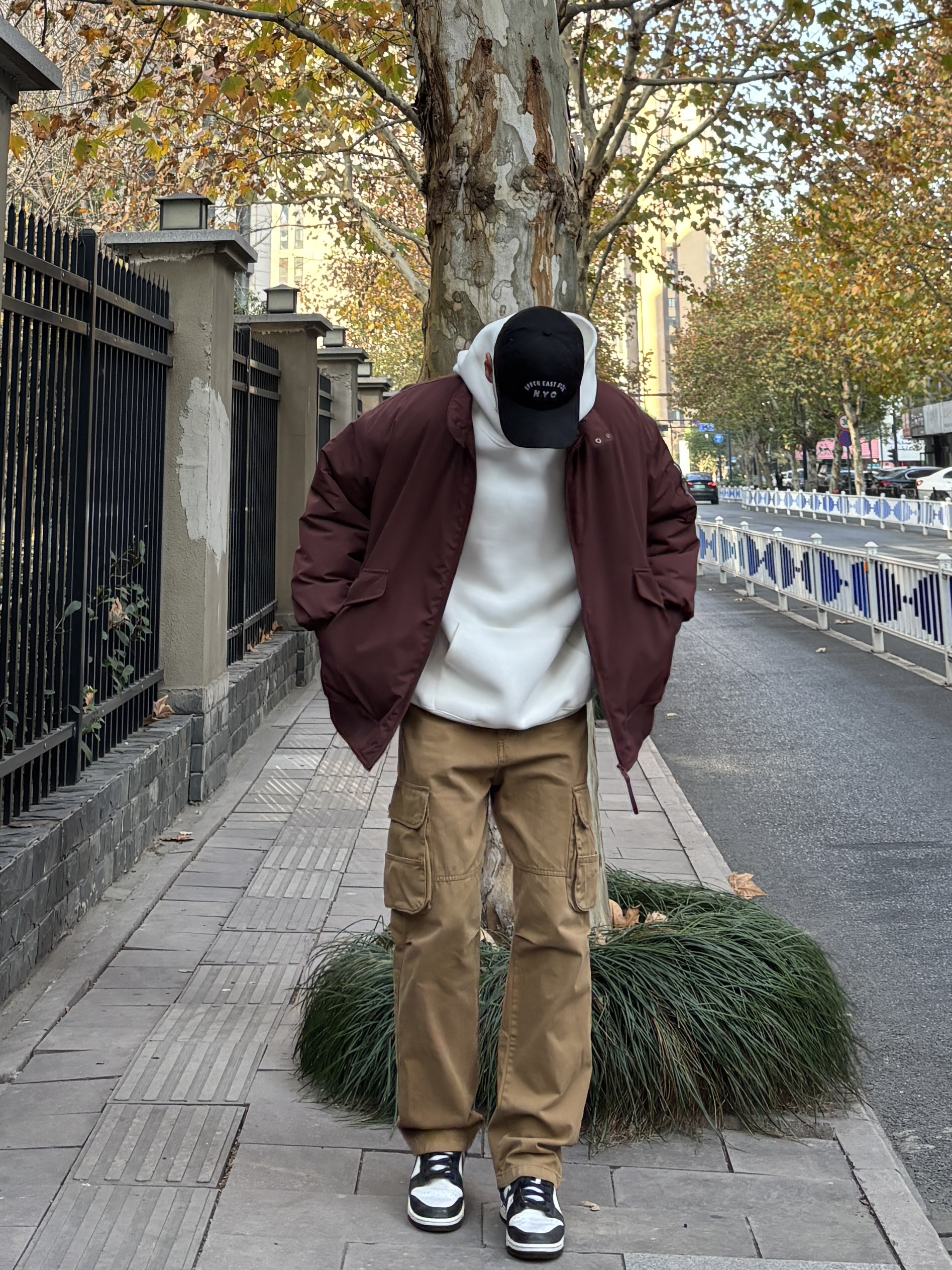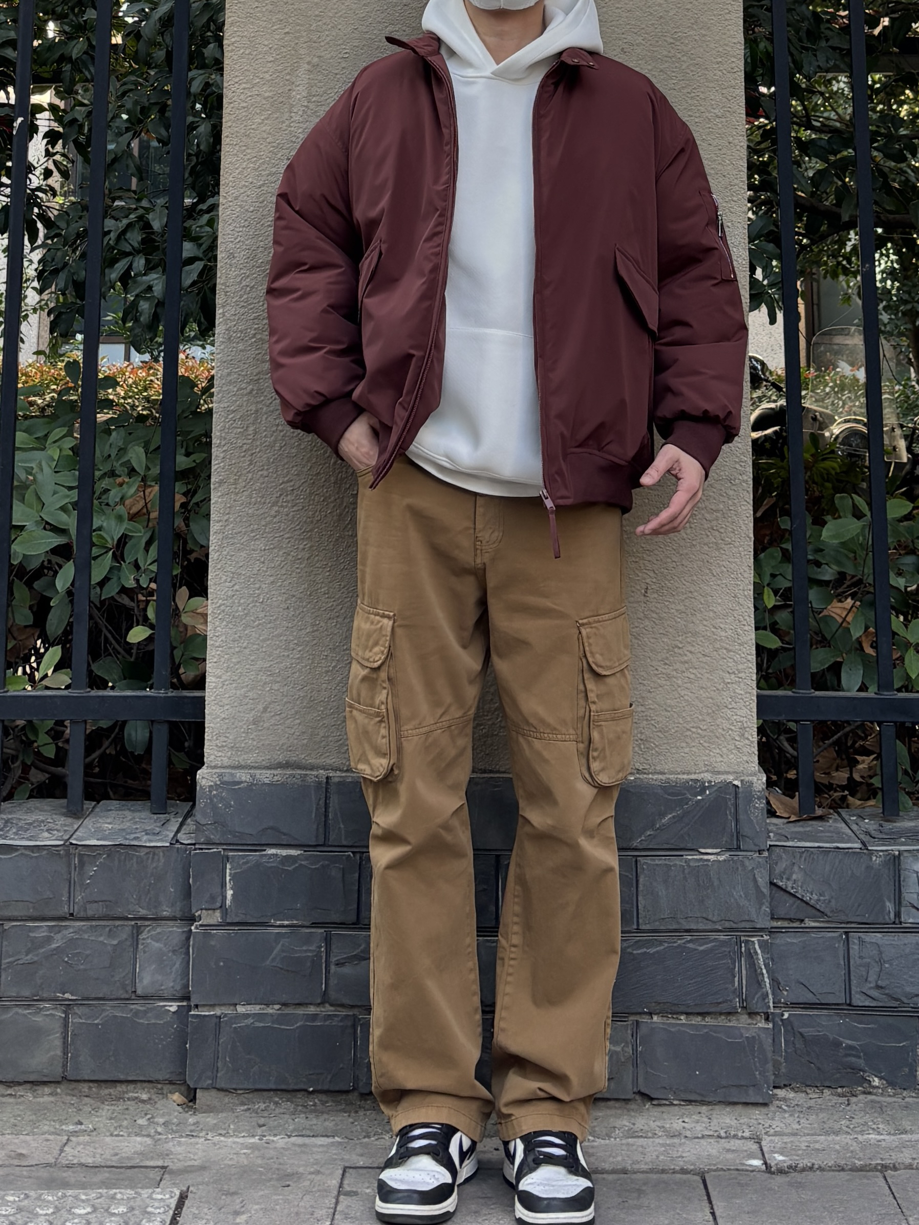 冬天衣柜里肯定有很多基础款的衣服,只要搭配好也能摆脱路人味,穿出氛围感。 上装用亮眼吸睛的酒红色翻领工装棉服叠穿简约干净的白色连帽卫衣增加层次,下装选择卡其色直筒工装裤搭配黑白低帮板鞋,四件单品轻松搭配出高级感,工装元素经典耐看,男生都可以来试试这套万能公式👍 - 今日穿搭 衣服裤子:NICE LILI 鞋子:nike dunk黑白