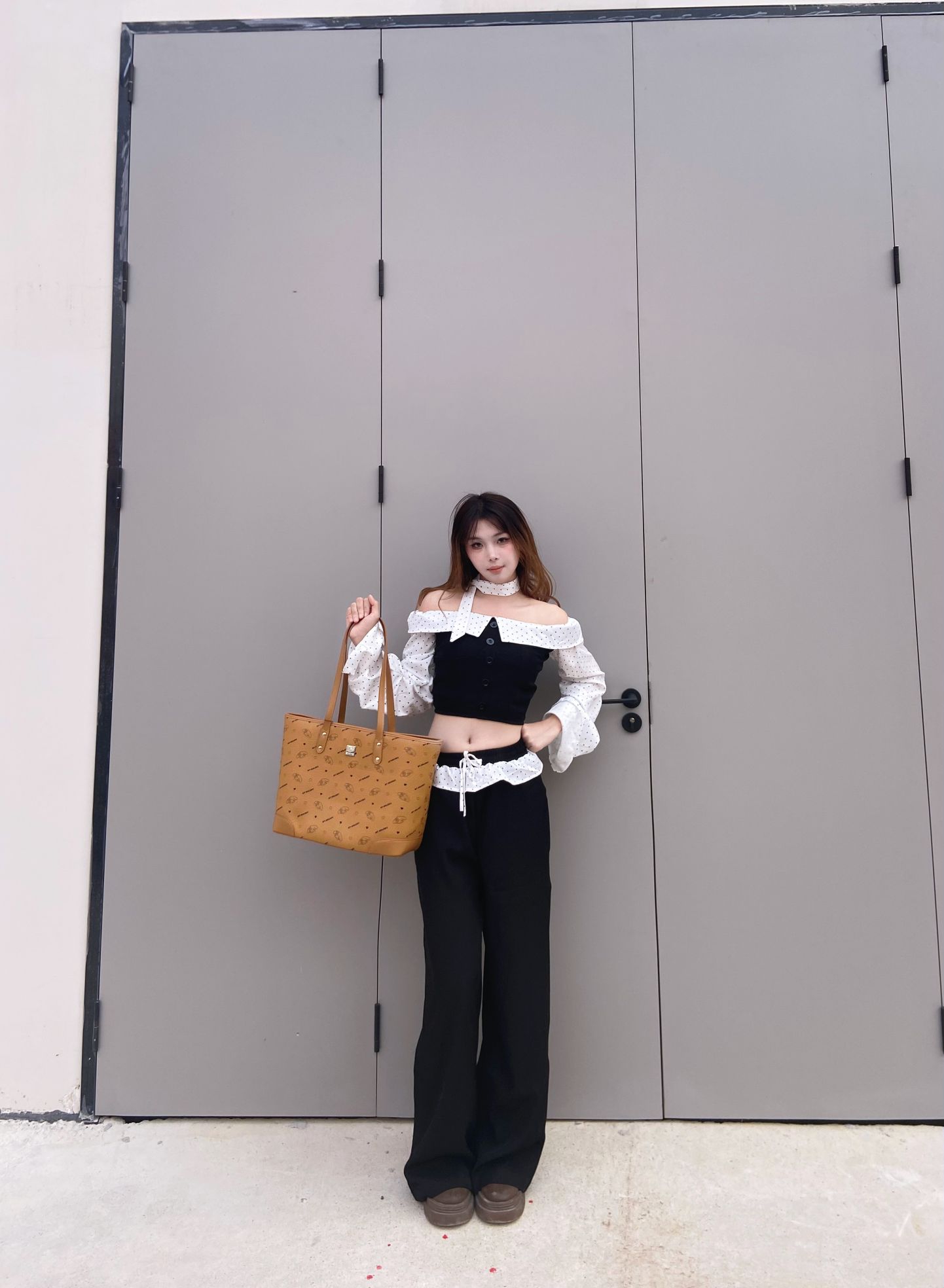 这一套真的超级知性温柔大姐姐啊! 黑白配色真的永不过时~ 白色部分还有小波点设计 给整体的严肃中增添小俏皮🥰 包包的三丽鸥原素让整体变得很特别 俏皮感满满!特别适合通勤上班啊啊啊